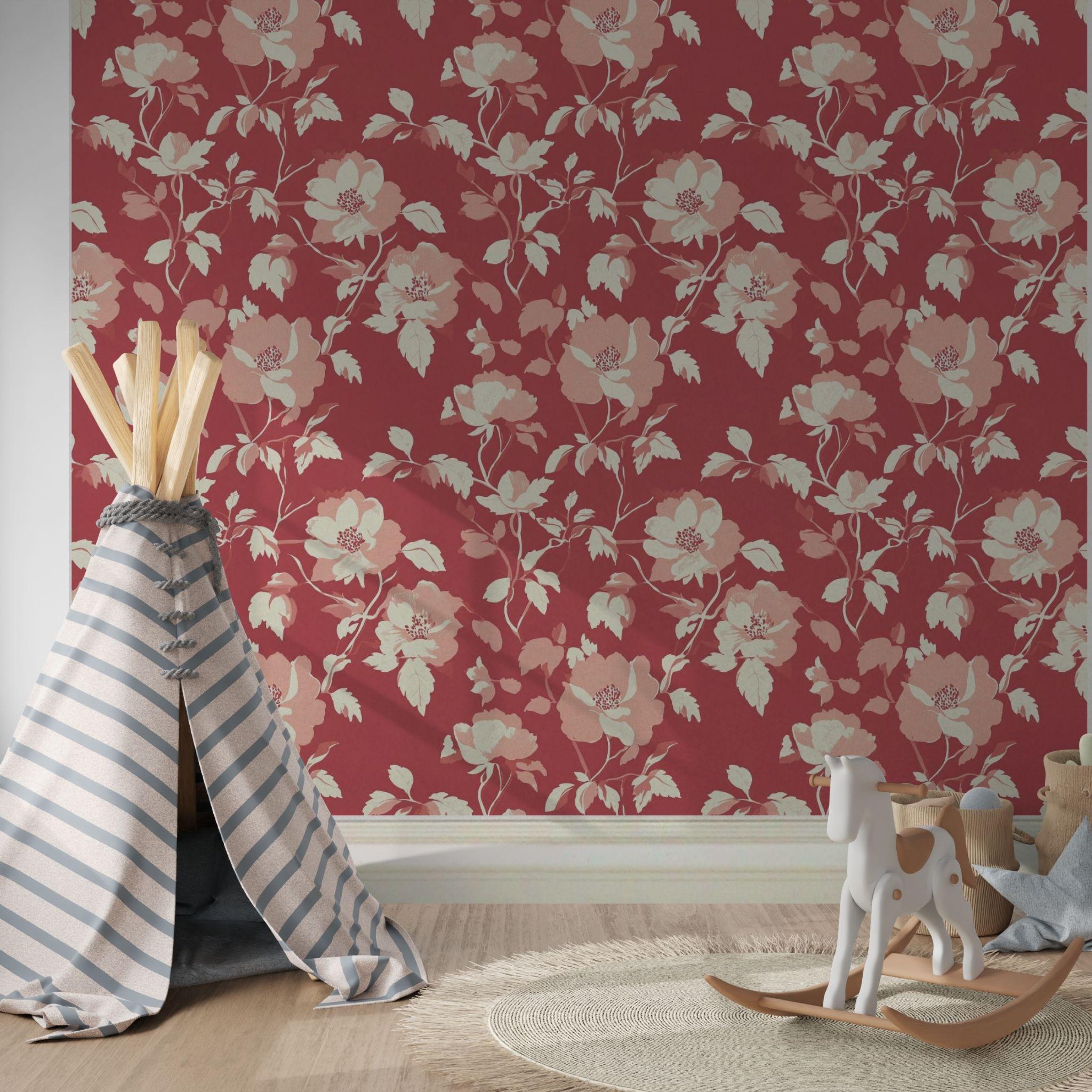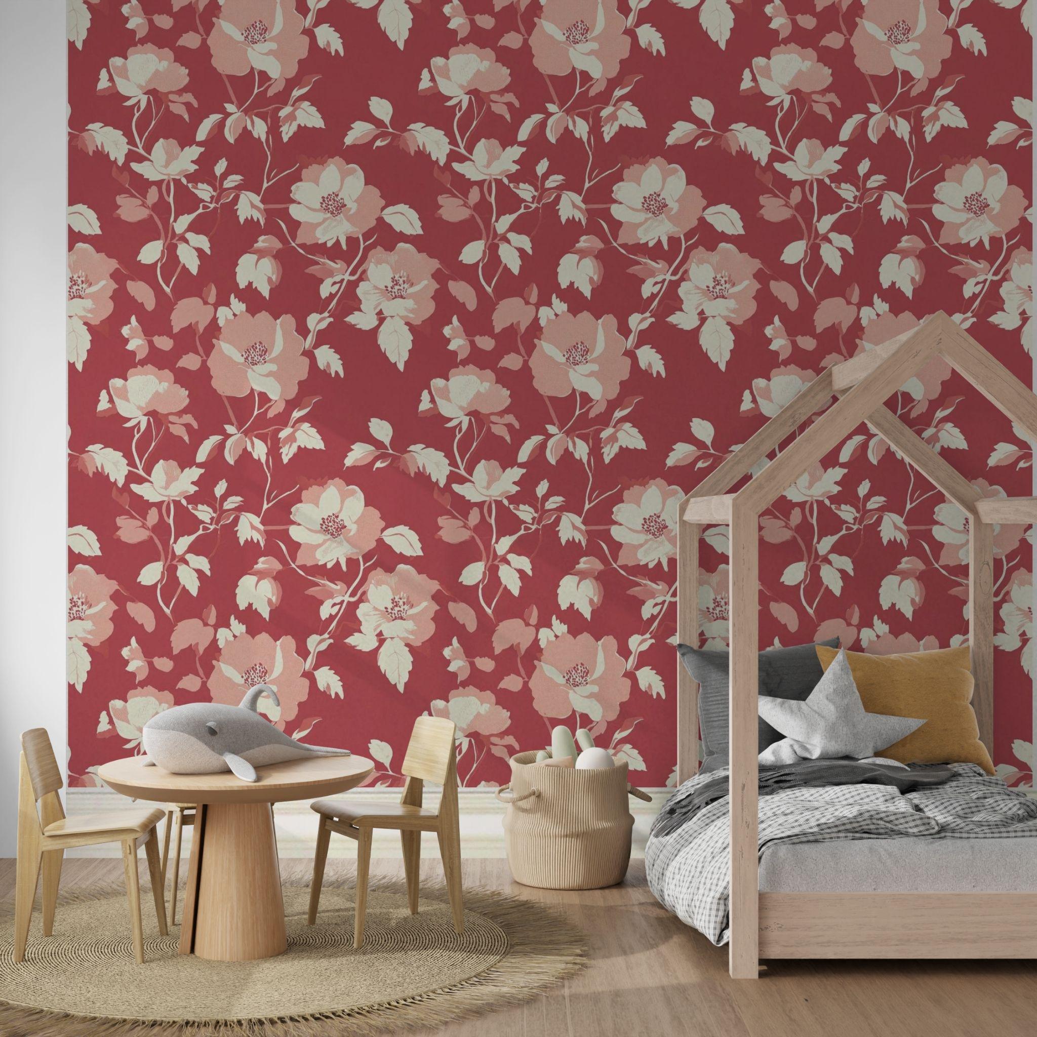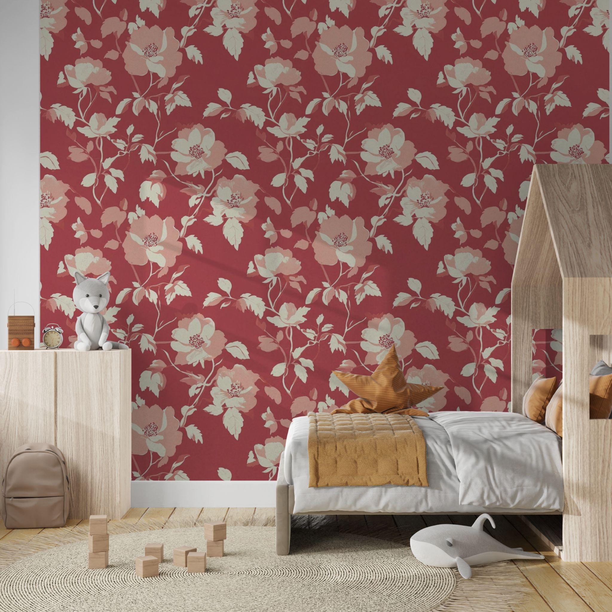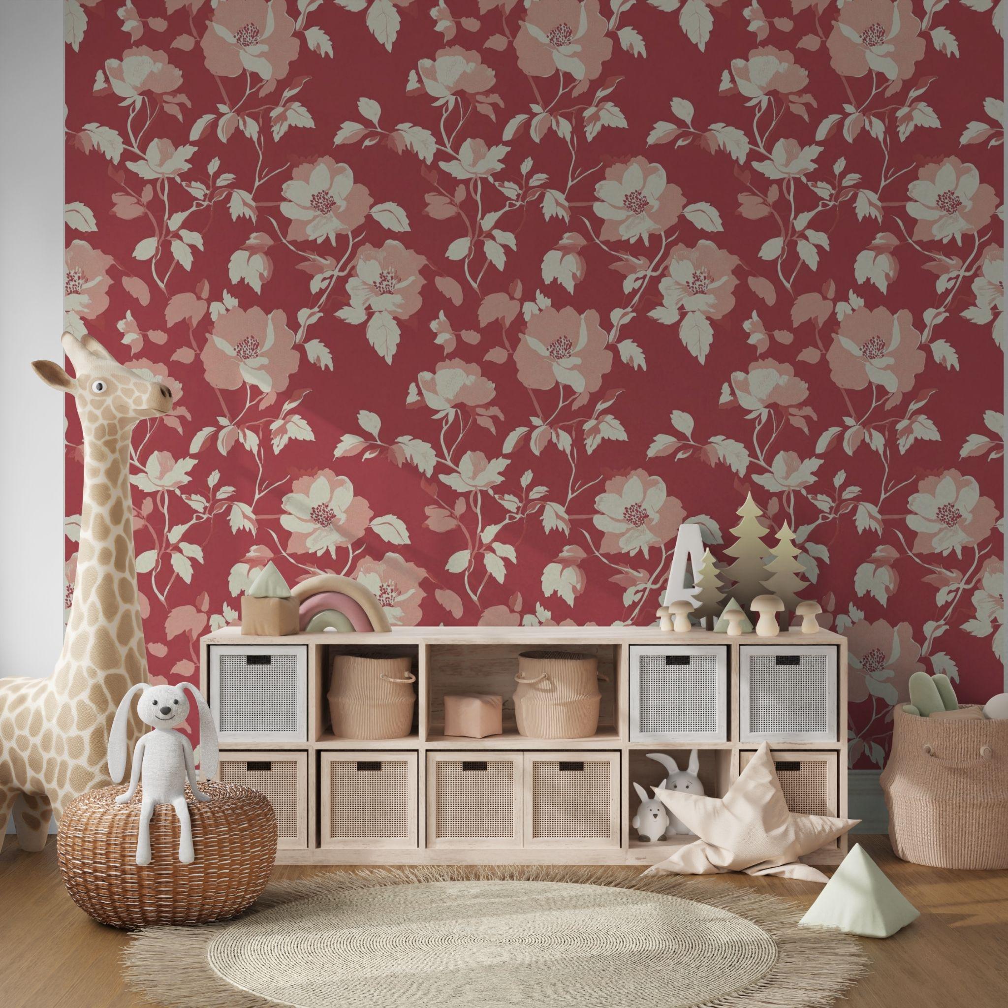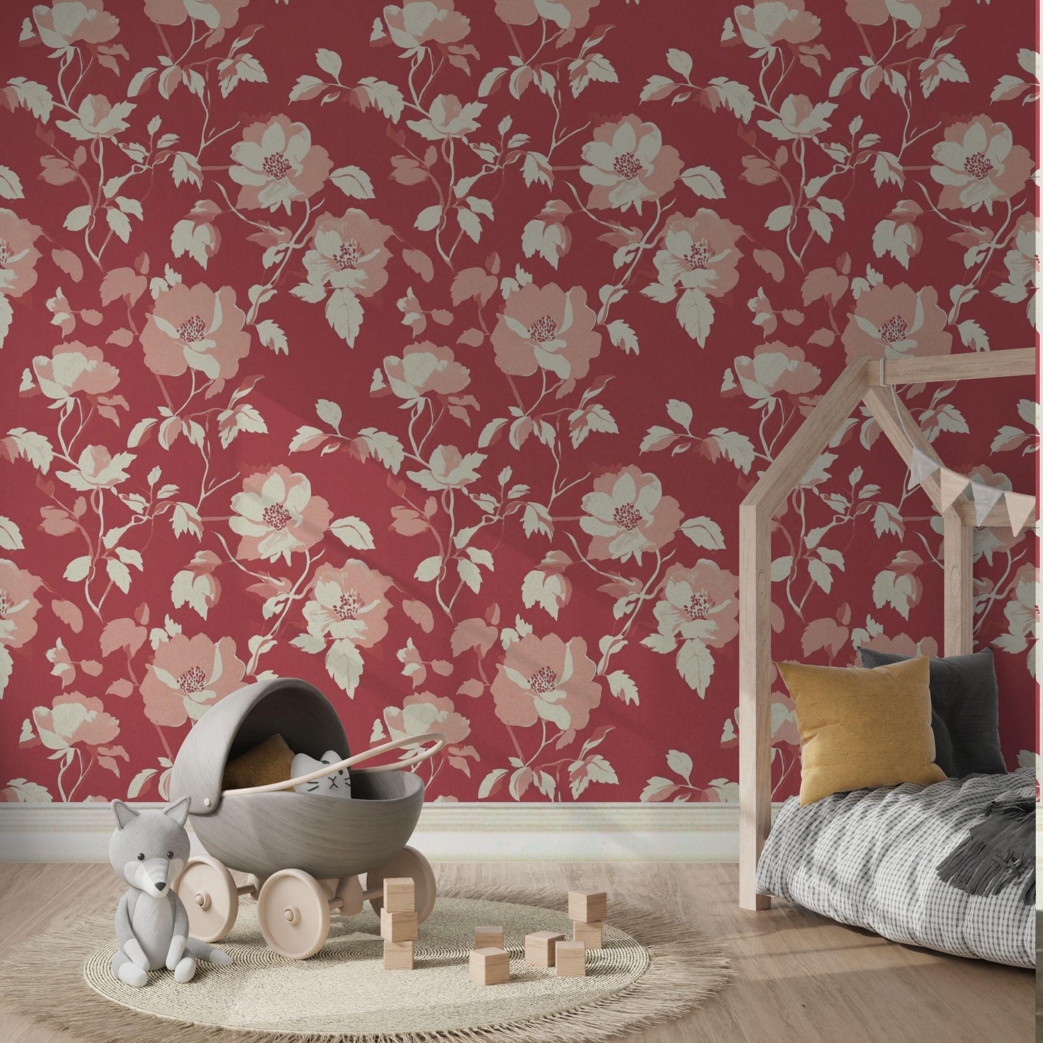 Romantic and striking, this vintage floral print brings warmth and personality to any space. Creamy blooms unfold against a deep rose background, creating a look that’s both classic and full of heart. Perfect for adding a touch of timeless charm to kids’ rooms, bedrooms, or cozy corners that call for something unforgettable.