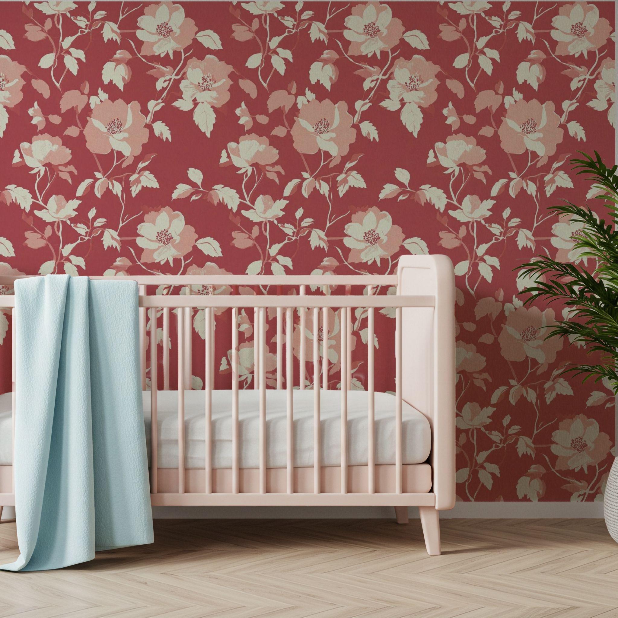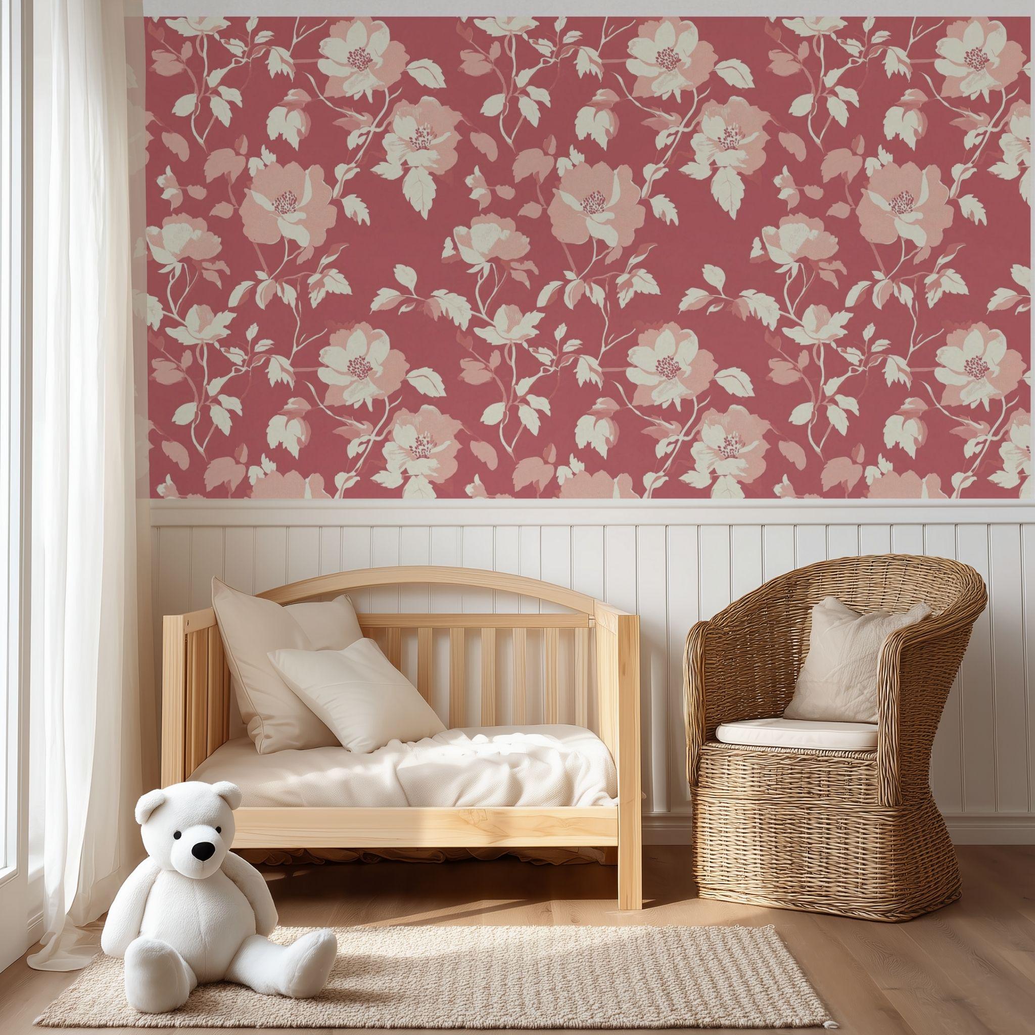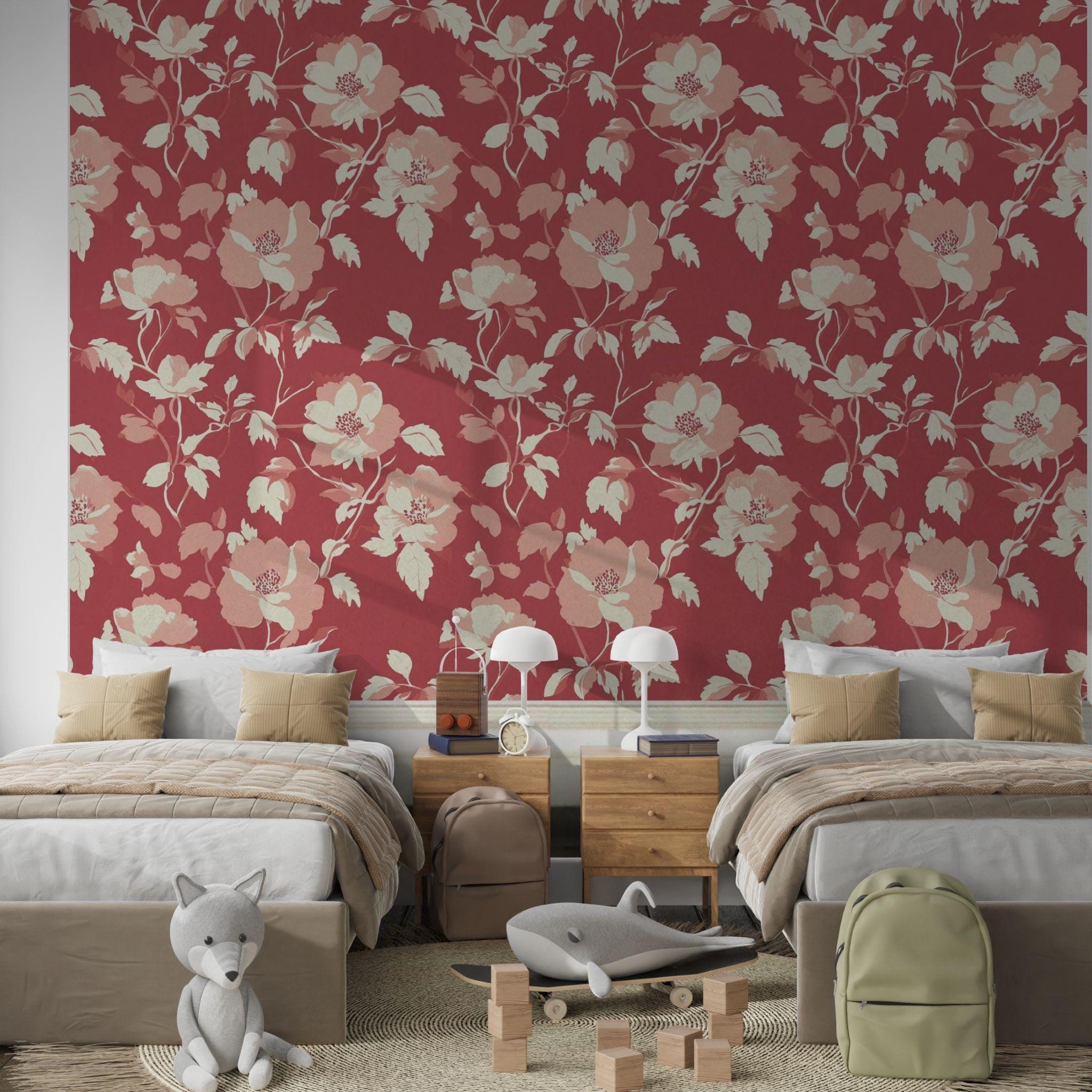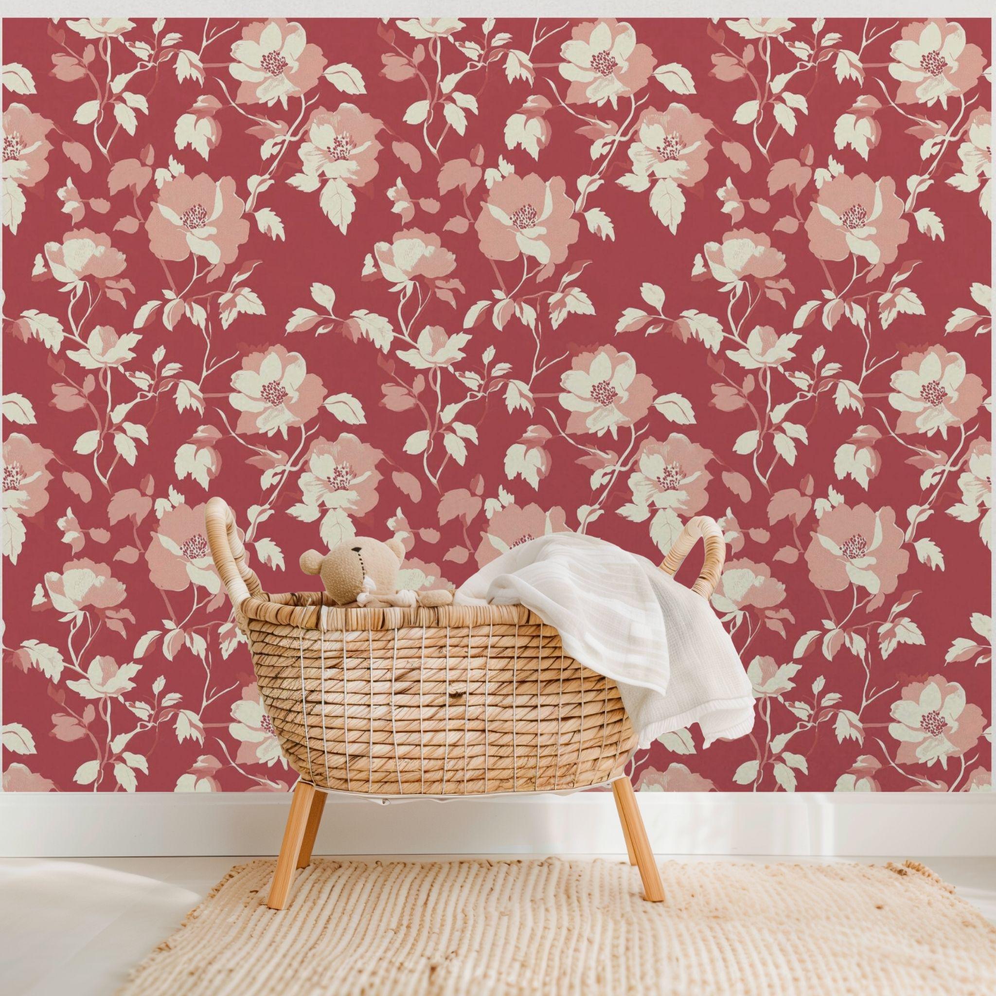 Romantic and striking, this vintage floral print brings warmth and personality to any space. Creamy blooms unfold against a deep rose background, creating a look that’s both classic and full of heart. Perfect for adding a touch of timeless charm to kids’ rooms, bedrooms, or cozy corners that call for something unforgettable.