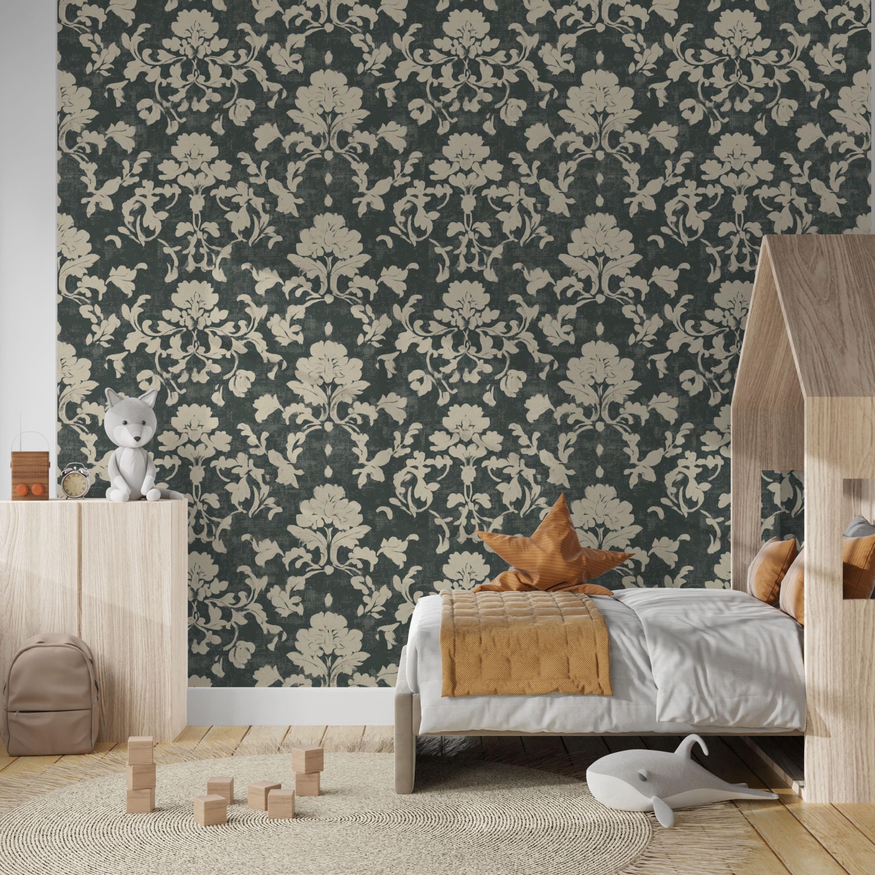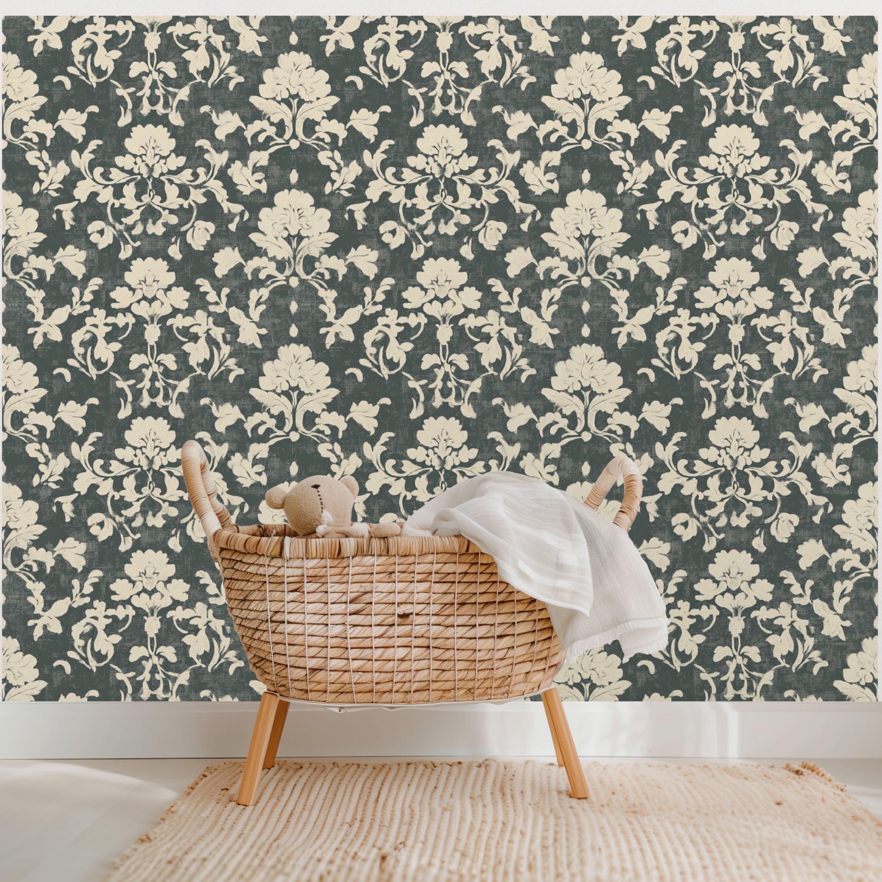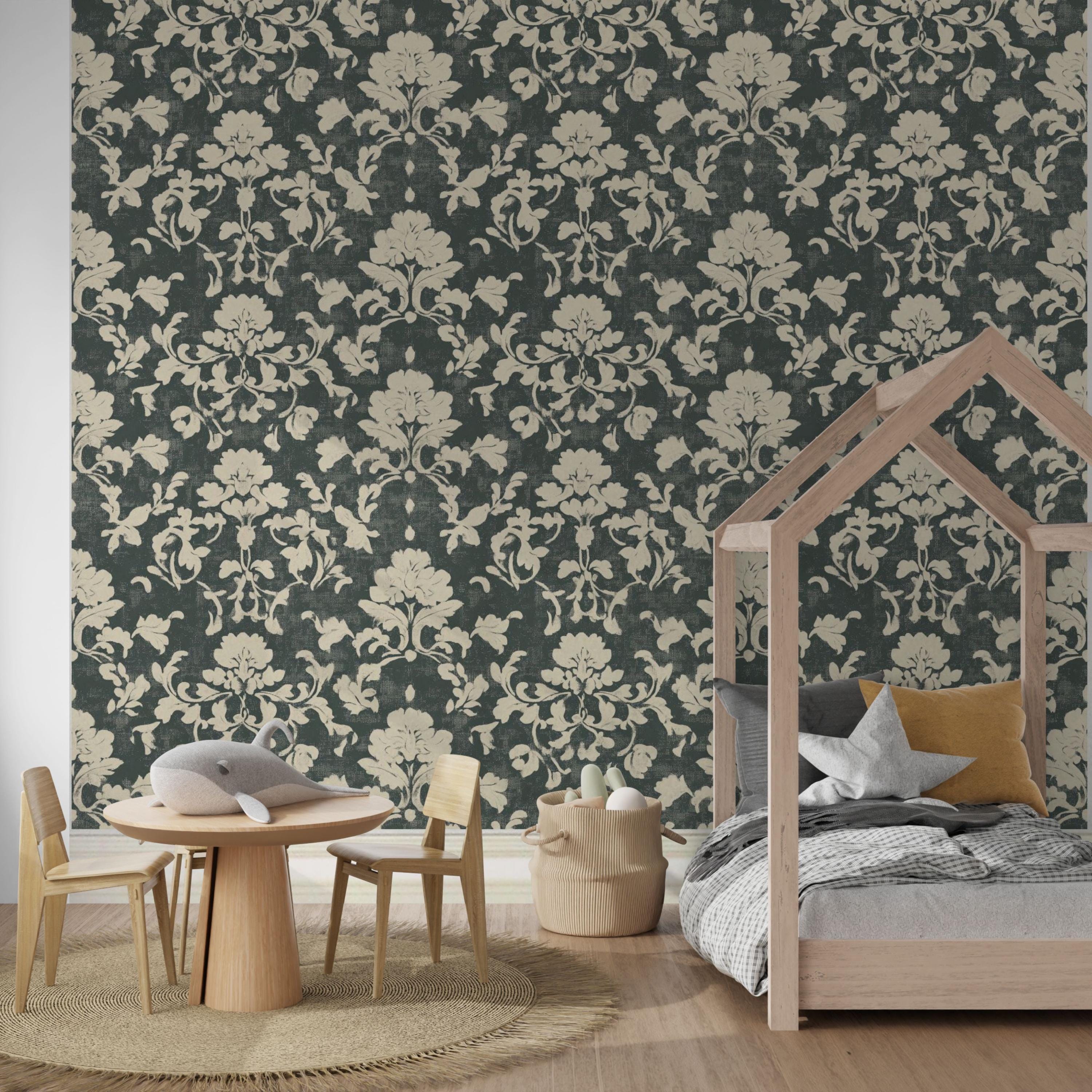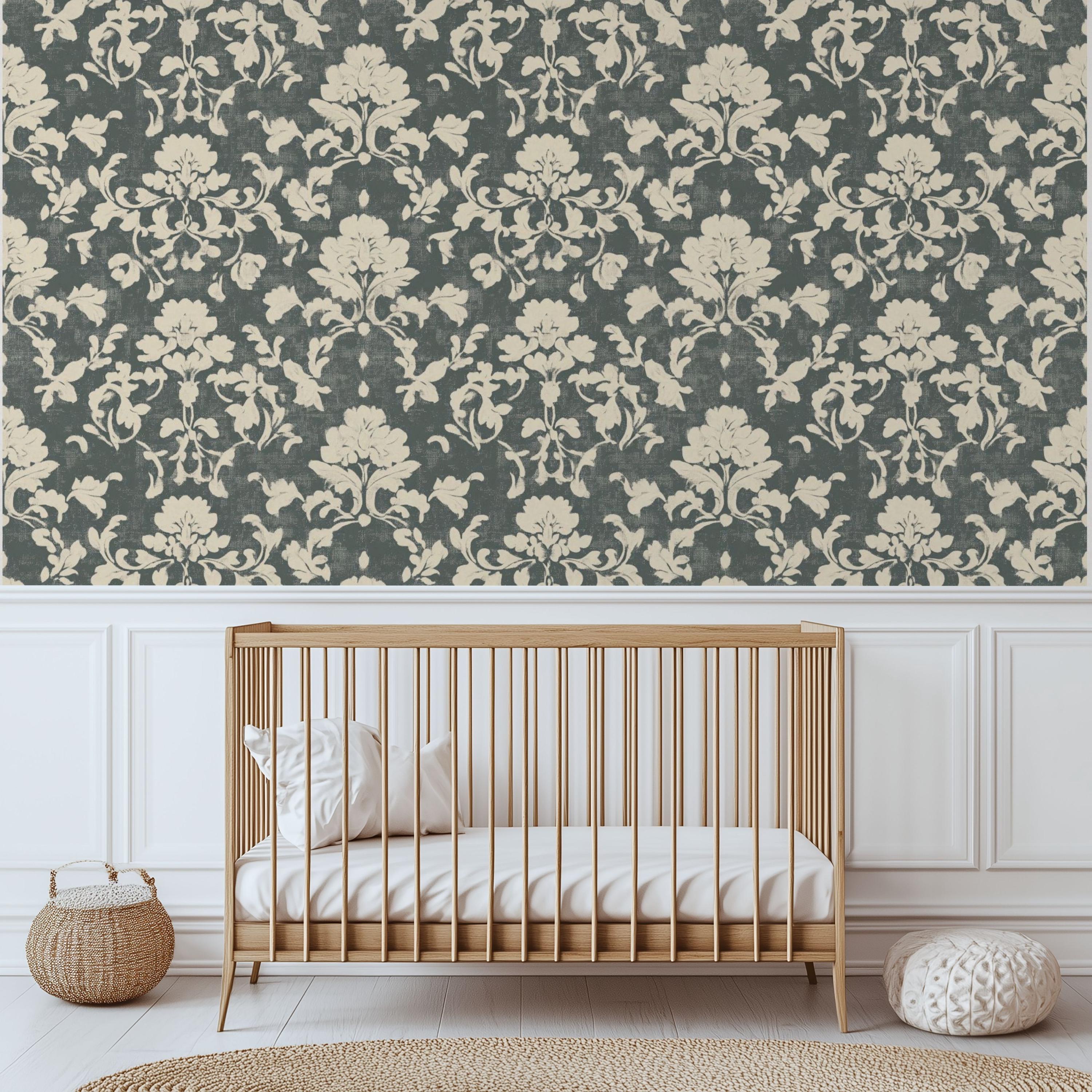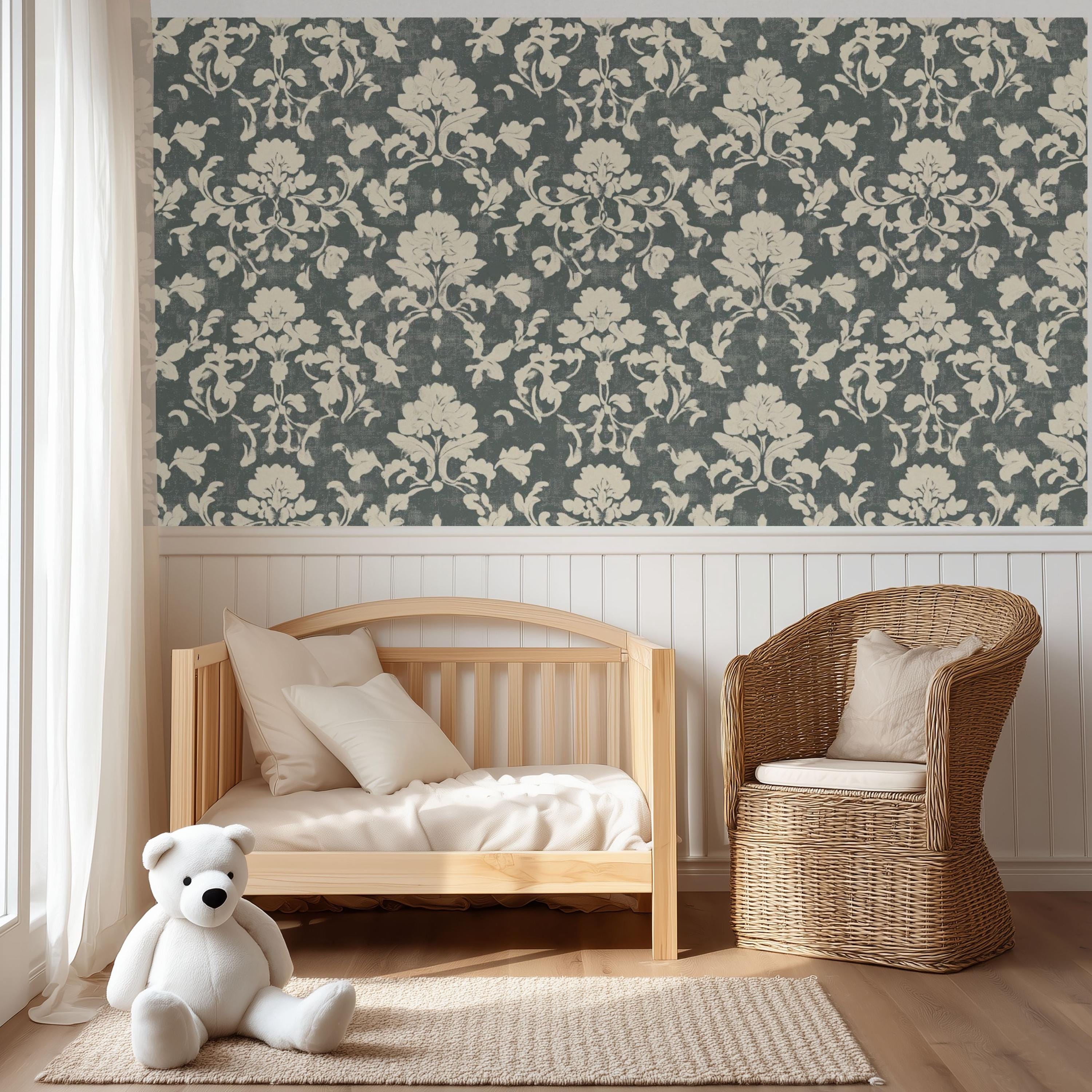A modern heirloom with timeless soul. This distressed damask pattern pairs rich charcoal tones with soft cream florals, creating a room that feels calm, grounded, and quietly luxurious. Beautiful in nurseries, kids’ rooms, or any space that deserves understated elegance with a touch of vintage warmth.