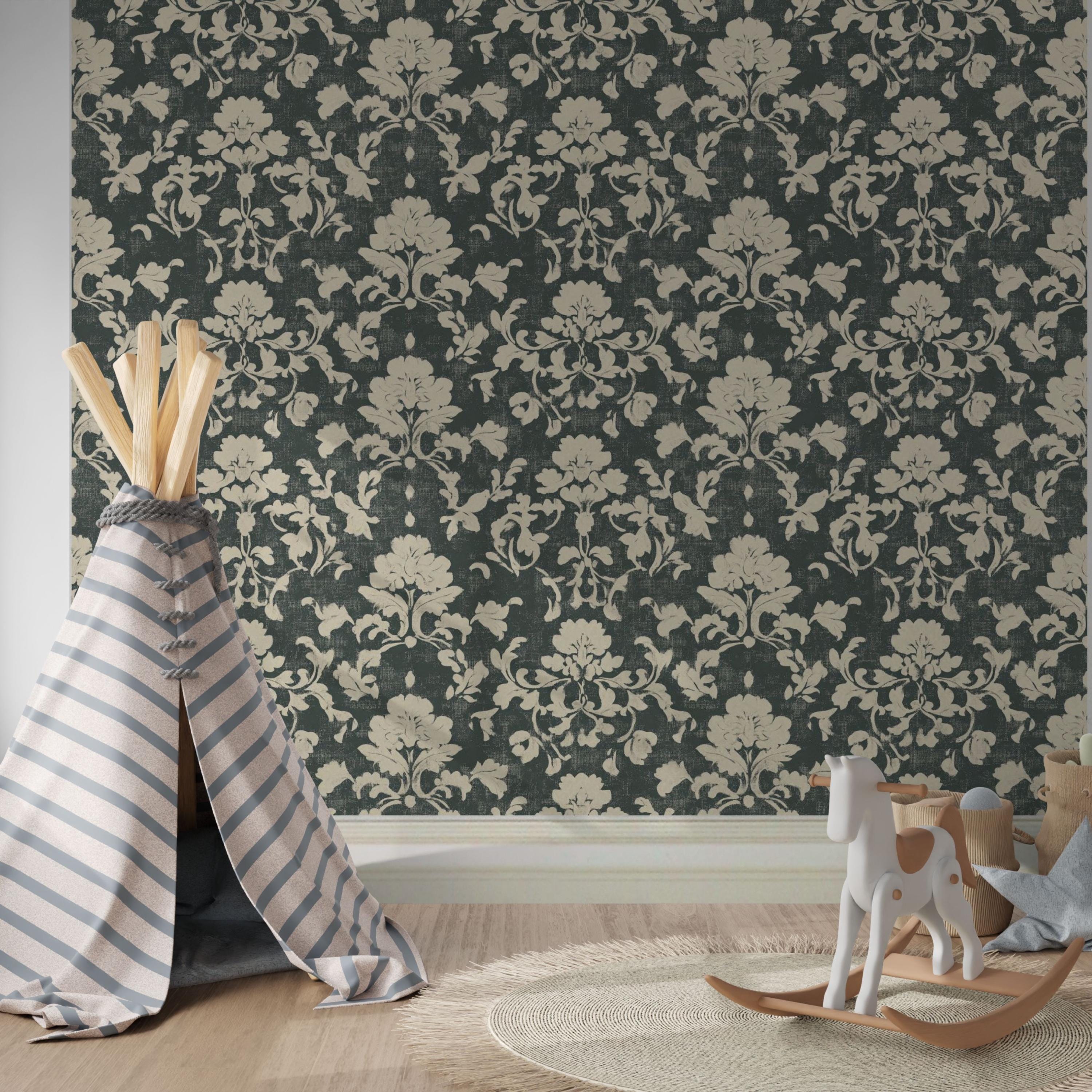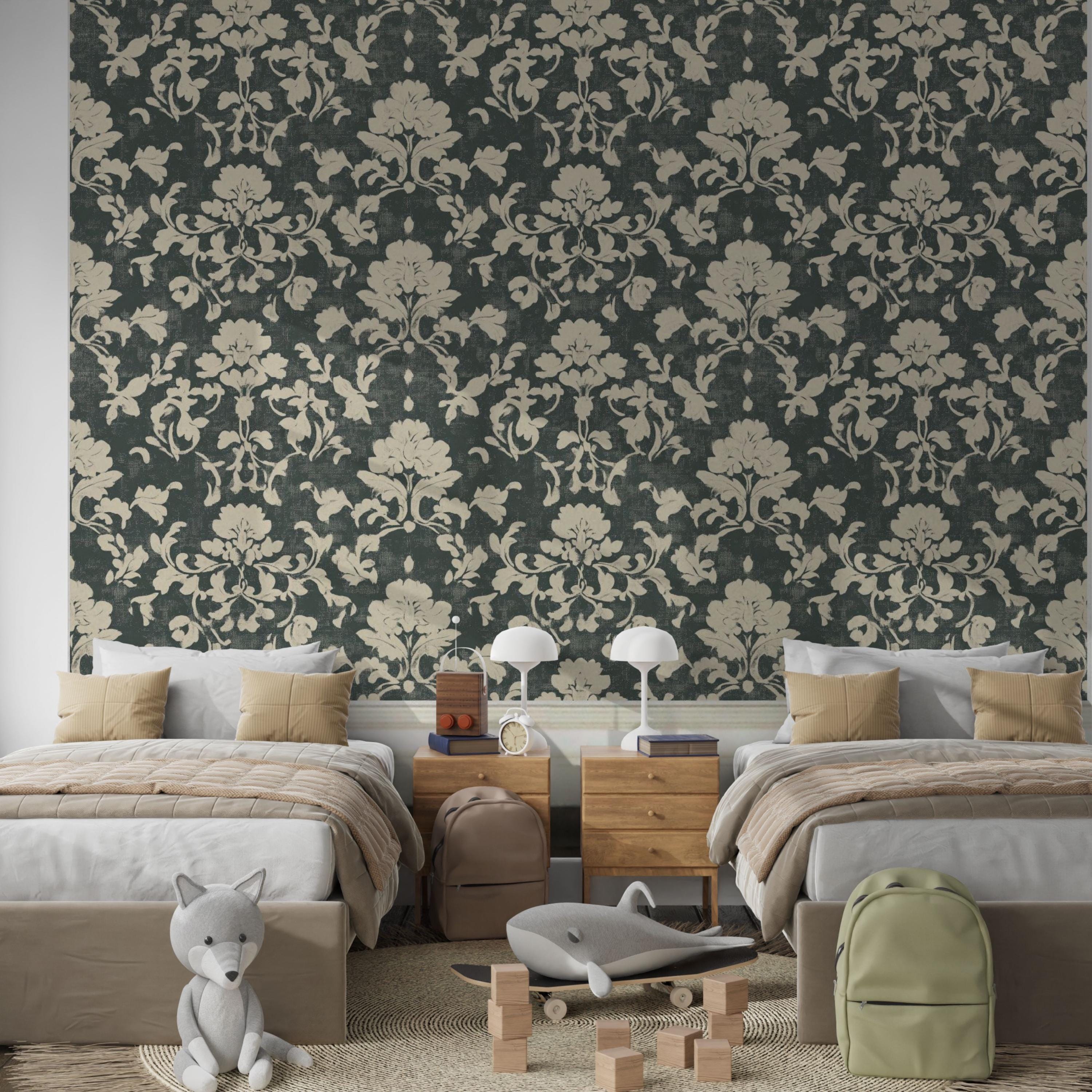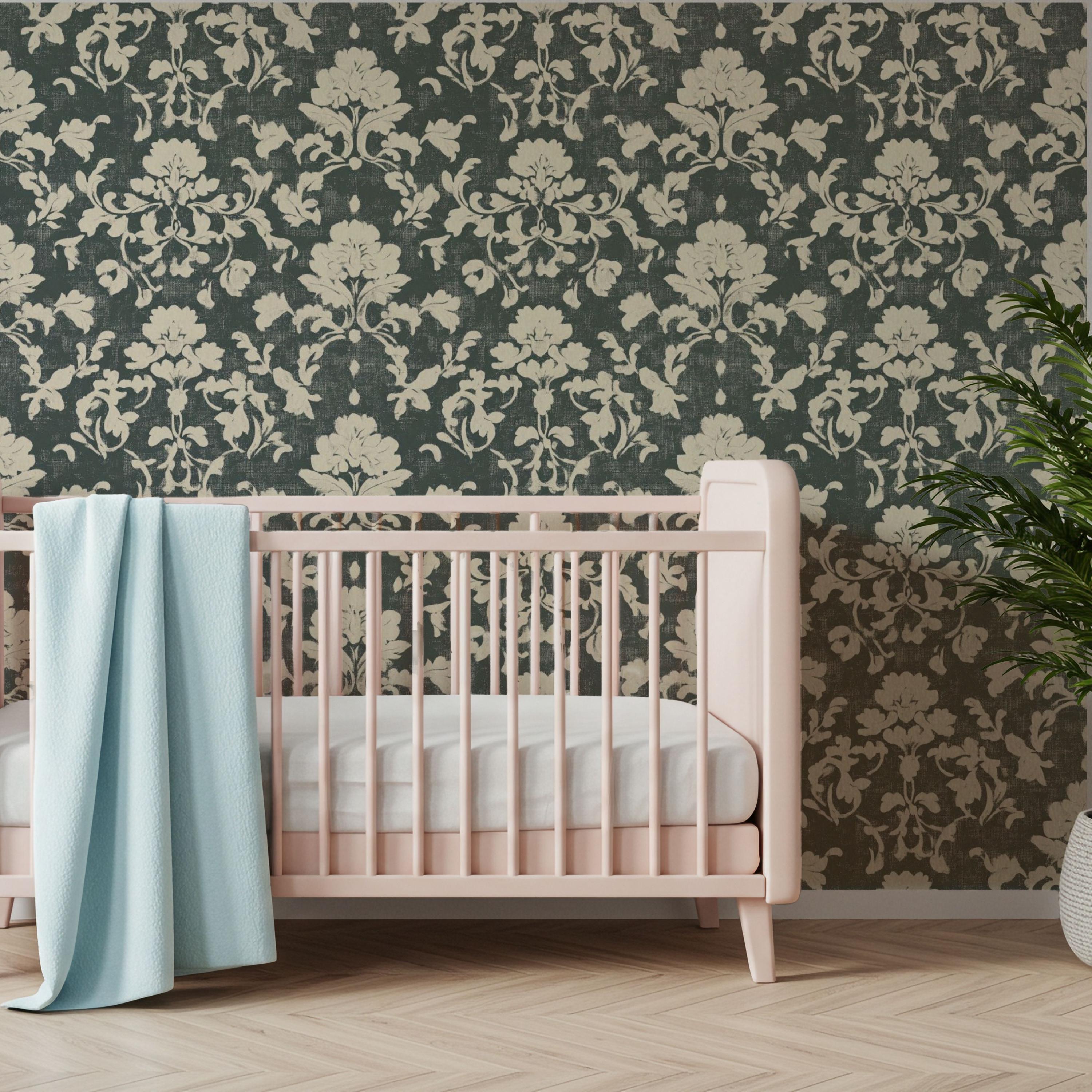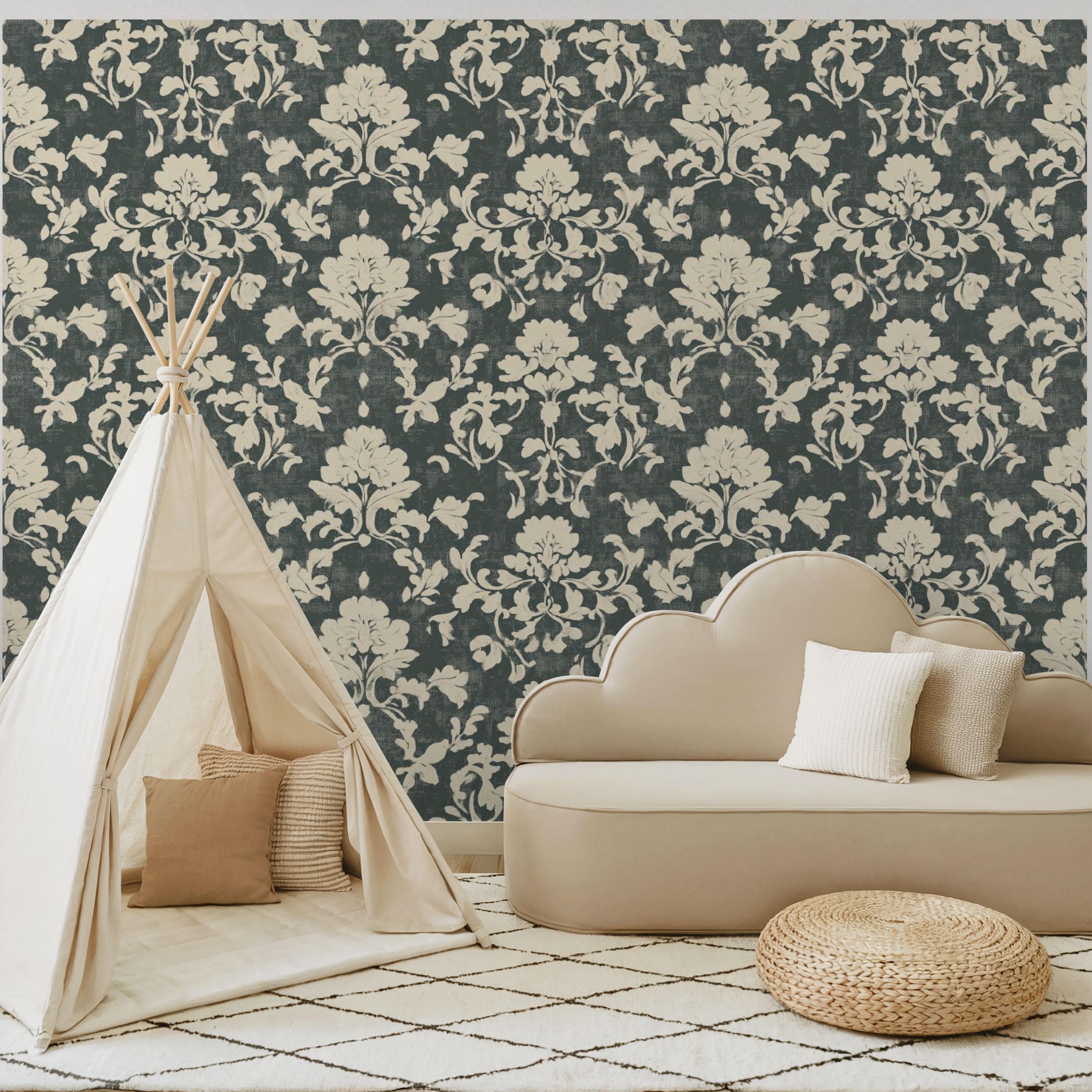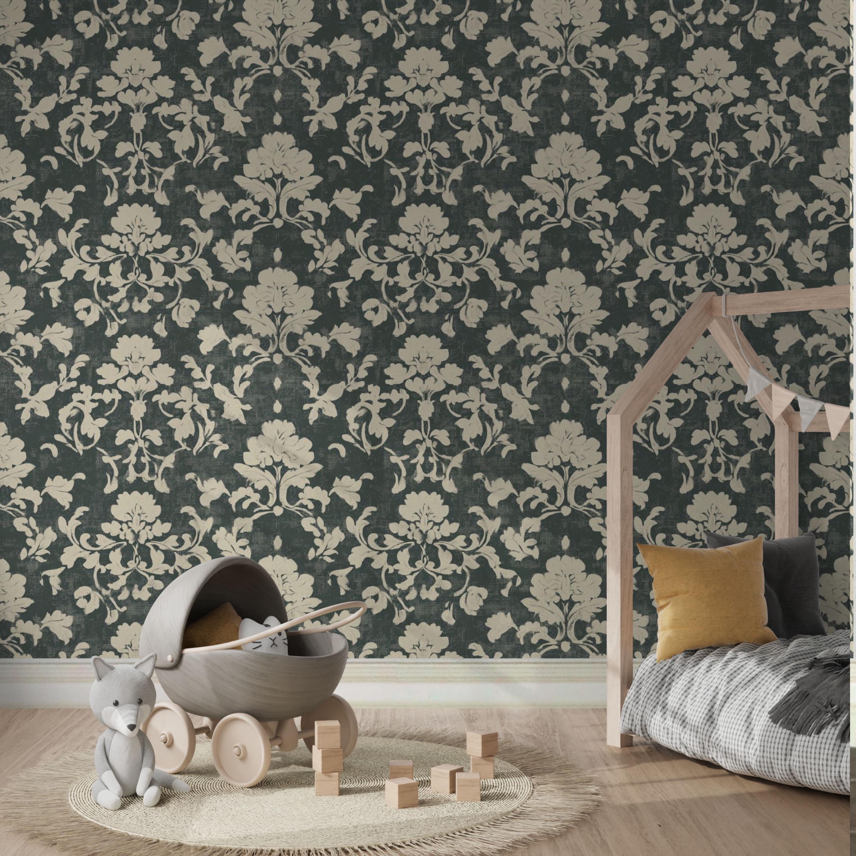 A modern heirloom with timeless soul. This distressed damask pattern pairs rich charcoal tones with soft cream florals, creating a room that feels calm, grounded, and quietly luxurious. Beautiful in nurseries, kids’ rooms, or any space that deserves understated elegance with a touch of vintage warmth.