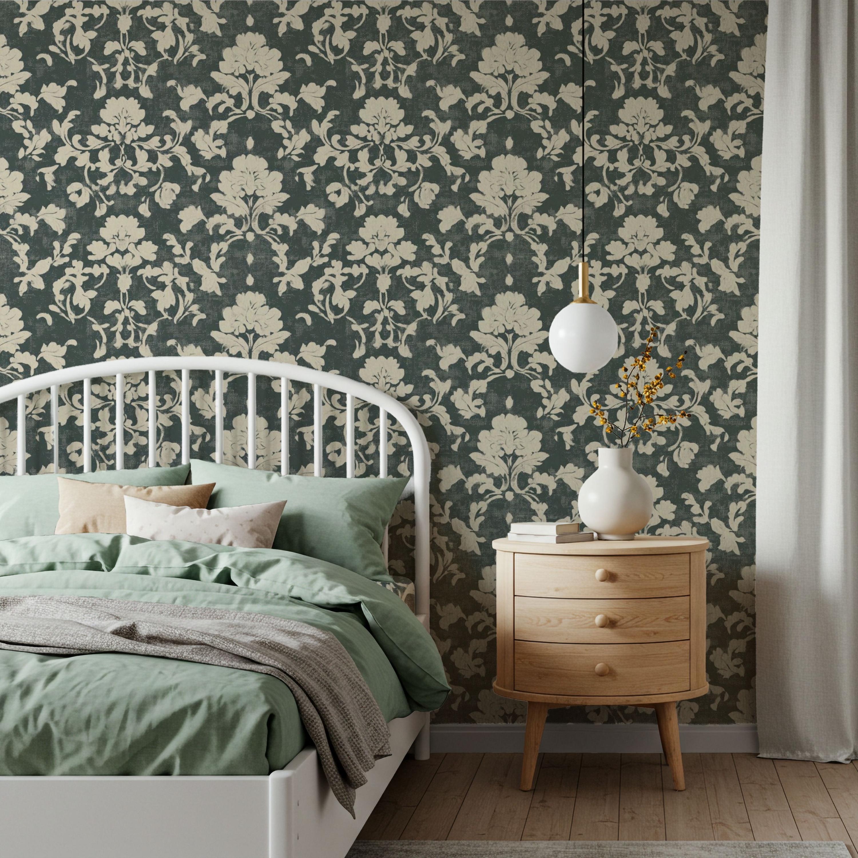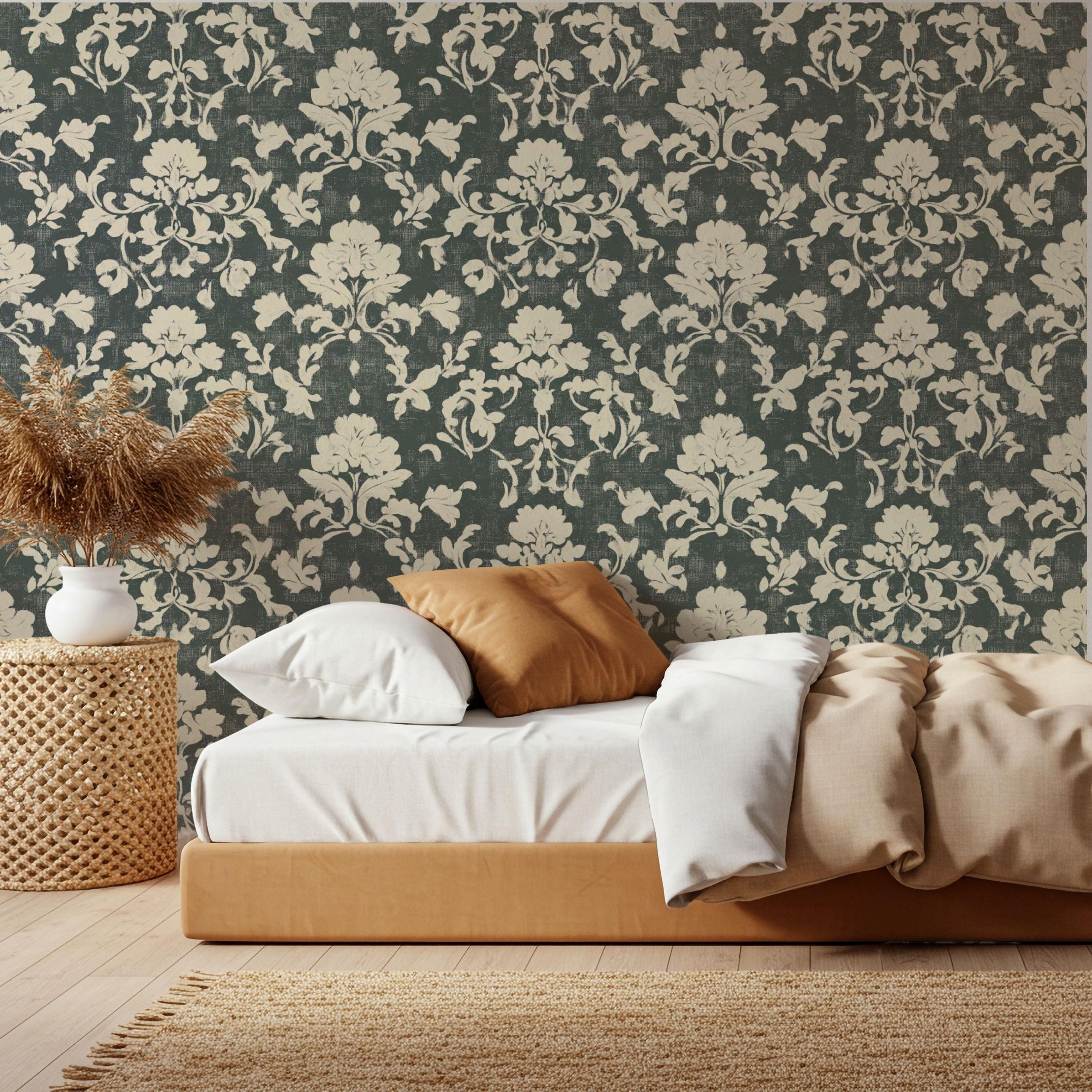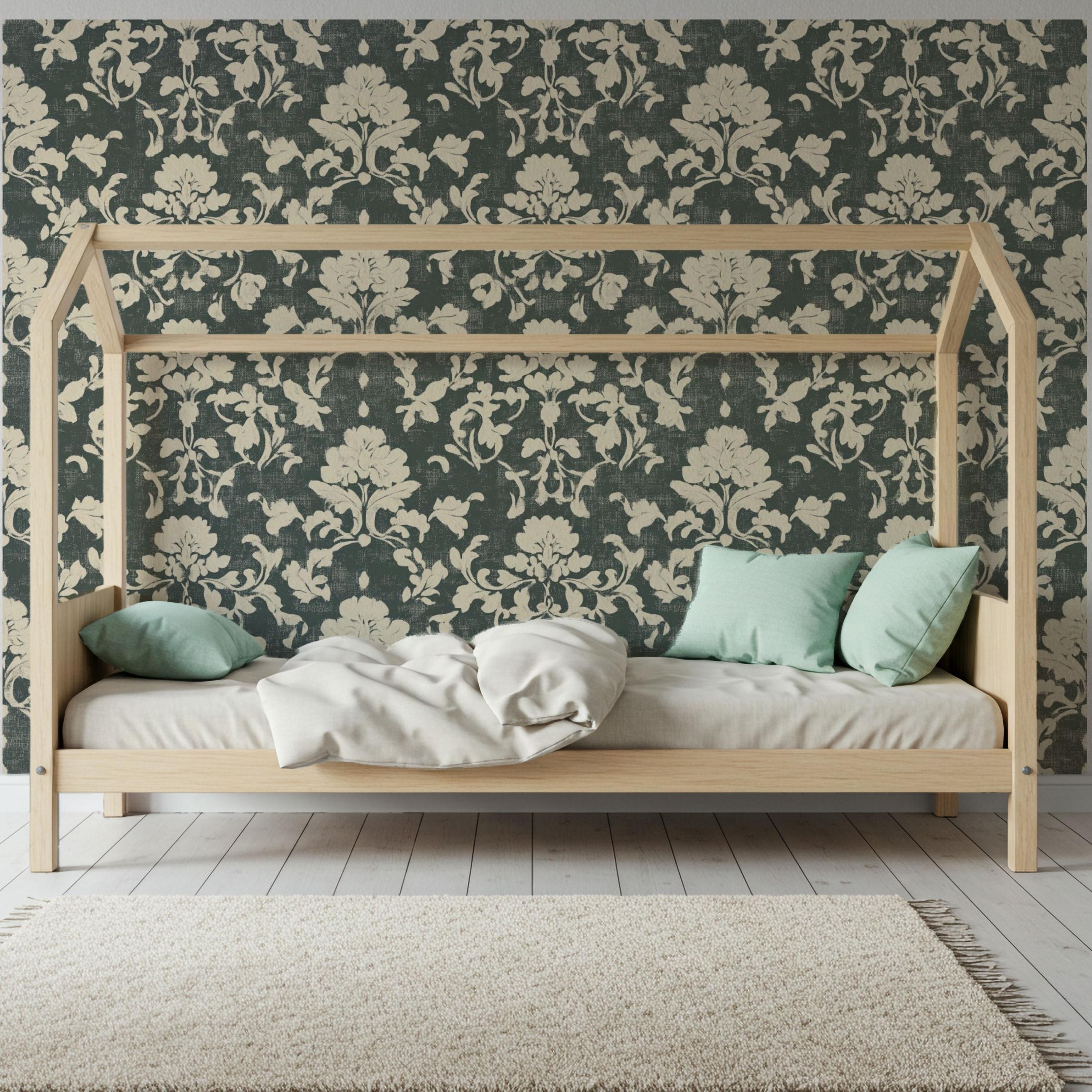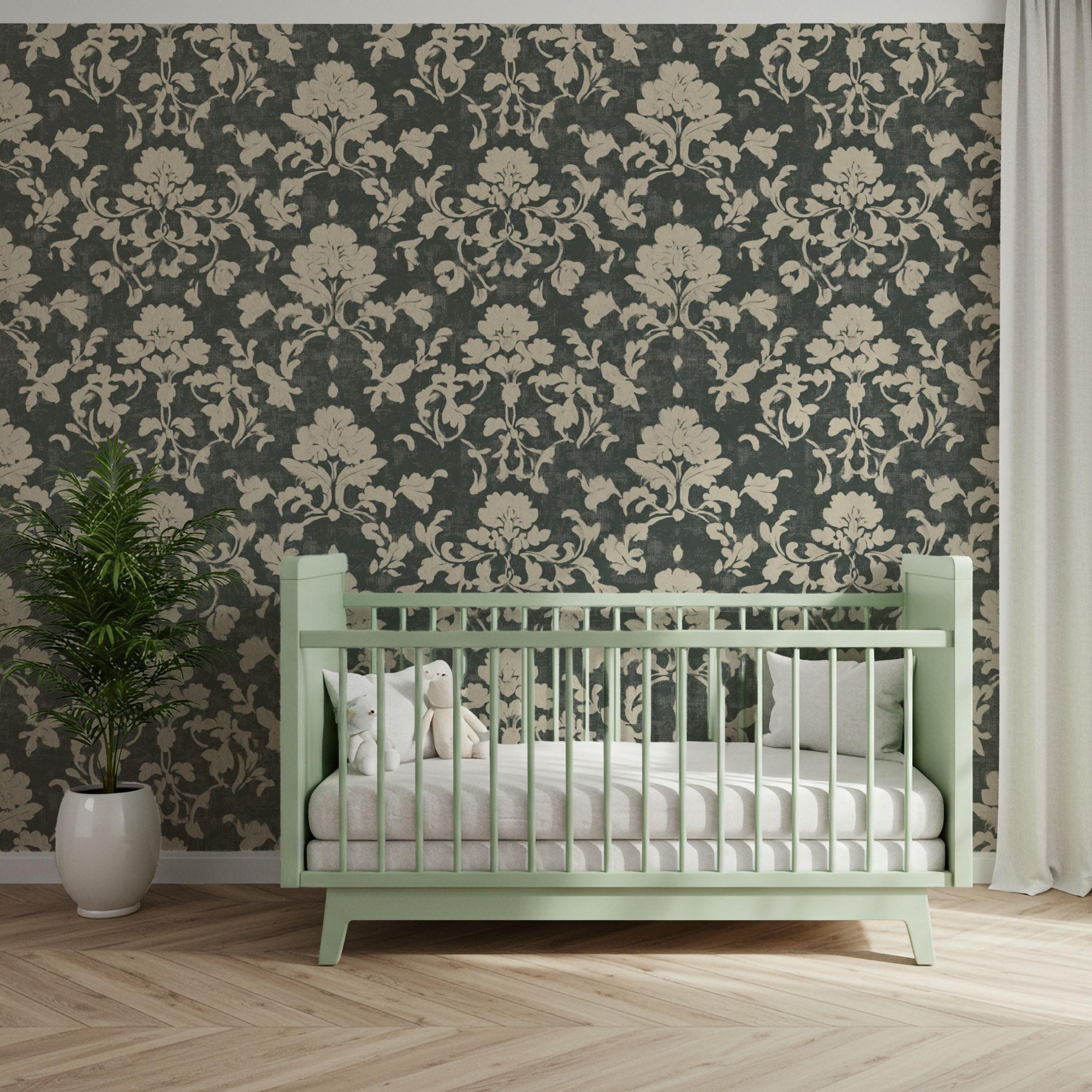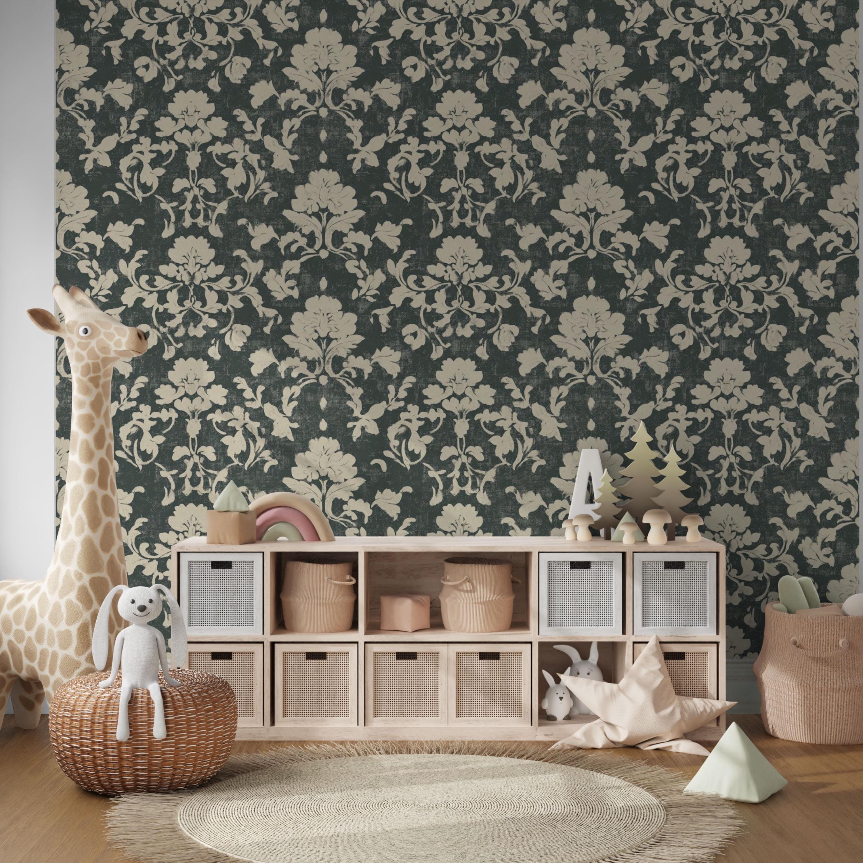 A modern heirloom with timeless soul. This distressed damask pattern pairs rich charcoal tones with soft cream florals, creating a room that feels calm, grounded, and quietly luxurious. Beautiful in nurseries, kids’ rooms, or any space that deserves understated elegance with a touch of vintage warmth.