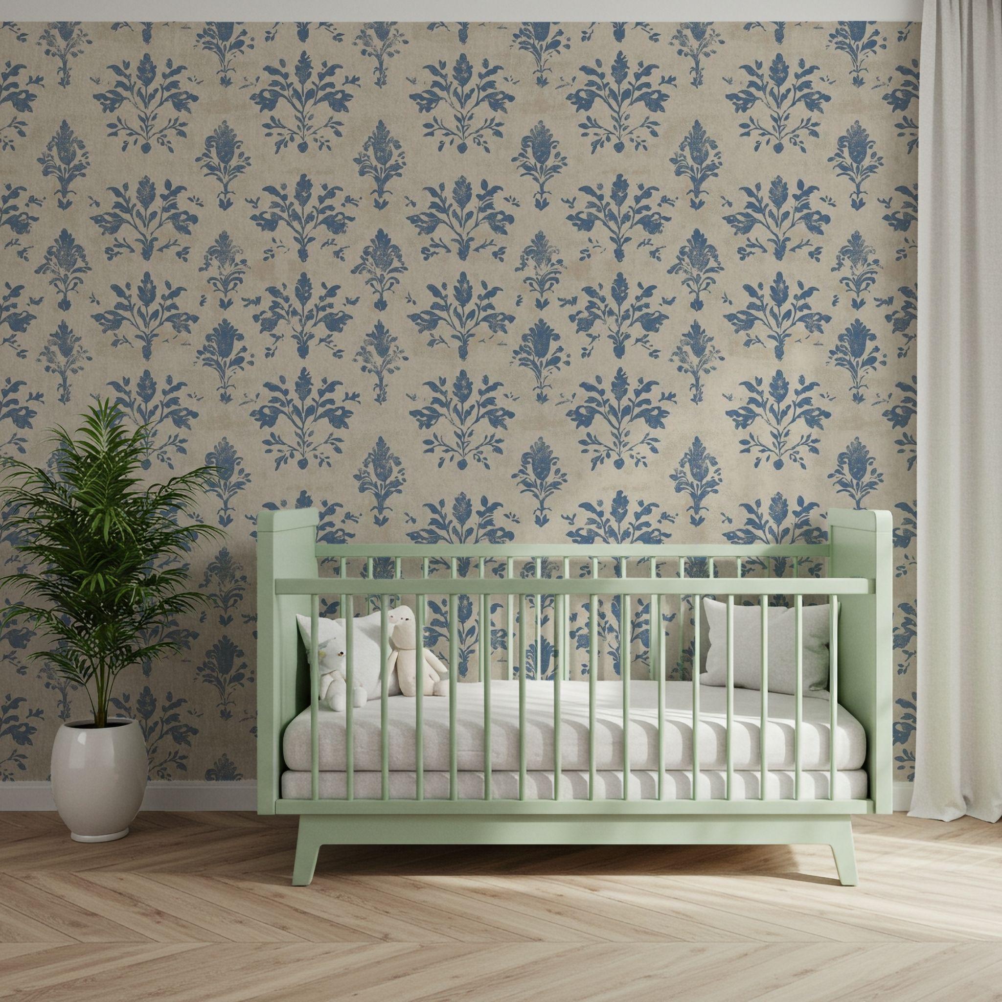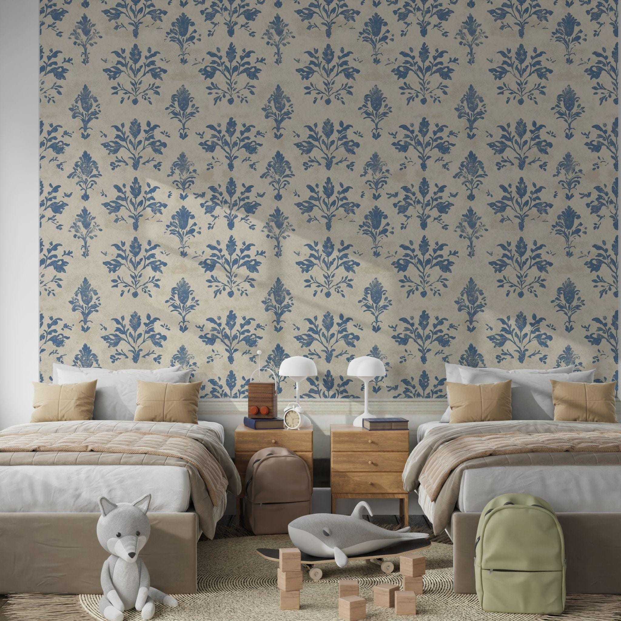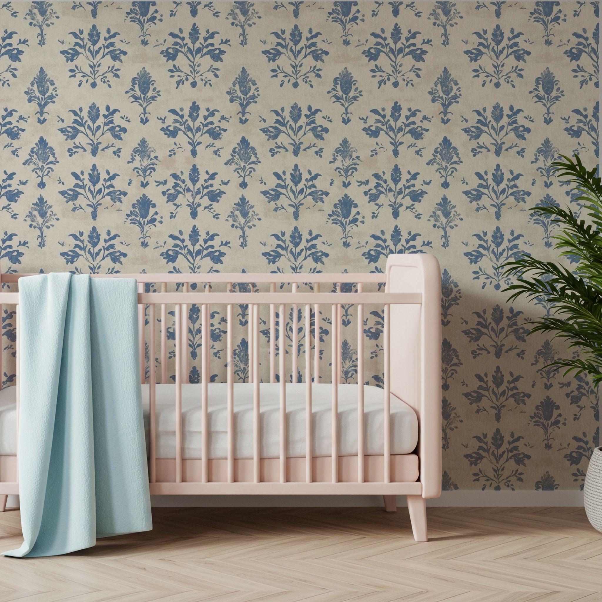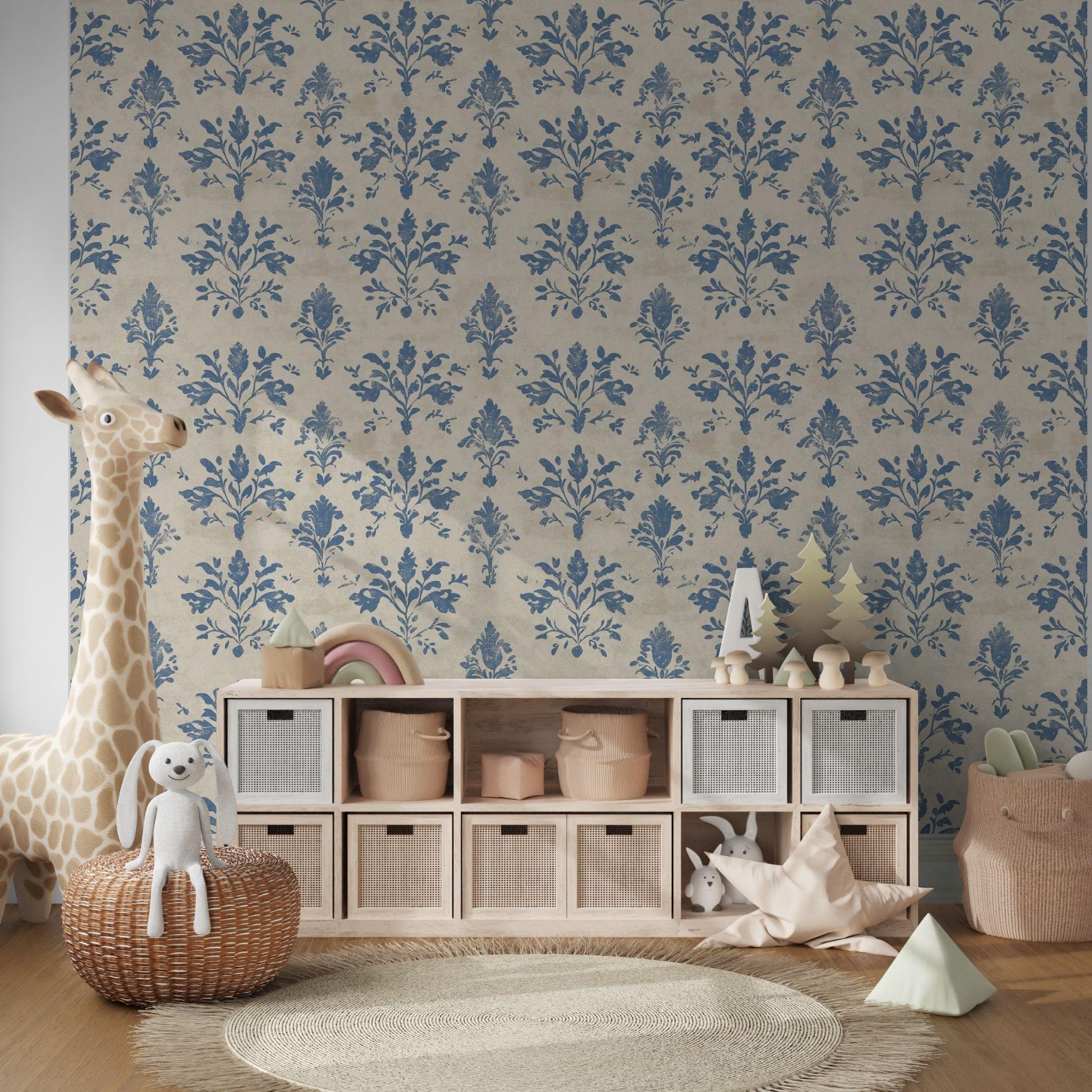 Timeless and graceful, this vintage-inspired blue damask brings a touch of heritage charm to any nursery or child’s space. The softly weathered pattern and muted tones create an atmosphere of warmth and tranquility — a design that feels beautifully collected, not newly made.