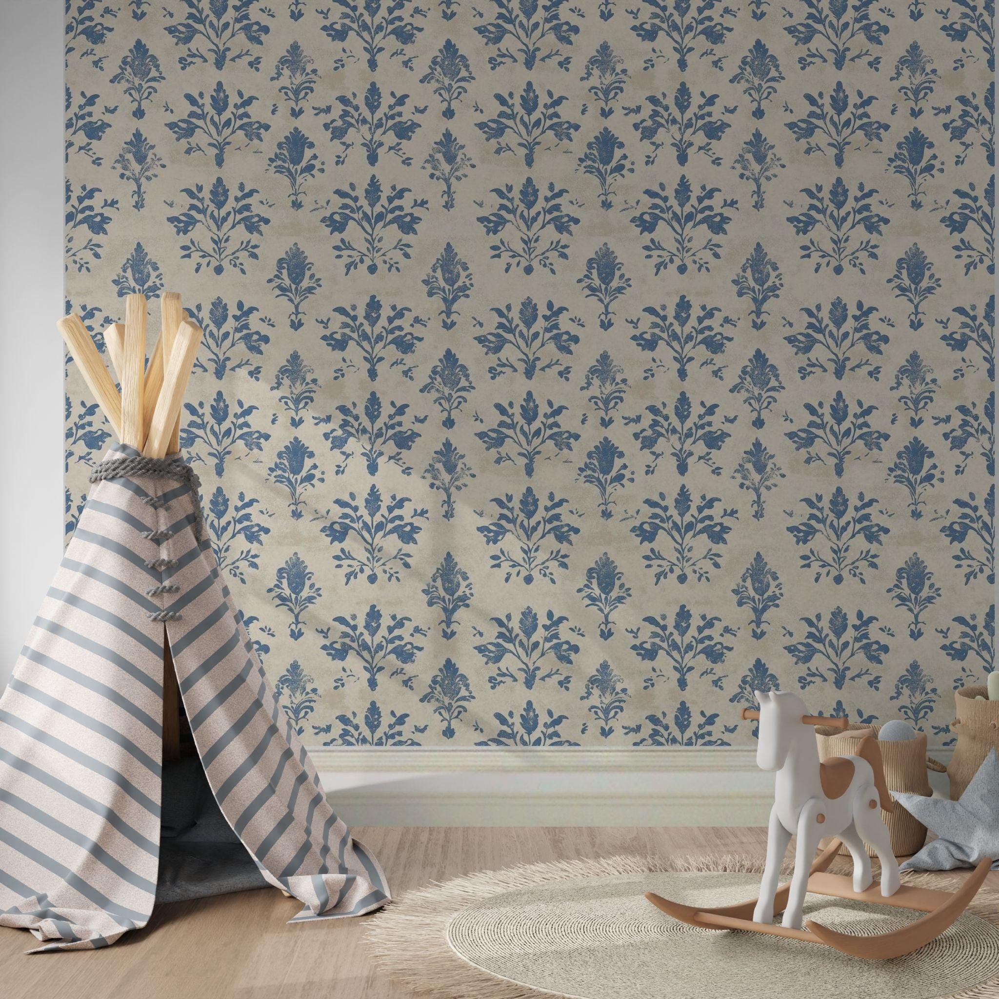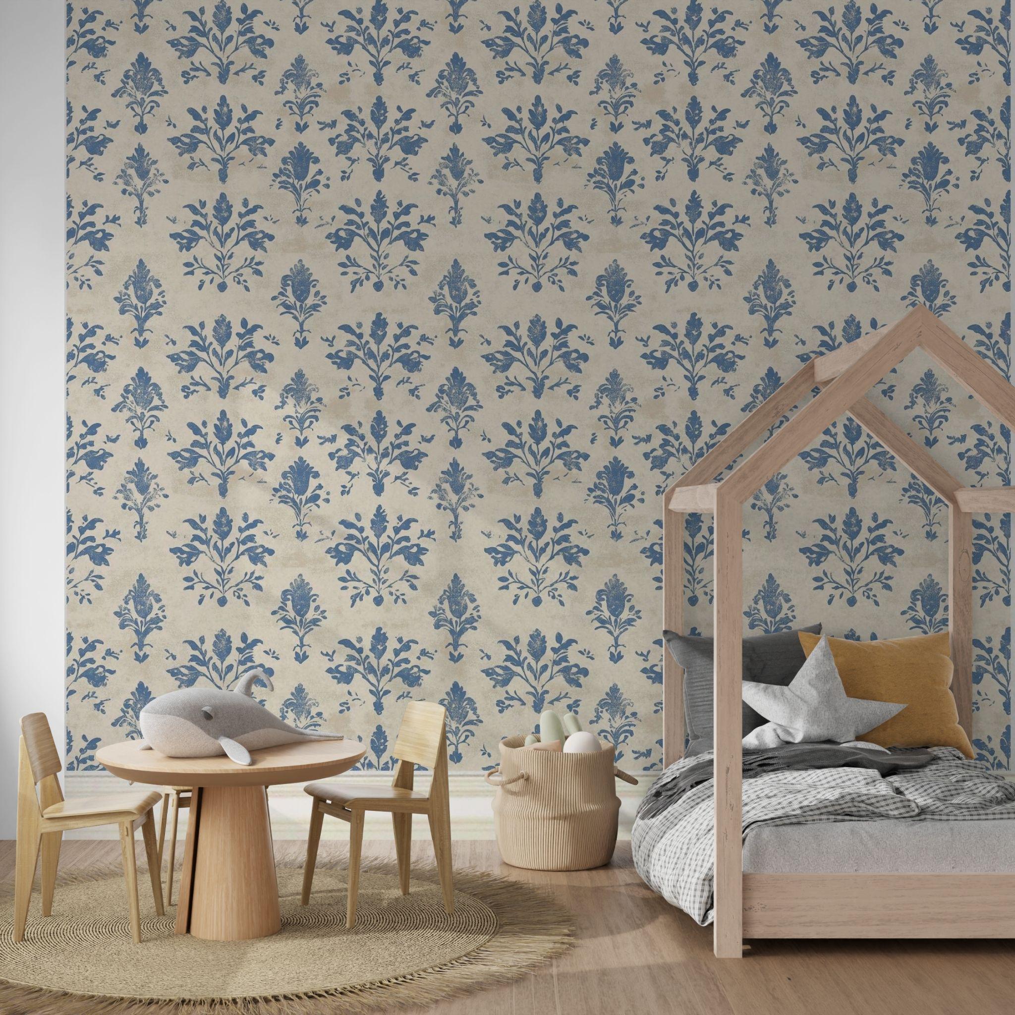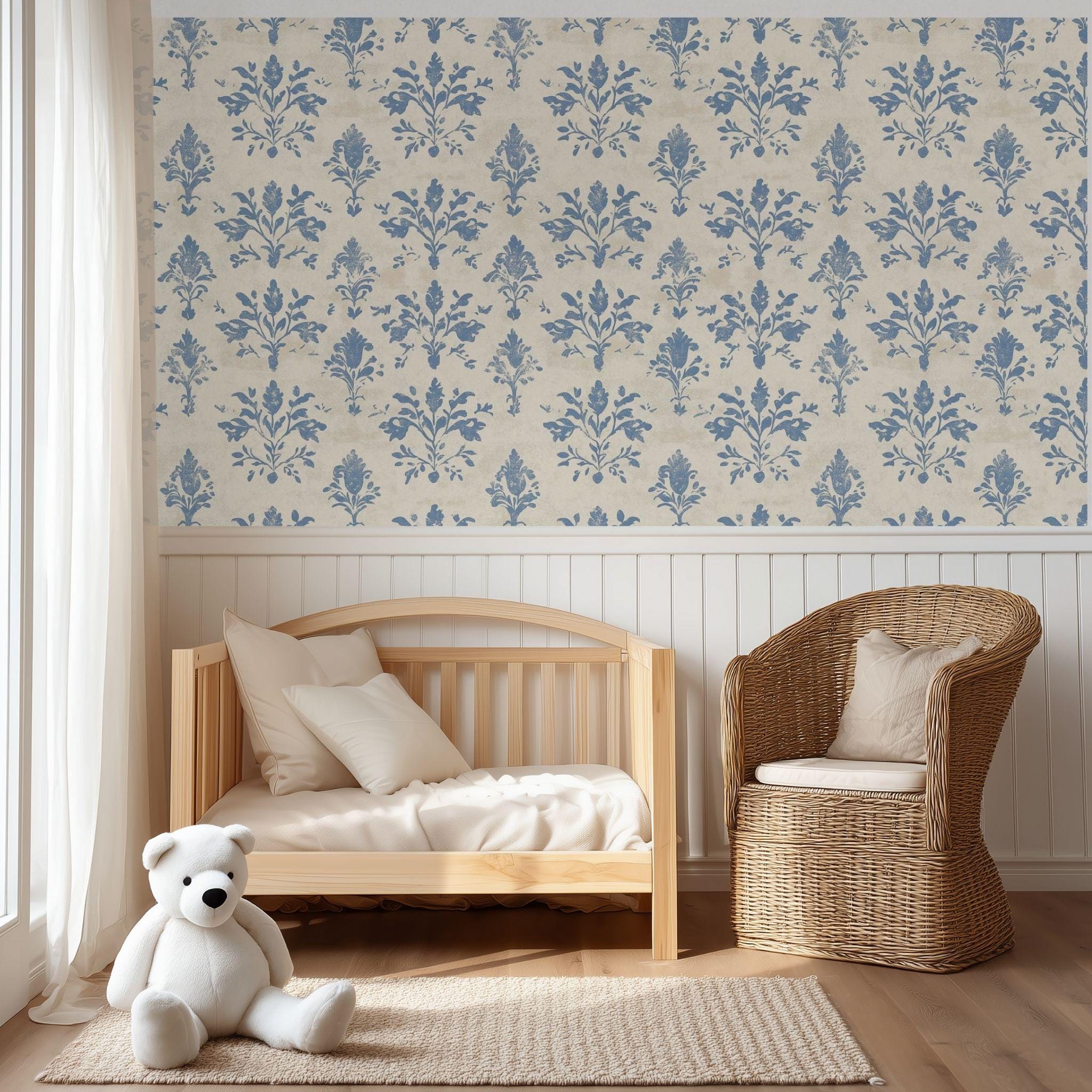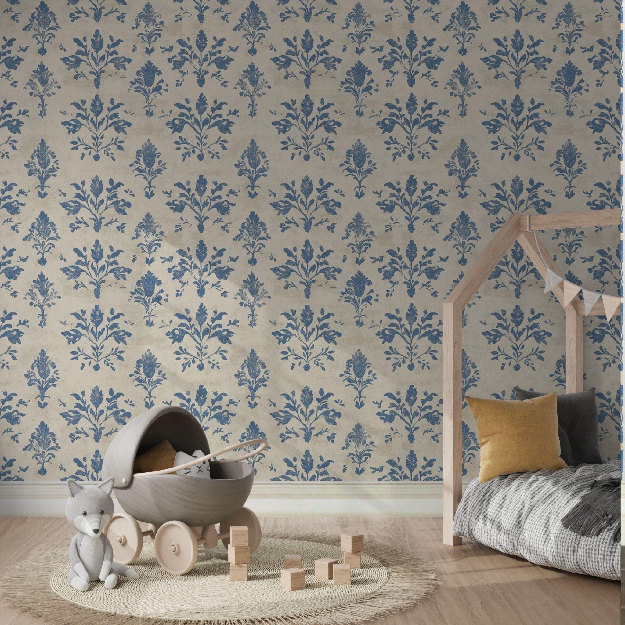 Timeless and graceful, this vintage-inspired blue damask brings a touch of heritage charm to any nursery or child’s space. The softly weathered pattern and muted tones create an atmosphere of warmth and tranquility — a design that feels beautifully collected, not newly made.