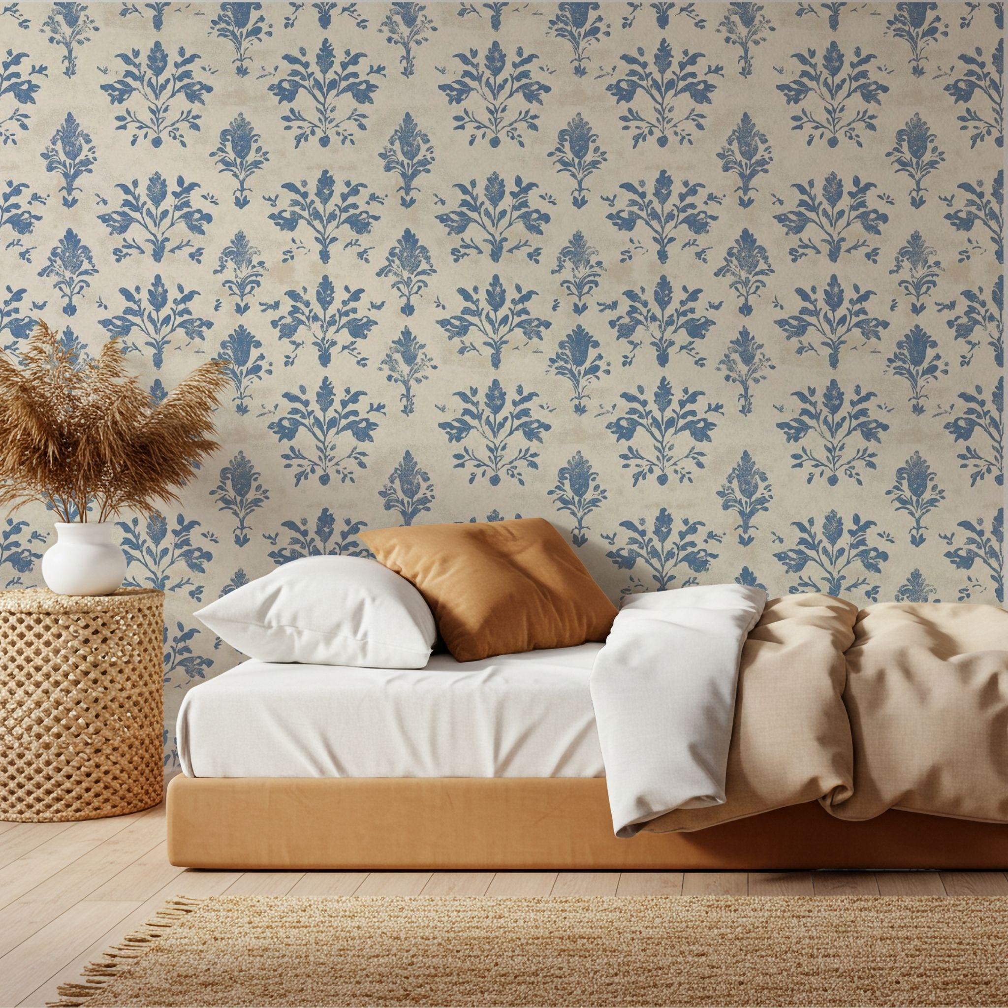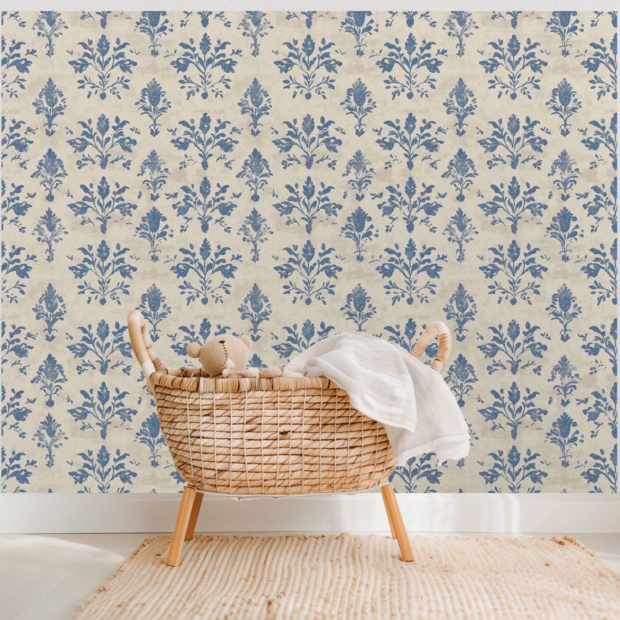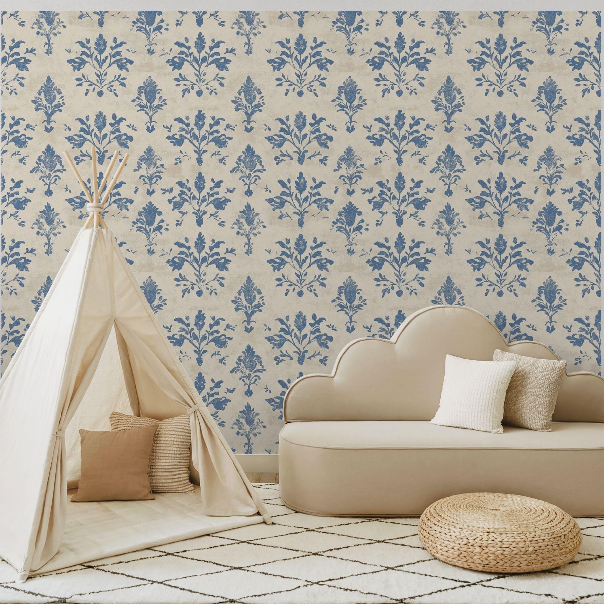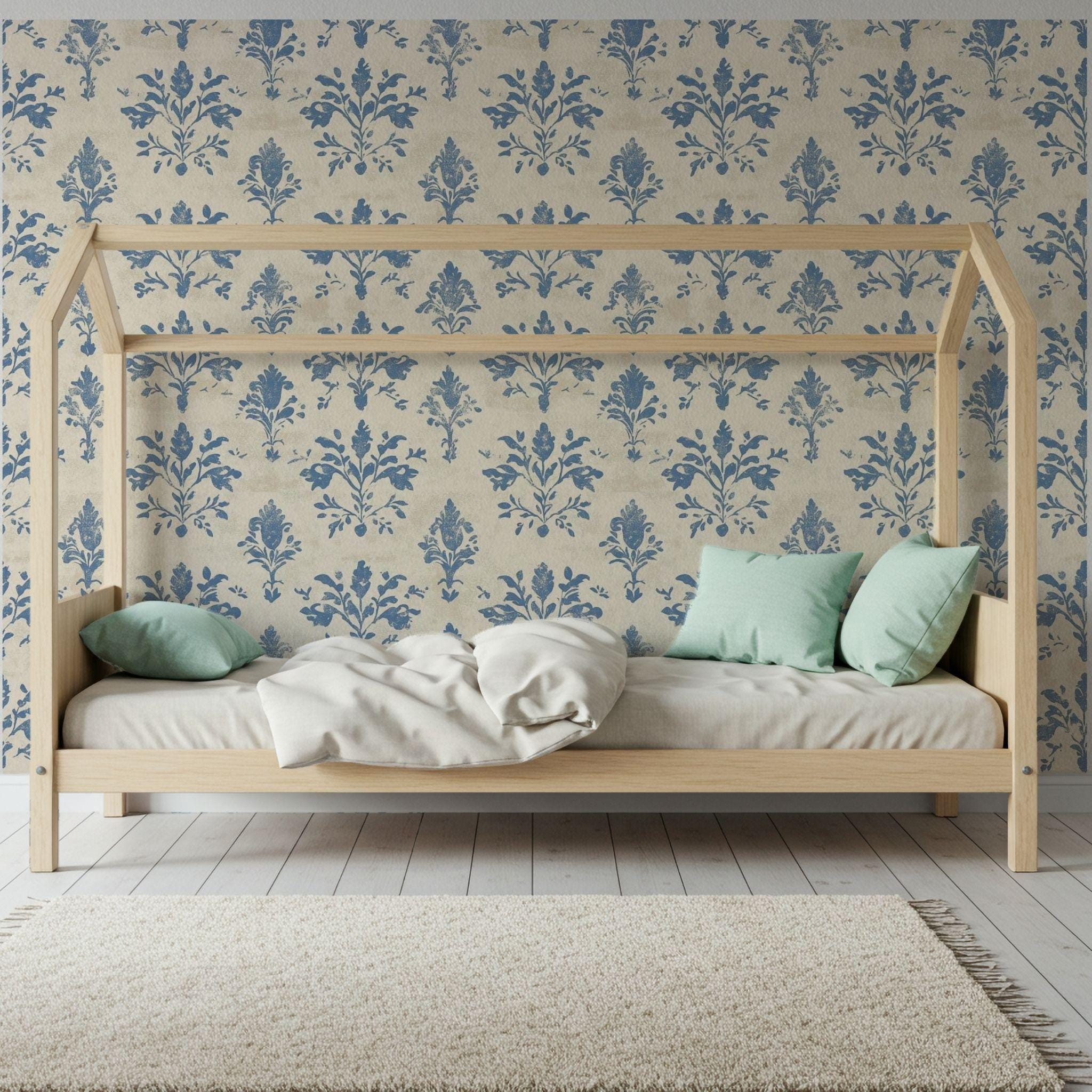 Timeless and graceful, this vintage-inspired blue damask brings a touch of heritage charm to any nursery or child’s space. The softly weathered pattern and muted tones create an atmosphere of warmth and tranquility — a design that feels beautifully collected, not newly made.