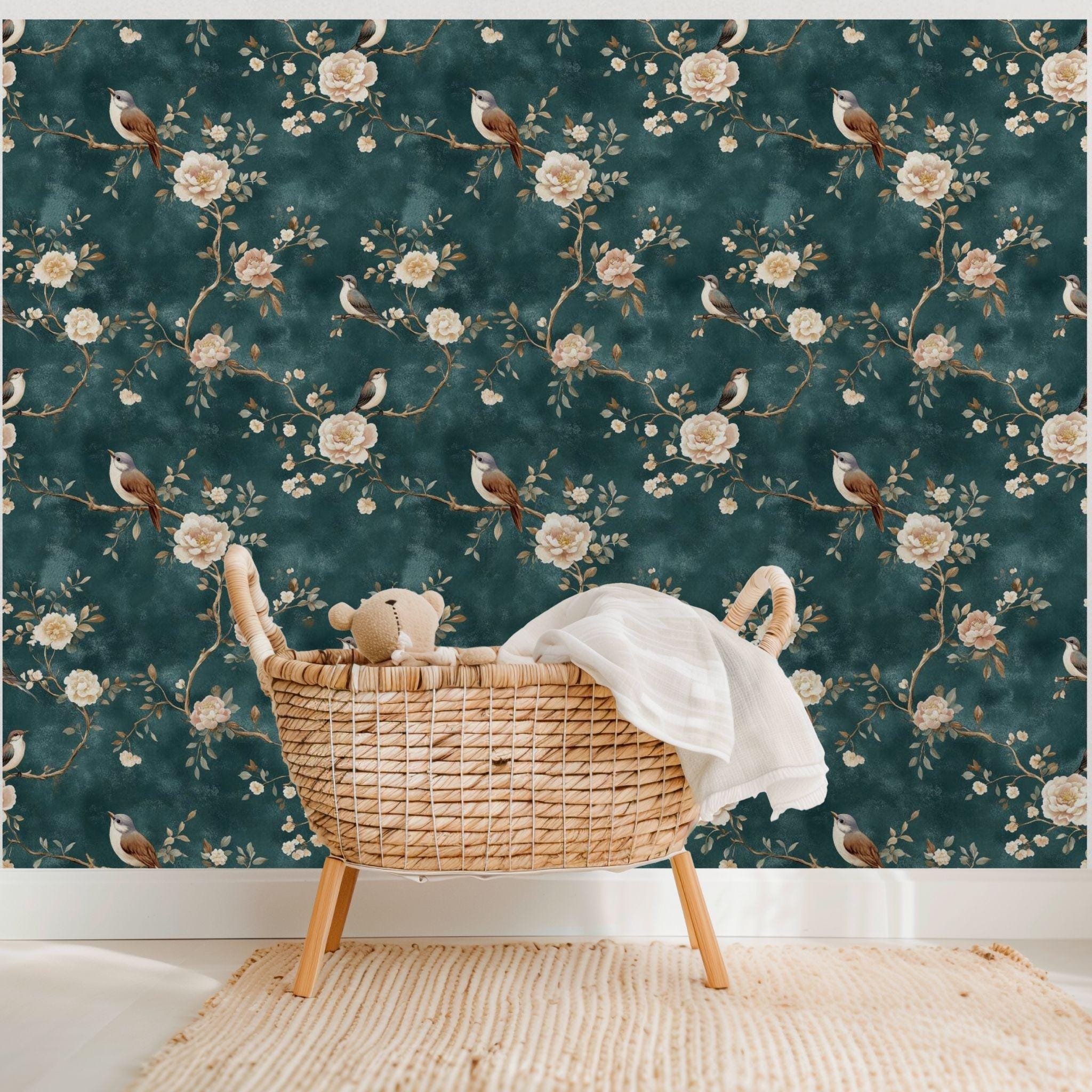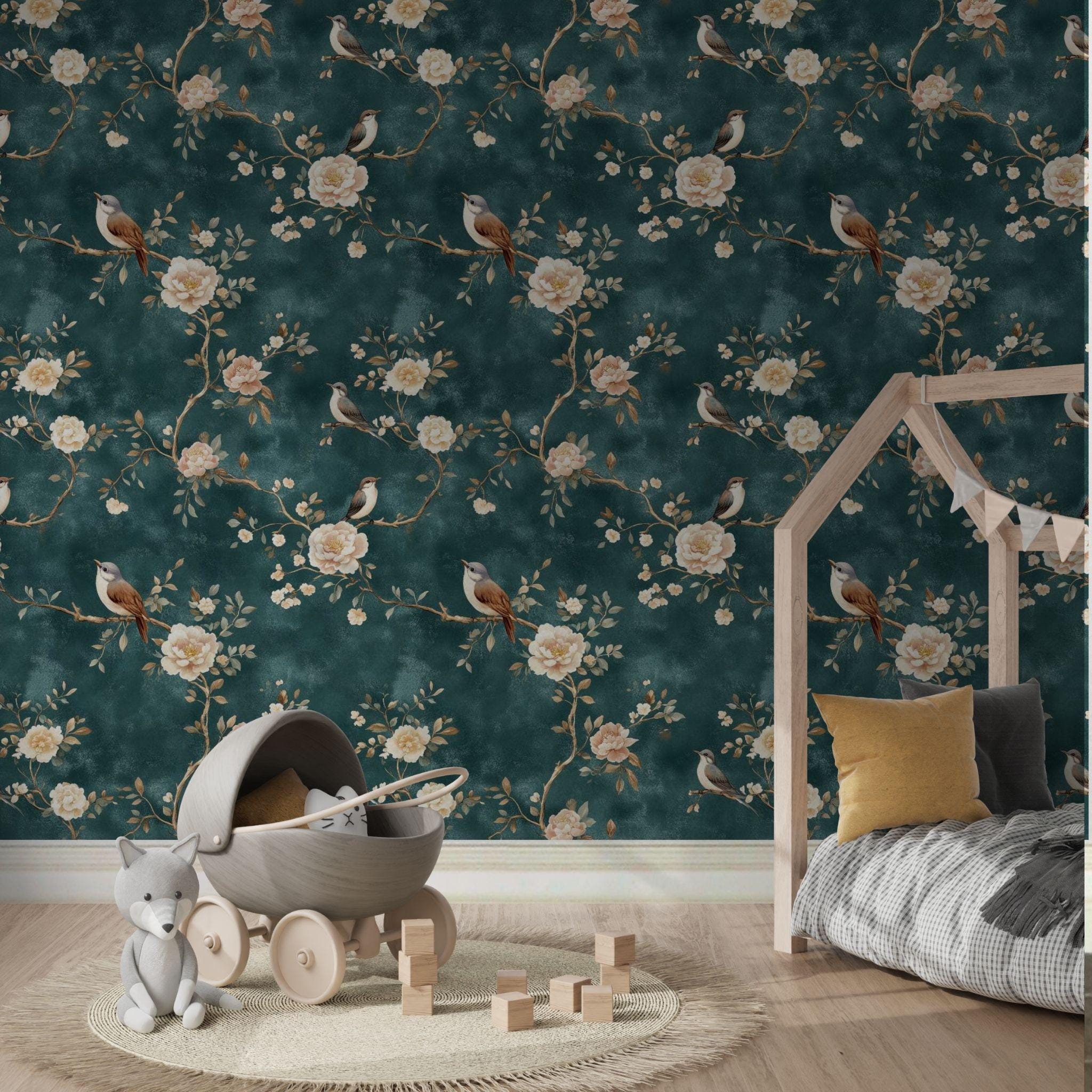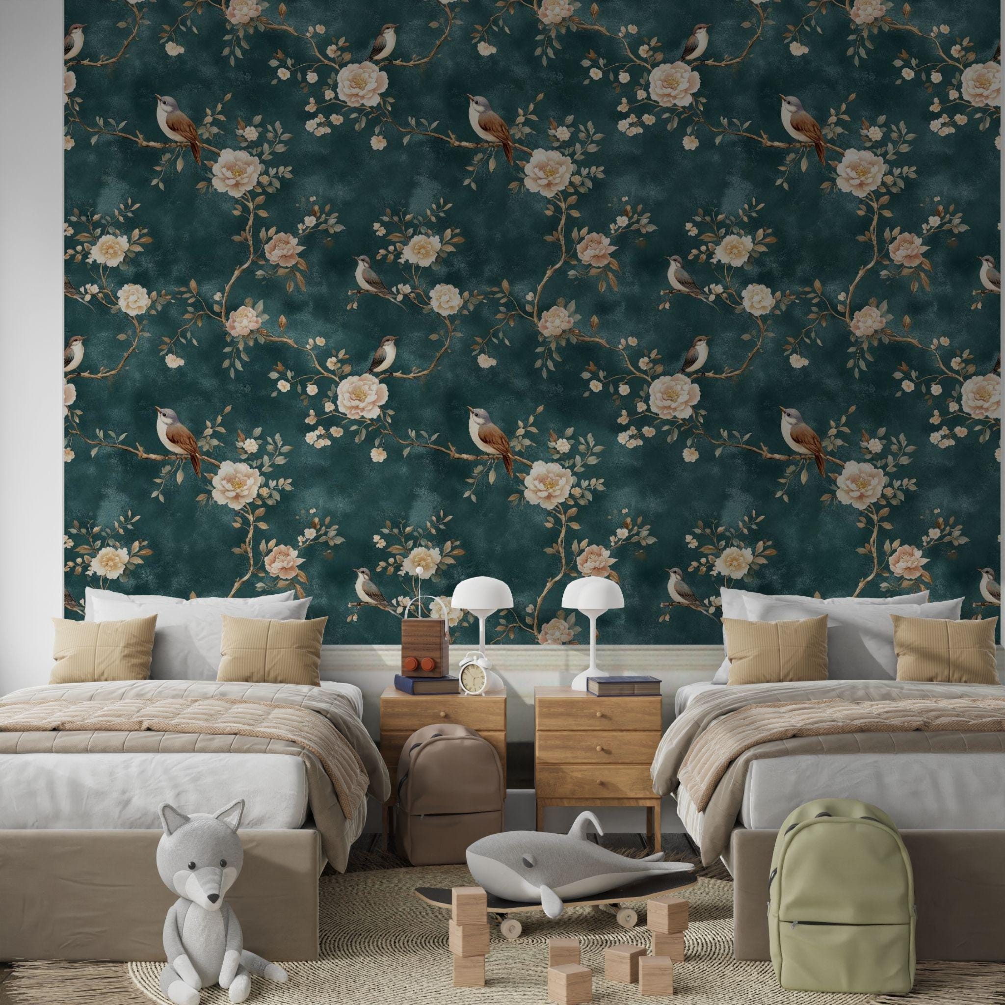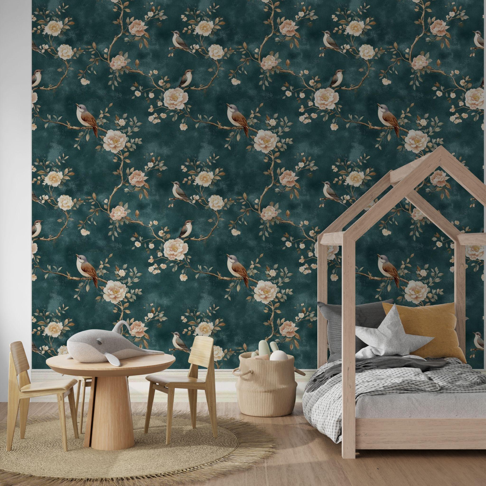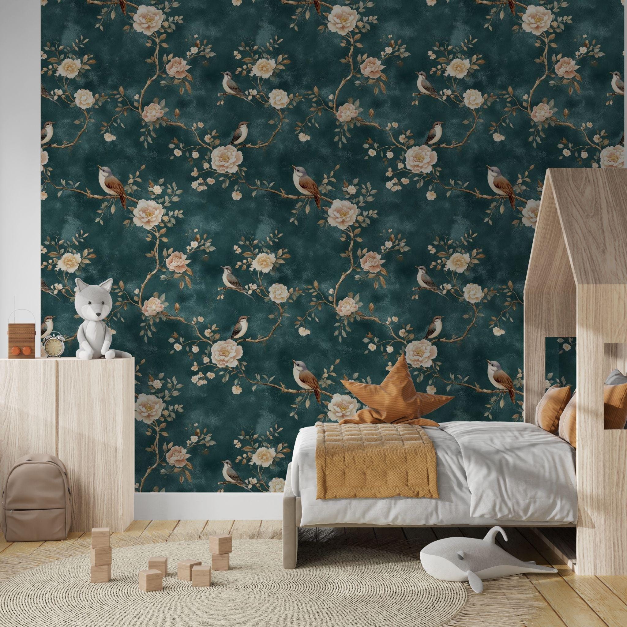 Soft songbirds and delicate blooms rest against a deep botanical green, creating a look of timeless beauty and quiet luxury. With painterly depth and gentle detail, this wallpaper brings warmth, elegance, and a touch of nature’s calm to any space meant to inspire peace and imagination.