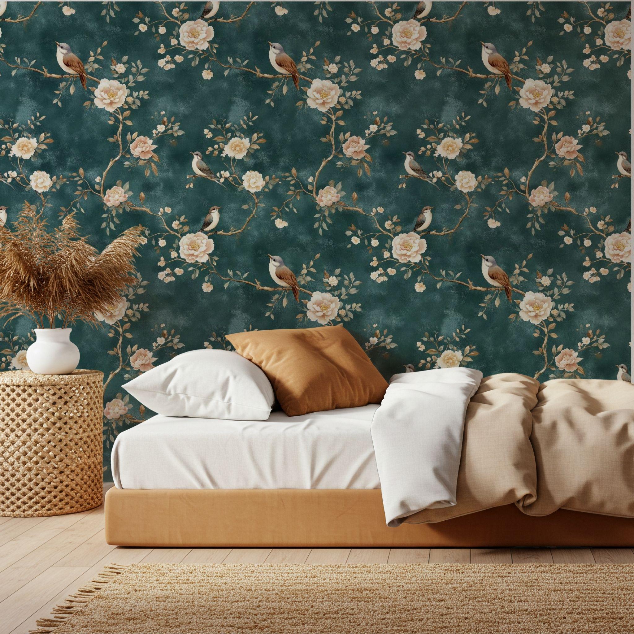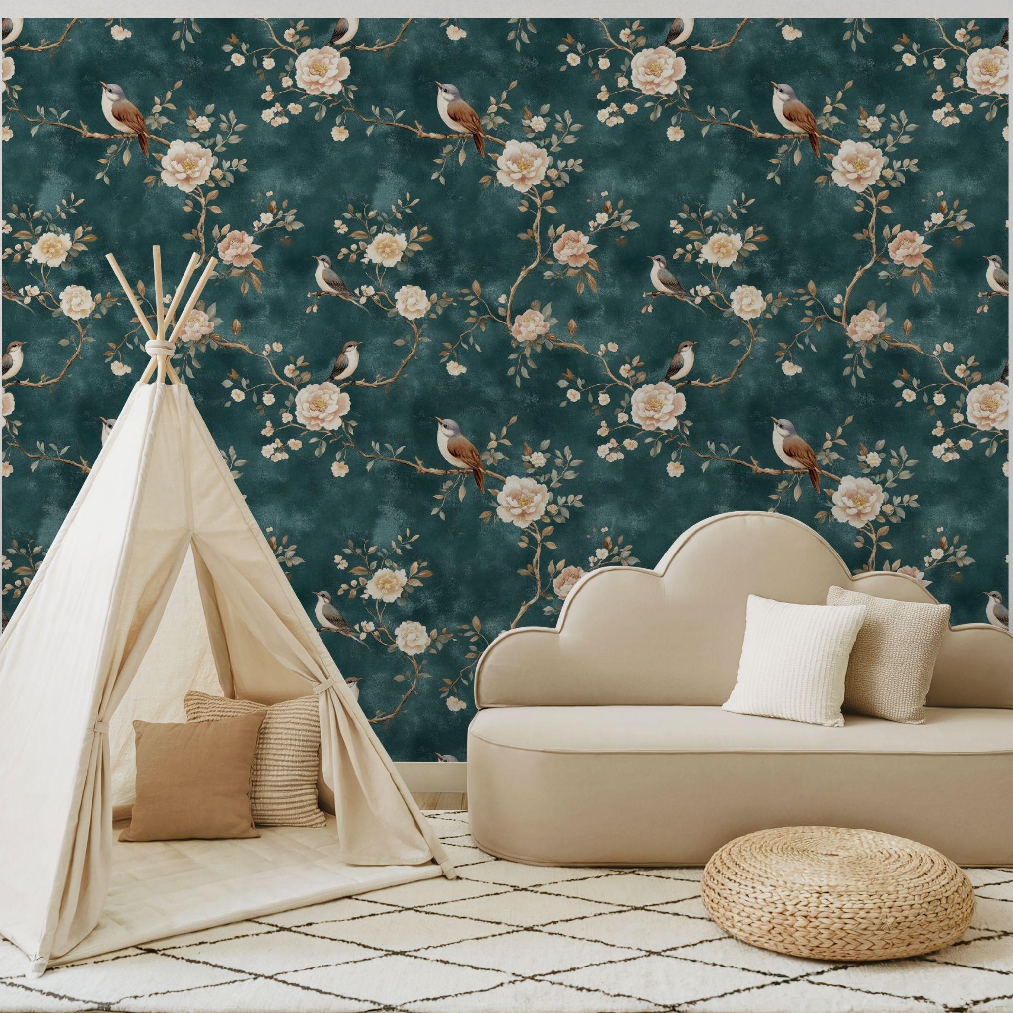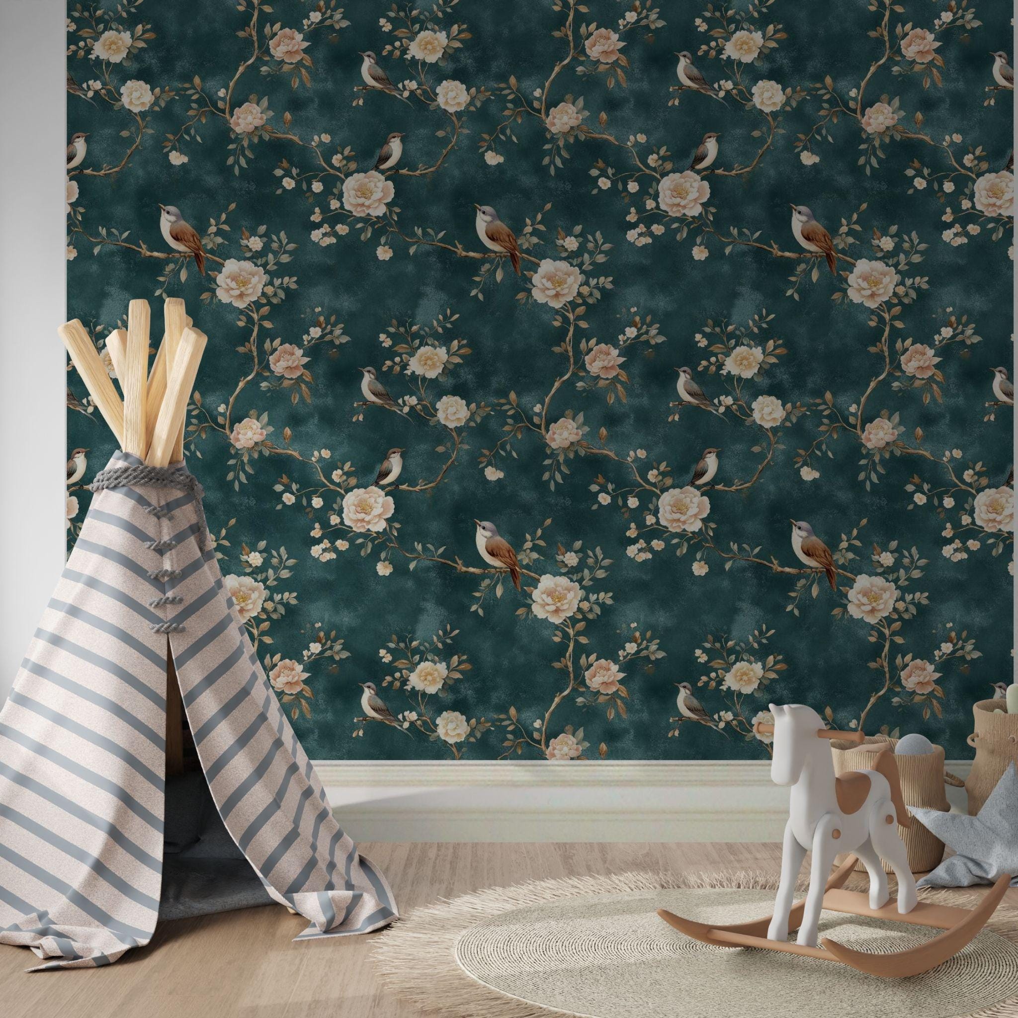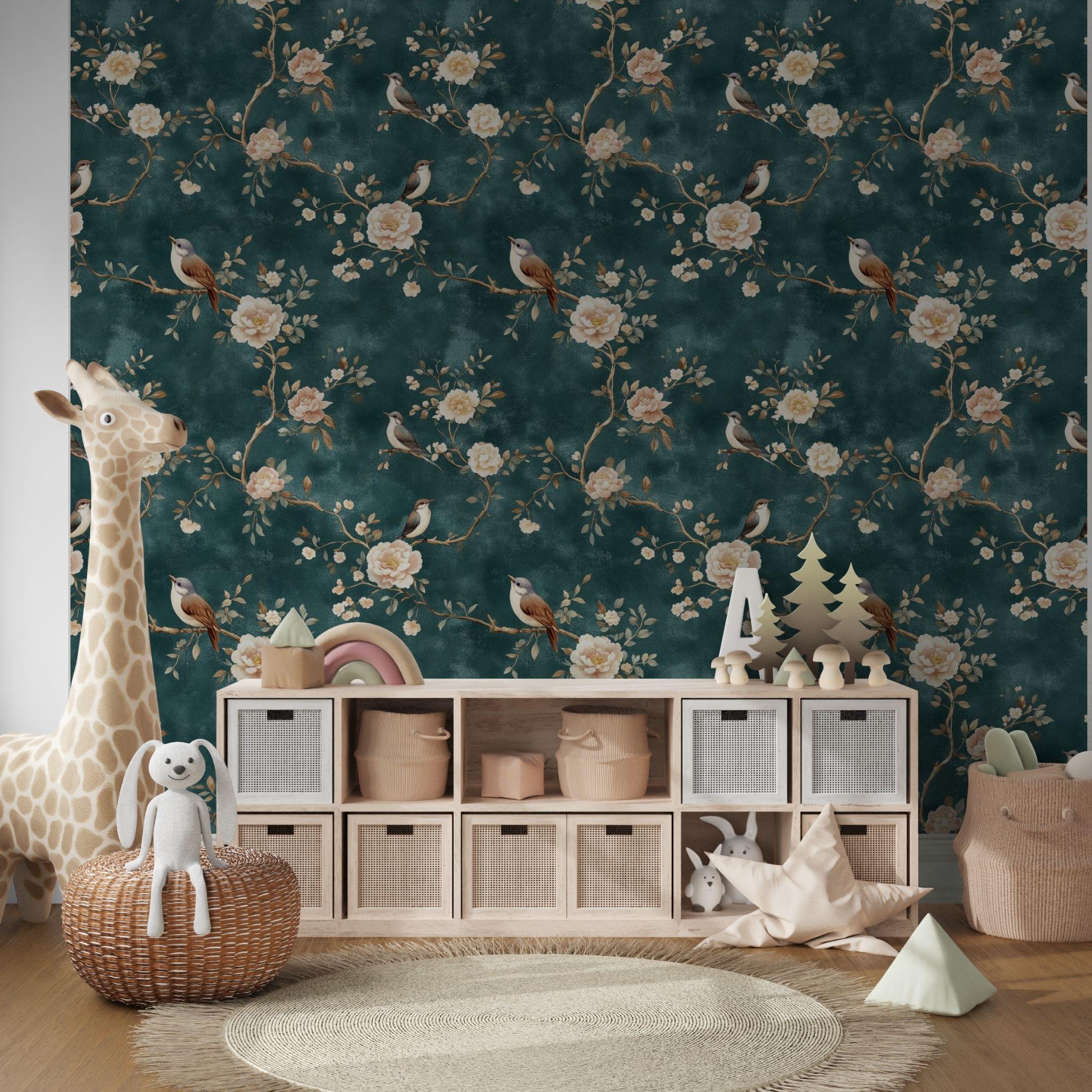 Soft songbirds and delicate blooms rest against a deep botanical green, creating a look of timeless beauty and quiet luxury. With painterly depth and gentle detail, this wallpaper brings warmth, elegance, and a touch of nature’s calm to any space meant to inspire peace and imagination.