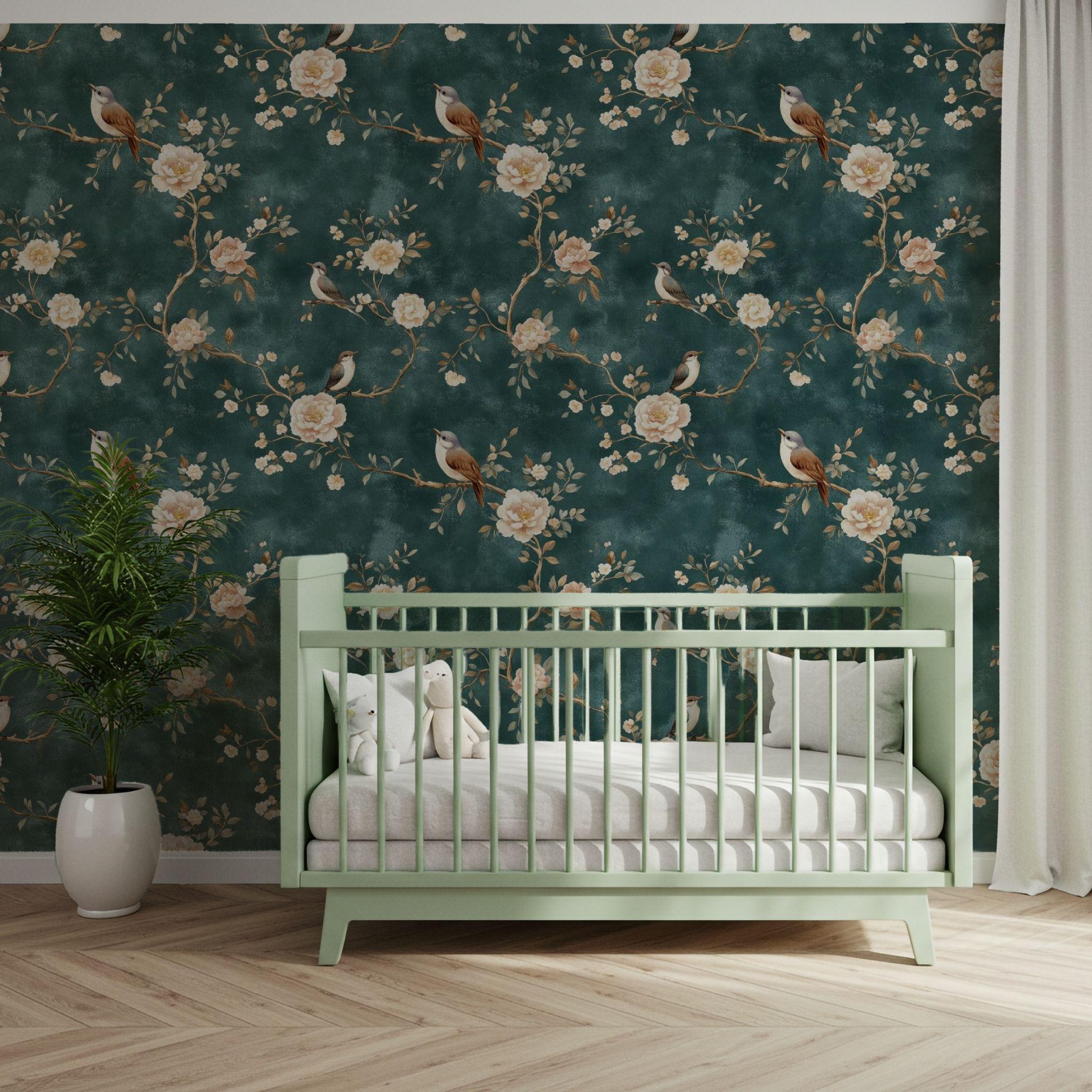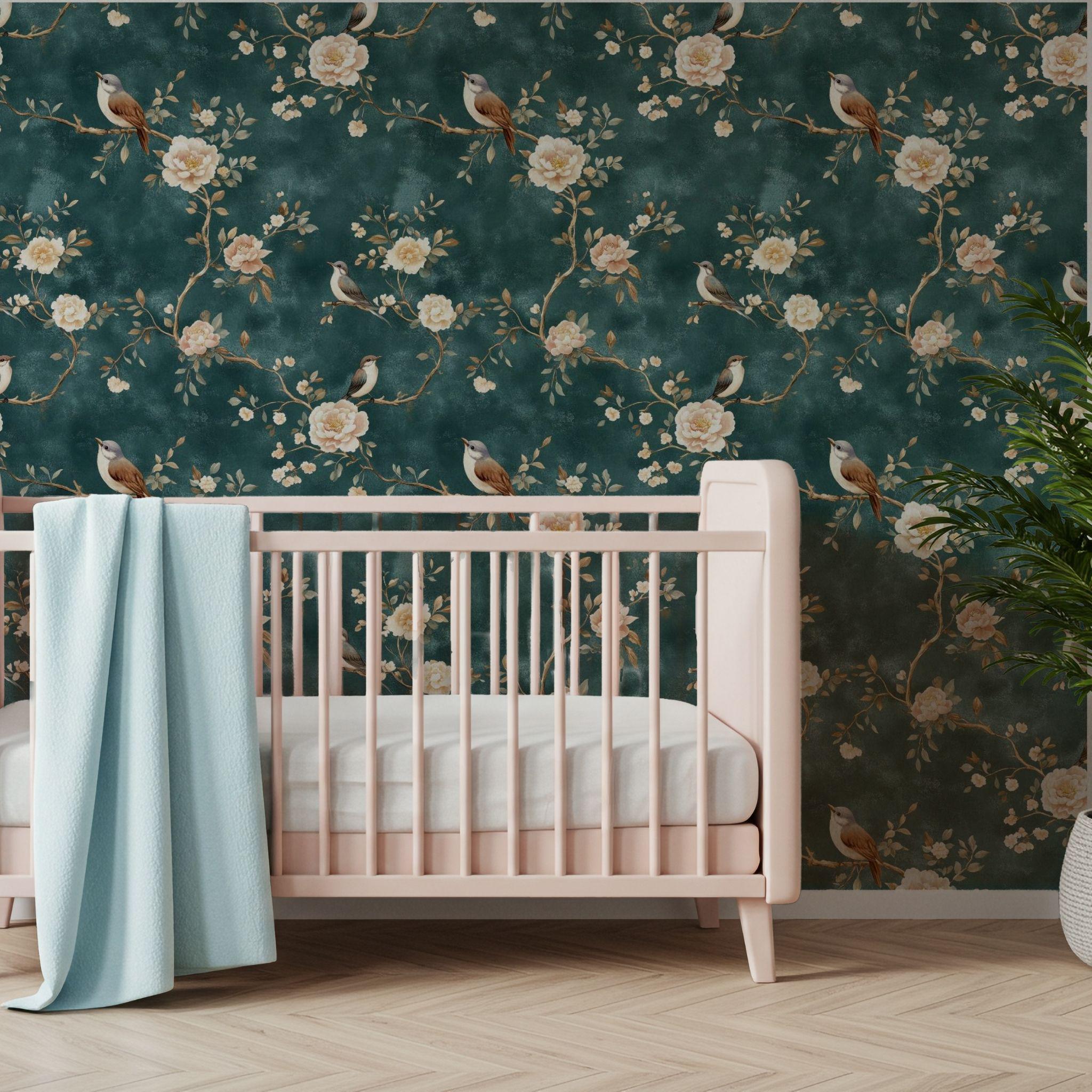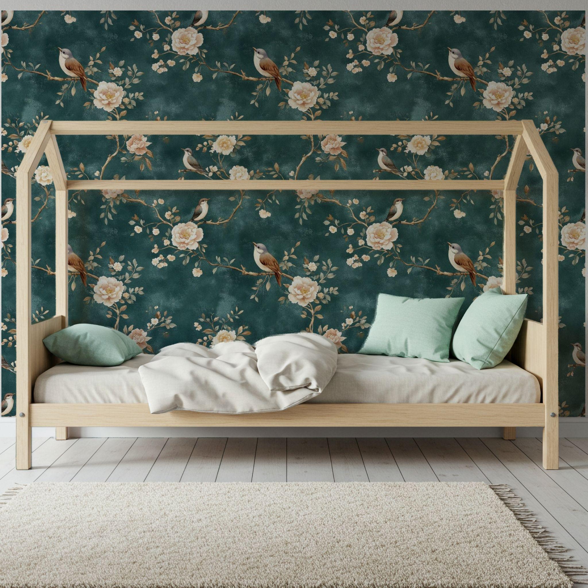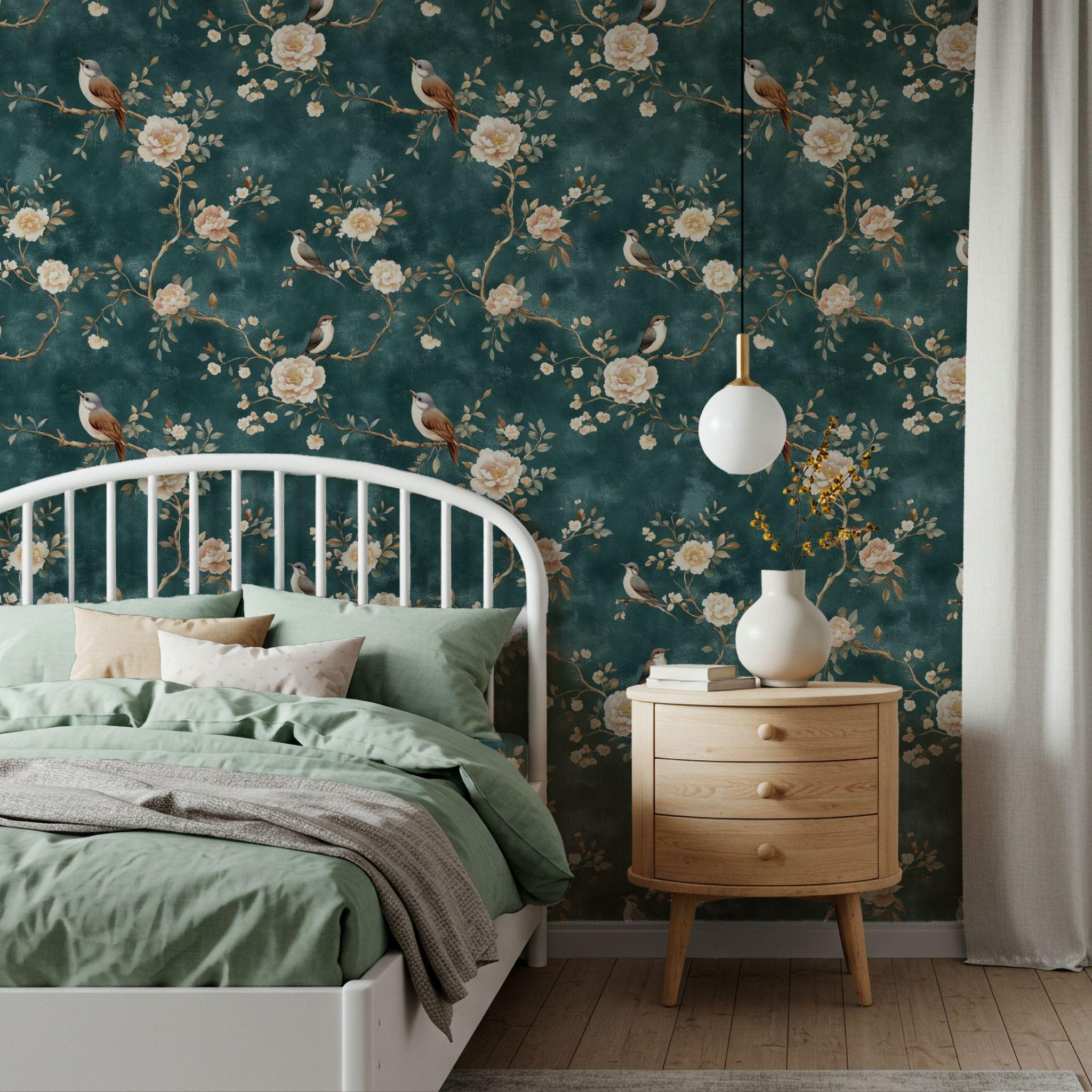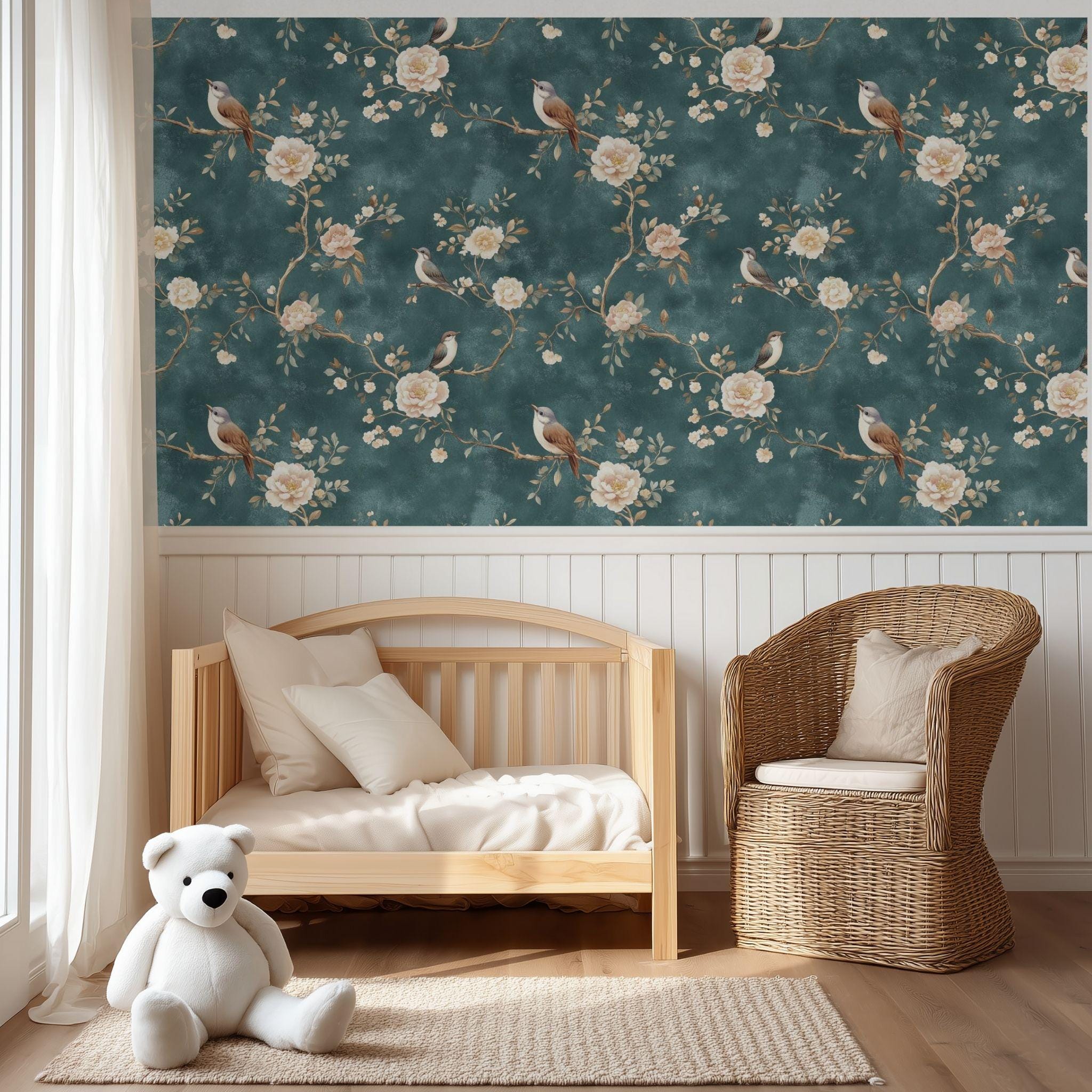 Soft songbirds and delicate blooms rest against a deep botanical green, creating a look of timeless beauty and quiet luxury. With painterly depth and gentle detail, this wallpaper brings warmth, elegance, and a touch of nature’s calm to any space meant to inspire peace and imagination.