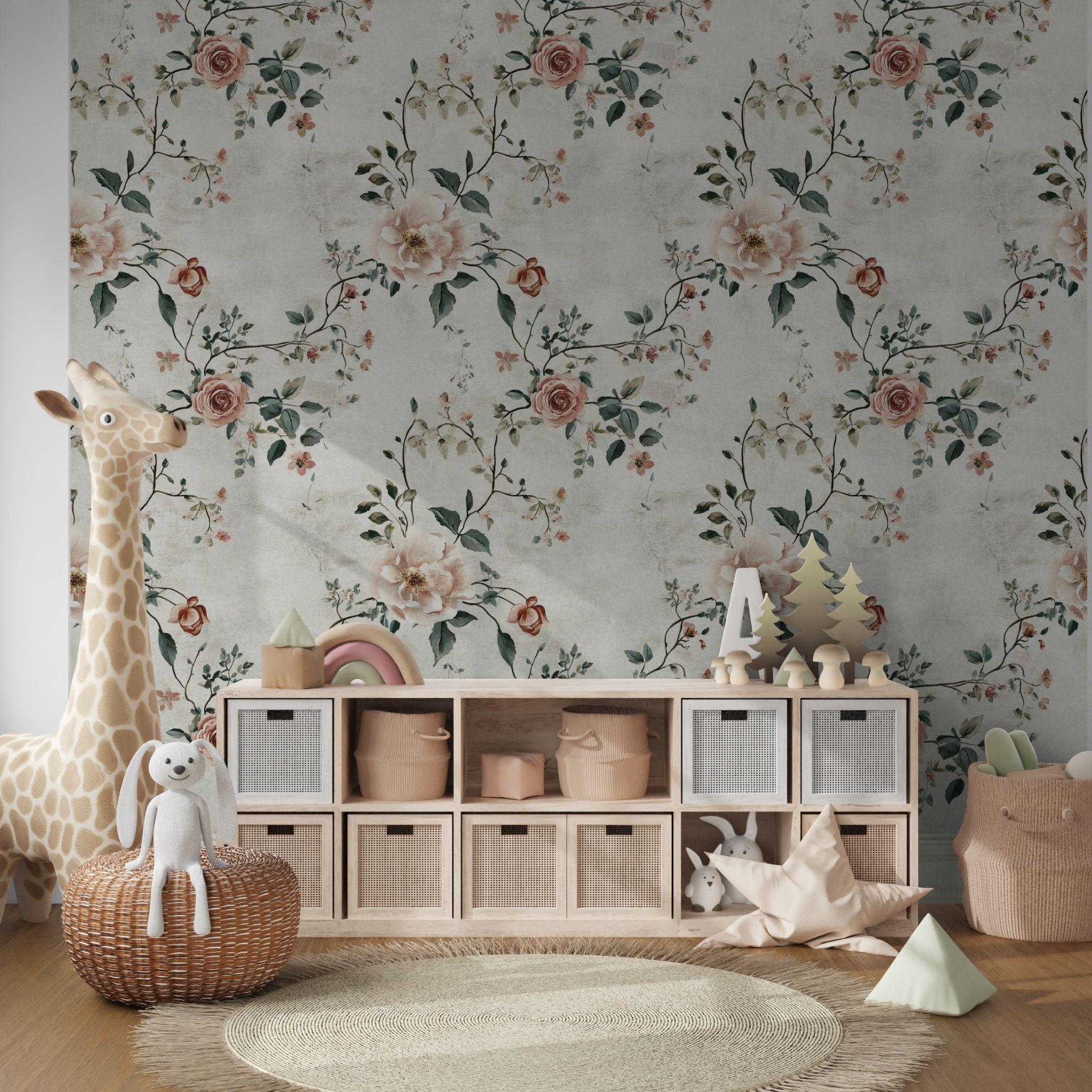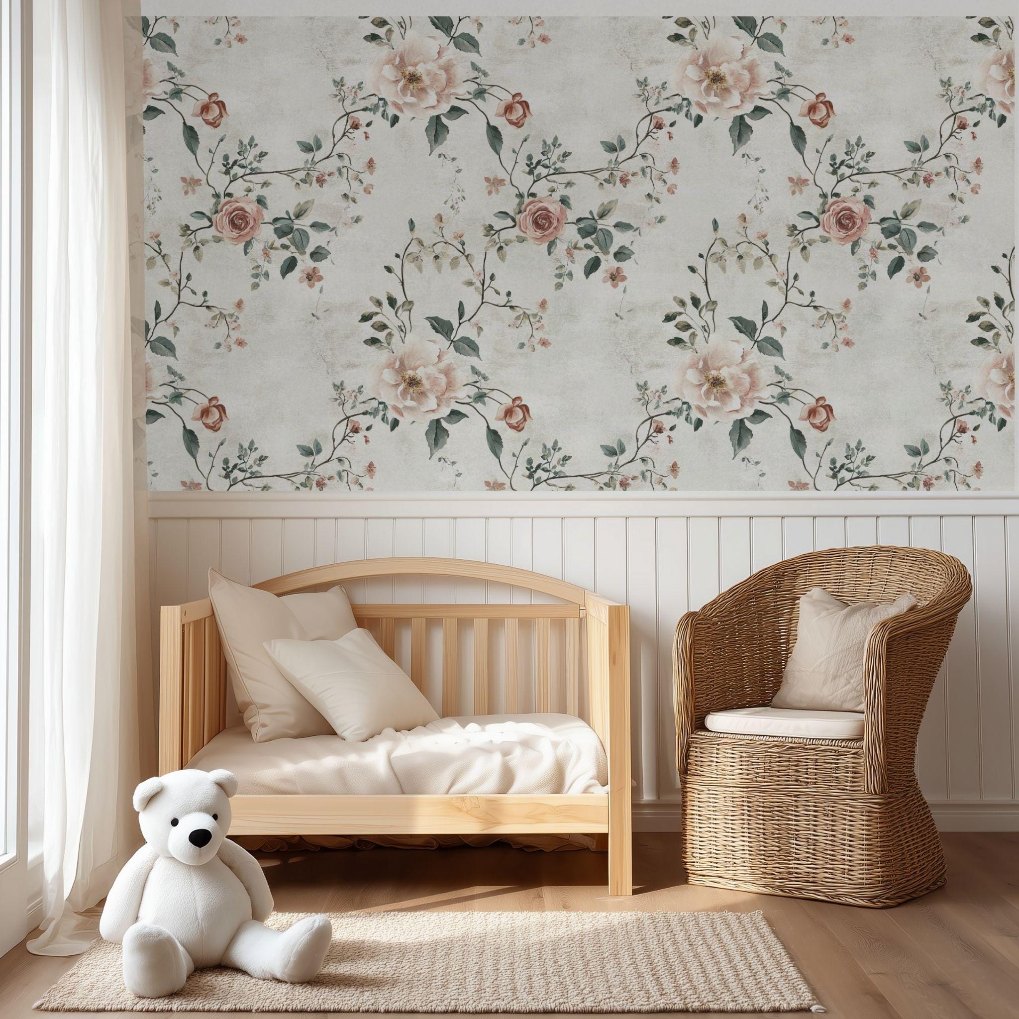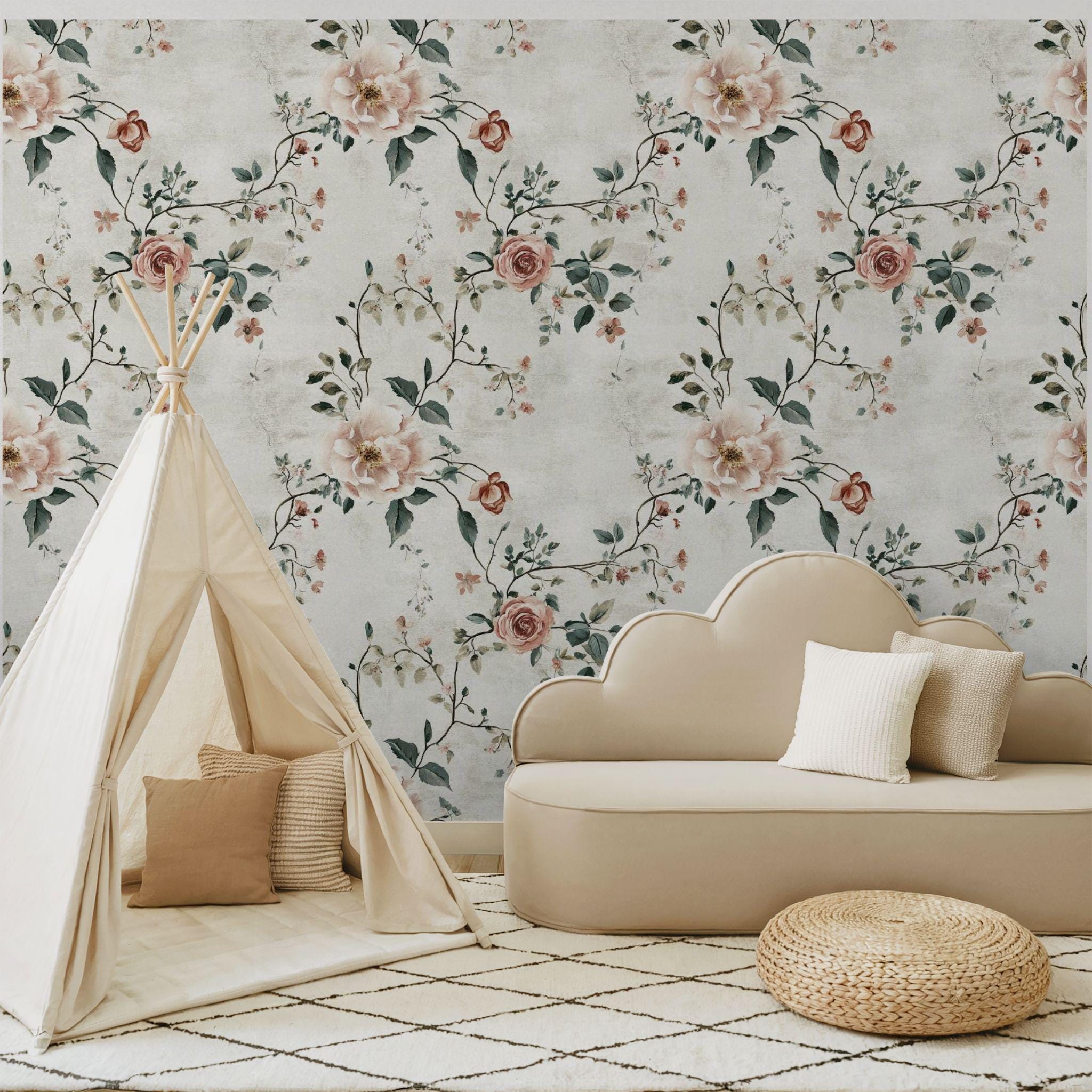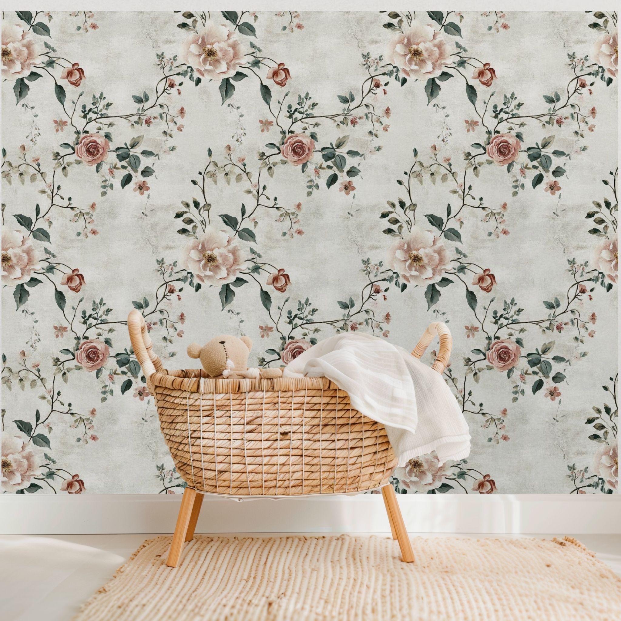 Soft blush and taupe blooms drift across a mist-washed background, creating a look that’s serene, elegant, and full of warmth. The painterly texture and gentle color palette bring a feeling of calm refinement — perfect for nurseries, bedrooms, or any space meant to feel tender and timeless.