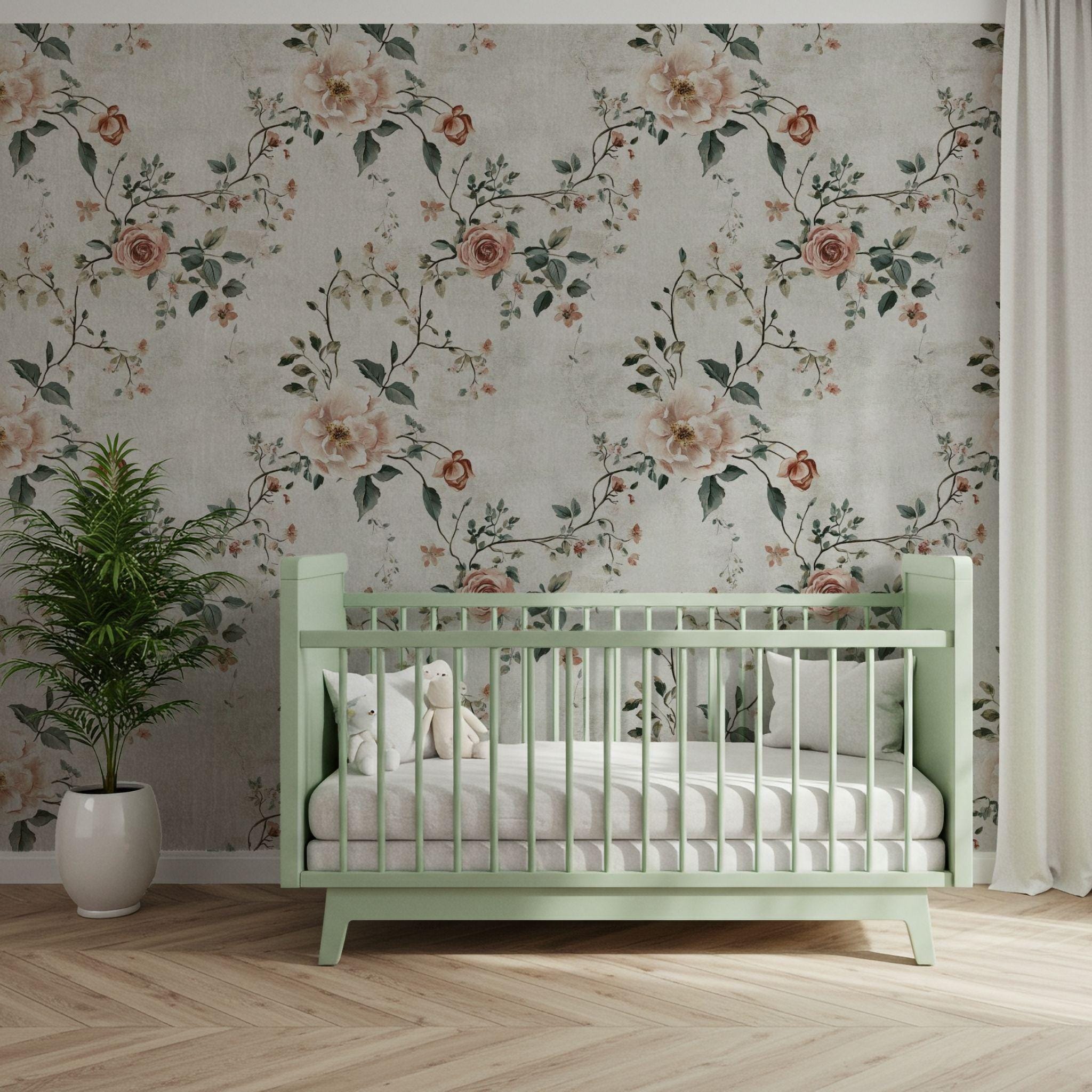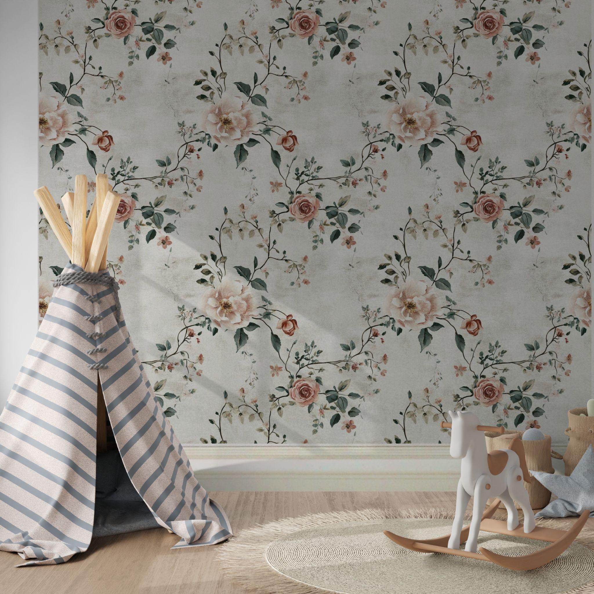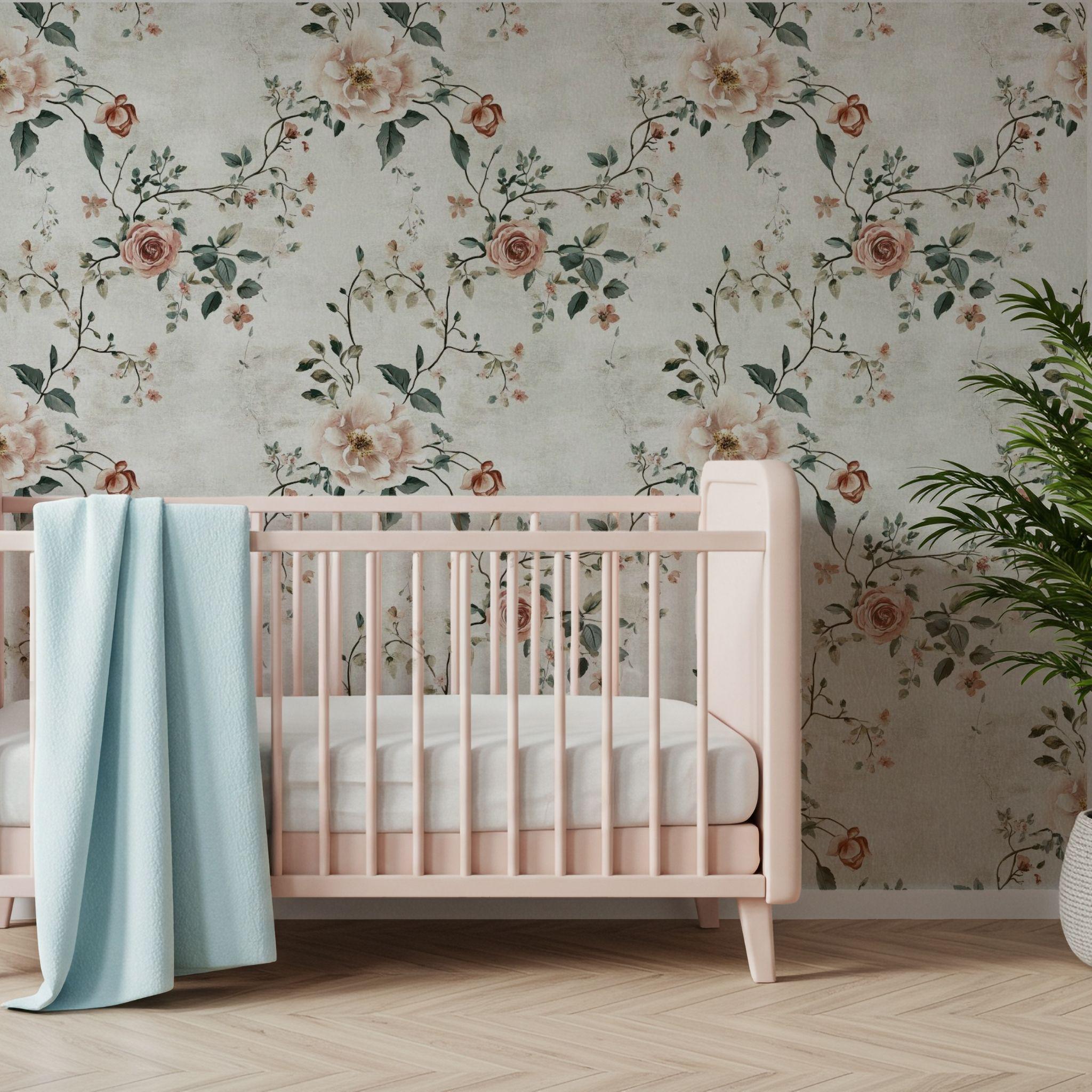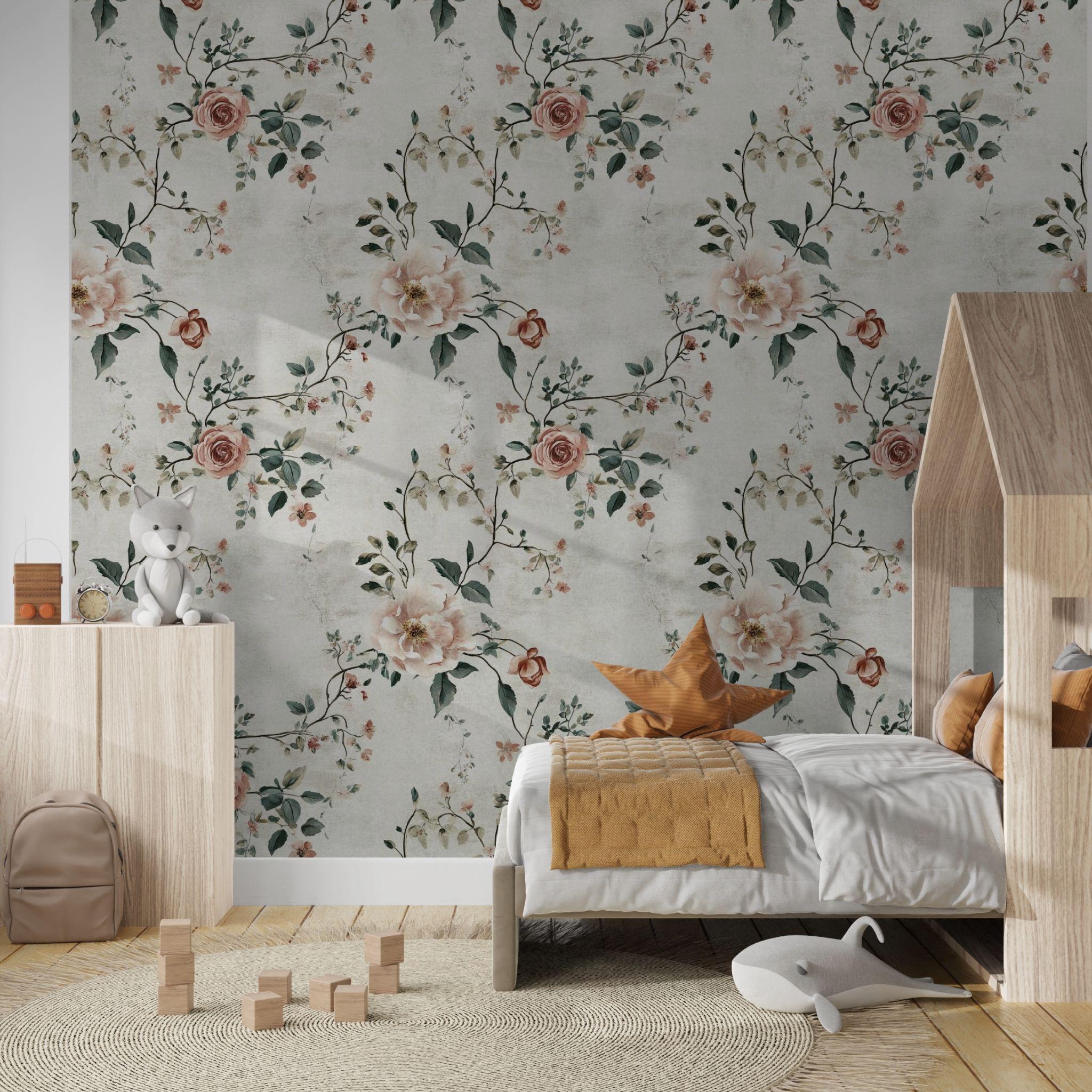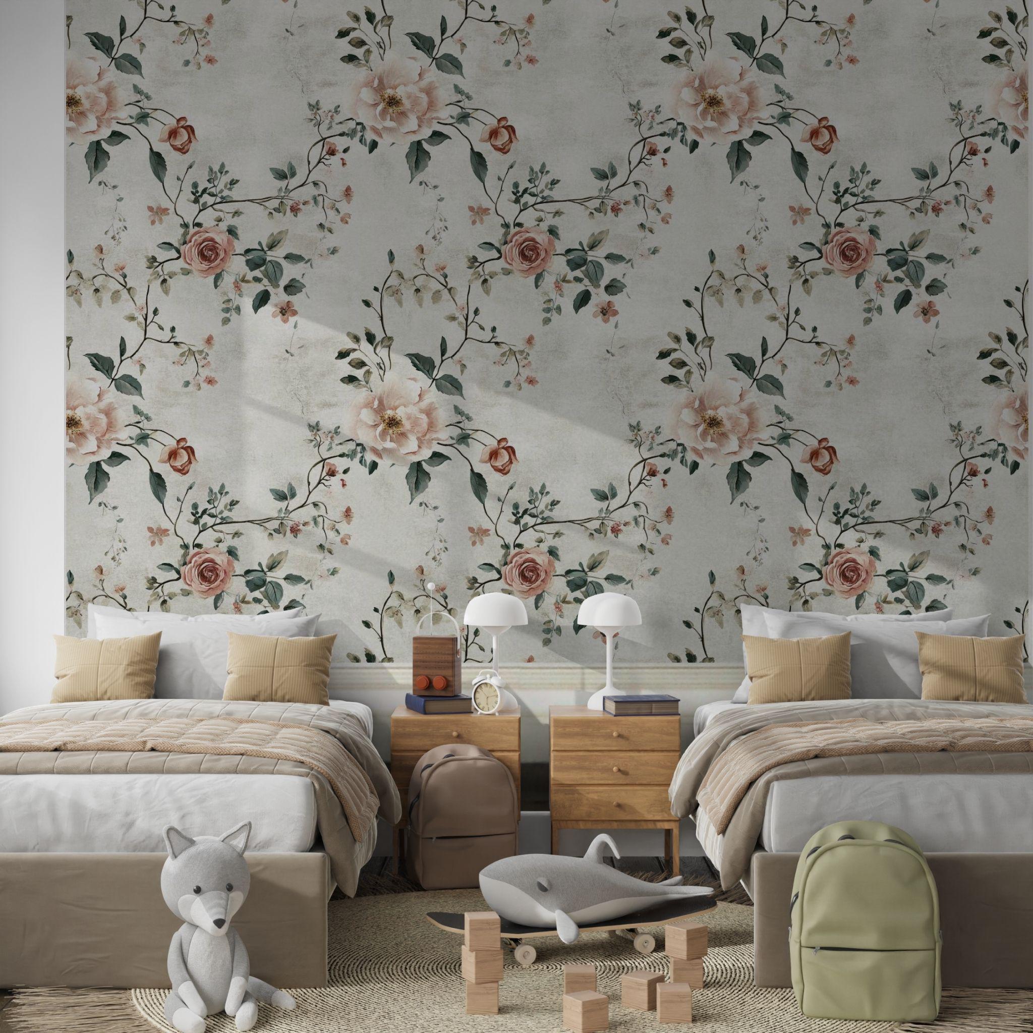 Soft blush and taupe blooms drift across a mist-washed background, creating a look that’s serene, elegant, and full of warmth. The painterly texture and gentle color palette bring a feeling of calm refinement — perfect for nurseries, bedrooms, or any space meant to feel tender and timeless.
