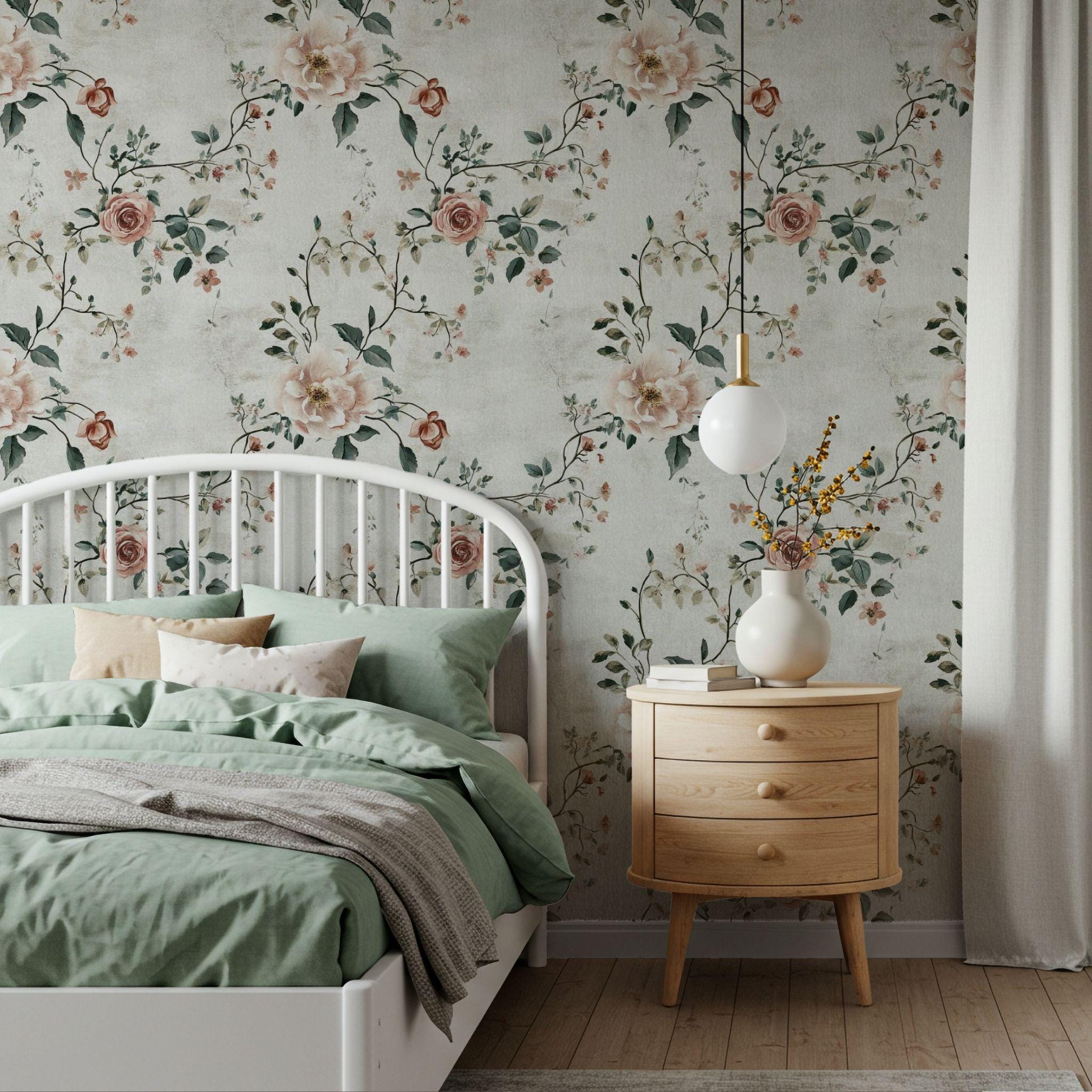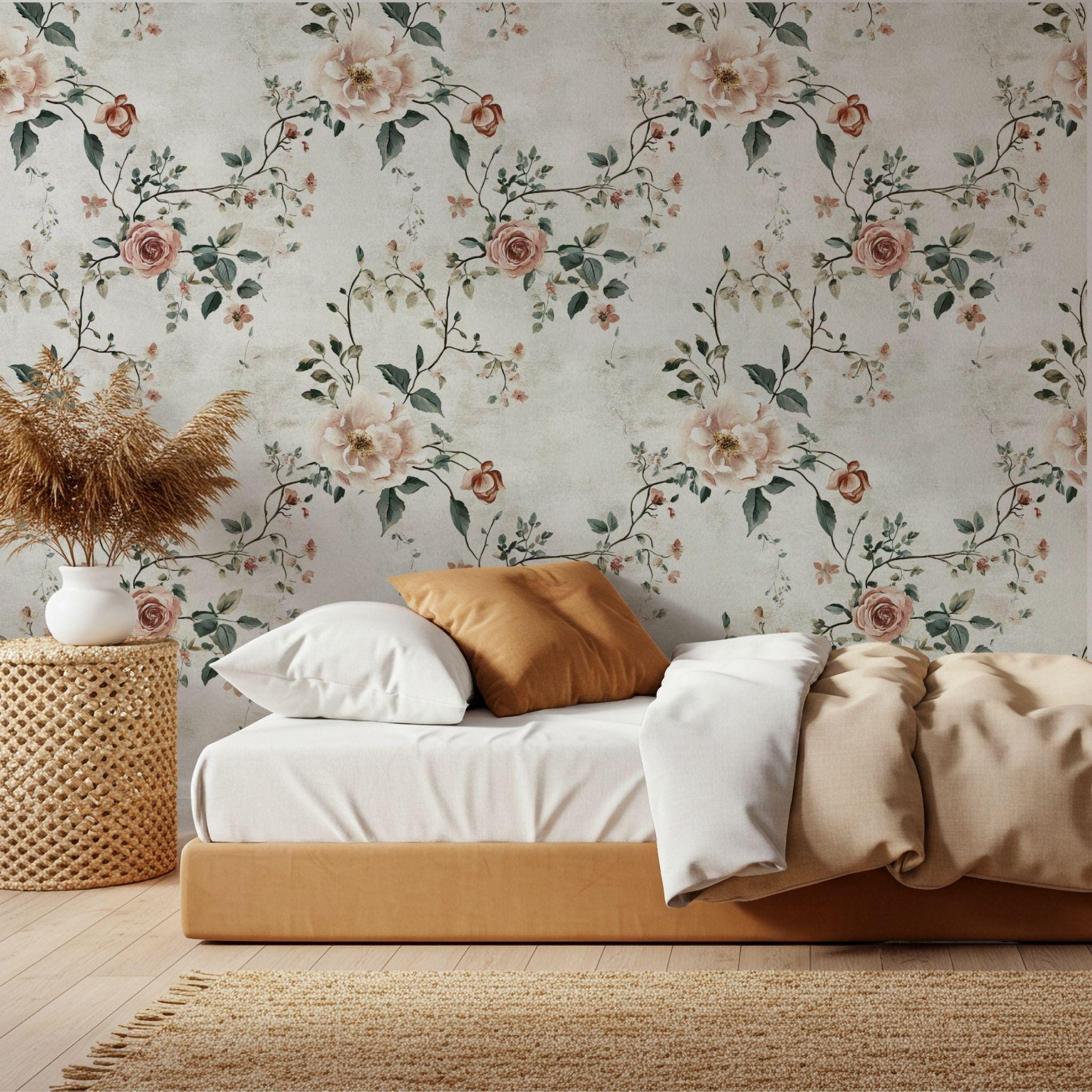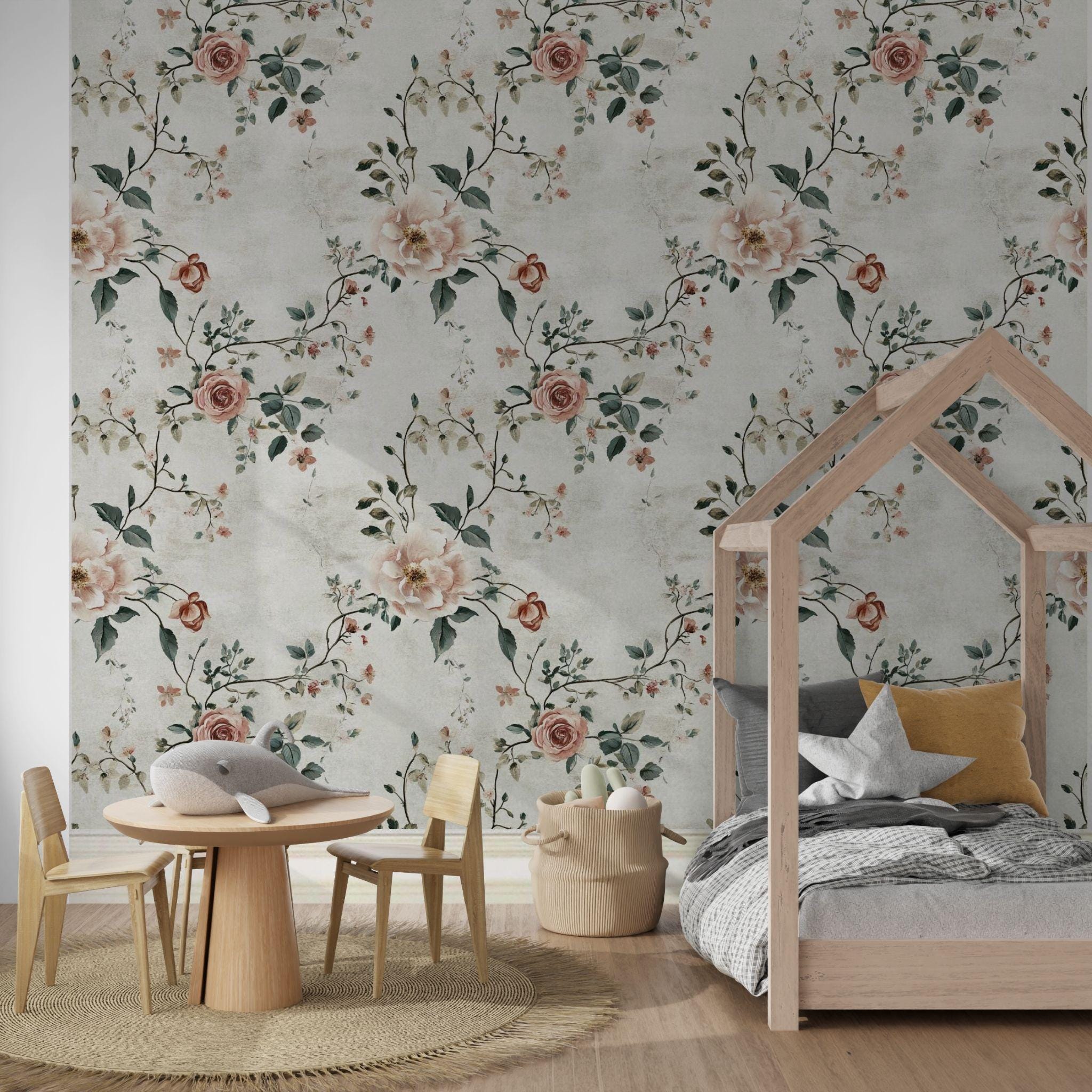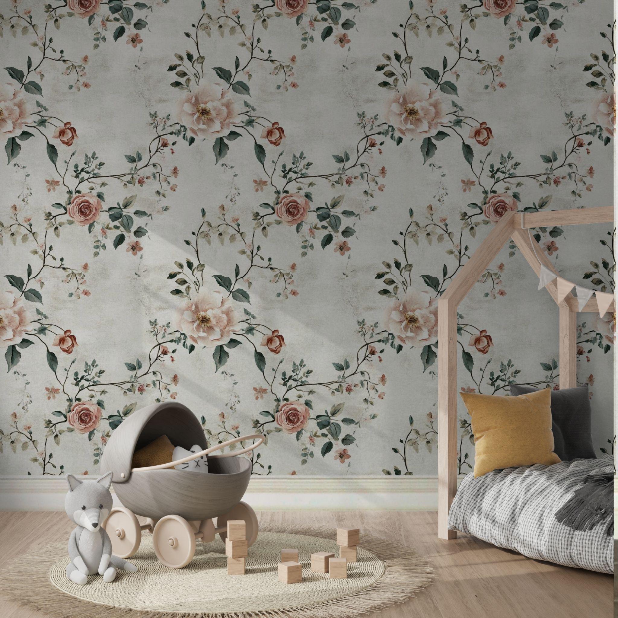 Soft blush and taupe blooms drift across a mist-washed background, creating a look that’s serene, elegant, and full of warmth. The painterly texture and gentle color palette bring a feeling of calm refinement — perfect for nurseries, bedrooms, or any space meant to feel tender and timeless.