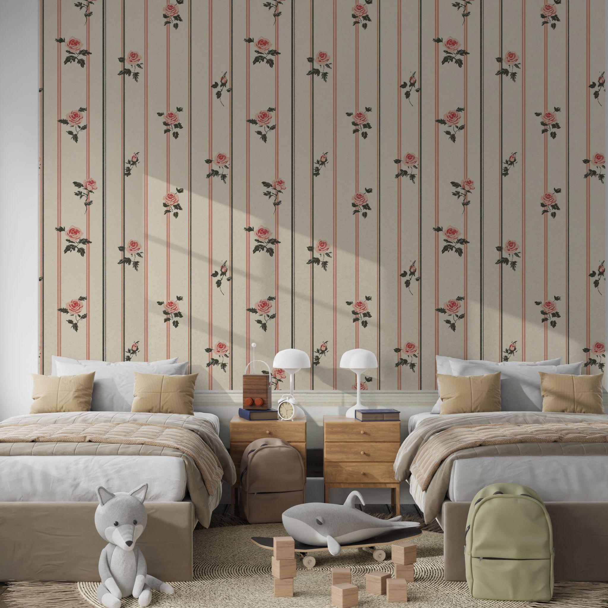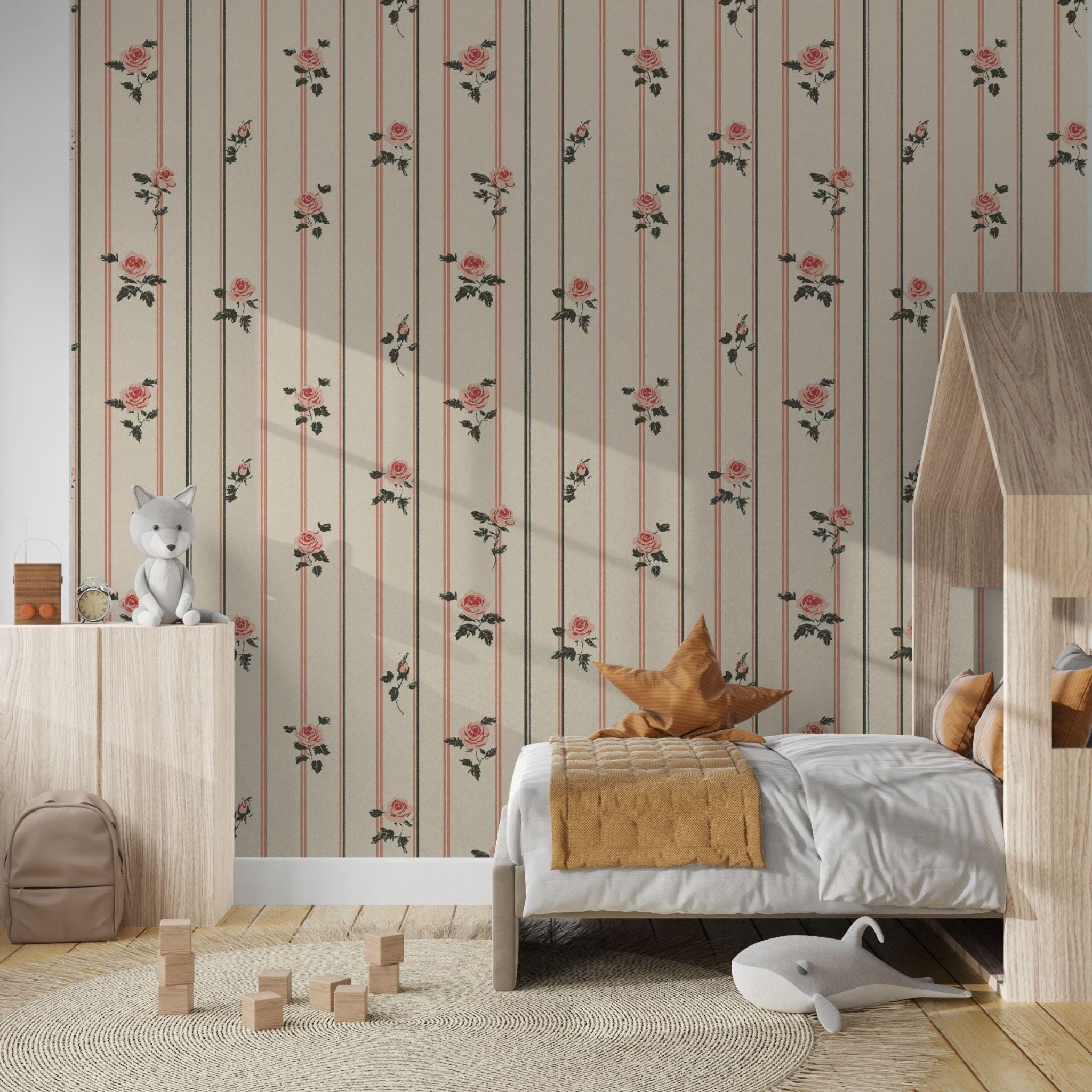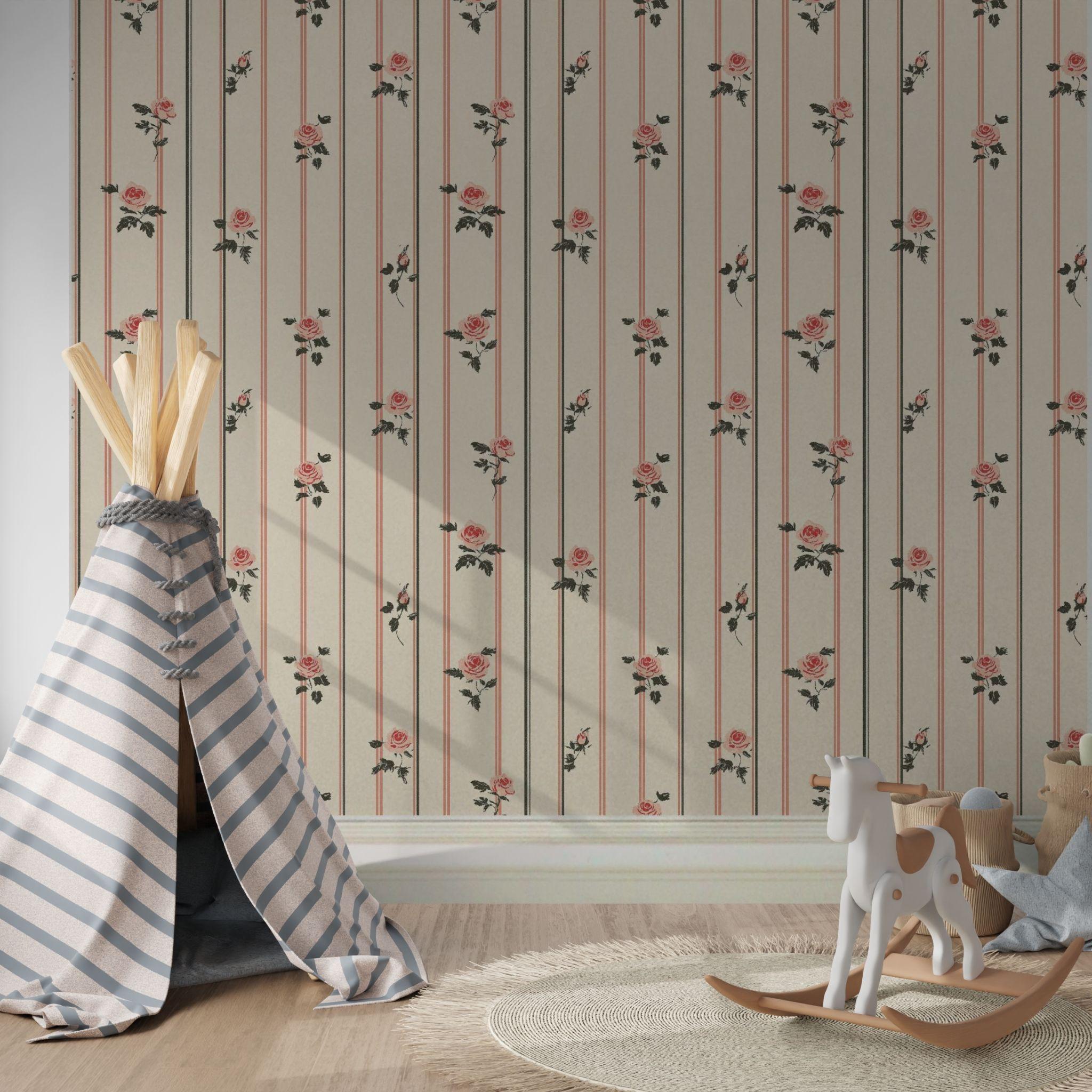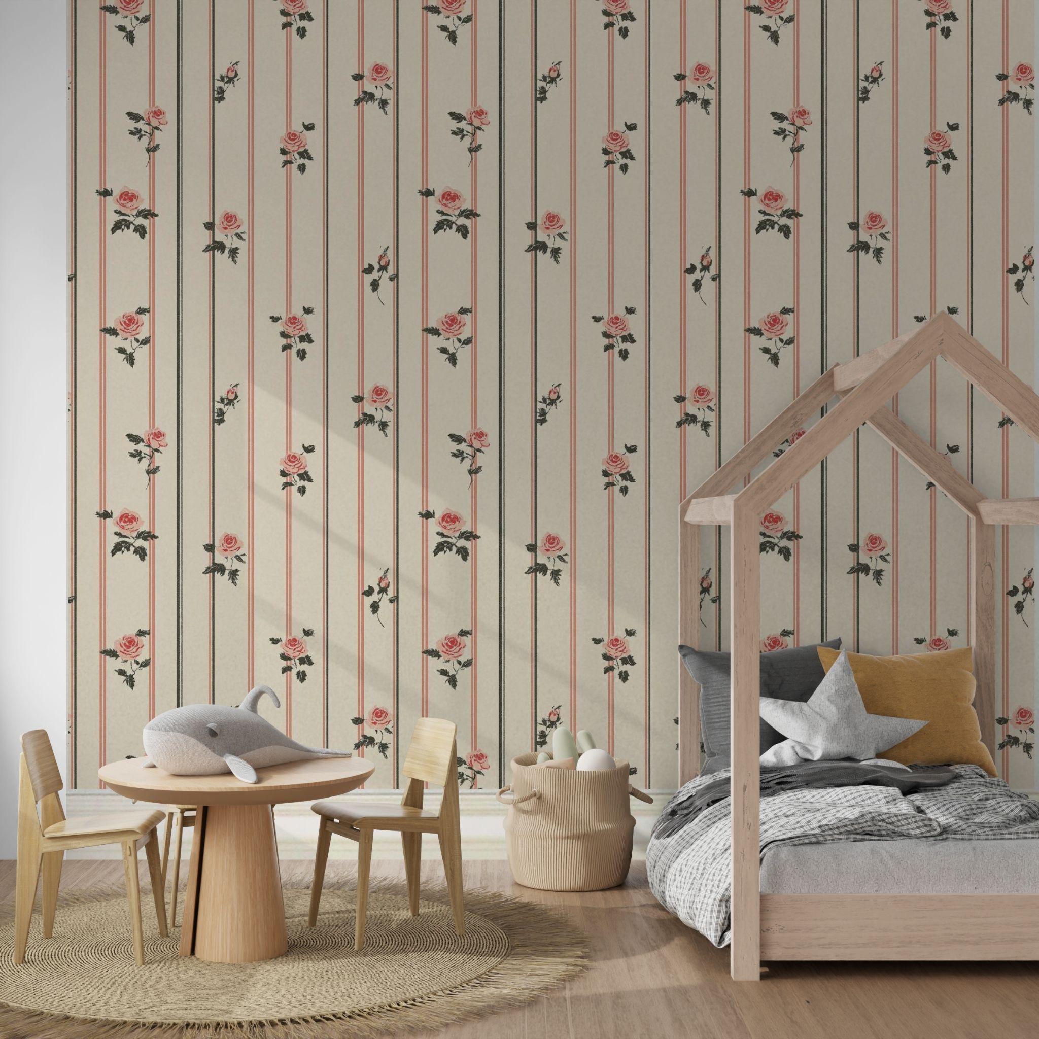 Charming rose sprigs dance between soft vintage stripes, blending romance and structure in perfect balance. The warm blush tones and classic layout bring a nostalgic yet elevated touch to bedrooms, nurseries, or cozy reading nooks — a design that feels both familiar and freshly rediscovered.