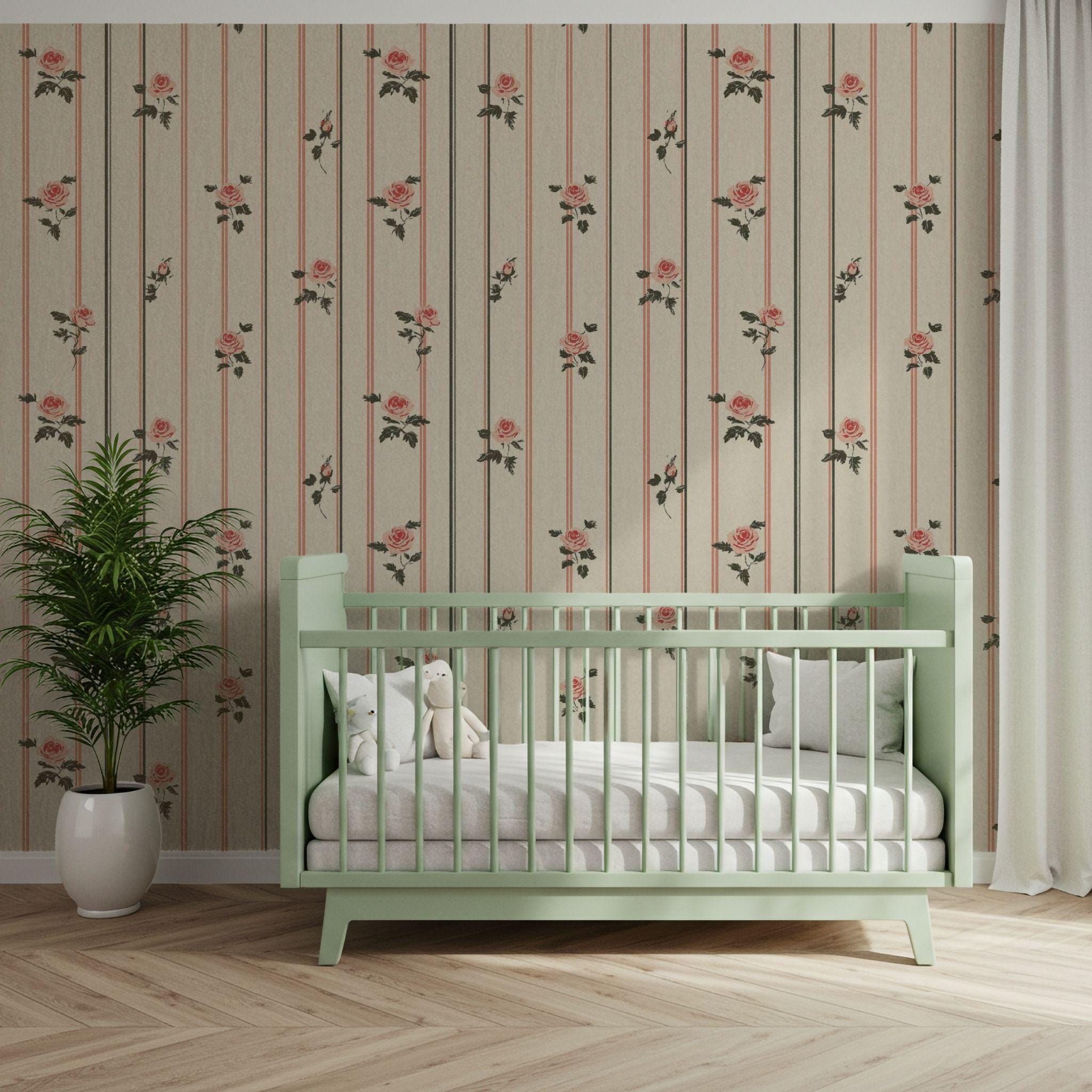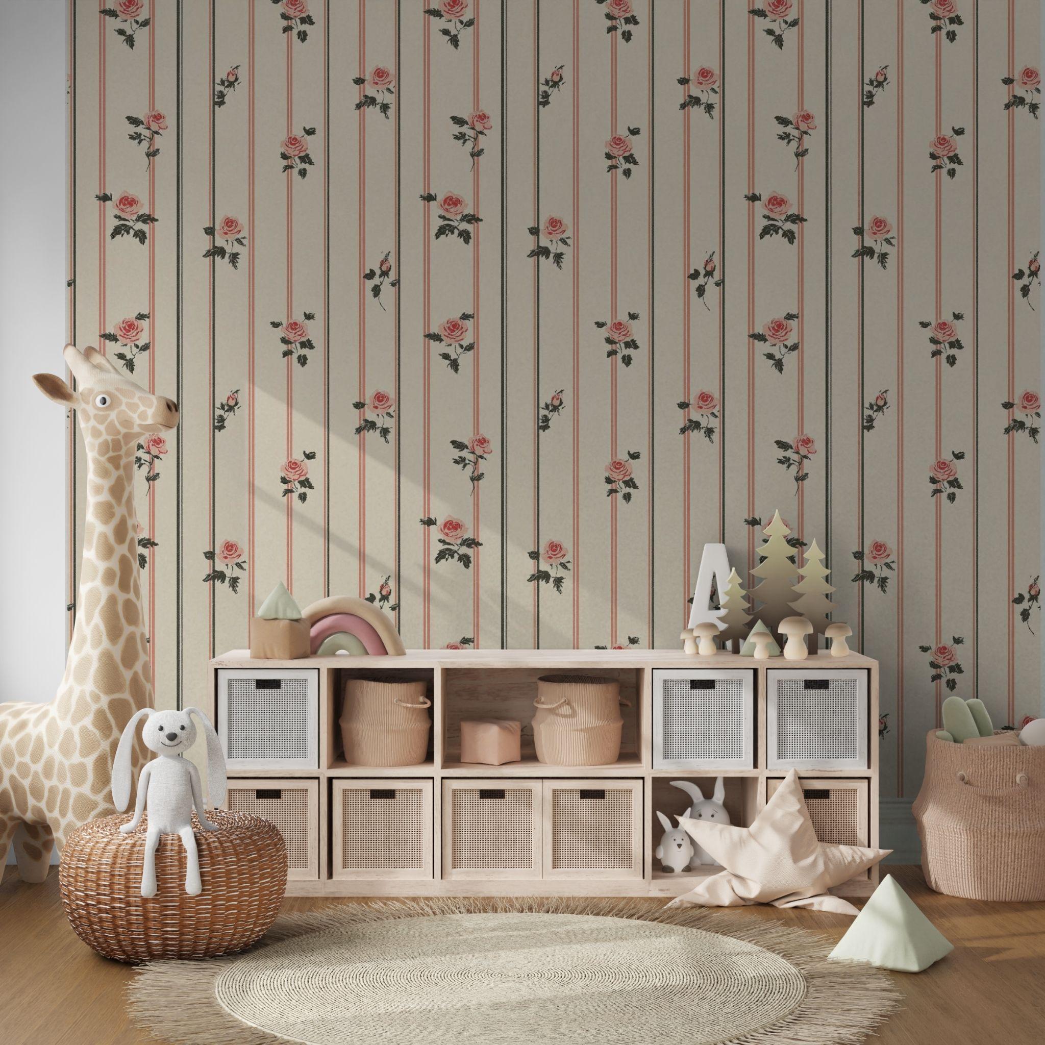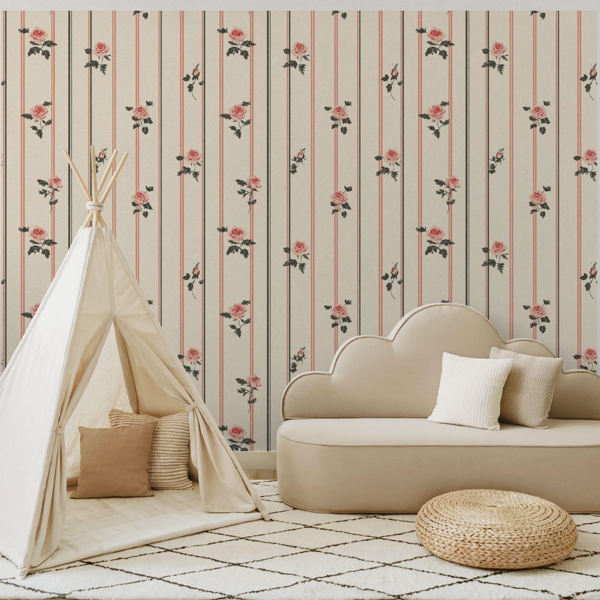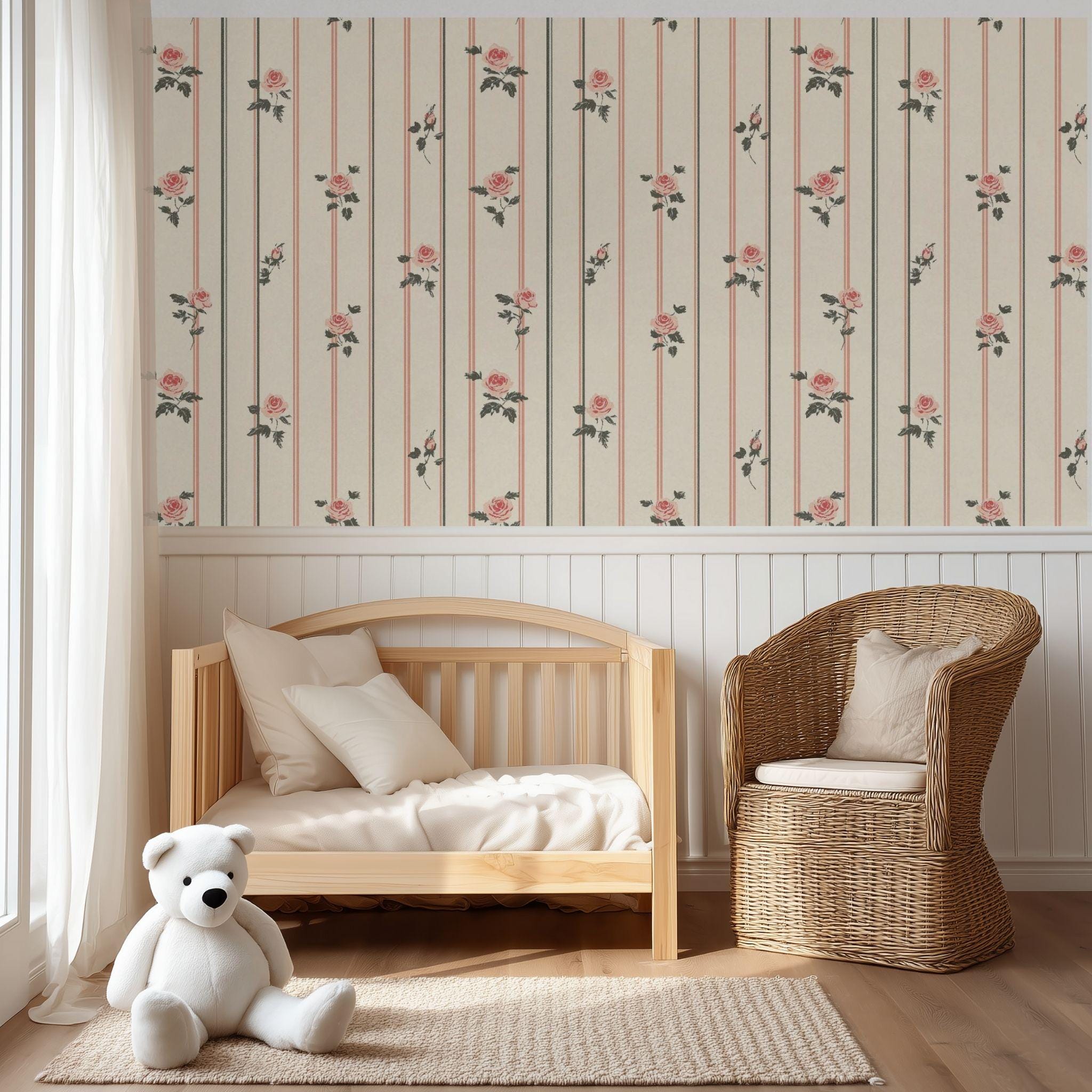 Charming rose sprigs dance between soft vintage stripes, blending romance and structure in perfect balance. The warm blush tones and classic layout bring a nostalgic yet elevated touch to bedrooms, nurseries, or cozy reading nooks — a design that feels both familiar and freshly rediscovered.