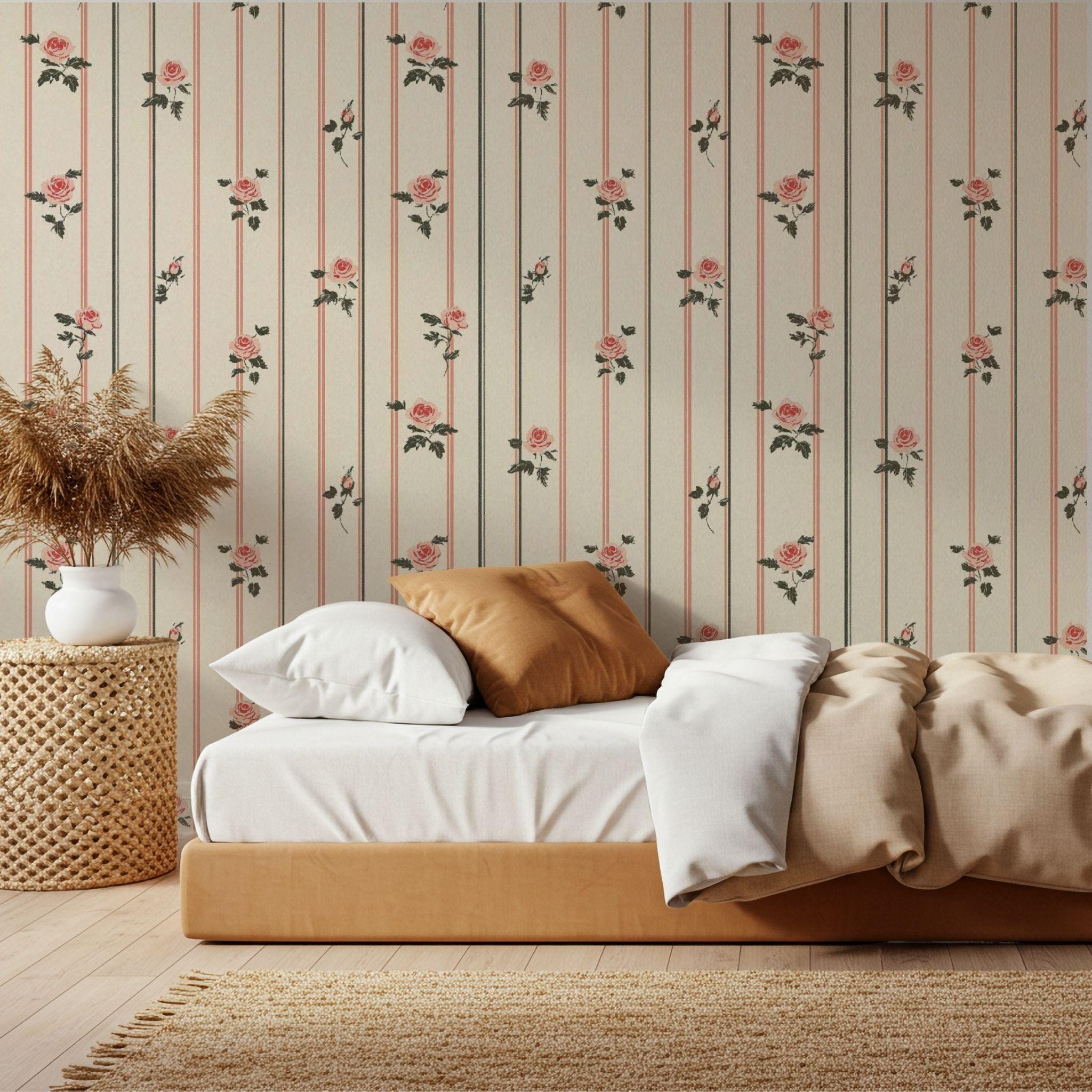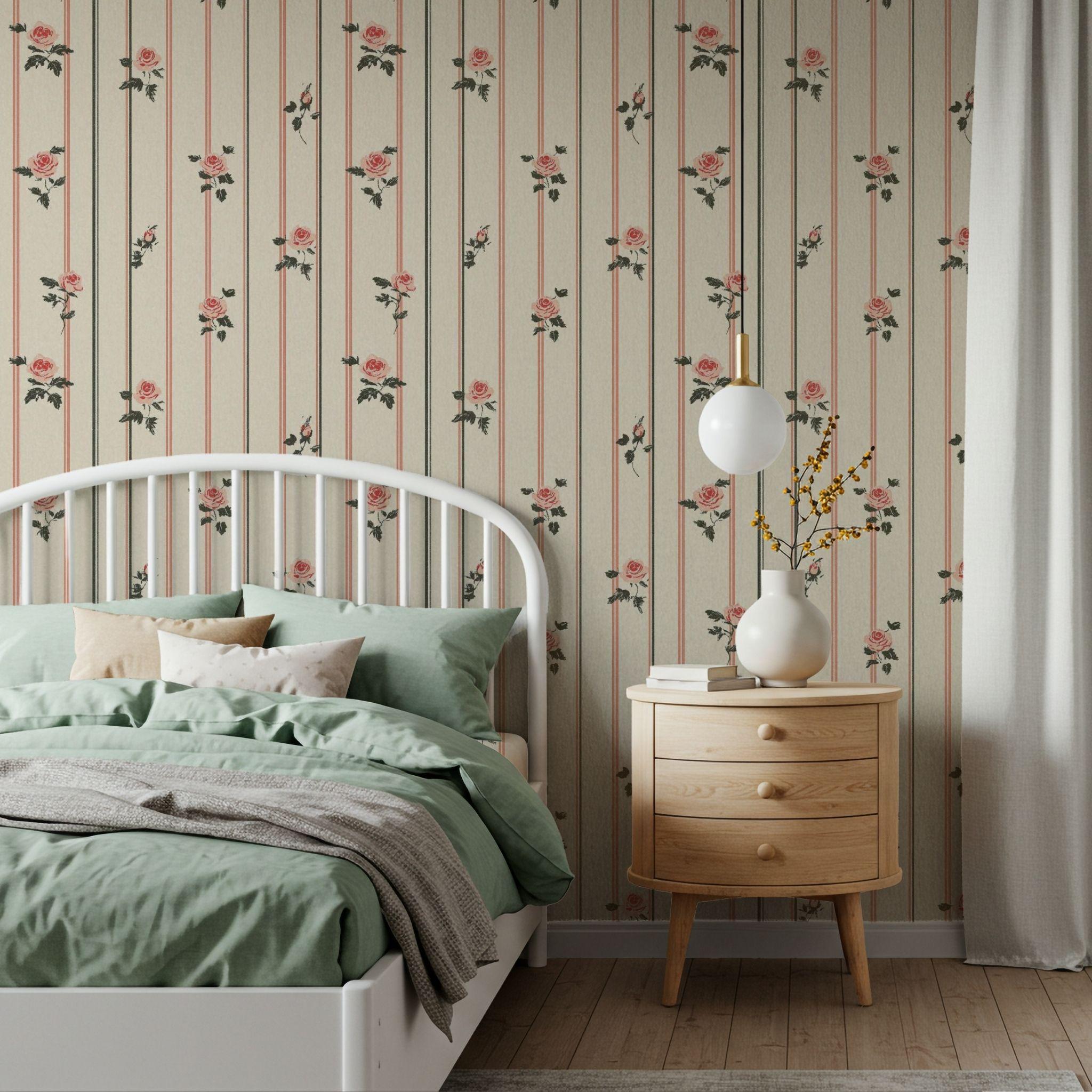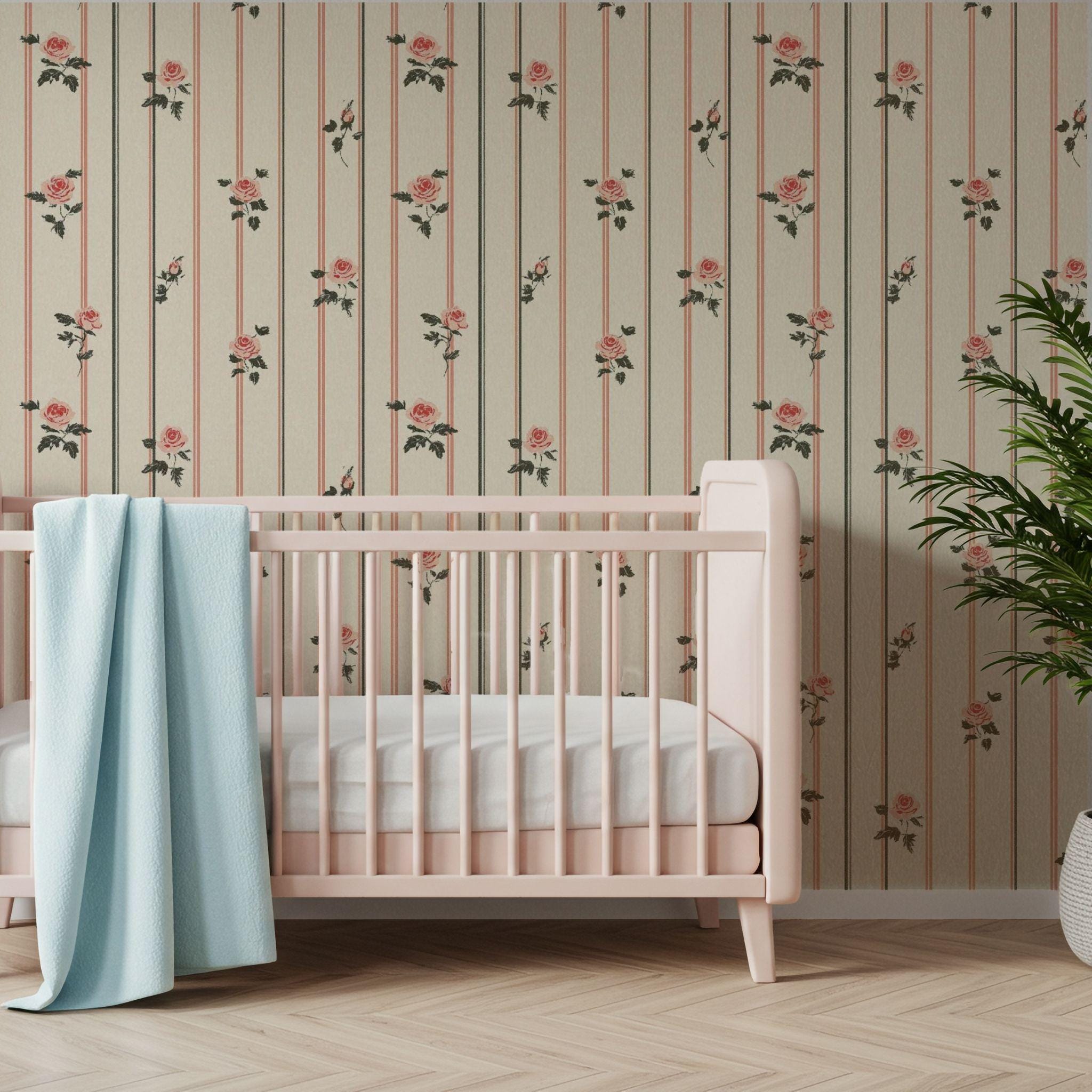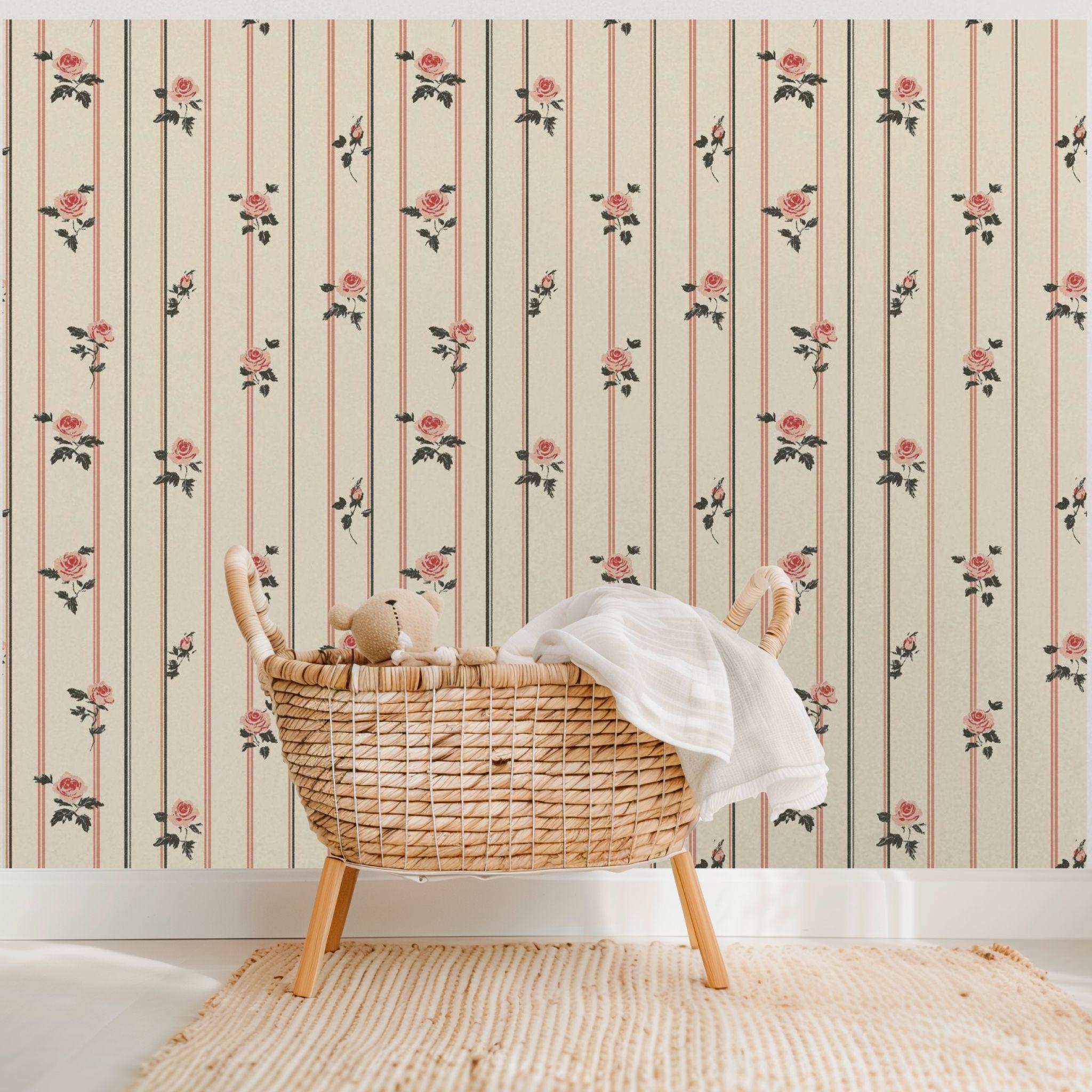 Charming rose sprigs dance between soft vintage stripes, blending romance and structure in perfect balance. The warm blush tones and classic layout bring a nostalgic yet elevated touch to bedrooms, nurseries, or cozy reading nooks — a design that feels both familiar and freshly rediscovered.