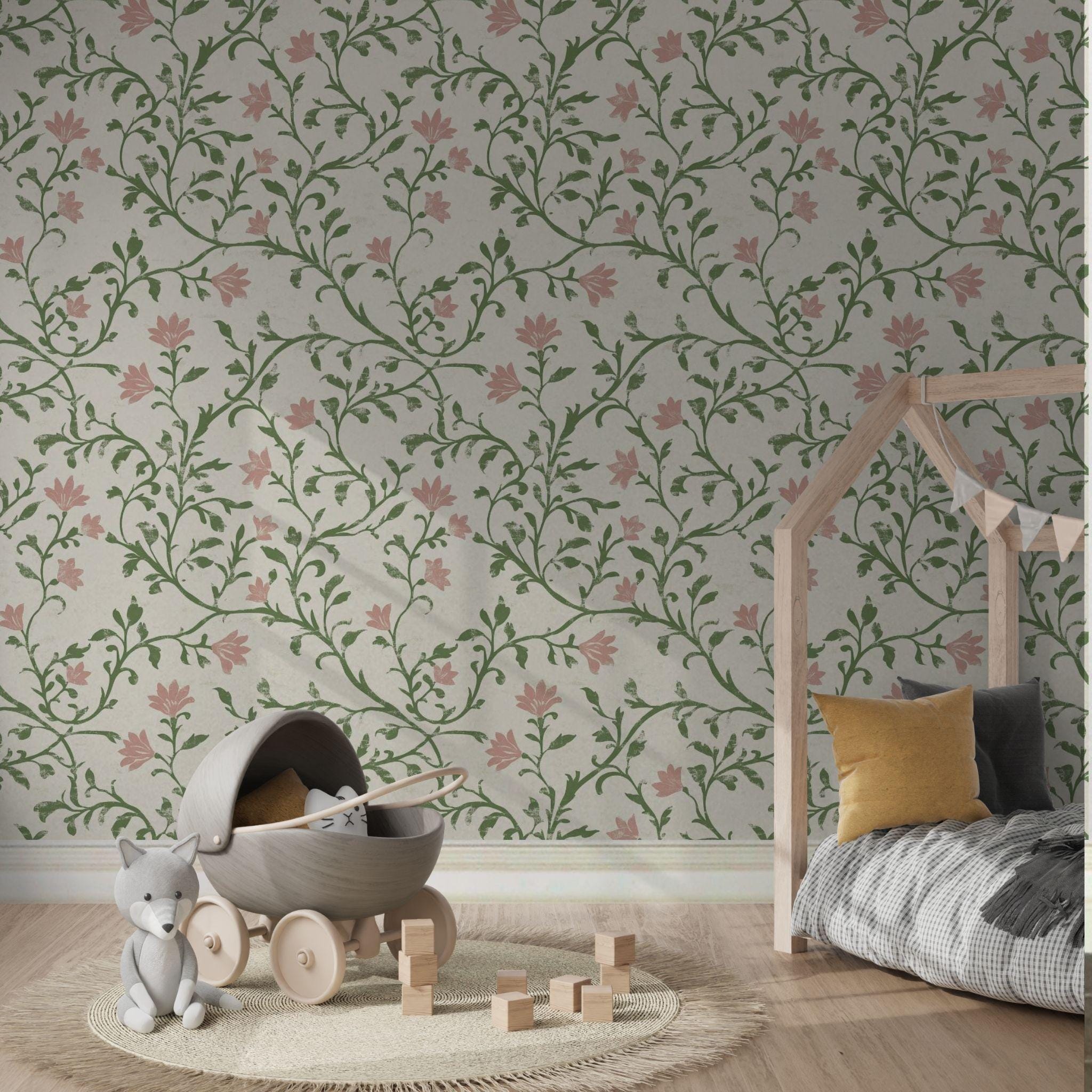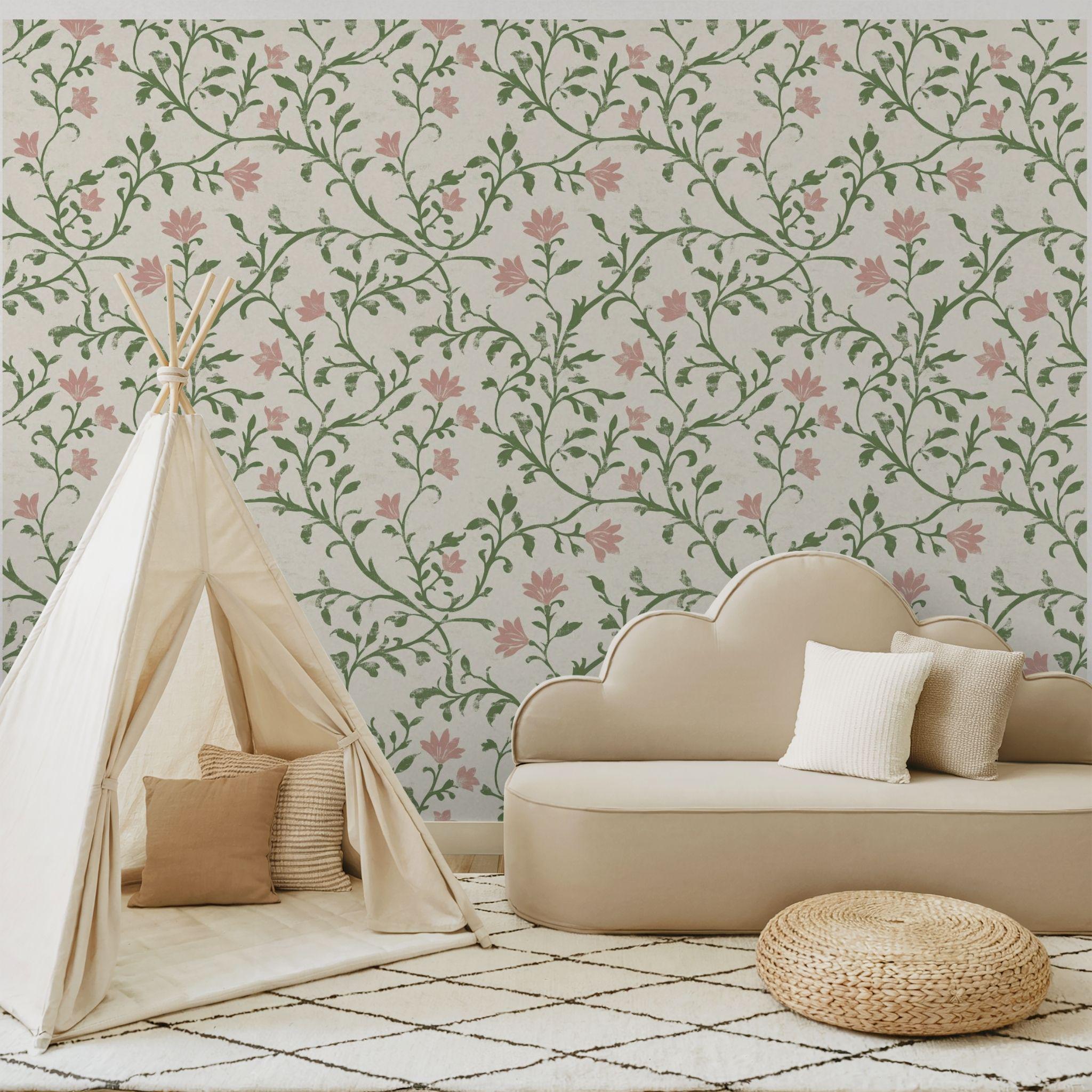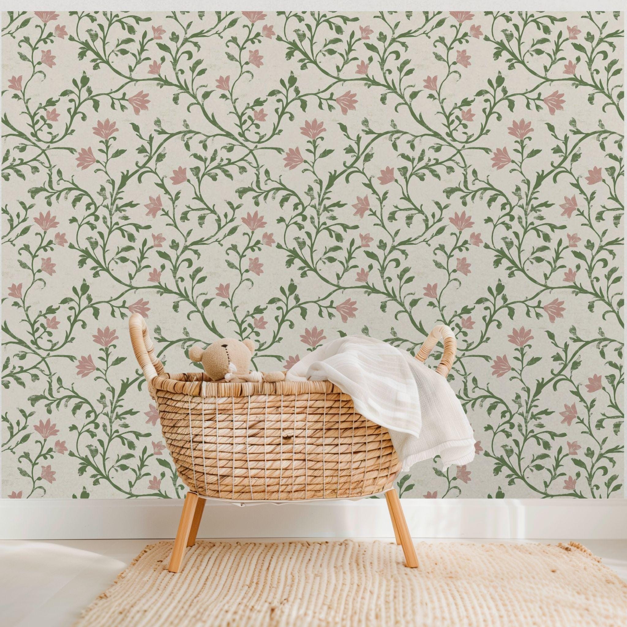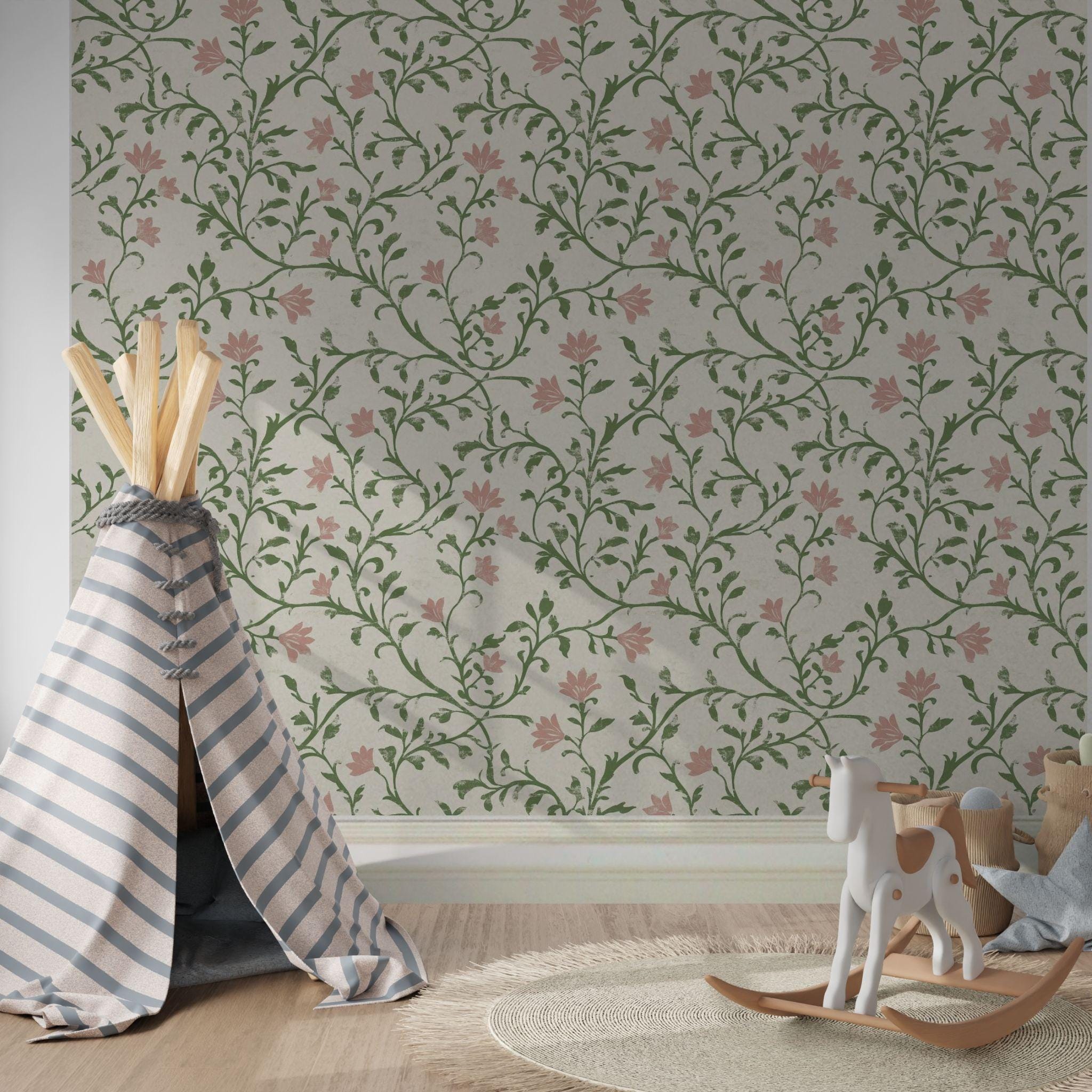 Graceful vines and soft pink blooms wind across a timeless ivory backdrop, capturing the charm of hand-painted botanicals. With a nod to antique garden prints, this design brings warmth and quiet joy to any nursery, powder room, or sitting nook.