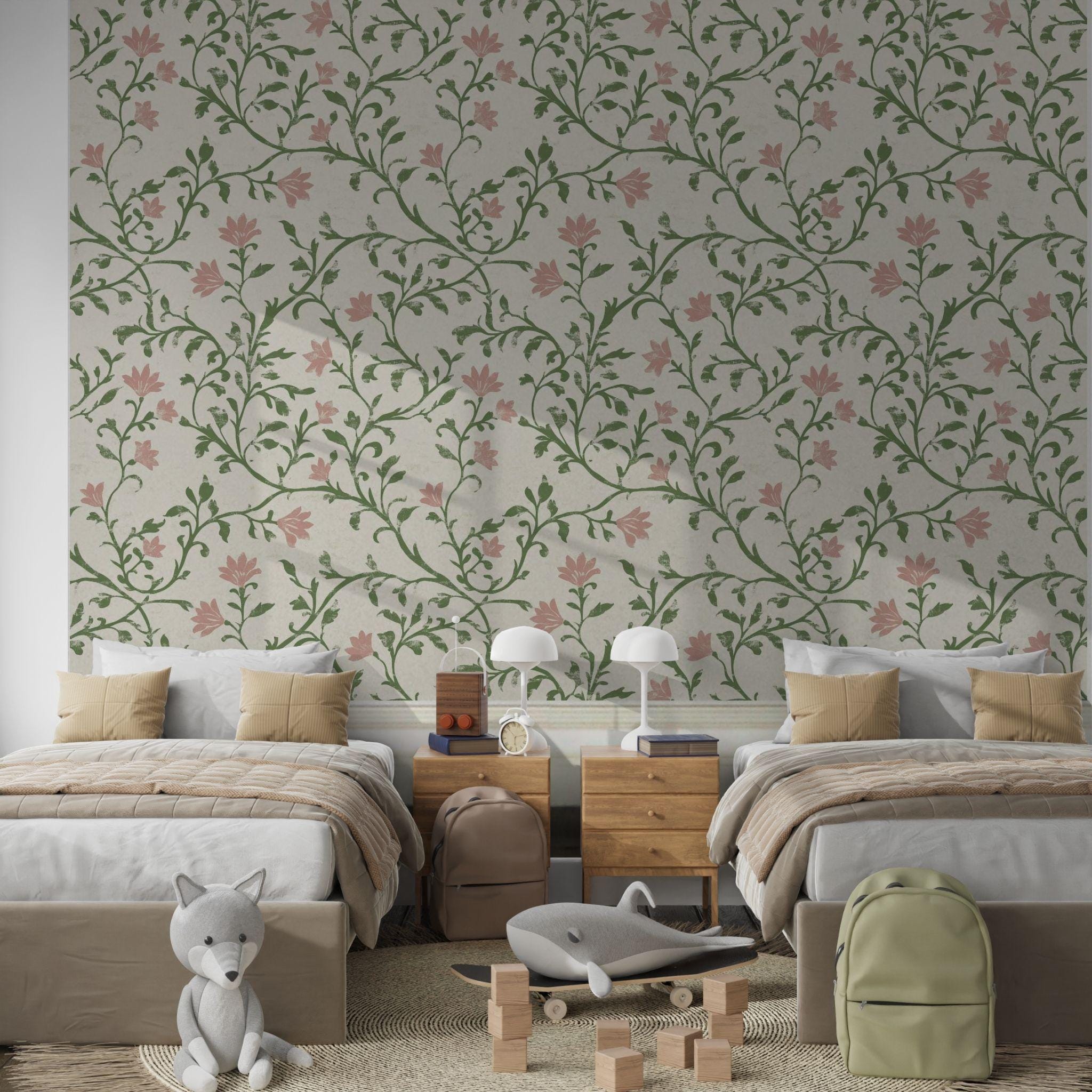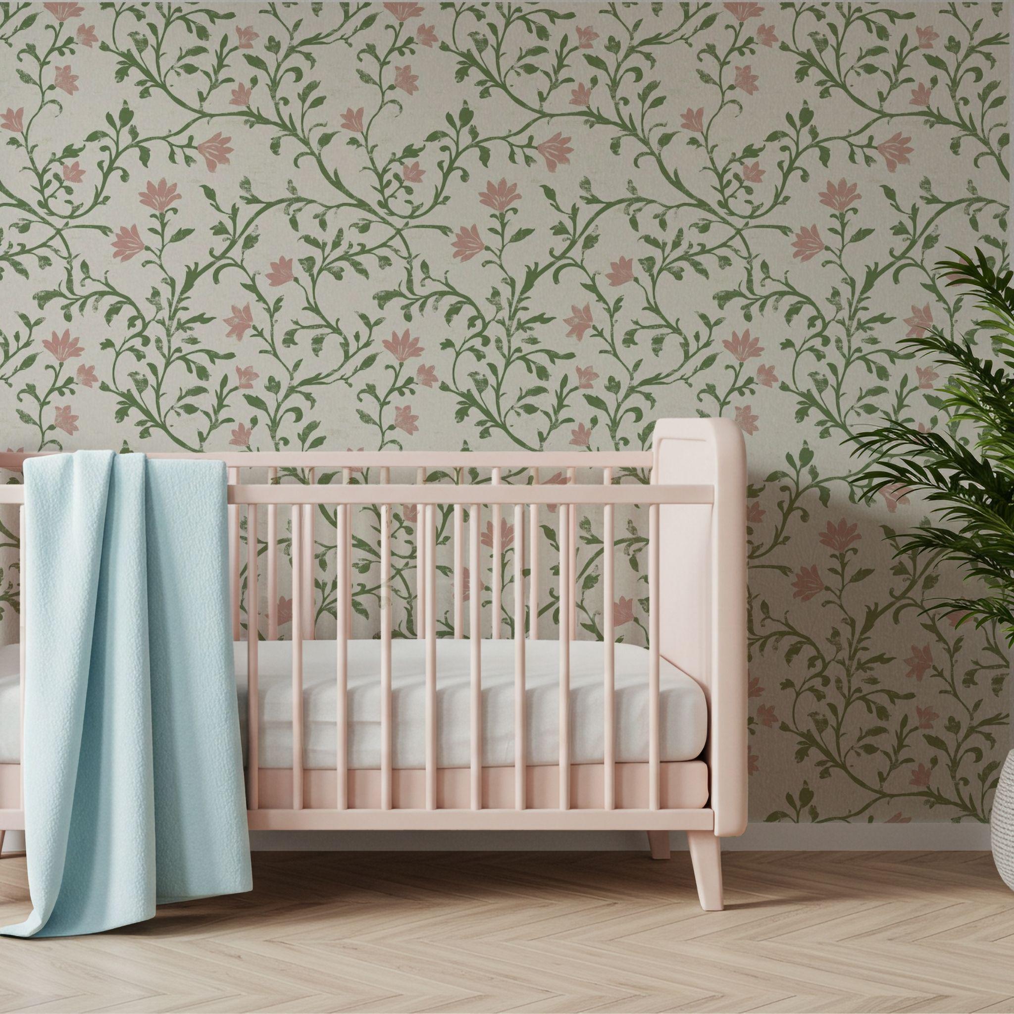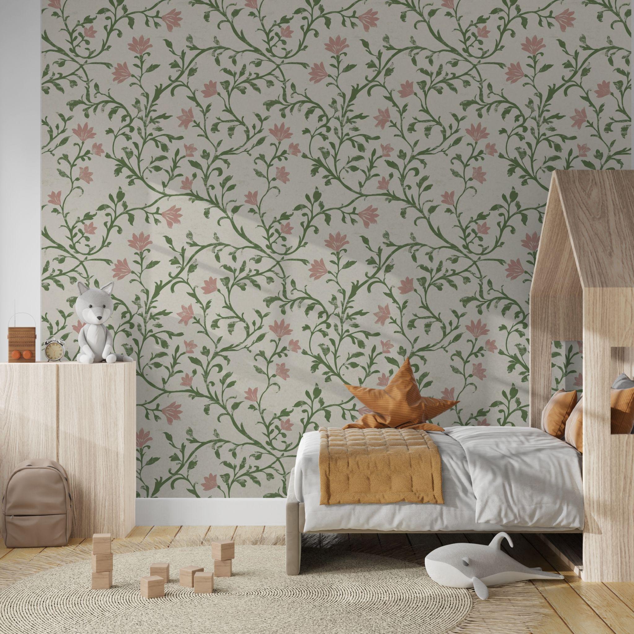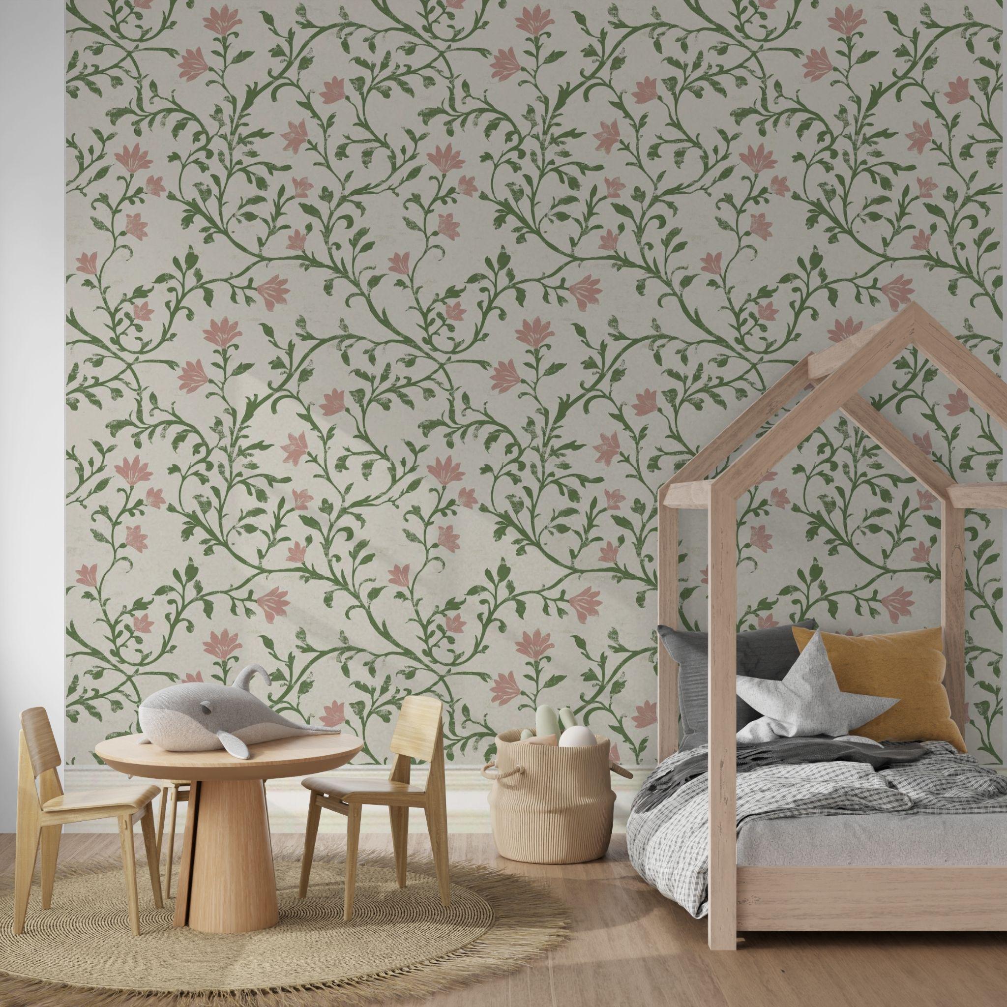 Graceful vines and soft pink blooms wind across a timeless ivory backdrop, capturing the charm of hand-painted botanicals. With a nod to antique garden prints, this design brings warmth and quiet joy to any nursery, powder room, or sitting nook.