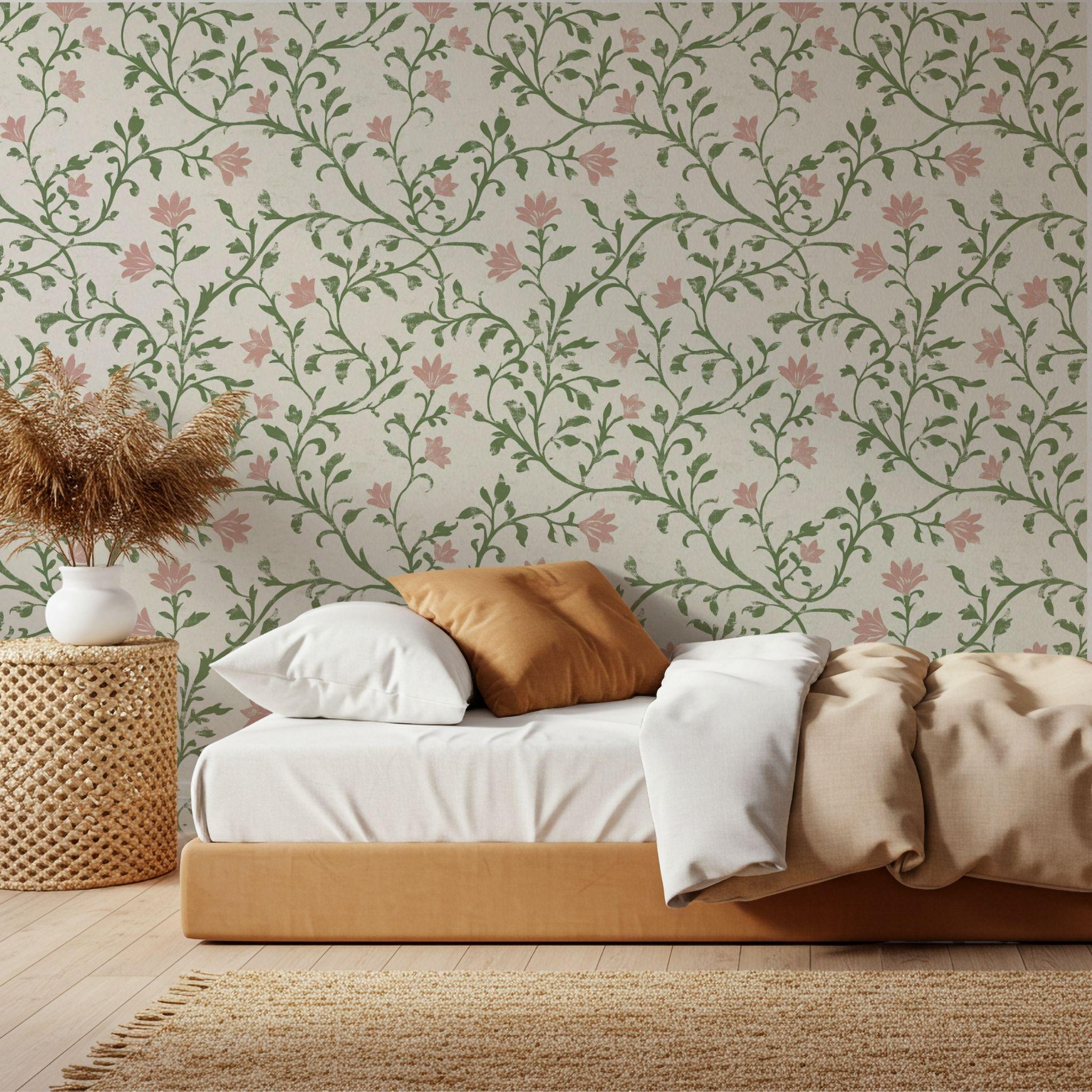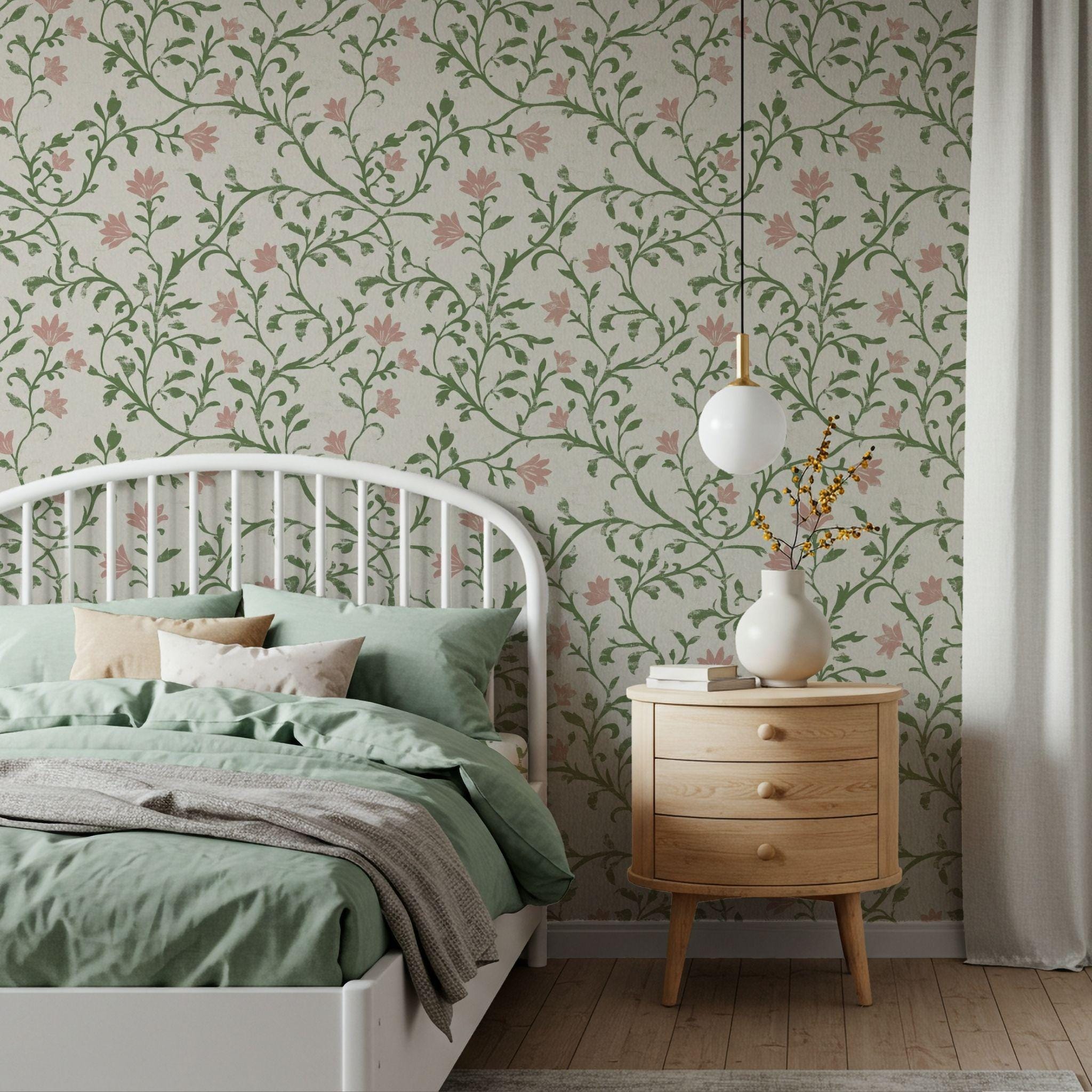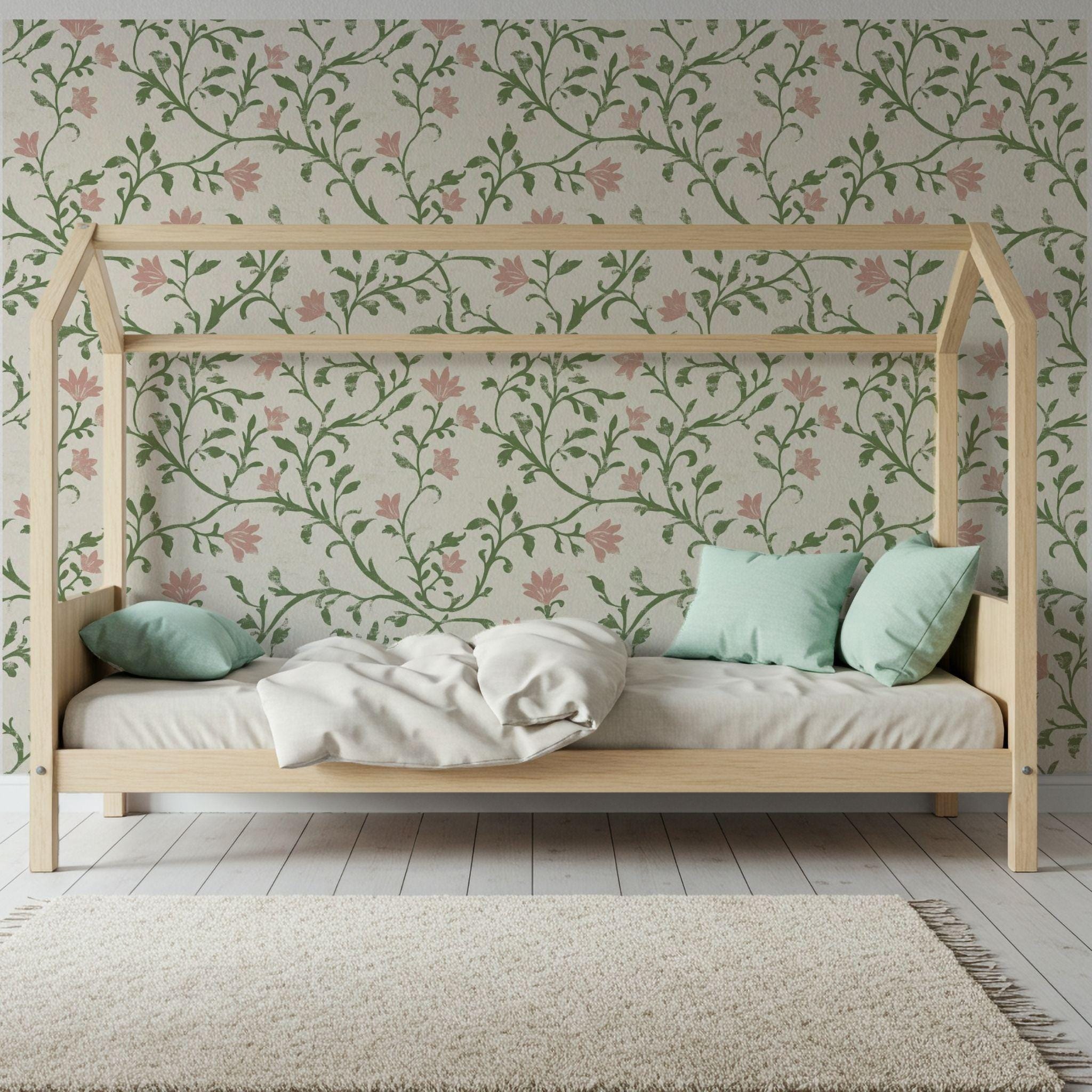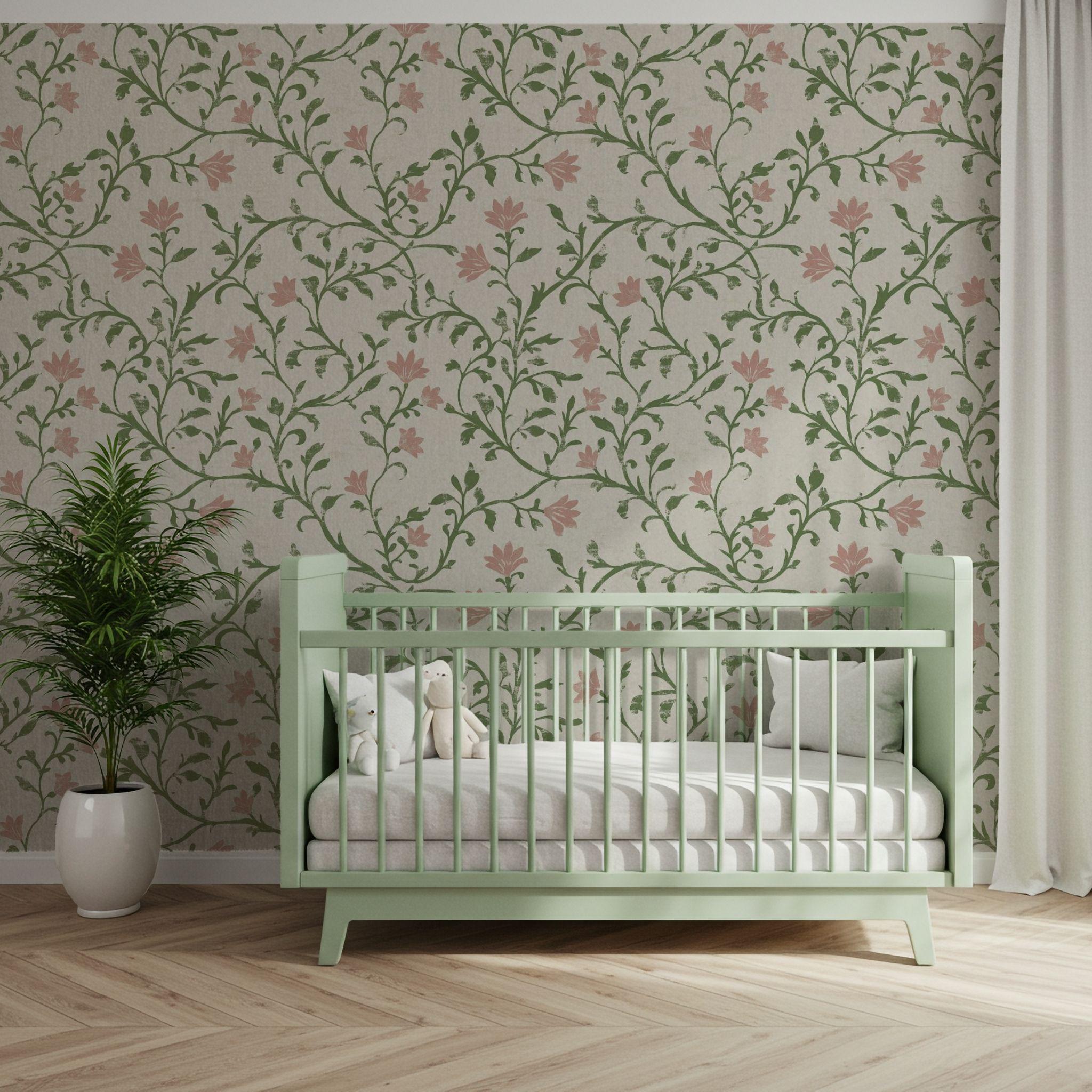 Graceful vines and soft pink blooms wind across a timeless ivory backdrop, capturing the charm of hand-painted botanicals. With a nod to antique garden prints, this design brings warmth and quiet joy to any nursery, powder room, or sitting nook.