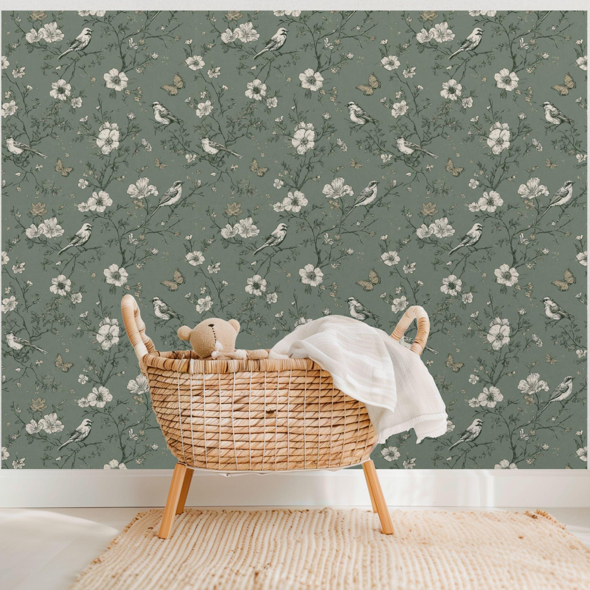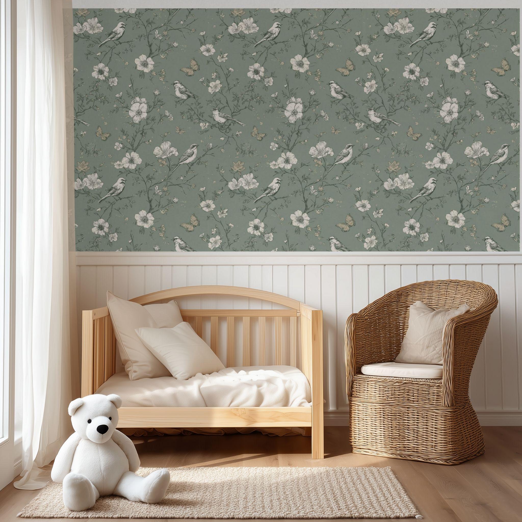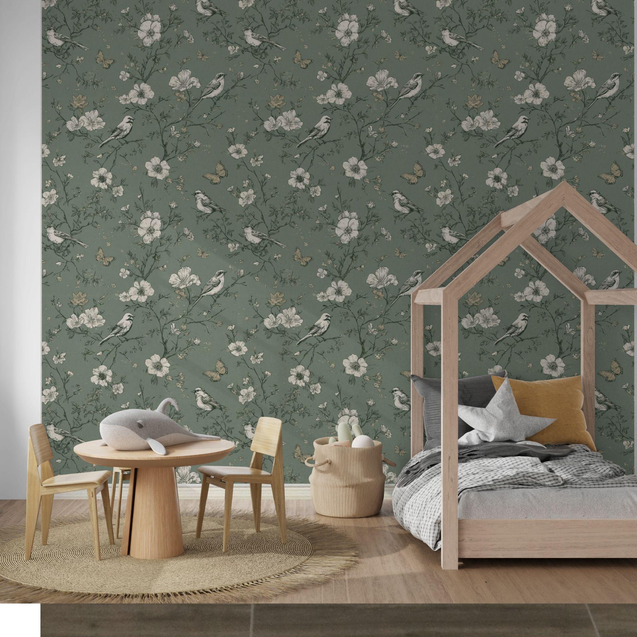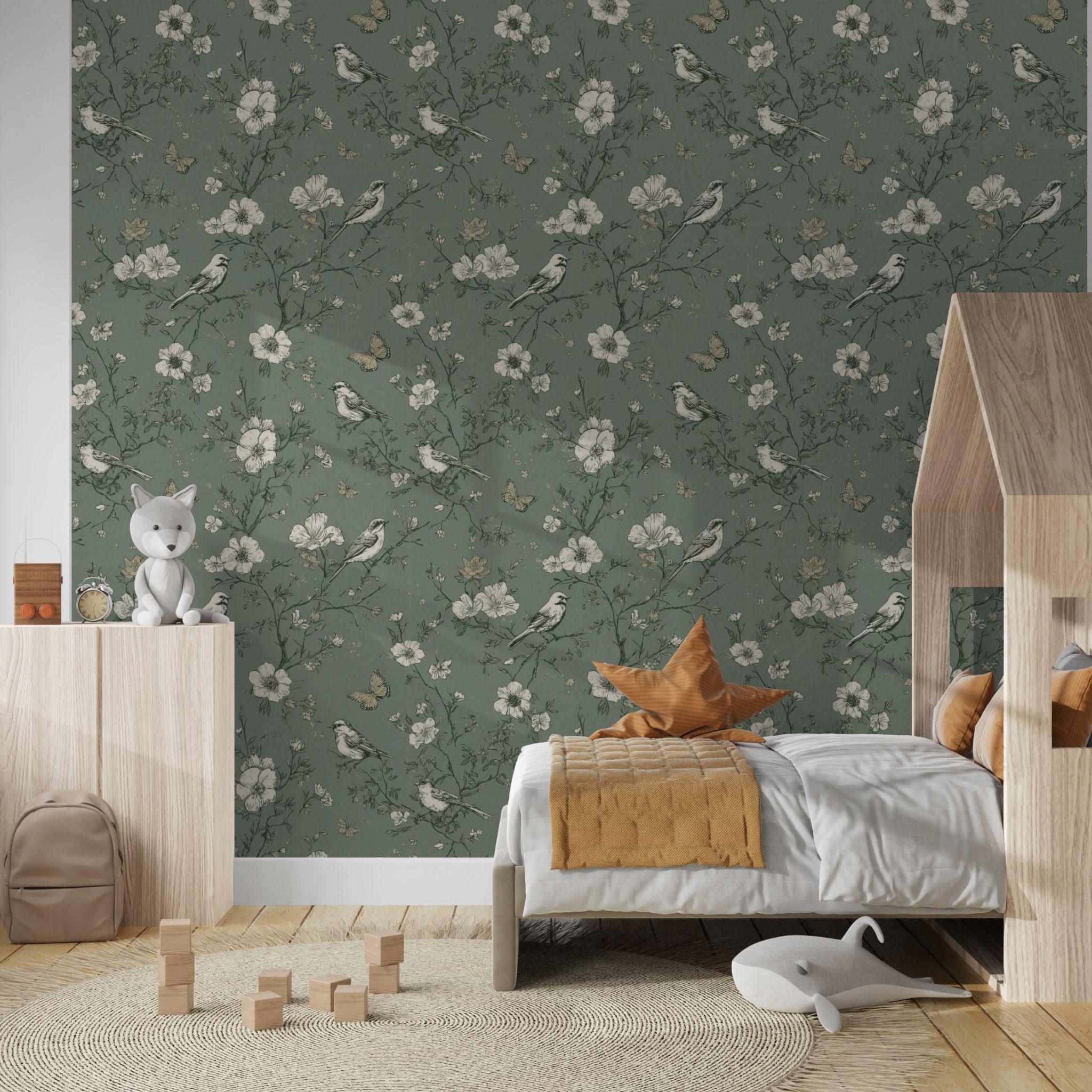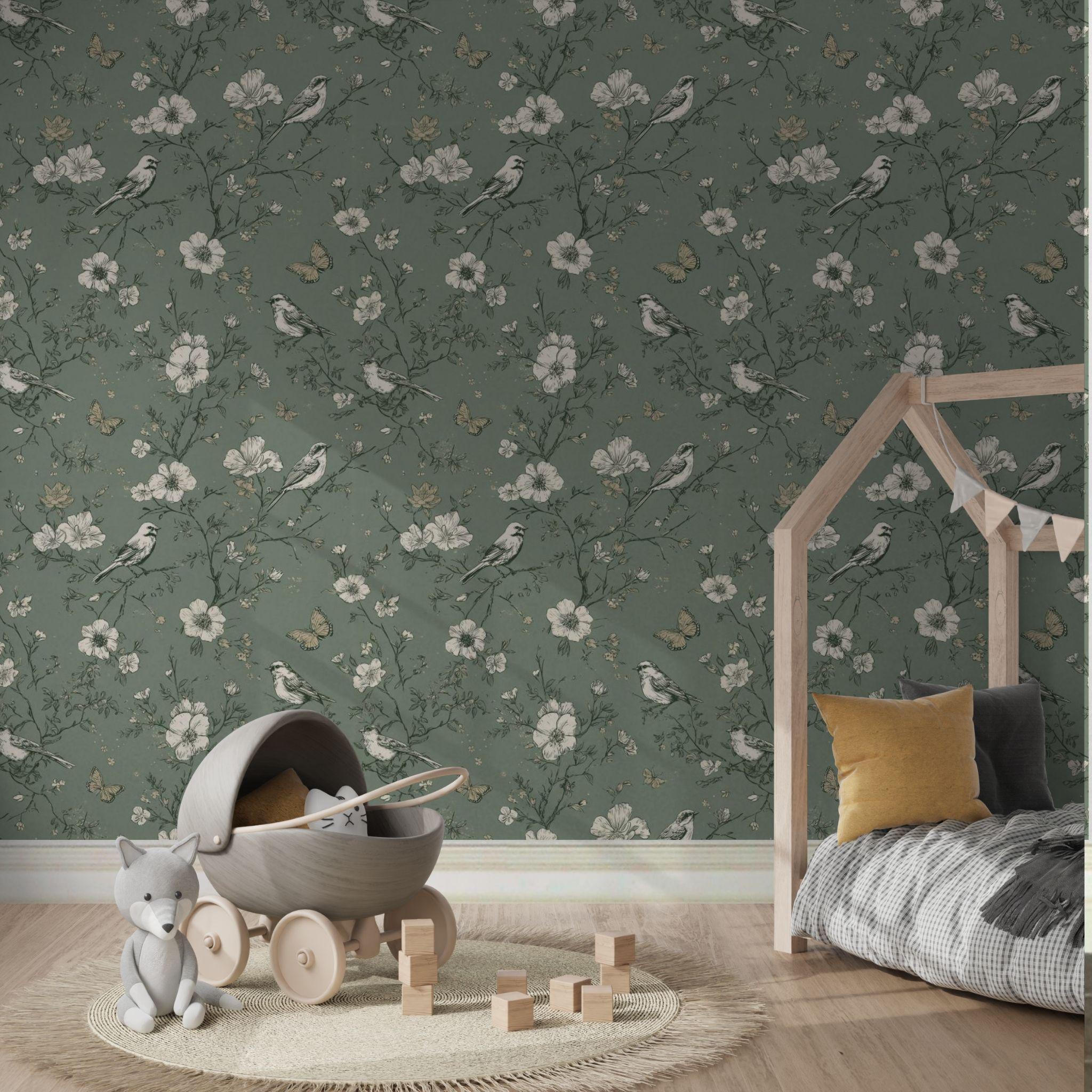 A tranquil vintage dream, this sage-green wallpaper blooms with delicate ivory flowers, fluttering butterflies, and graceful birds resting on slender branches. The soft, timeworn tones and painterly details give it a calm, romantic feel — perfect for bringing warmth and nostalgia to a nursery, bedroom, or cottage-inspired space.