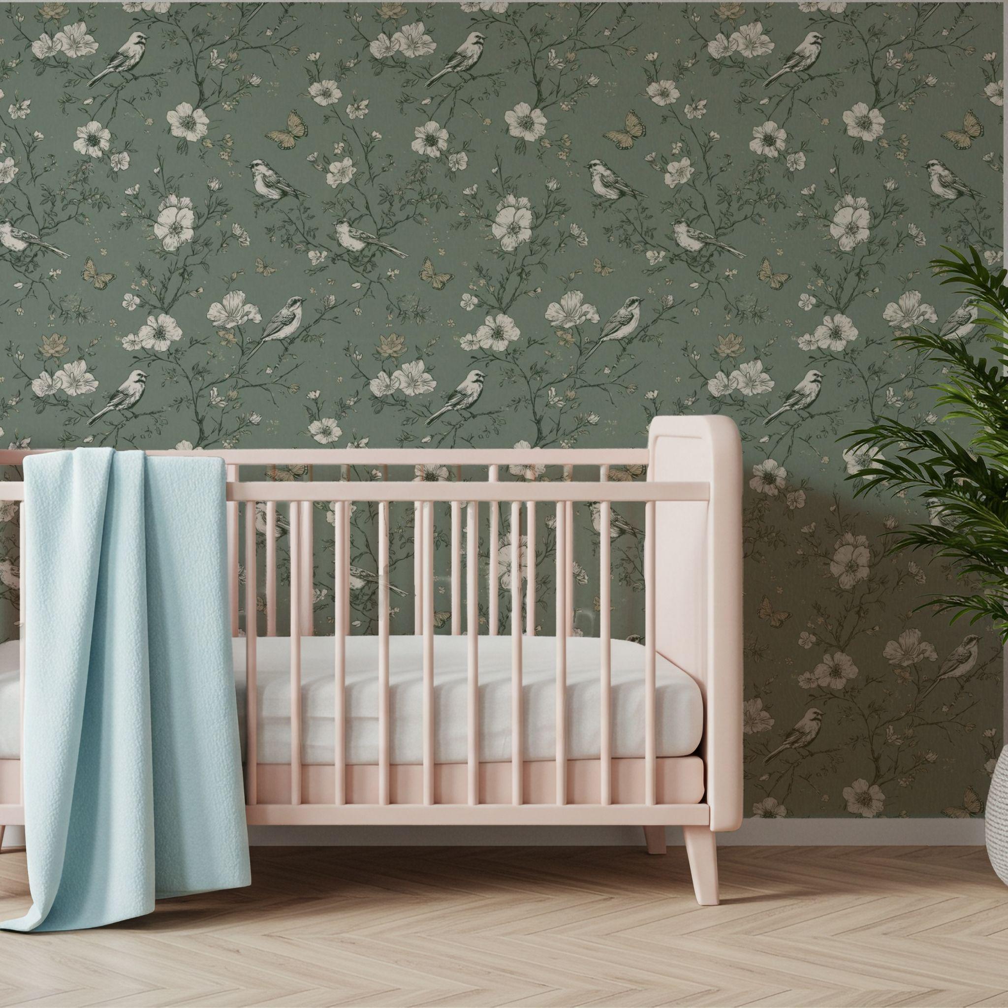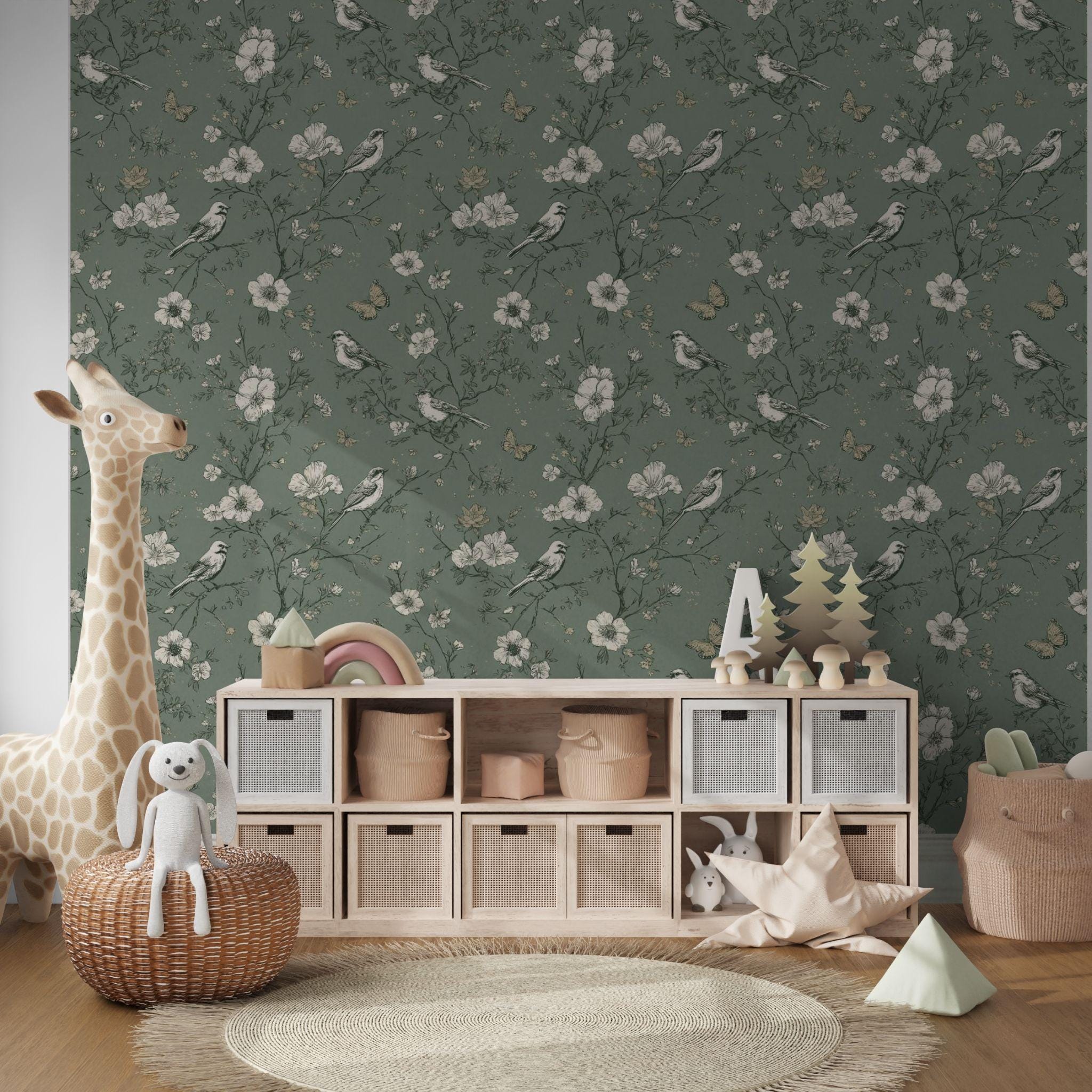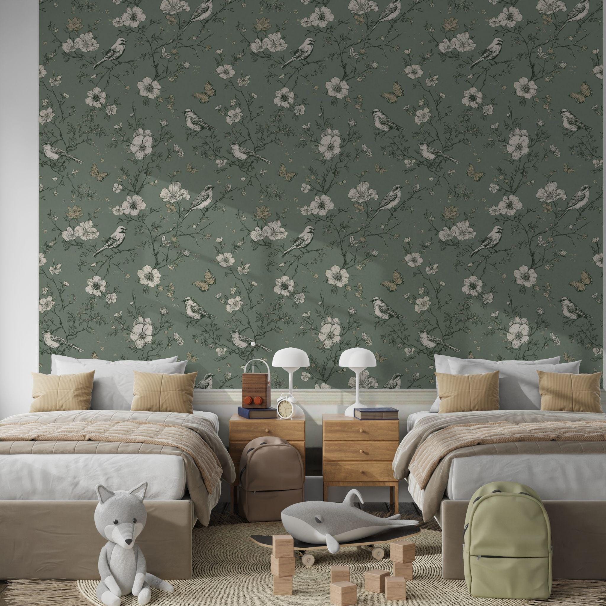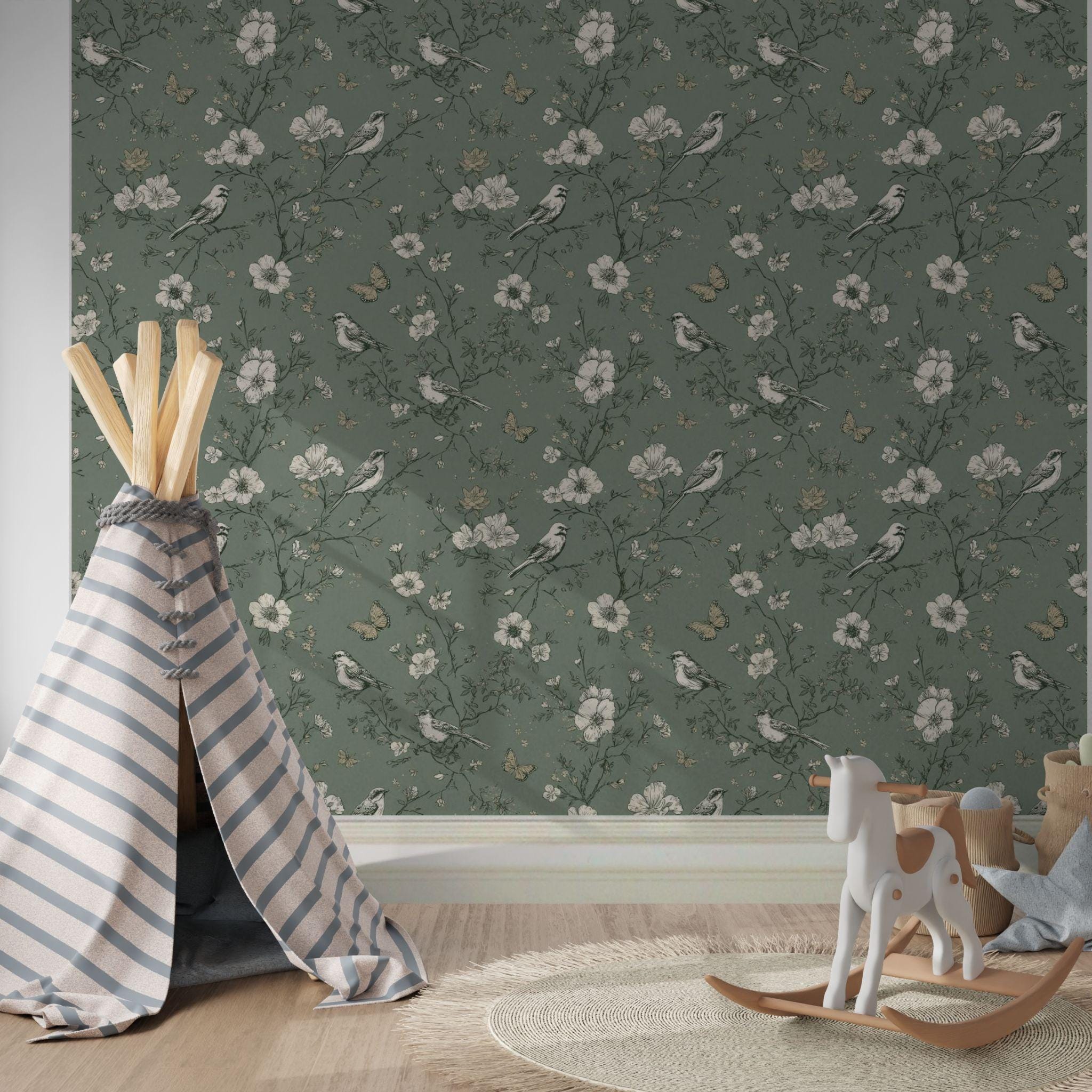 A tranquil vintage dream, this sage-green wallpaper blooms with delicate ivory flowers, fluttering butterflies, and graceful birds resting on slender branches. The soft, timeworn tones and painterly details give it a calm, romantic feel — perfect for bringing warmth and nostalgia to a nursery, bedroom, or cottage-inspired space.