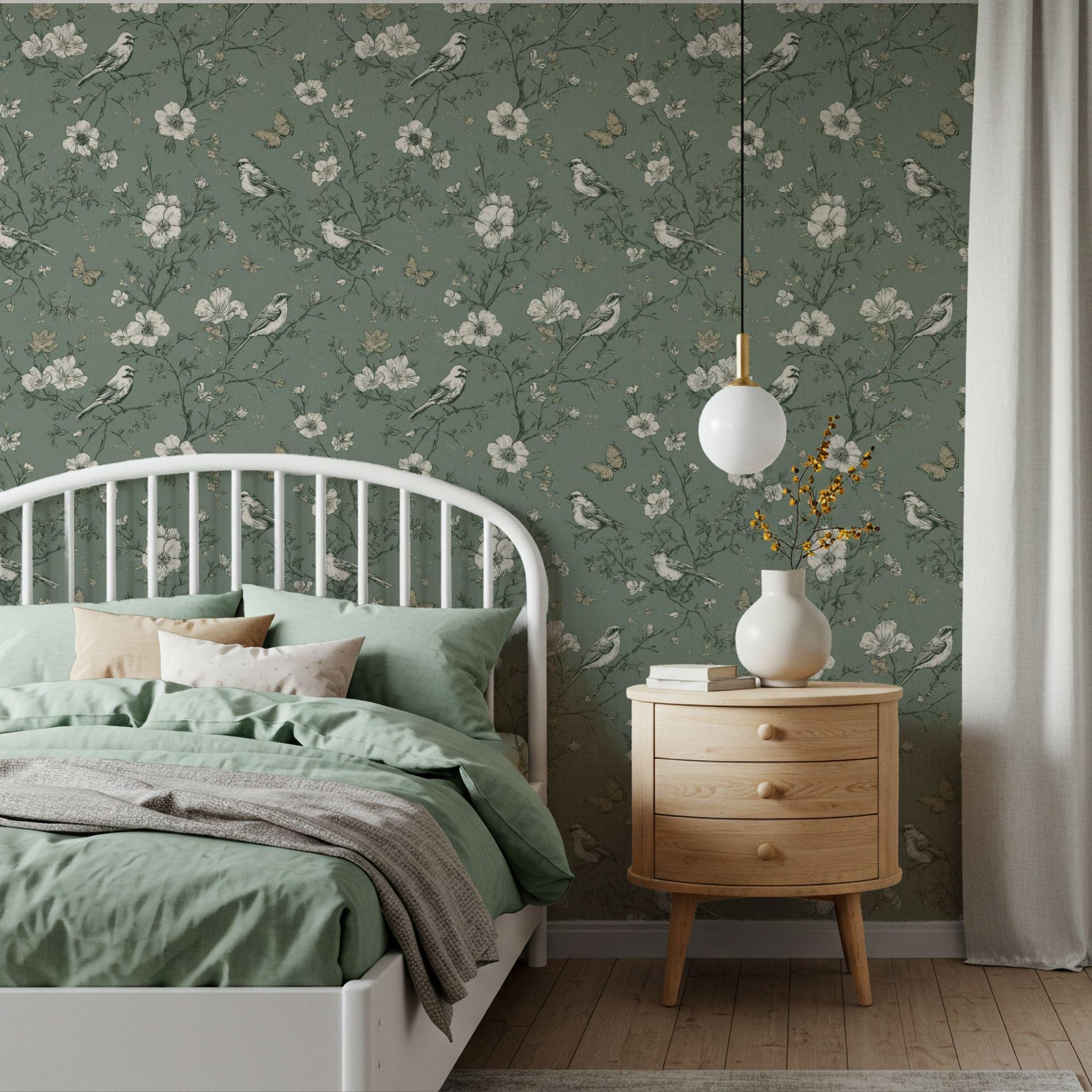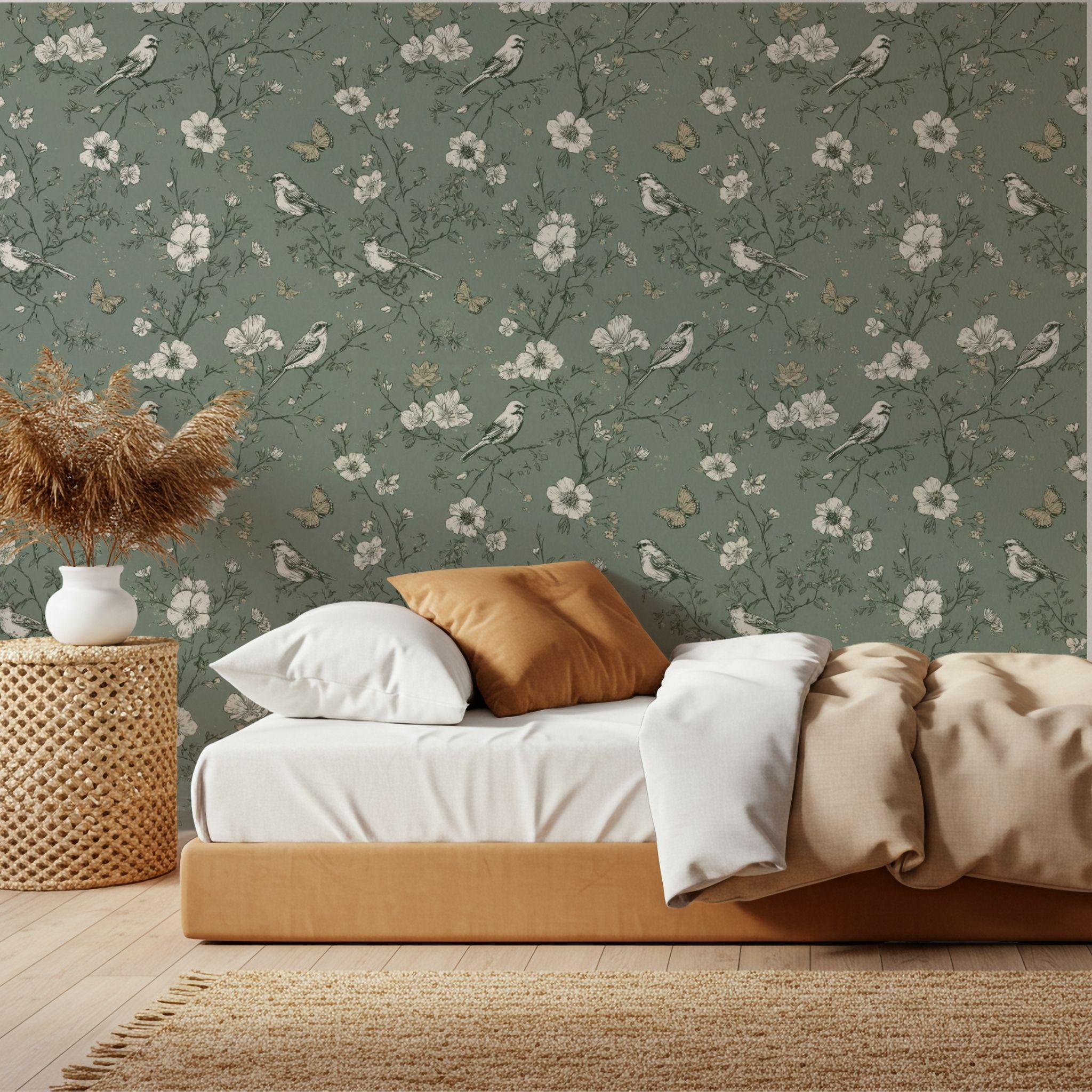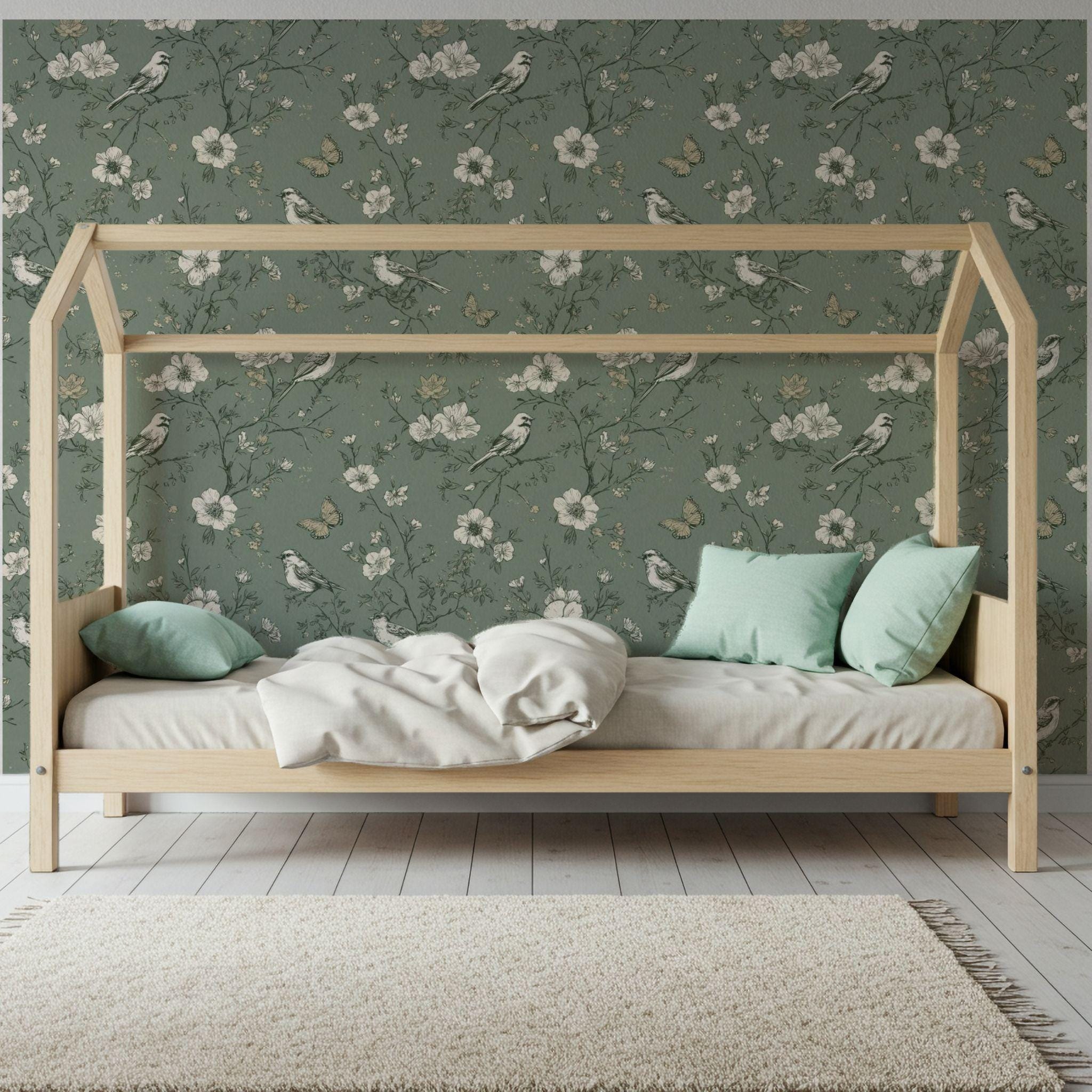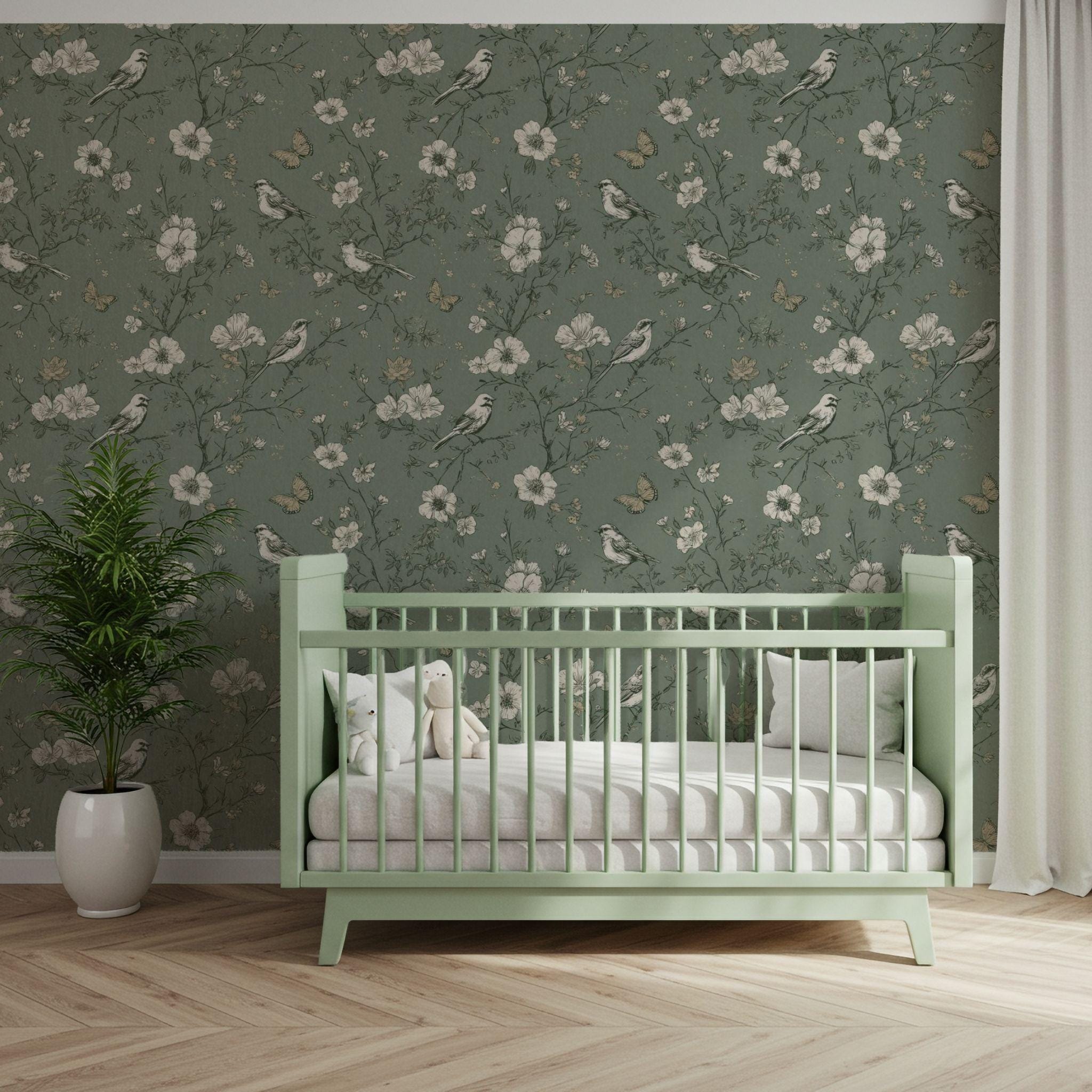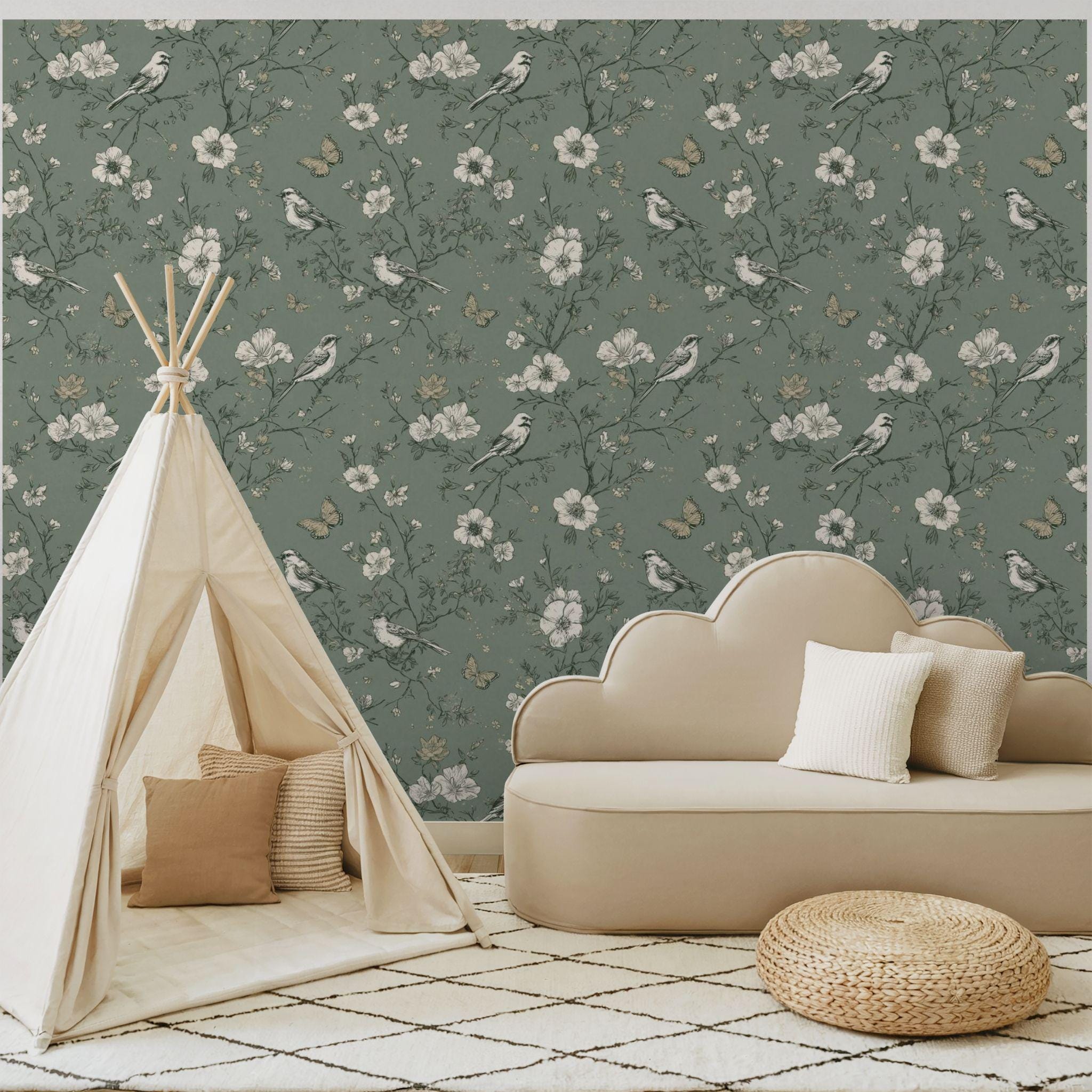 A tranquil vintage dream, this sage-green wallpaper blooms with delicate ivory flowers, fluttering butterflies, and graceful birds resting on slender branches. The soft, timeworn tones and painterly details give it a calm, romantic feel — perfect for bringing warmth and nostalgia to a nursery, bedroom, or cottage-inspired space.