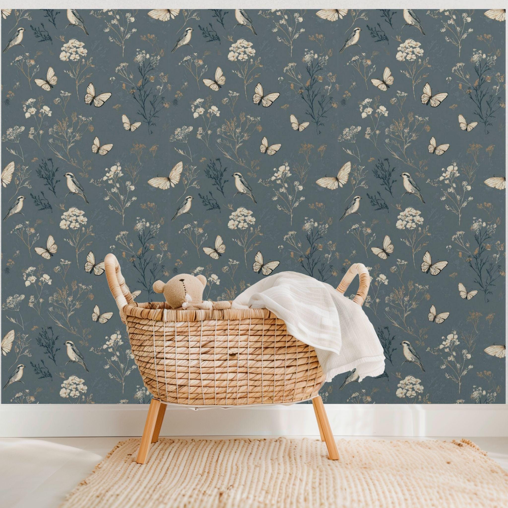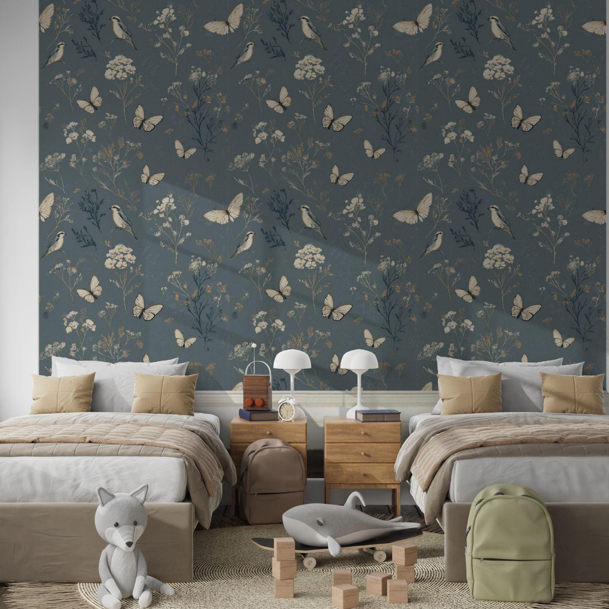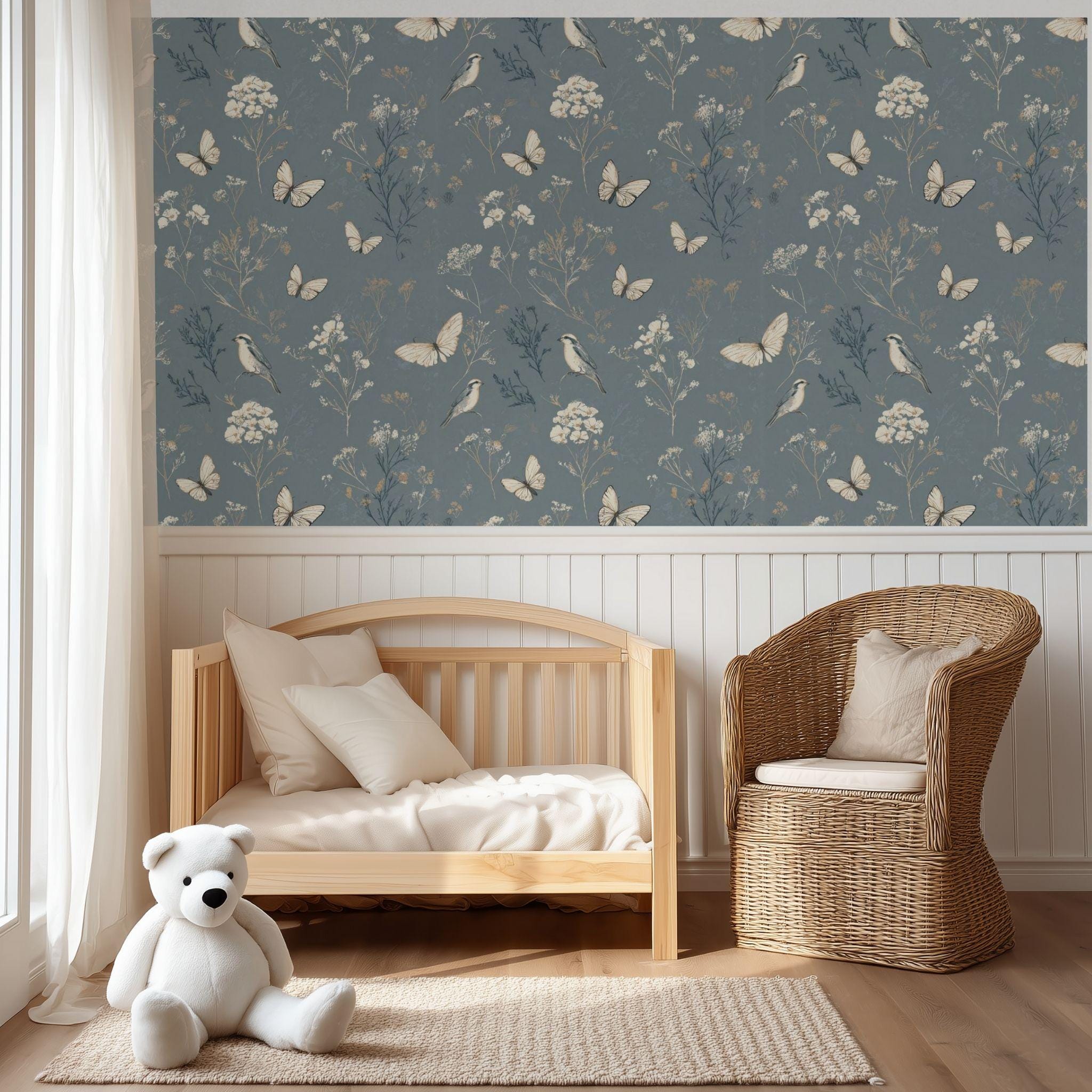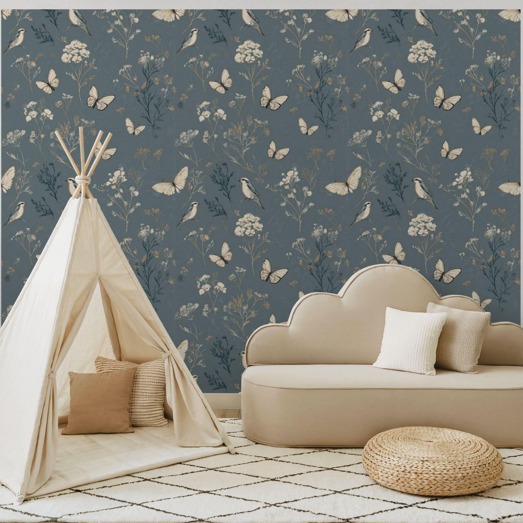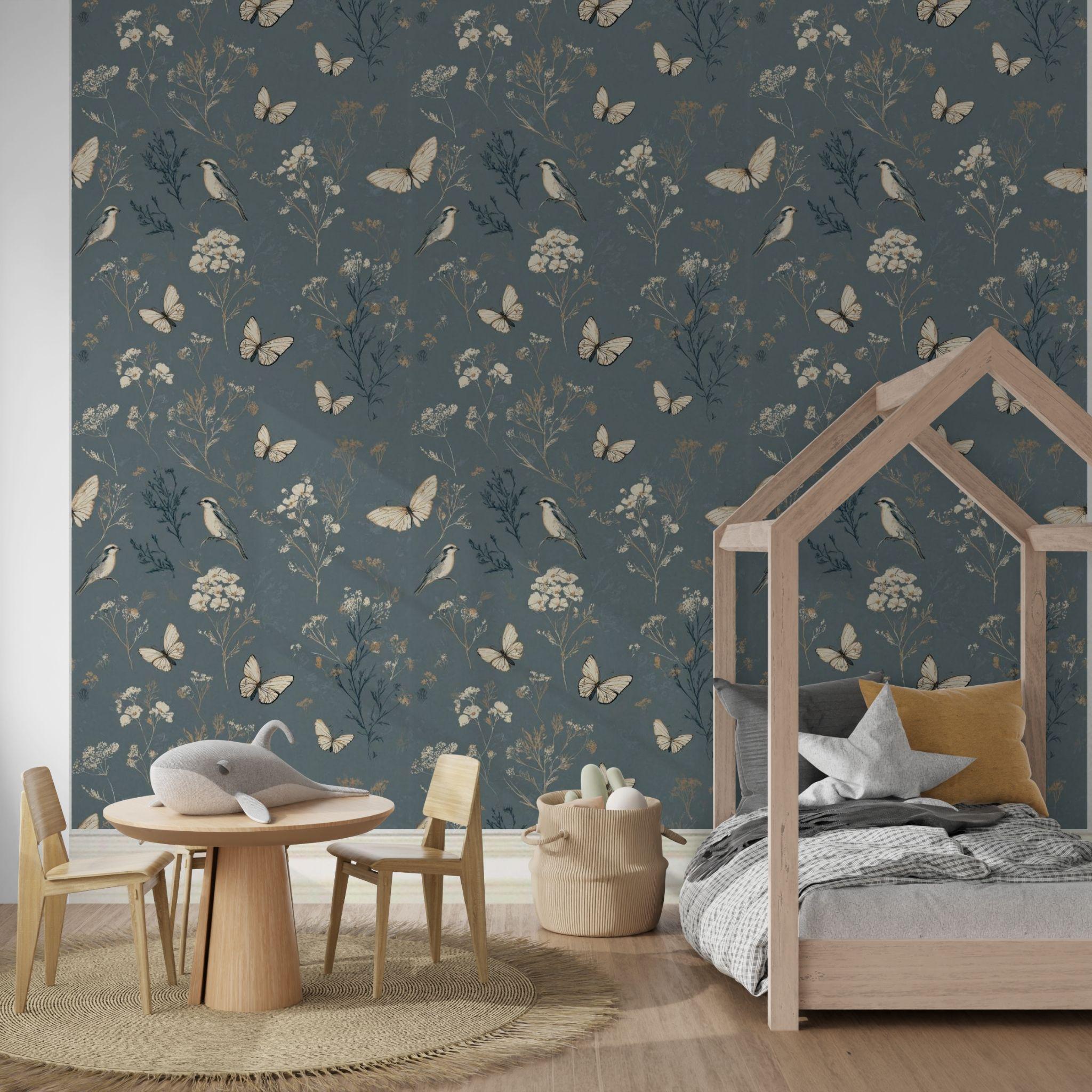 Step into a storybook garden with this timeless vintage-inspired wallpaper. Soft cream butterflies and delicate songbirds flutter among wildflowers against a dusky blue backdrop, creating a peaceful, heirloom look that feels both classic and current. Perfect for nurseries, bedrooms, or cozy reading corners, it adds a touch of quiet romance to any space.