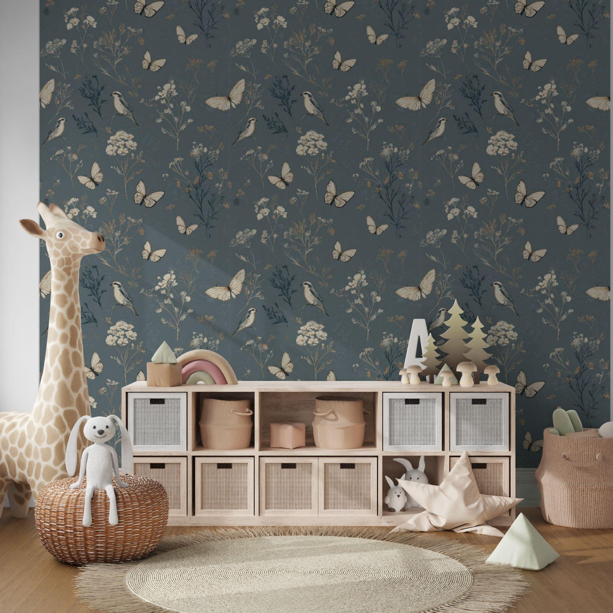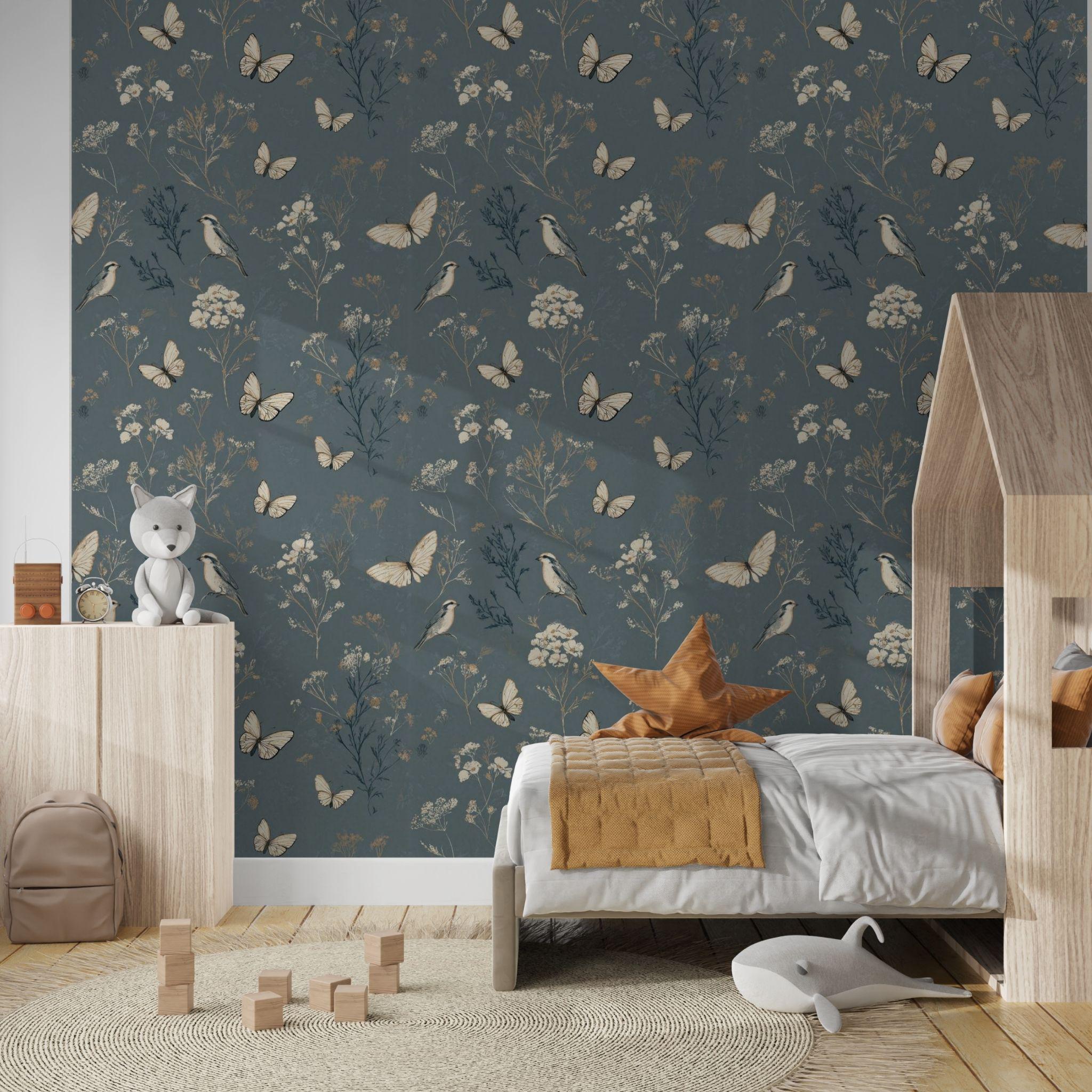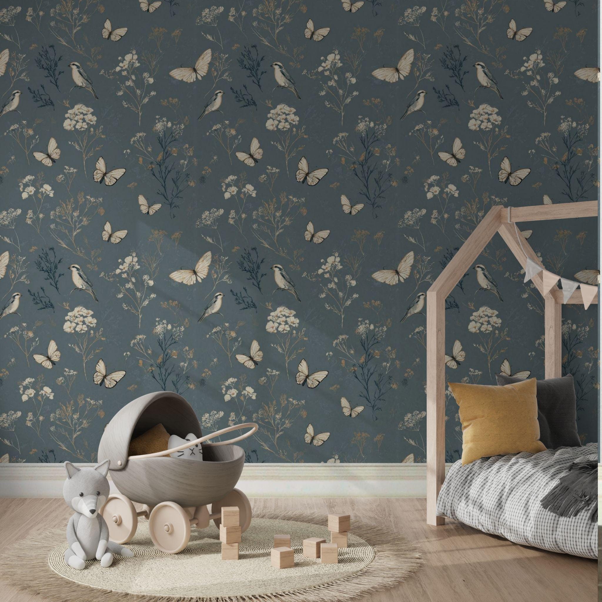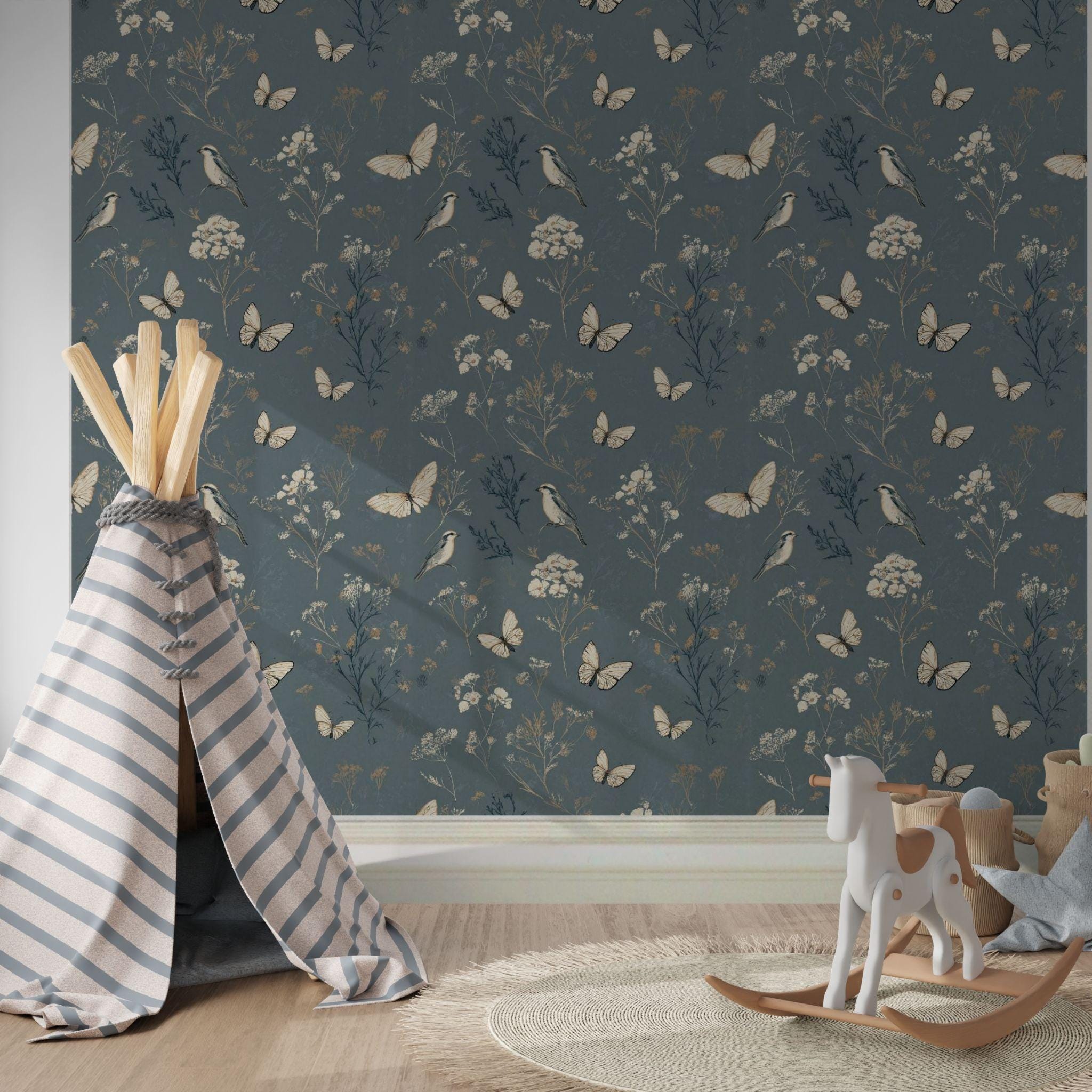 Step into a storybook garden with this timeless vintage-inspired wallpaper. Soft cream butterflies and delicate songbirds flutter among wildflowers against a dusky blue backdrop, creating a peaceful, heirloom look that feels both classic and current. Perfect for nurseries, bedrooms, or cozy reading corners, it adds a touch of quiet romance to any space.