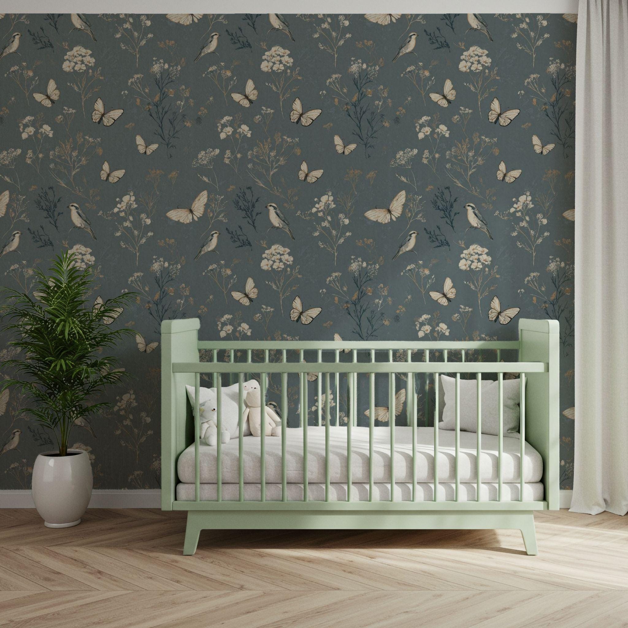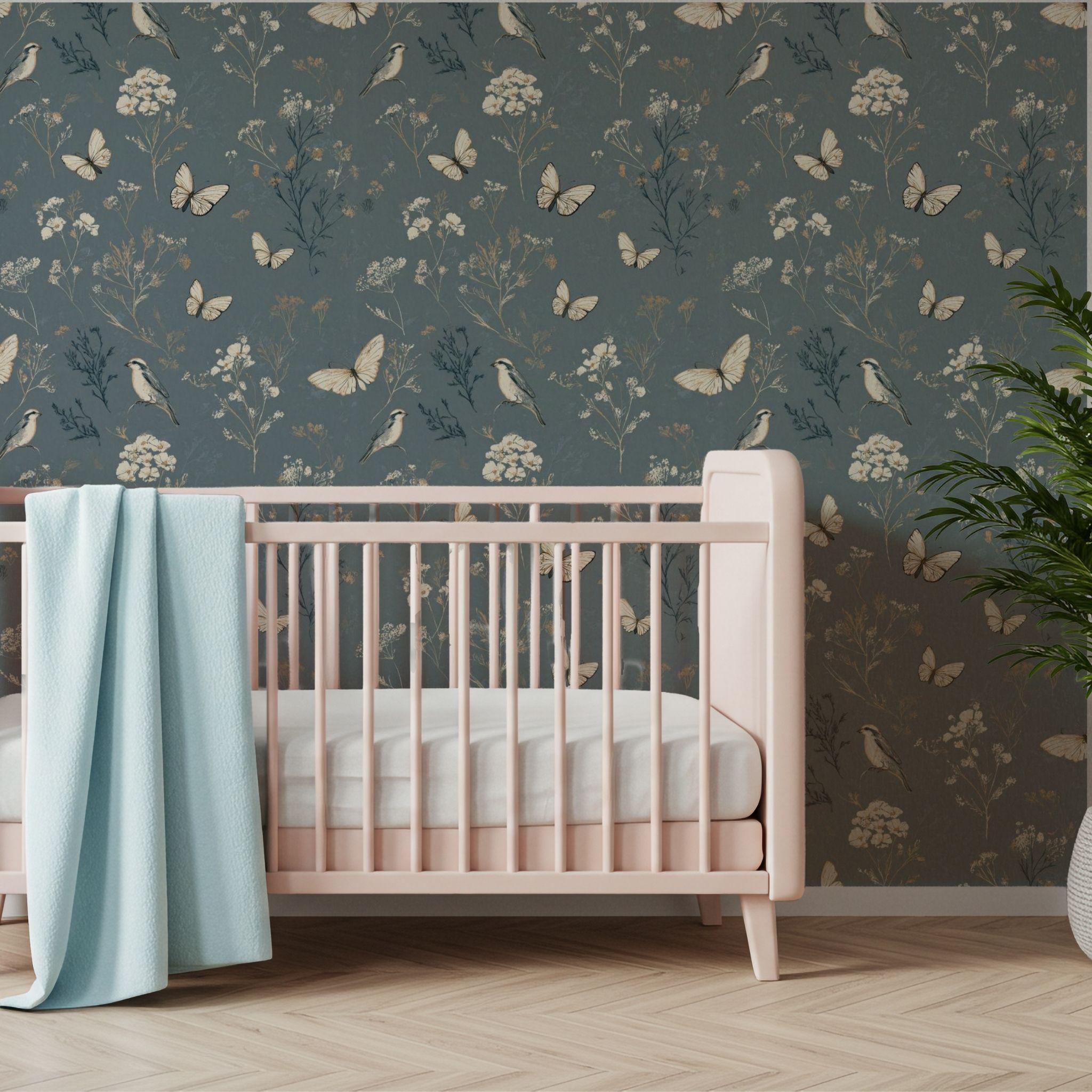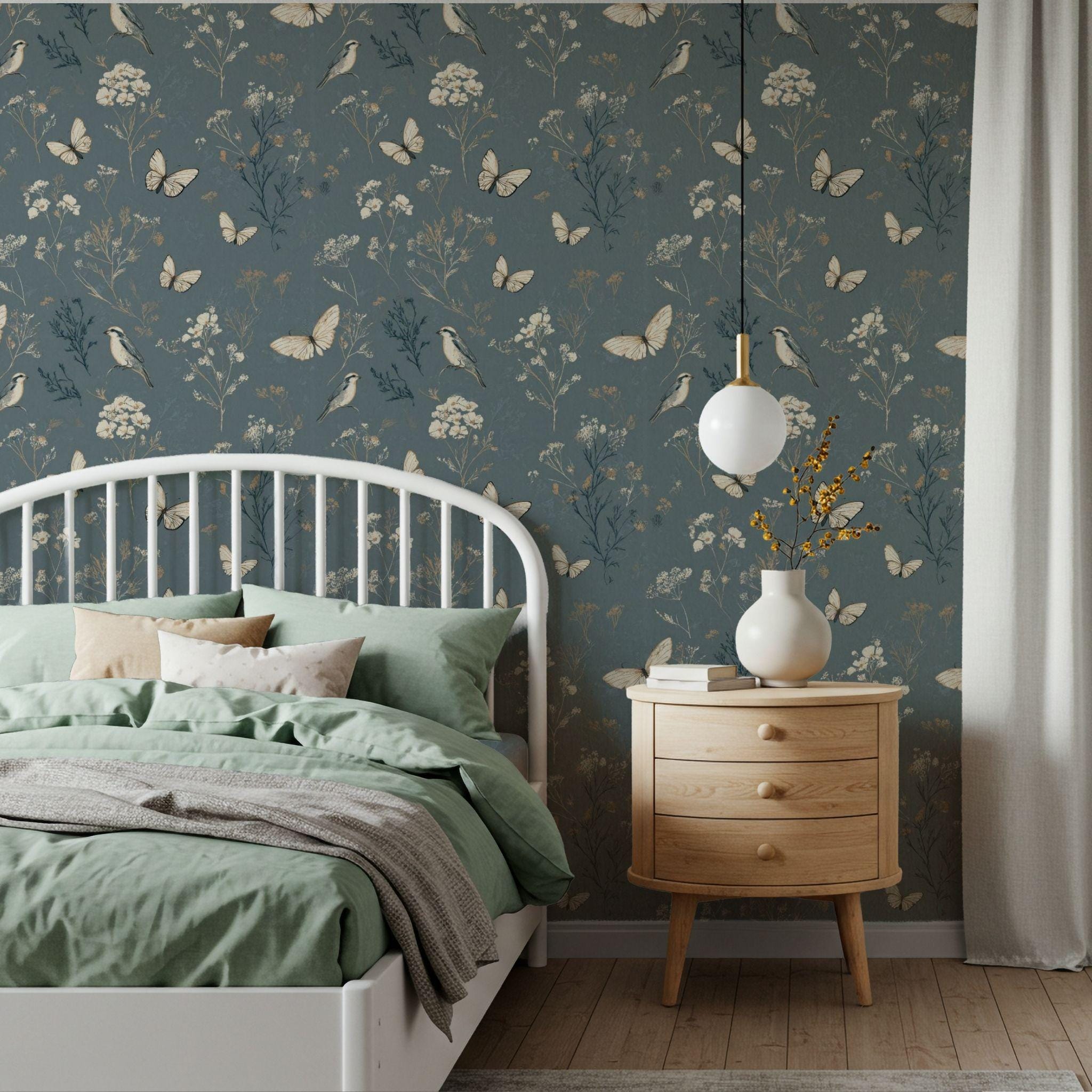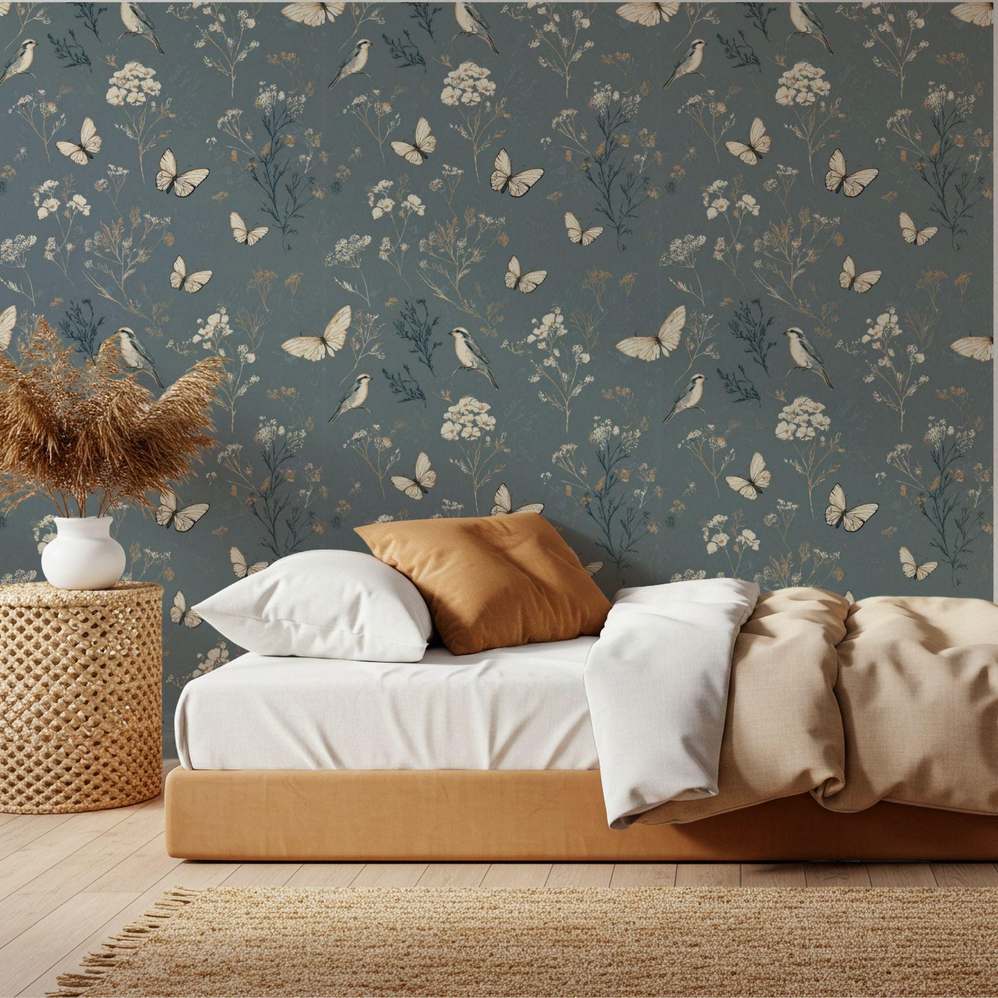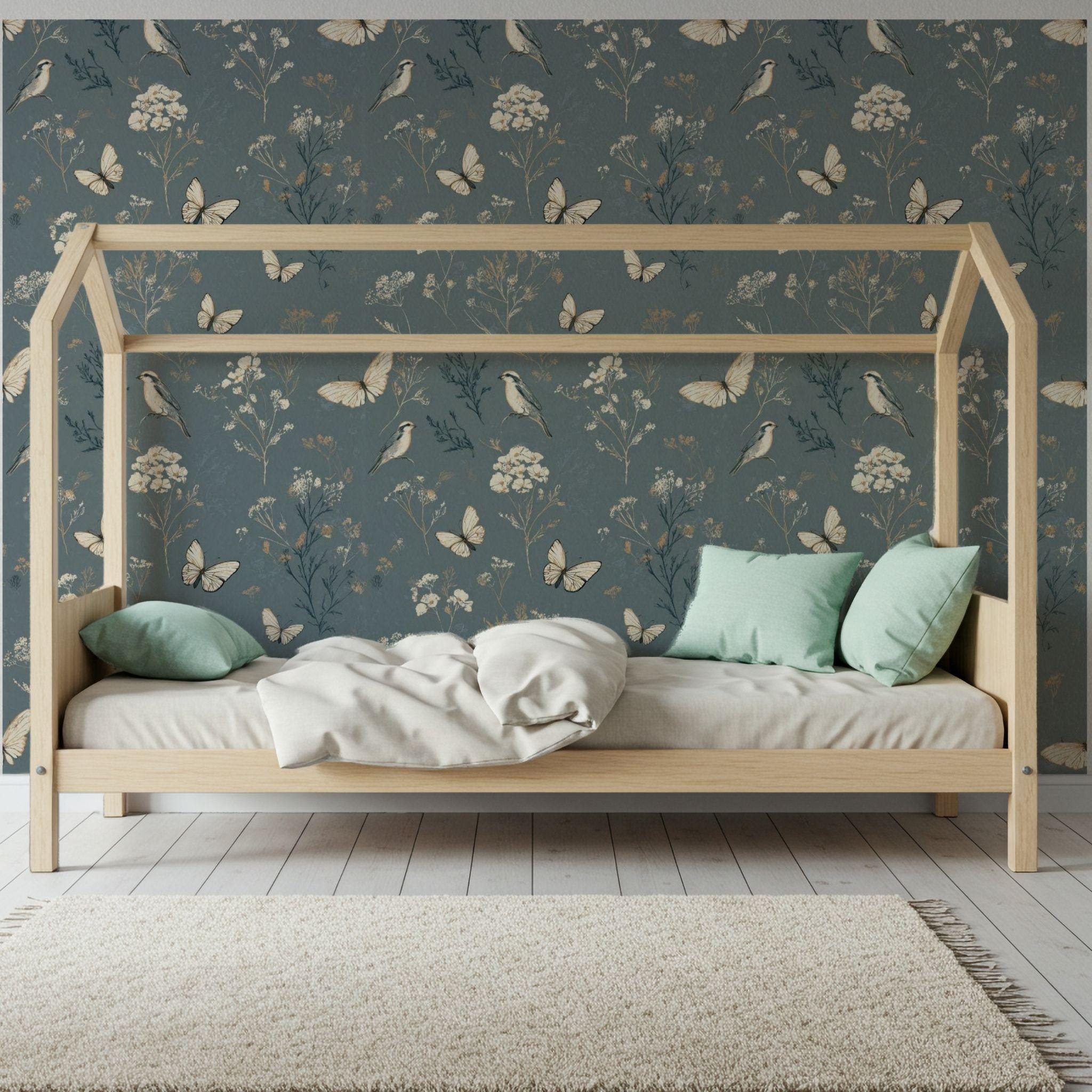 Step into a storybook garden with this timeless vintage-inspired wallpaper. Soft cream butterflies and delicate songbirds flutter among wildflowers against a dusky blue backdrop, creating a peaceful, heirloom look that feels both classic and current. Perfect for nurseries, bedrooms, or cozy reading corners, it adds a touch of quiet romance to any space.