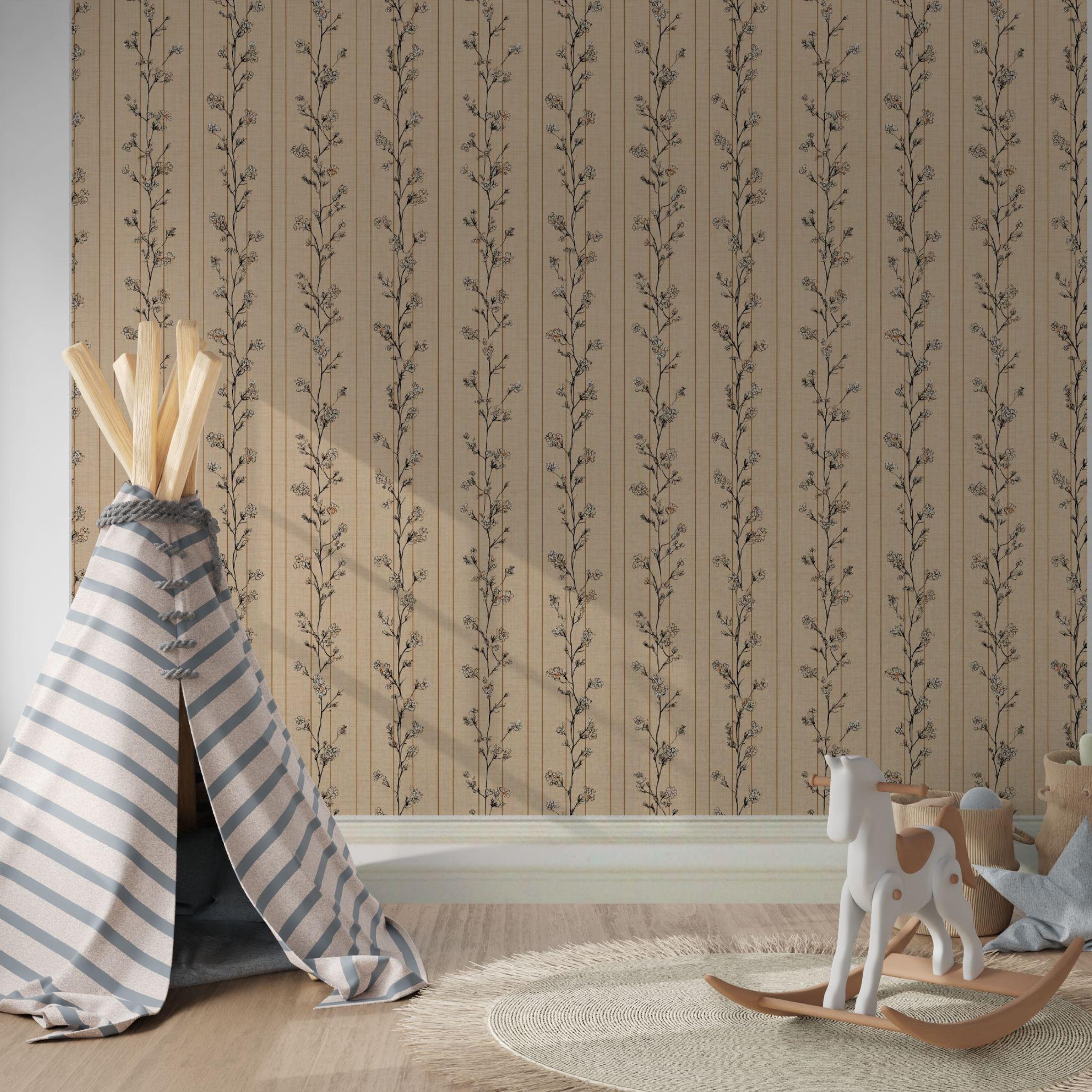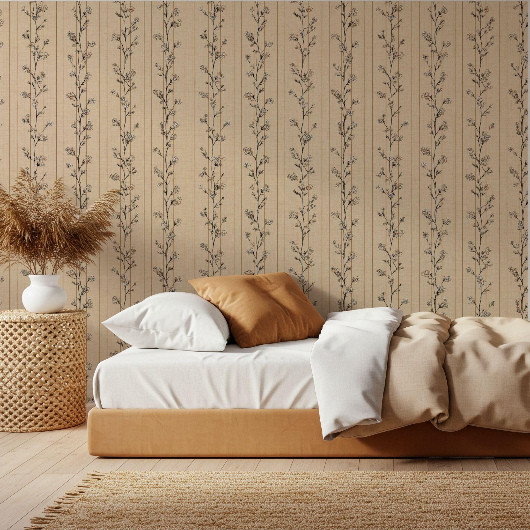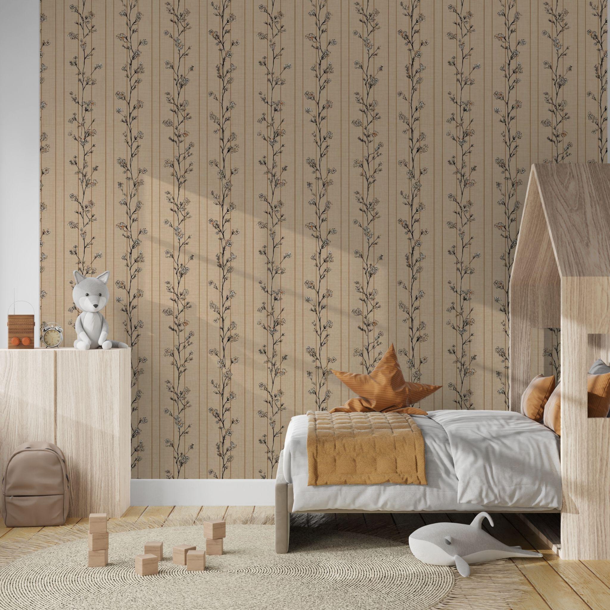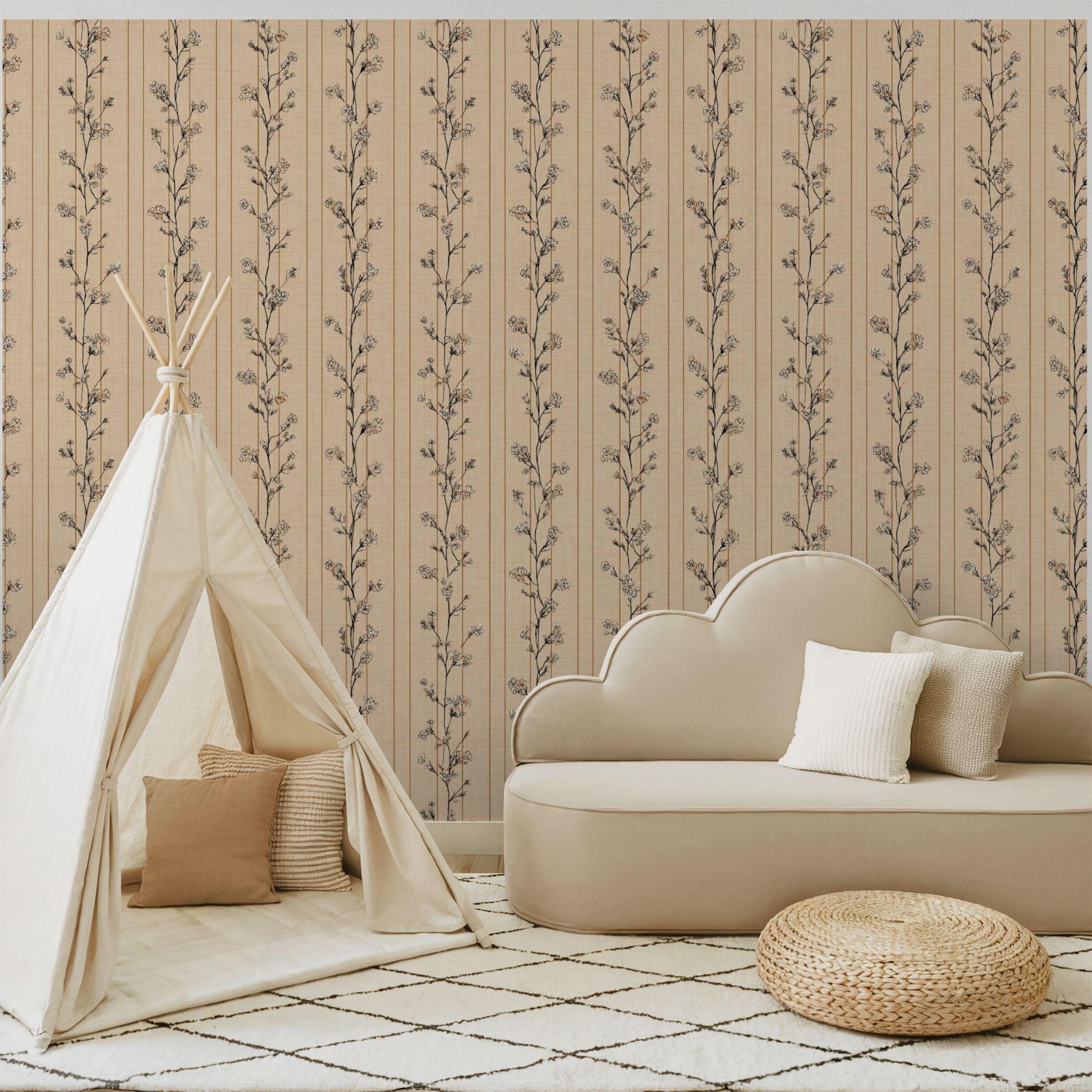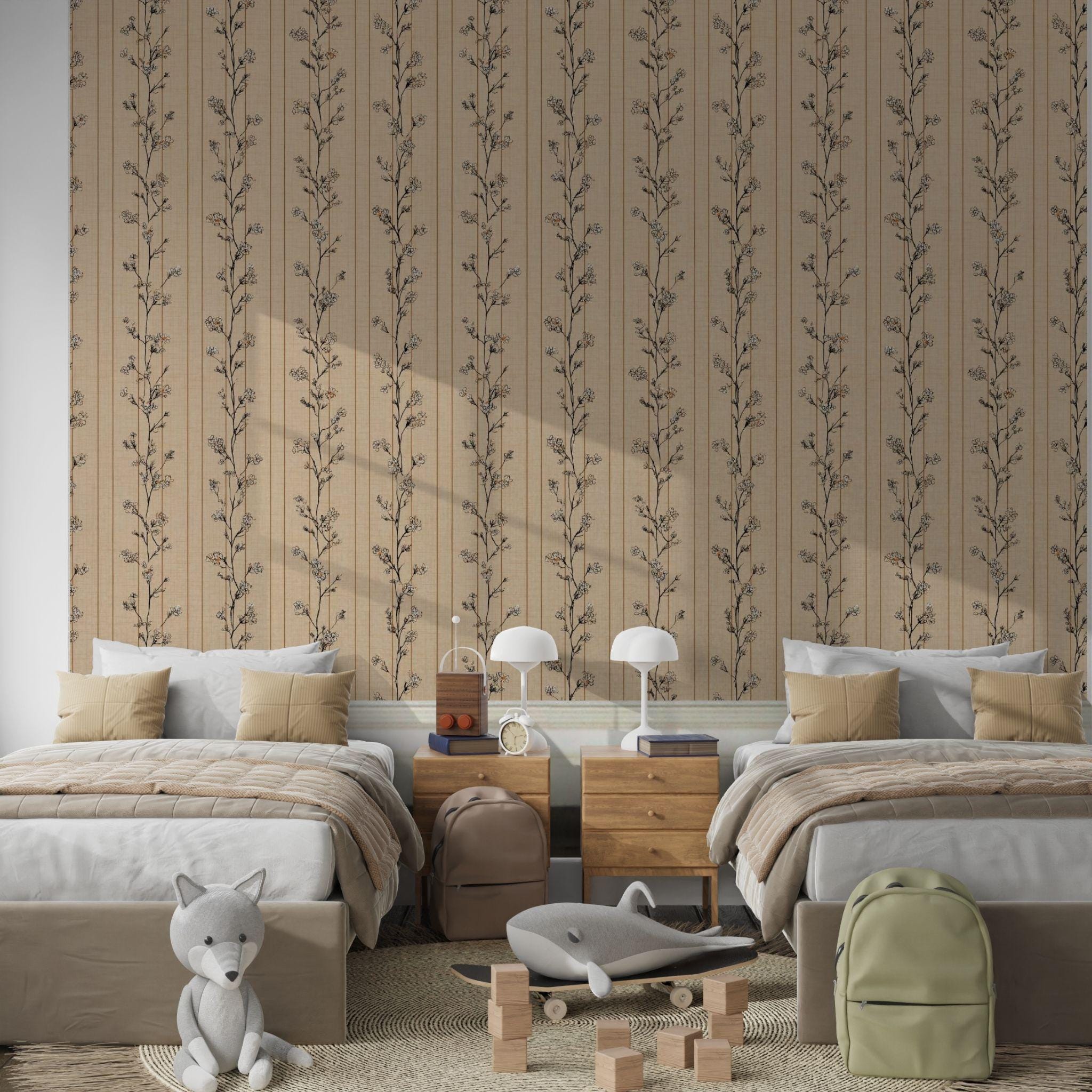 This pattern brings quiet countryside elegance to life — slender floral vines rise in graceful verticals across a warm linen-tan backdrop. The hand-drawn blooms and subtle vintage texture evoke the charm of old textiles, creating a space that feels both classic and effortlessly natural. Perfect for lovers of heritage style and soft rustic refinement.