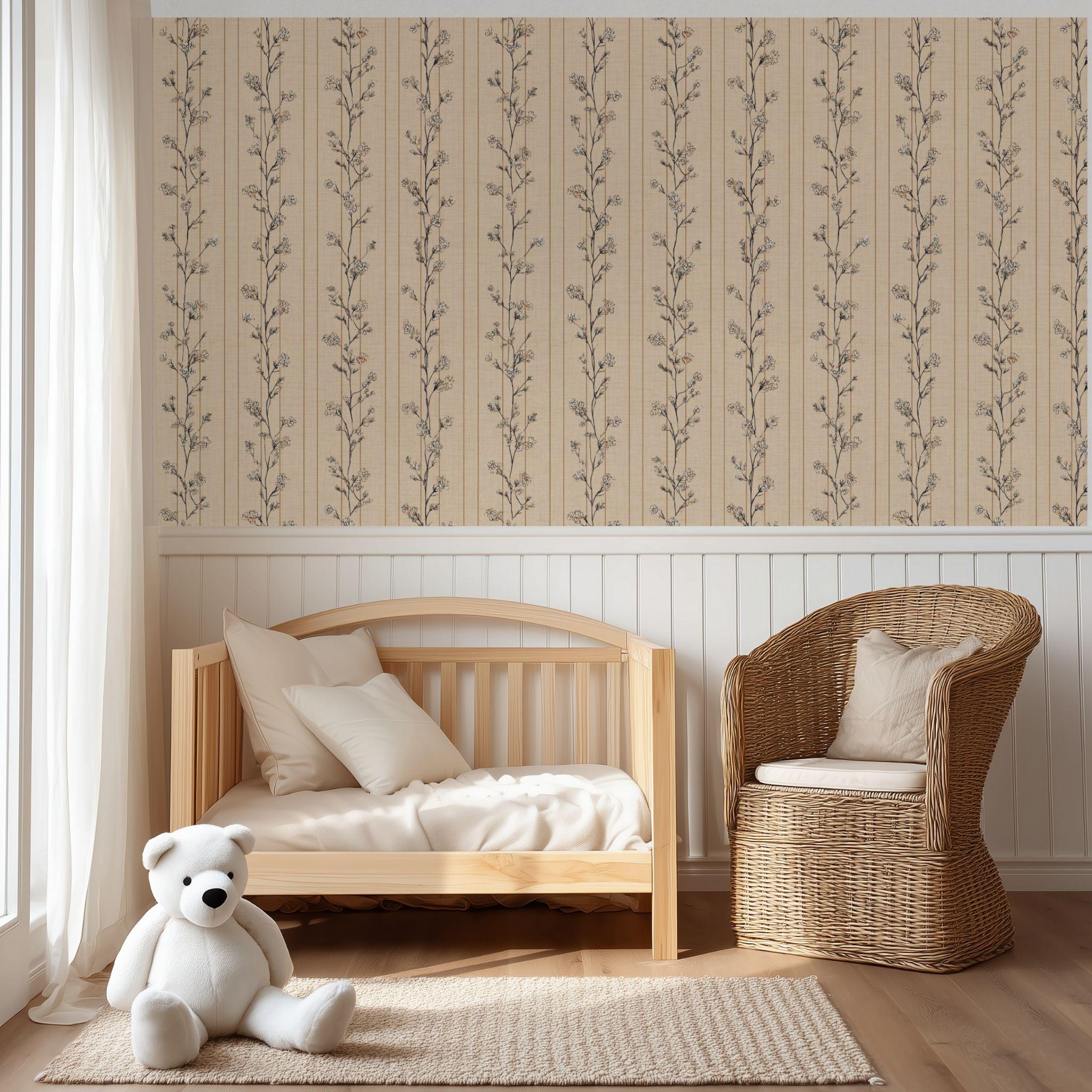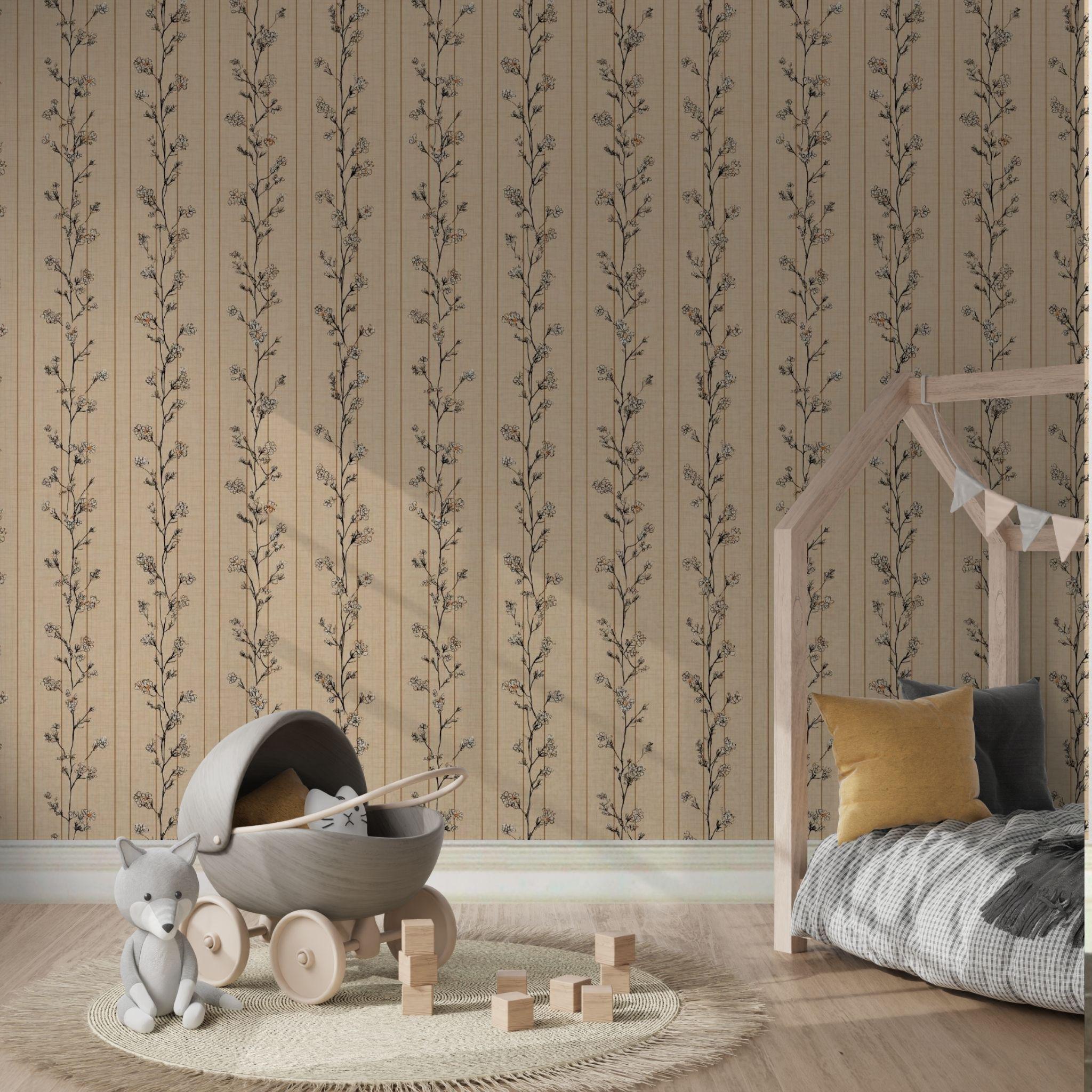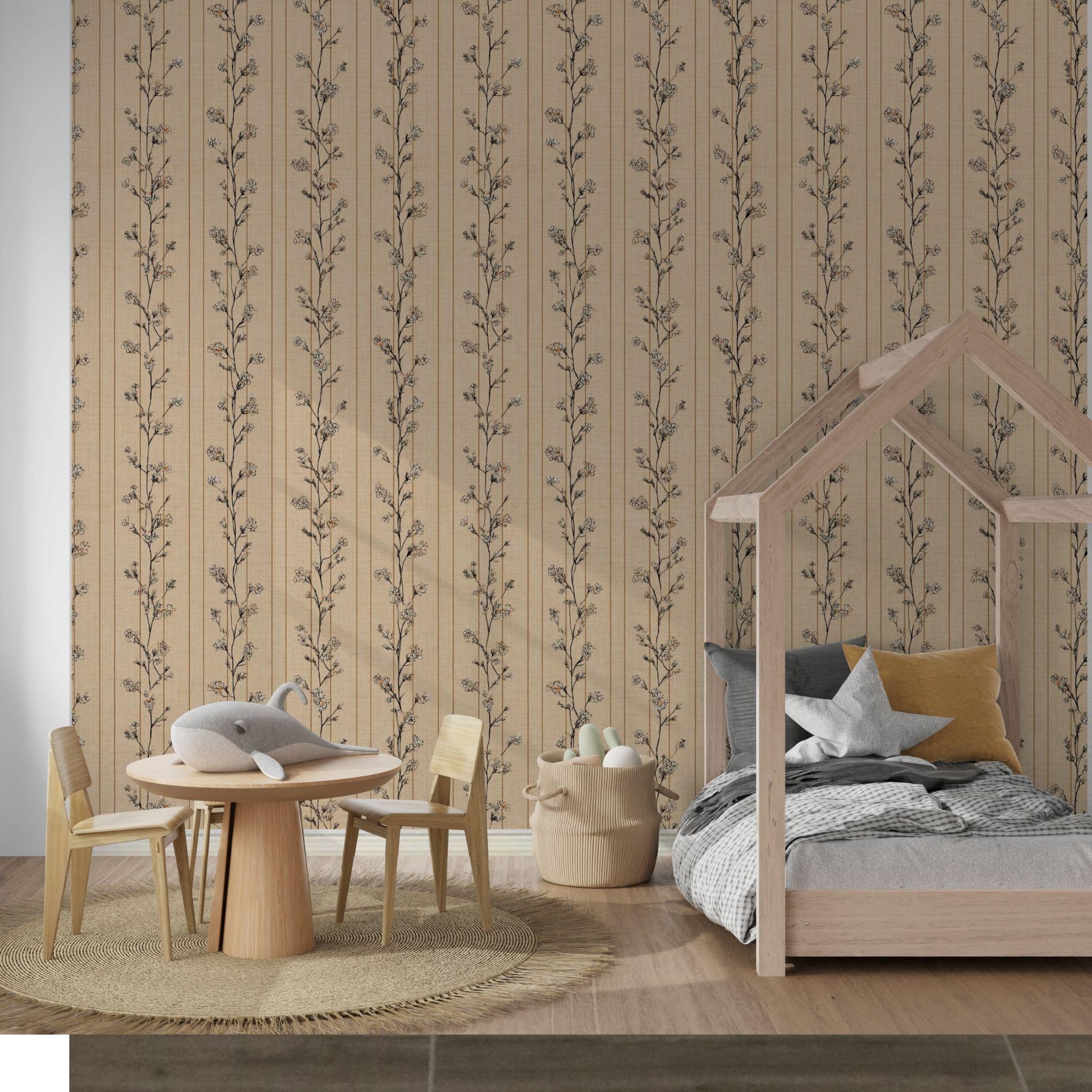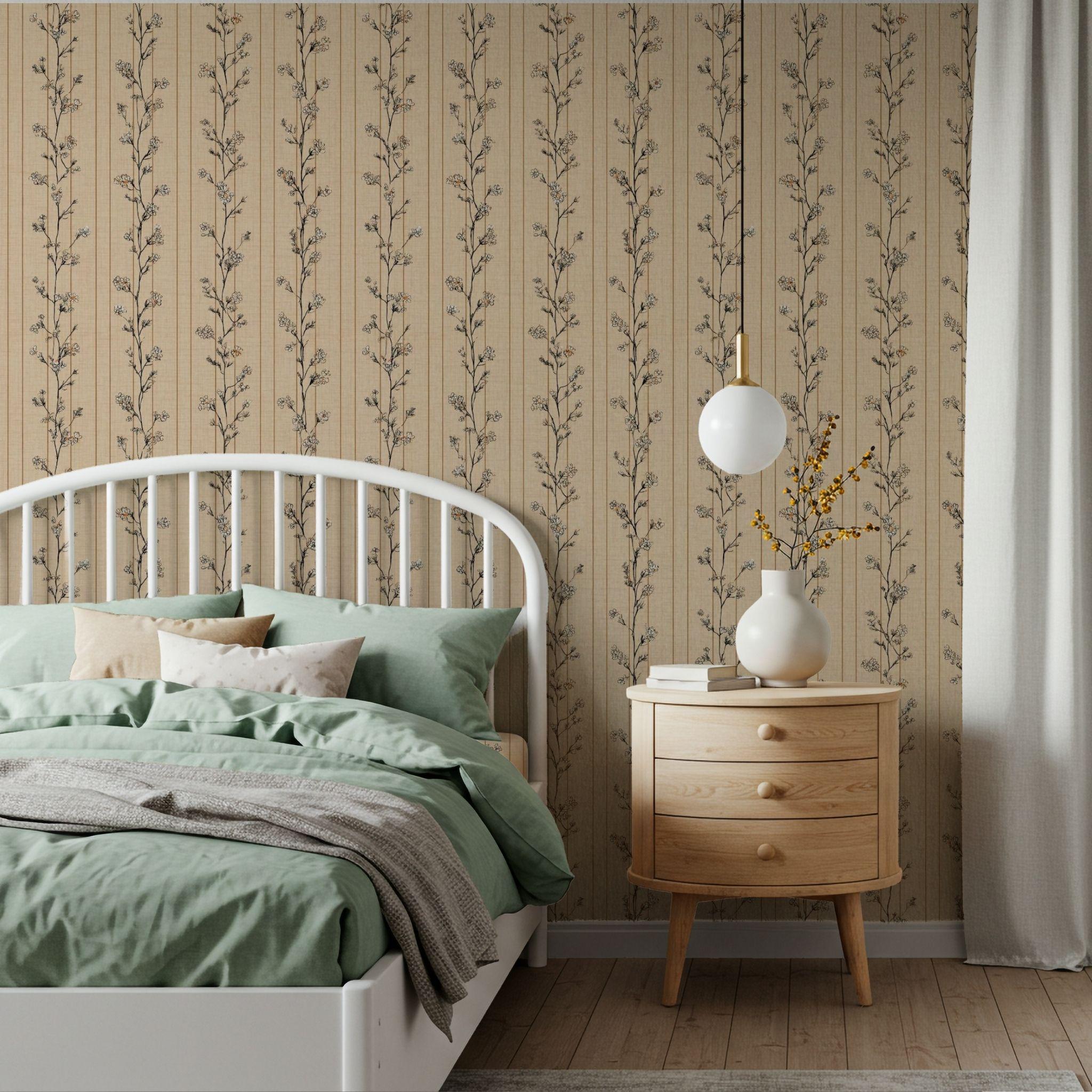 This pattern brings quiet countryside elegance to life — slender floral vines rise in graceful verticals across a warm linen-tan backdrop. The hand-drawn blooms and subtle vintage texture evoke the charm of old textiles, creating a space that feels both classic and effortlessly natural. Perfect for lovers of heritage style and soft rustic refinement.