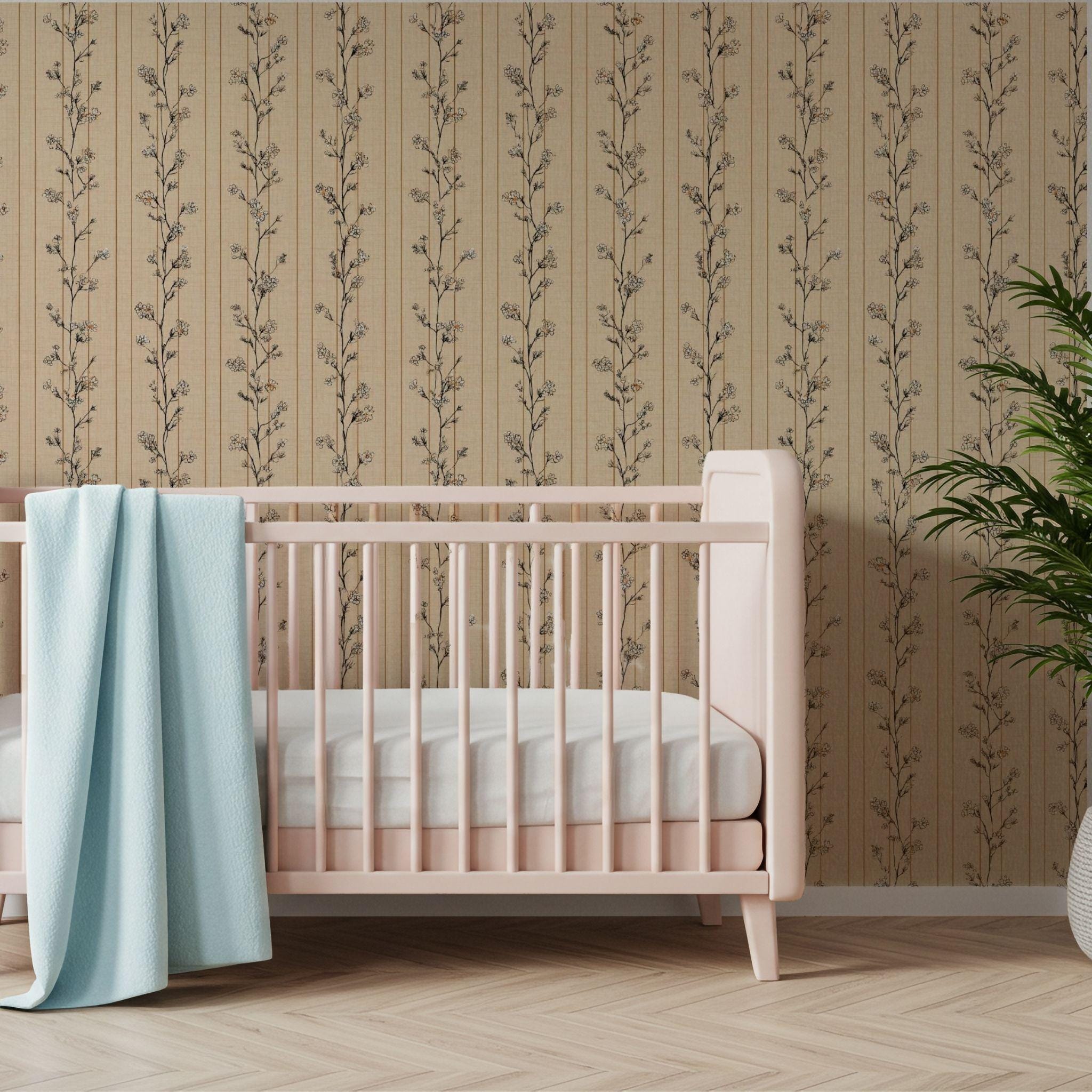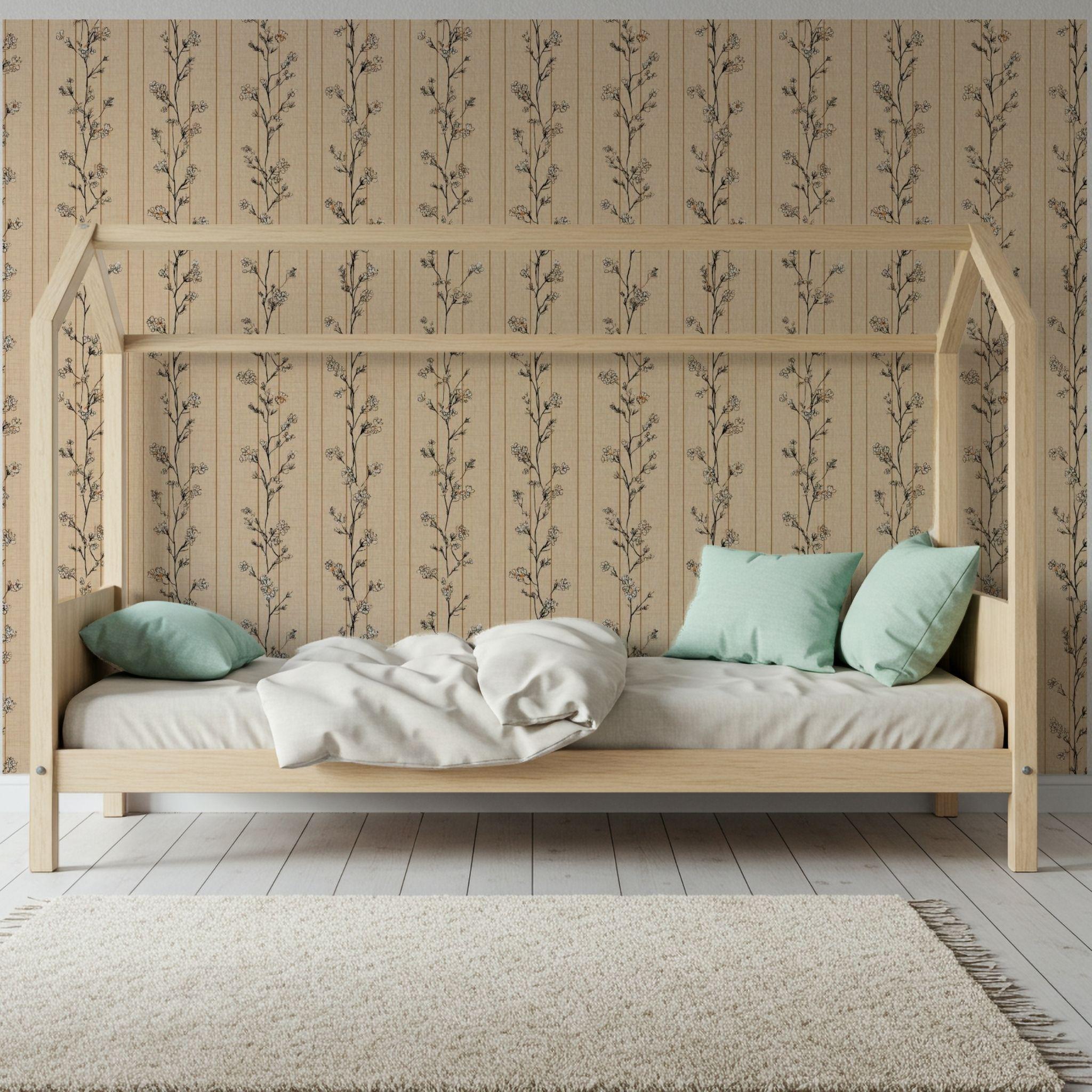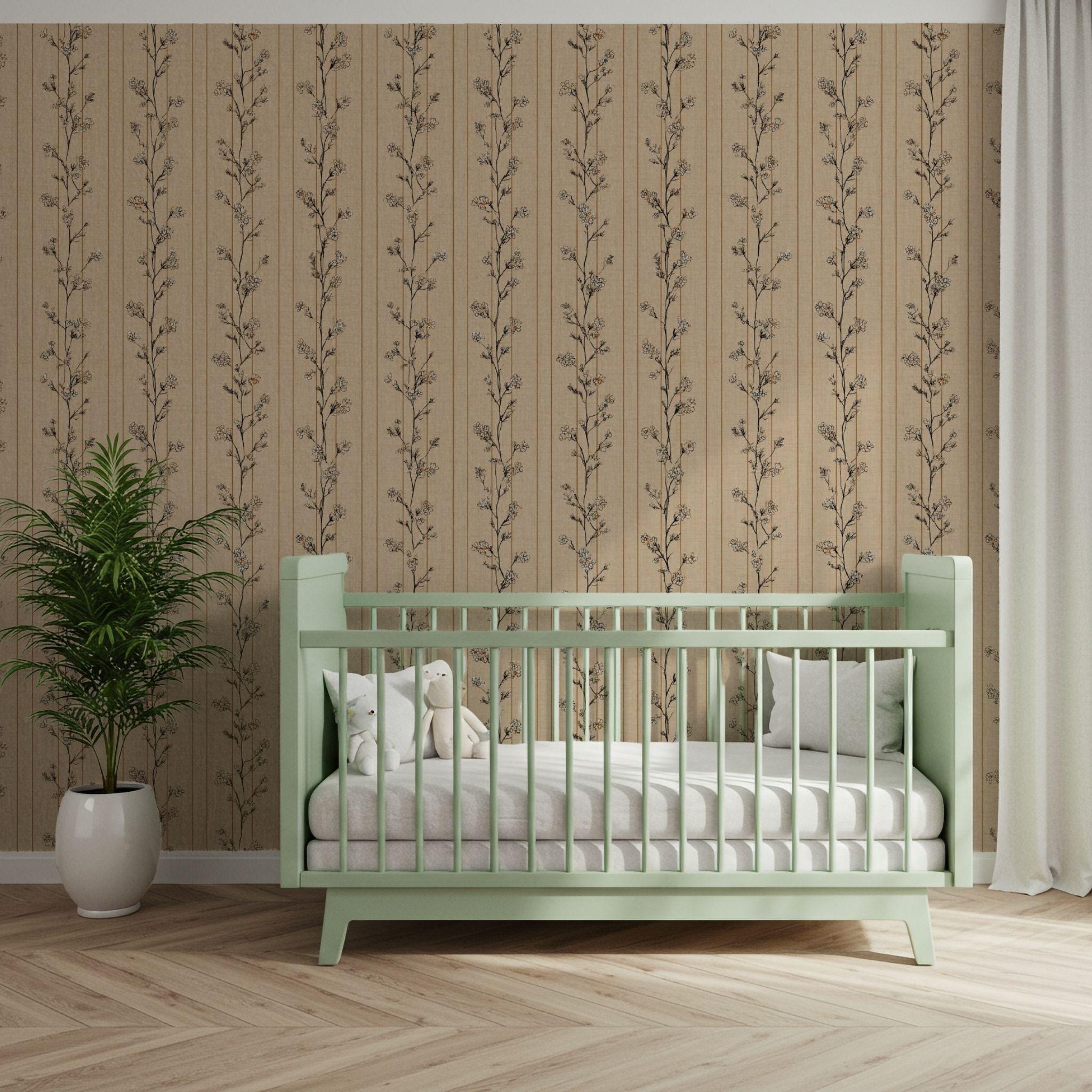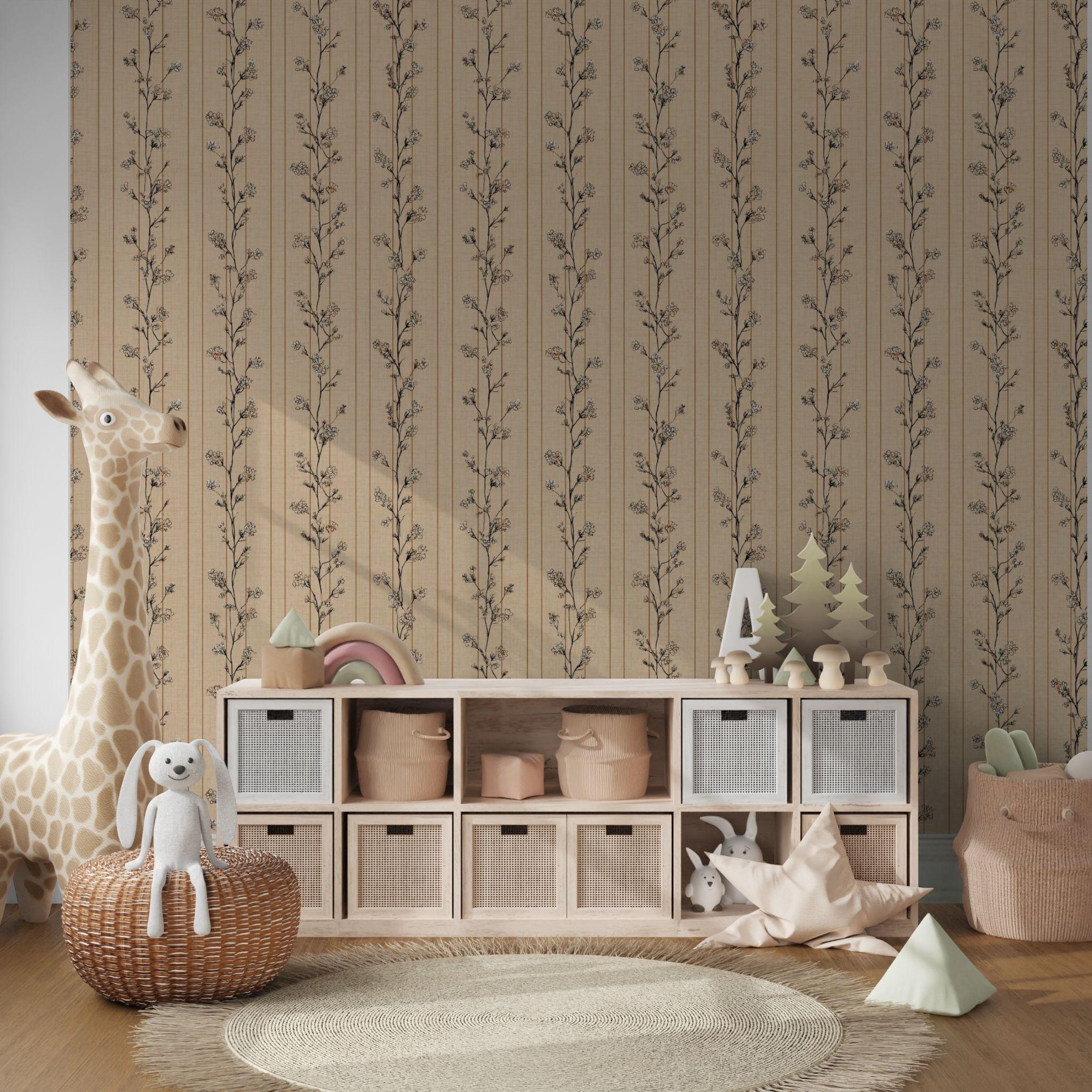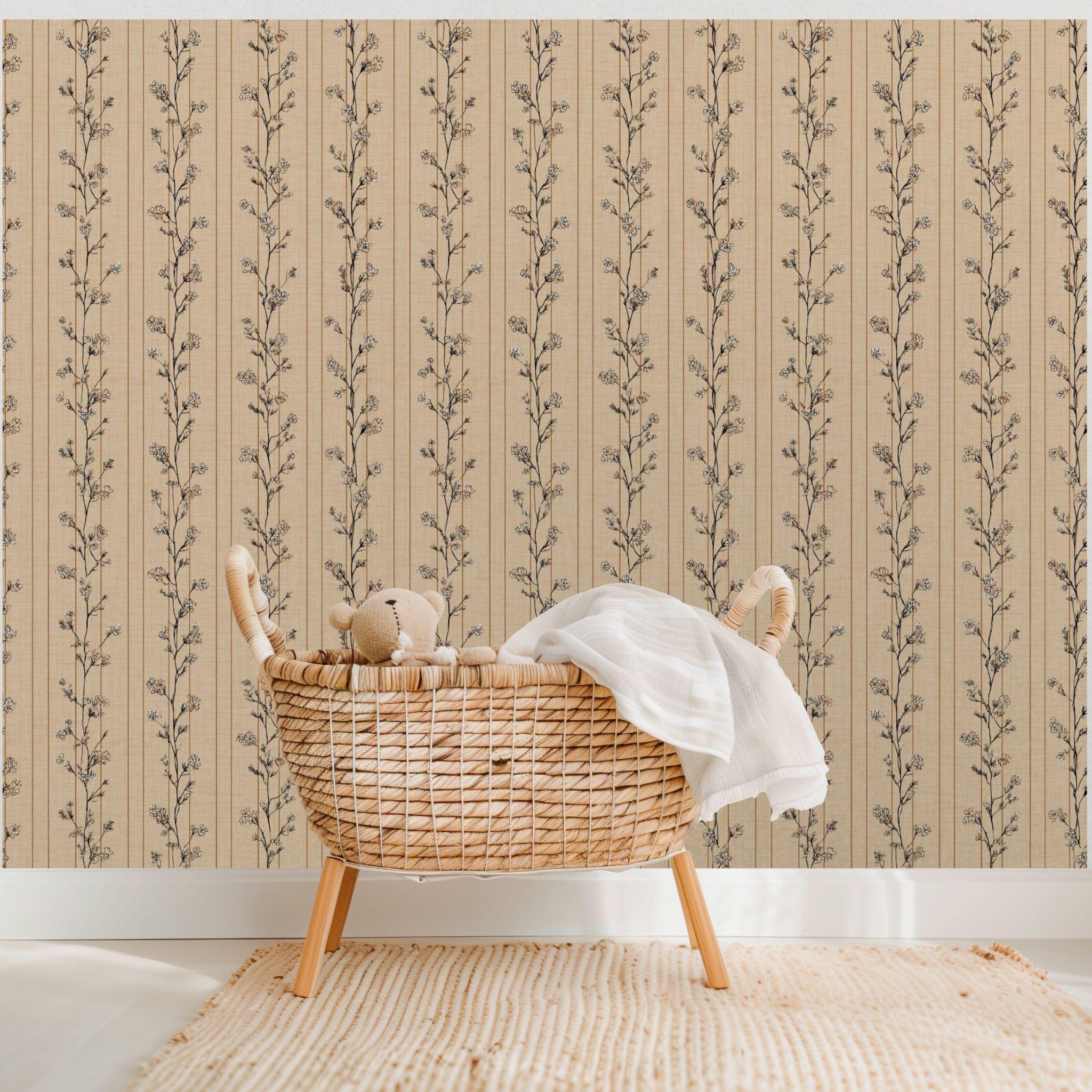 This pattern brings quiet countryside elegance to life — slender floral vines rise in graceful verticals across a warm linen-tan backdrop. The hand-drawn blooms and subtle vintage texture evoke the charm of old textiles, creating a space that feels both classic and effortlessly natural. Perfect for lovers of heritage style and soft rustic refinement.