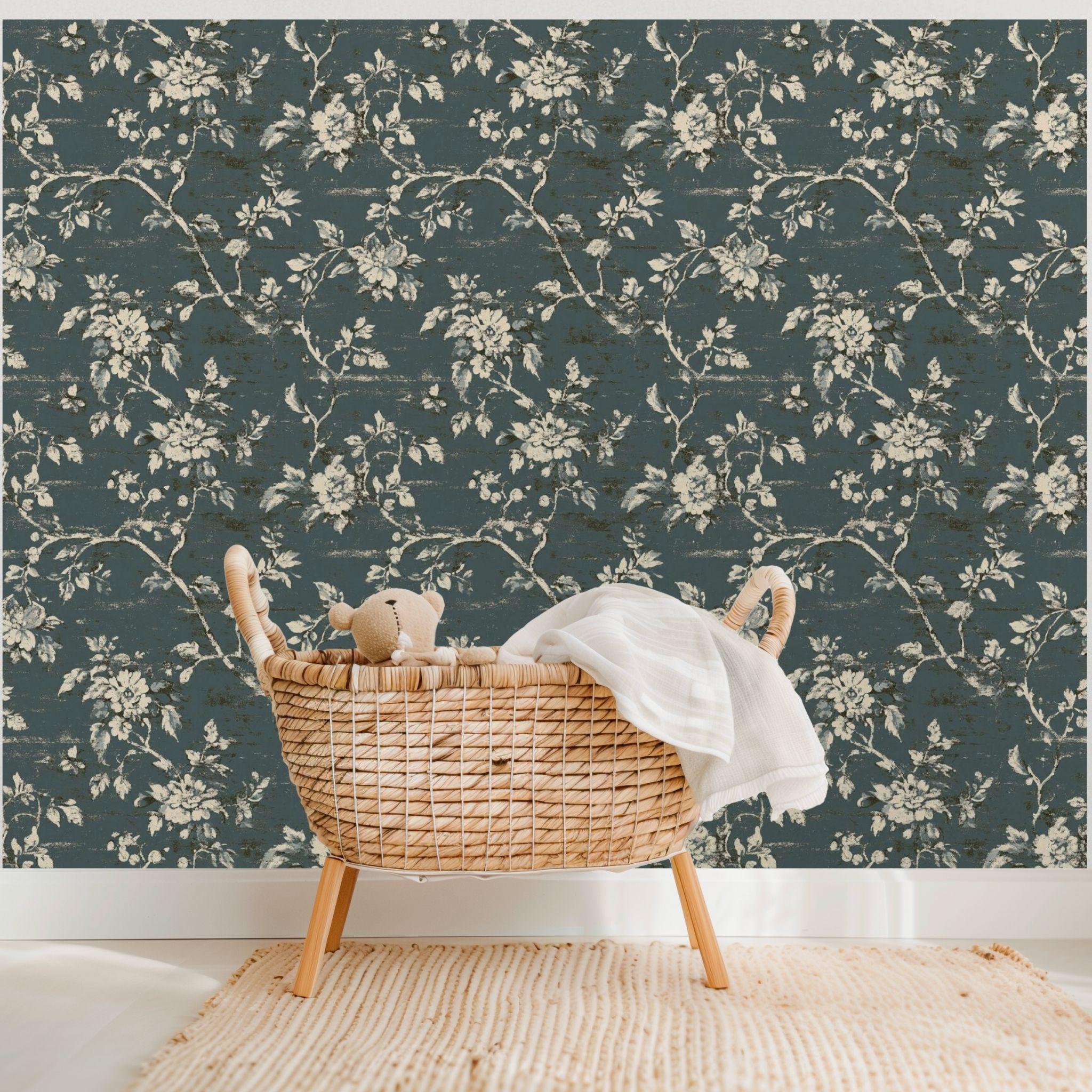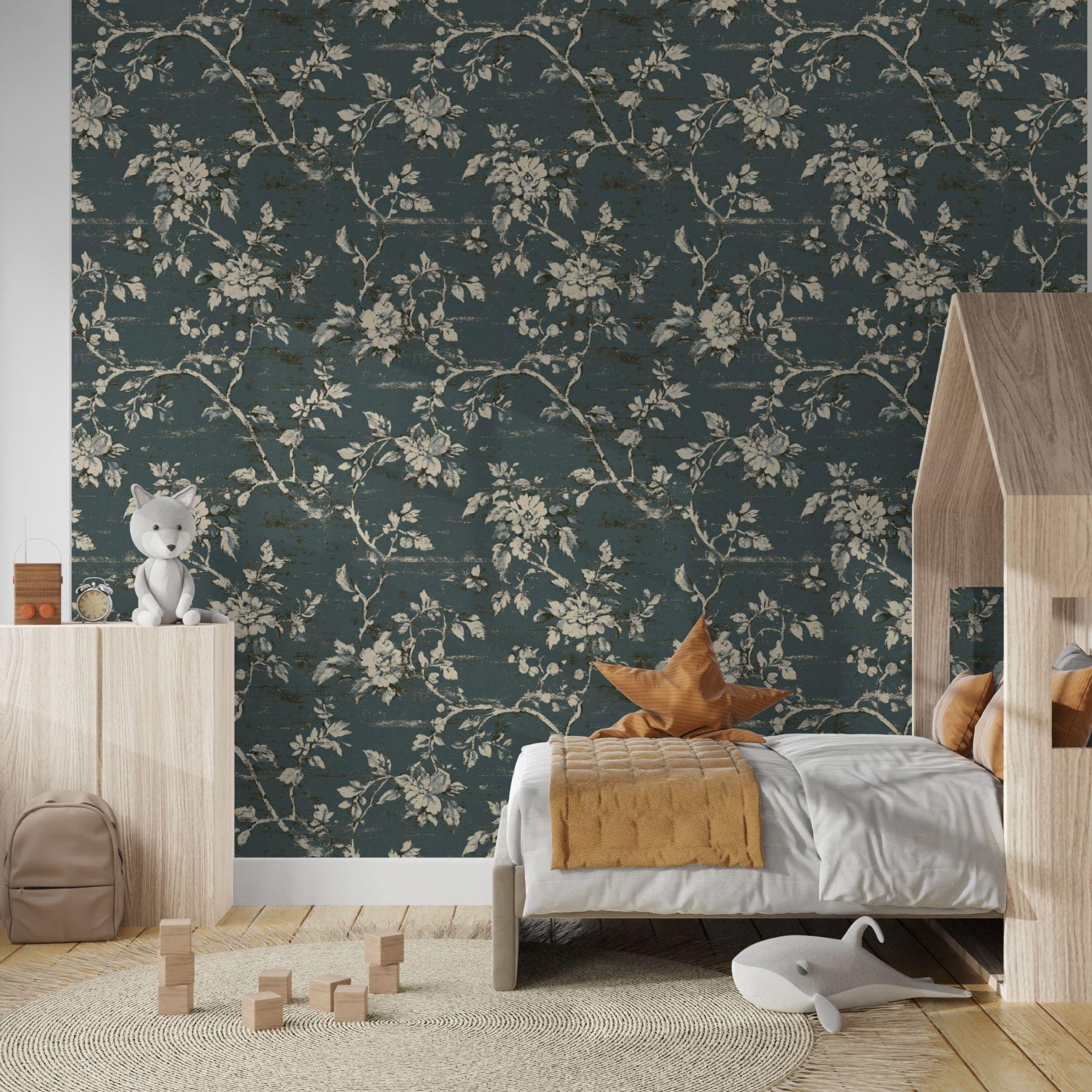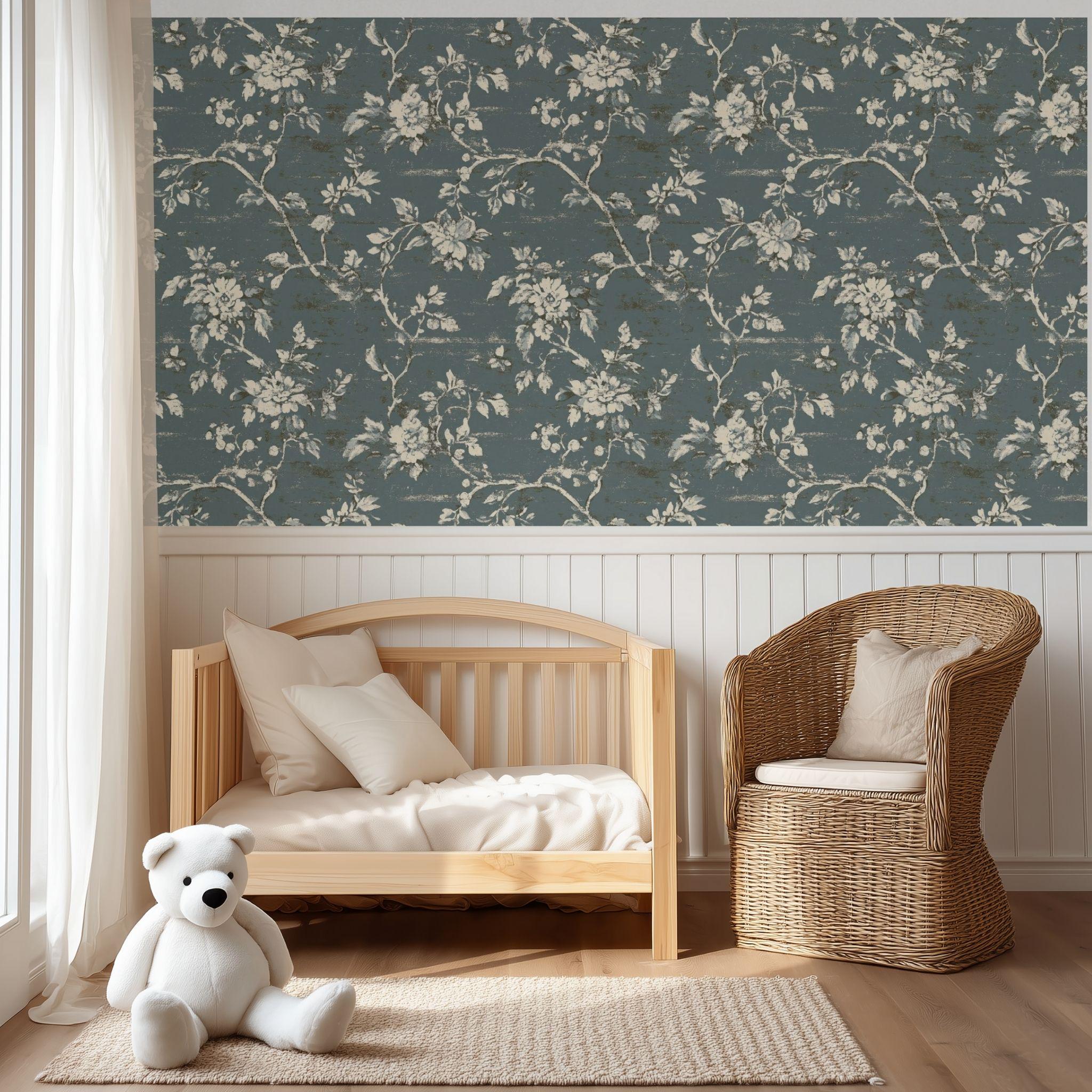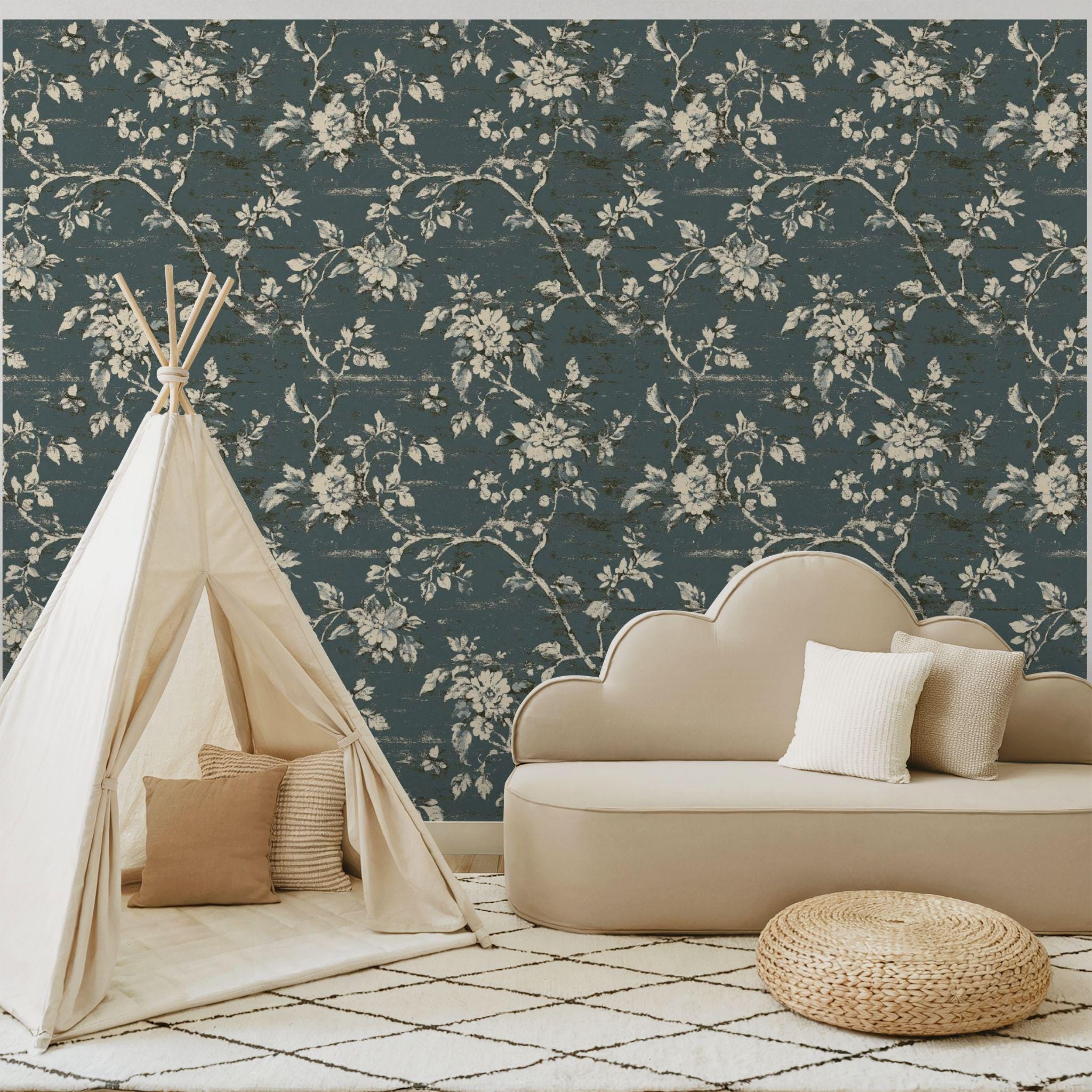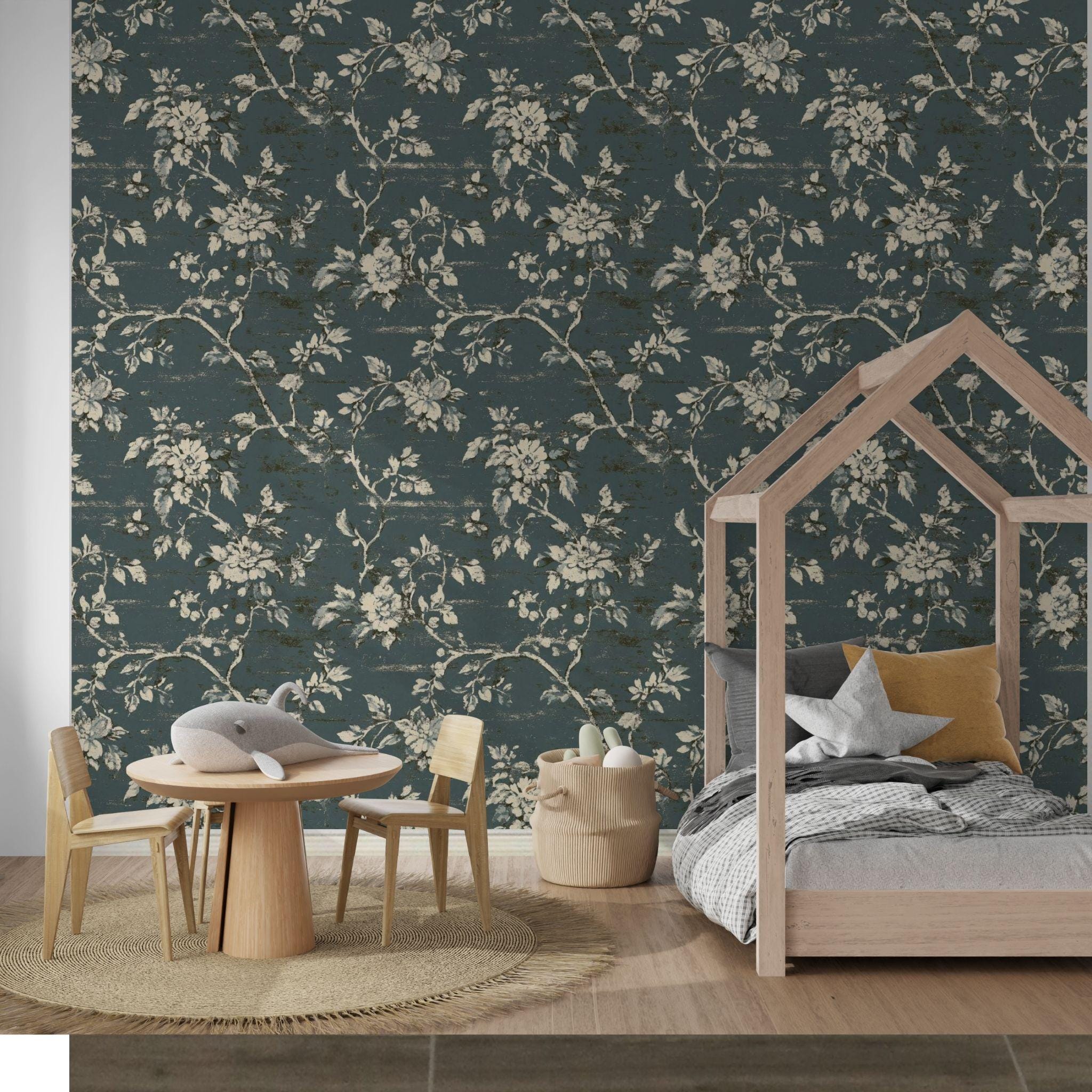 A vintage-inspired floral wallpaper in deep slate blue with soft cream blooms and a beautifully weathered finish. This design brings an elegant, timeworn charm that feels both classic and comforting. Perfect for creating a warm, sophisticated statement wall in bedrooms, nurseries, or creative spaces.