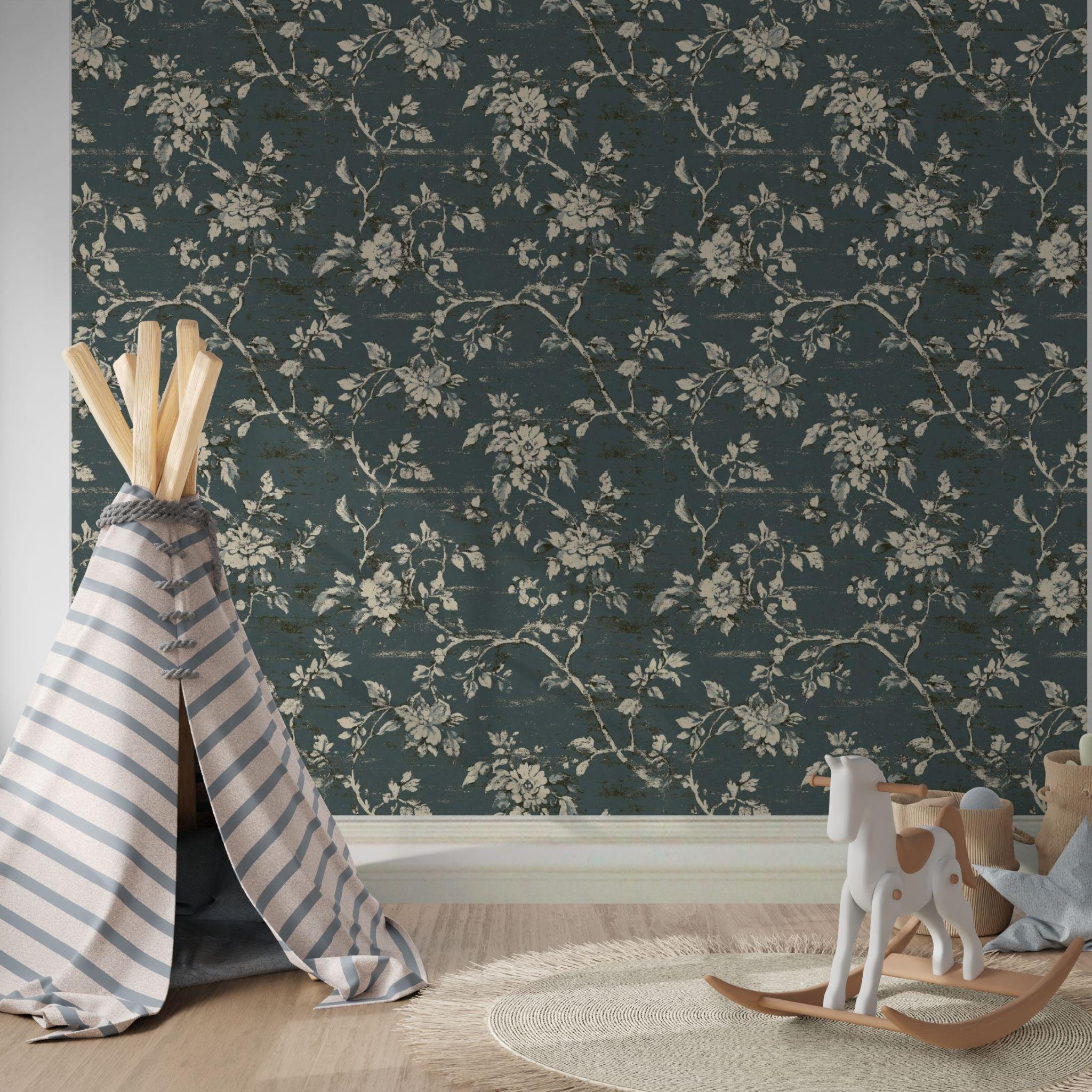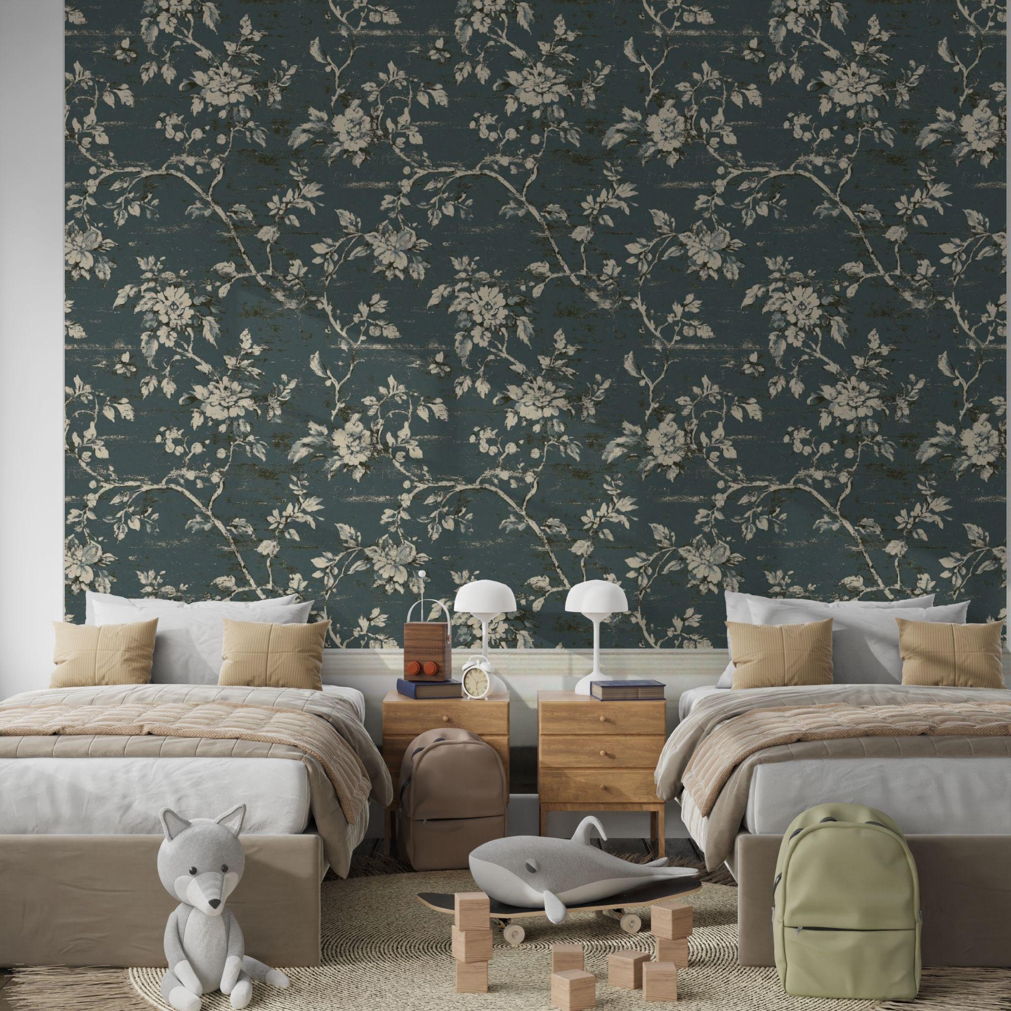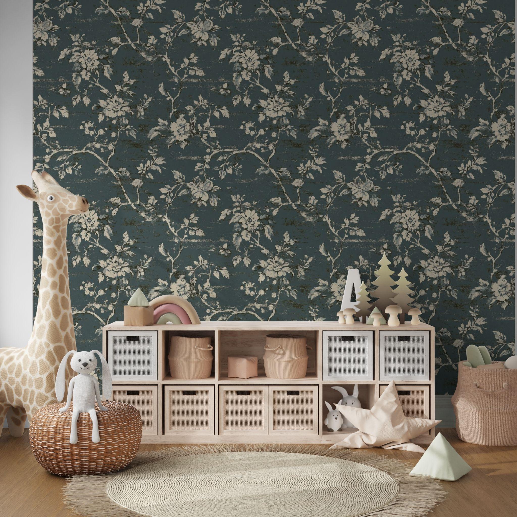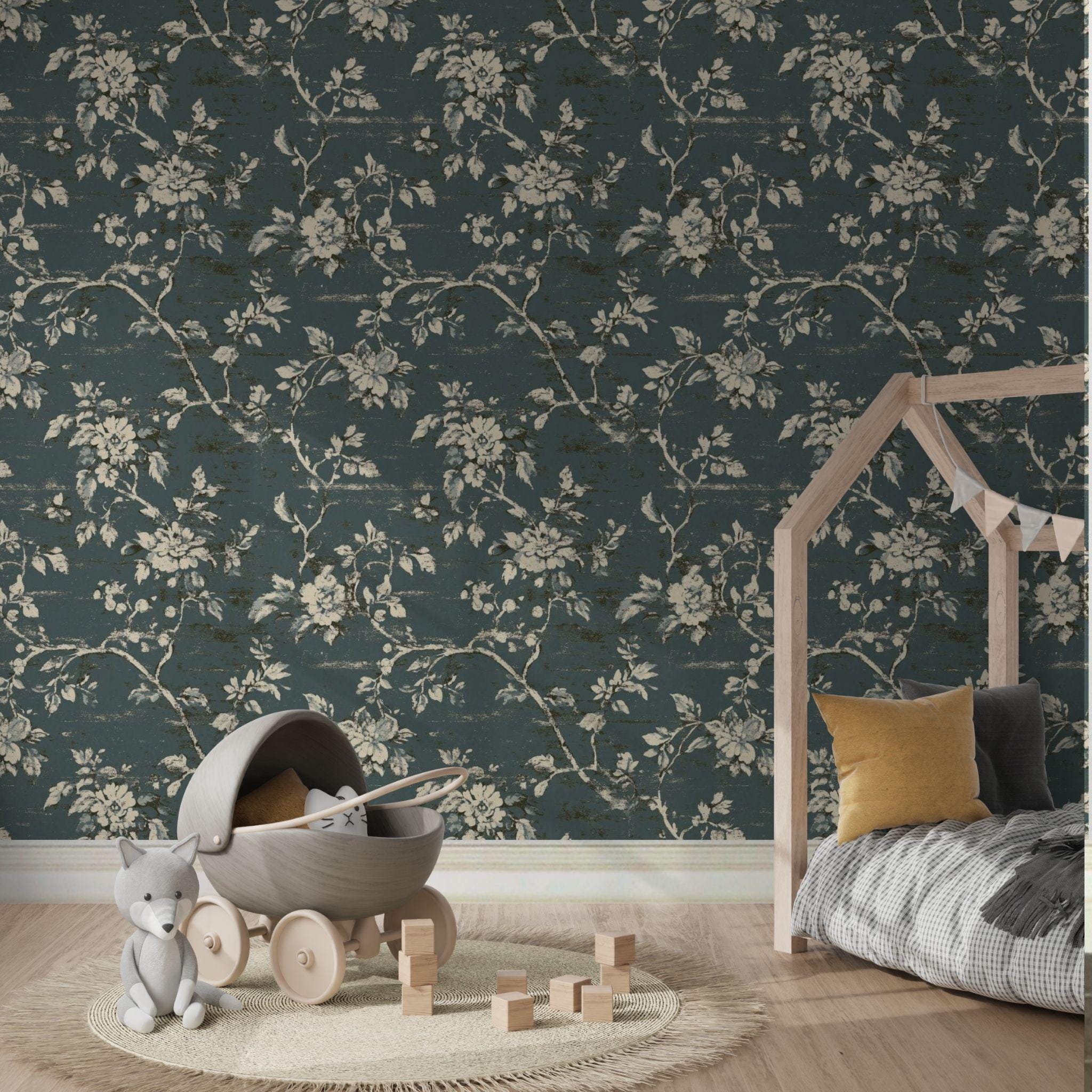 A vintage-inspired floral wallpaper in deep slate blue with soft cream blooms and a beautifully weathered finish. This design brings an elegant, timeworn charm that feels both classic and comforting. Perfect for creating a warm, sophisticated statement wall in bedrooms, nurseries, or creative spaces.