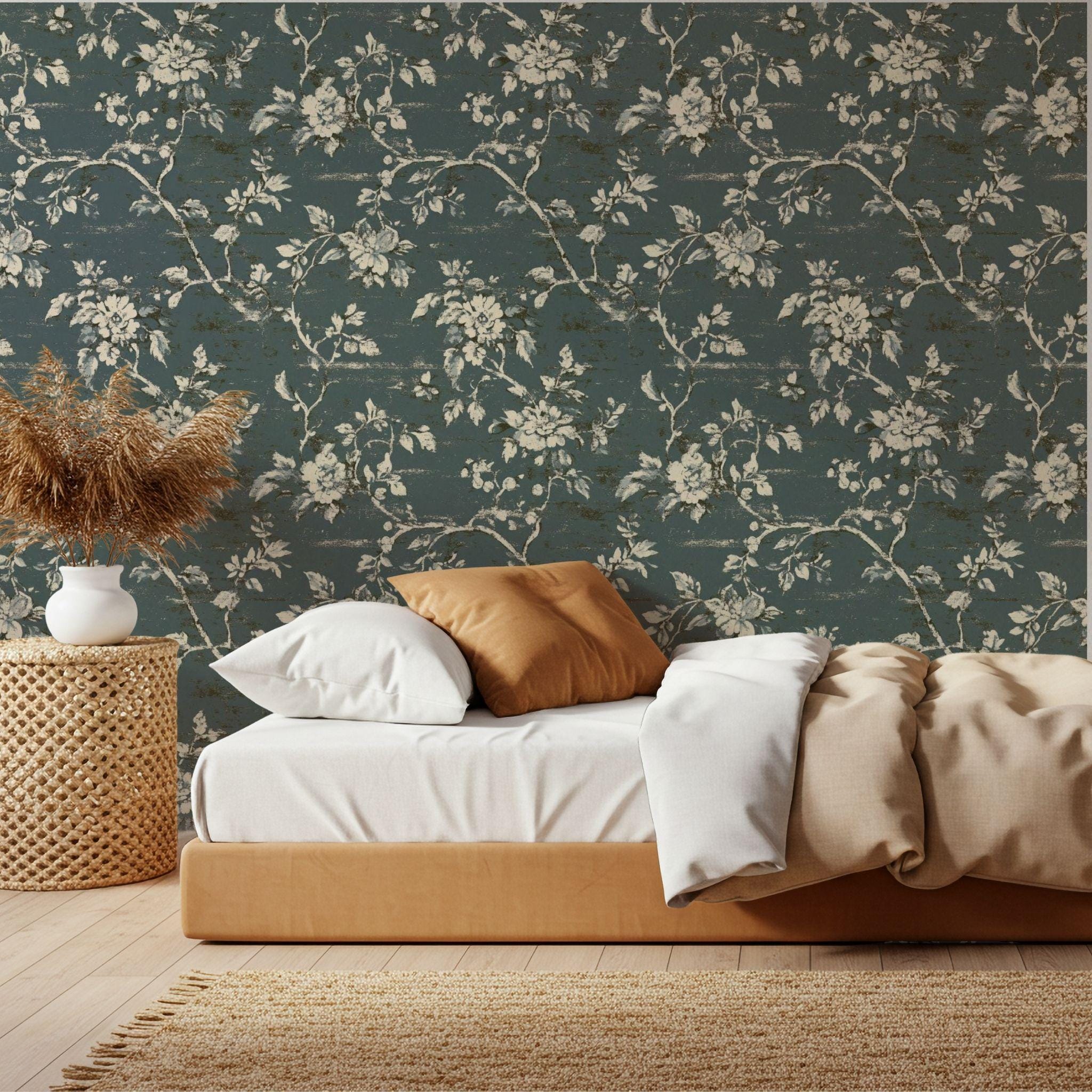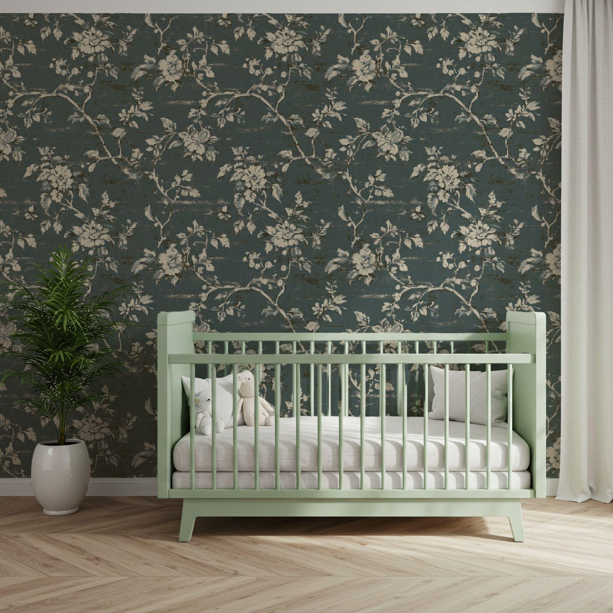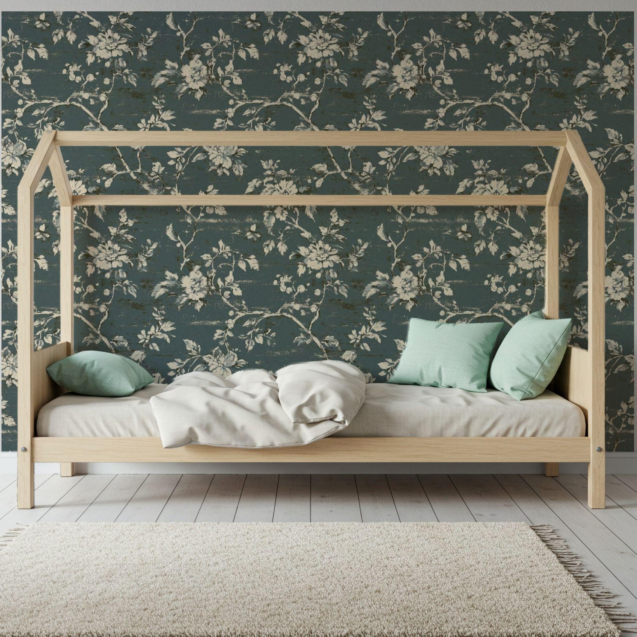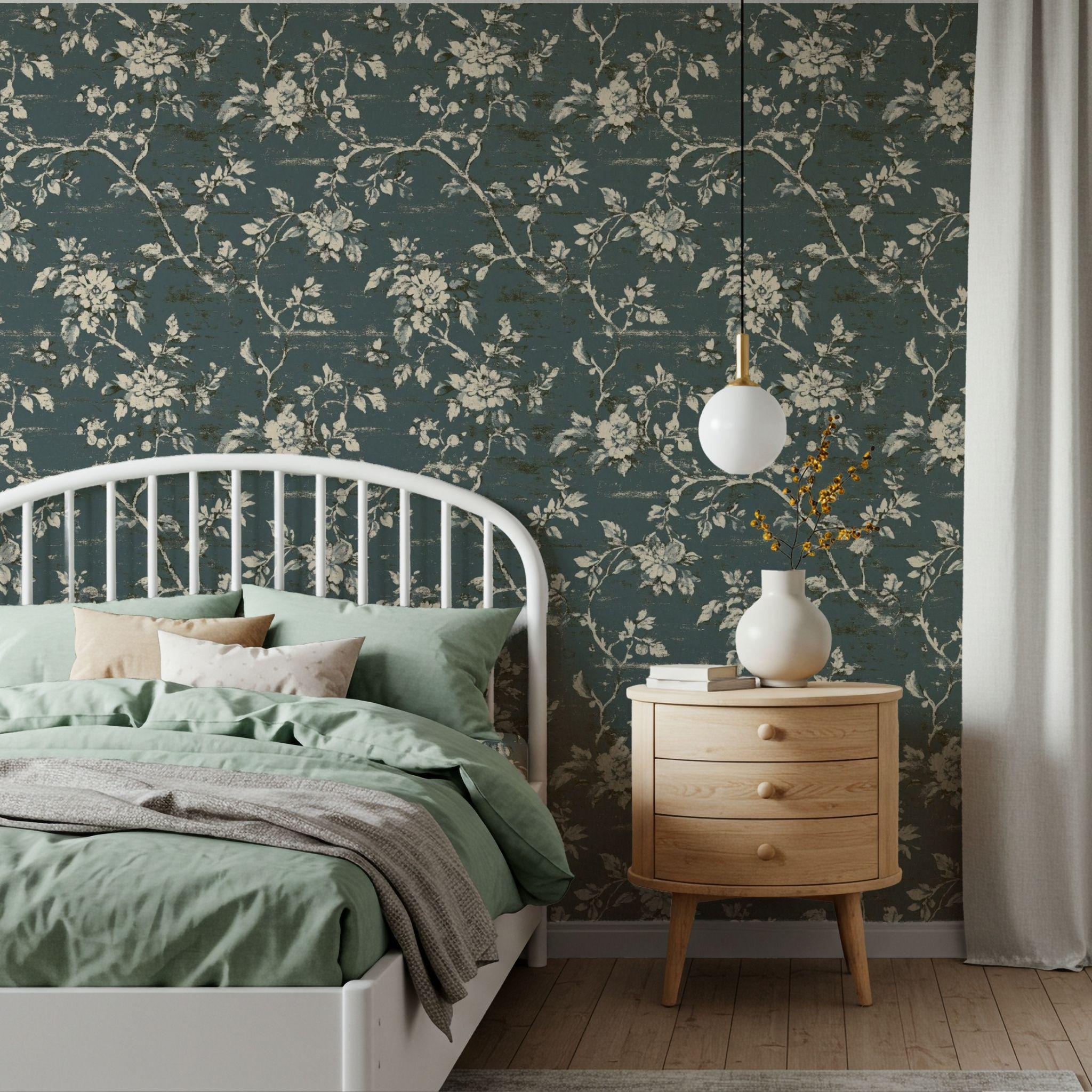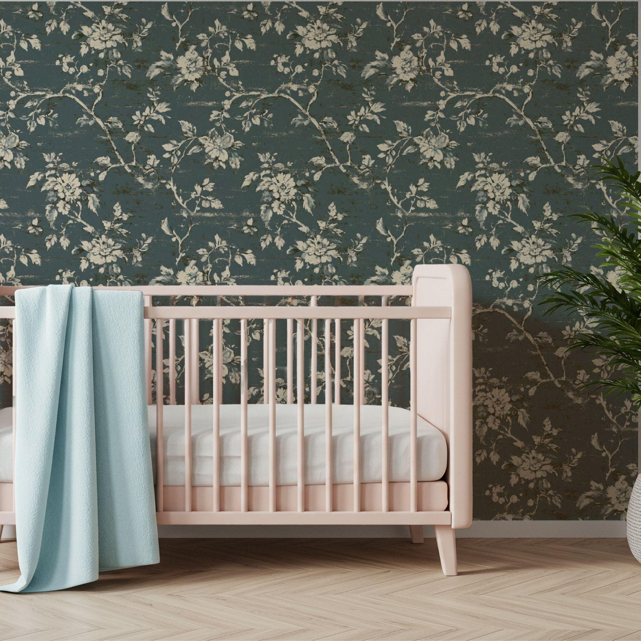 A vintage-inspired floral wallpaper in deep slate blue with soft cream blooms and a beautifully weathered finish. This design brings an elegant, timeworn charm that feels both classic and comforting. Perfect for creating a warm, sophisticated statement wall in bedrooms, nurseries, or creative spaces.