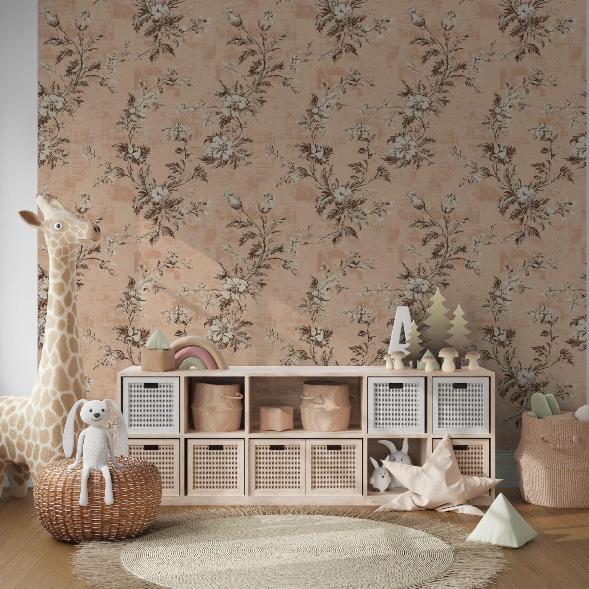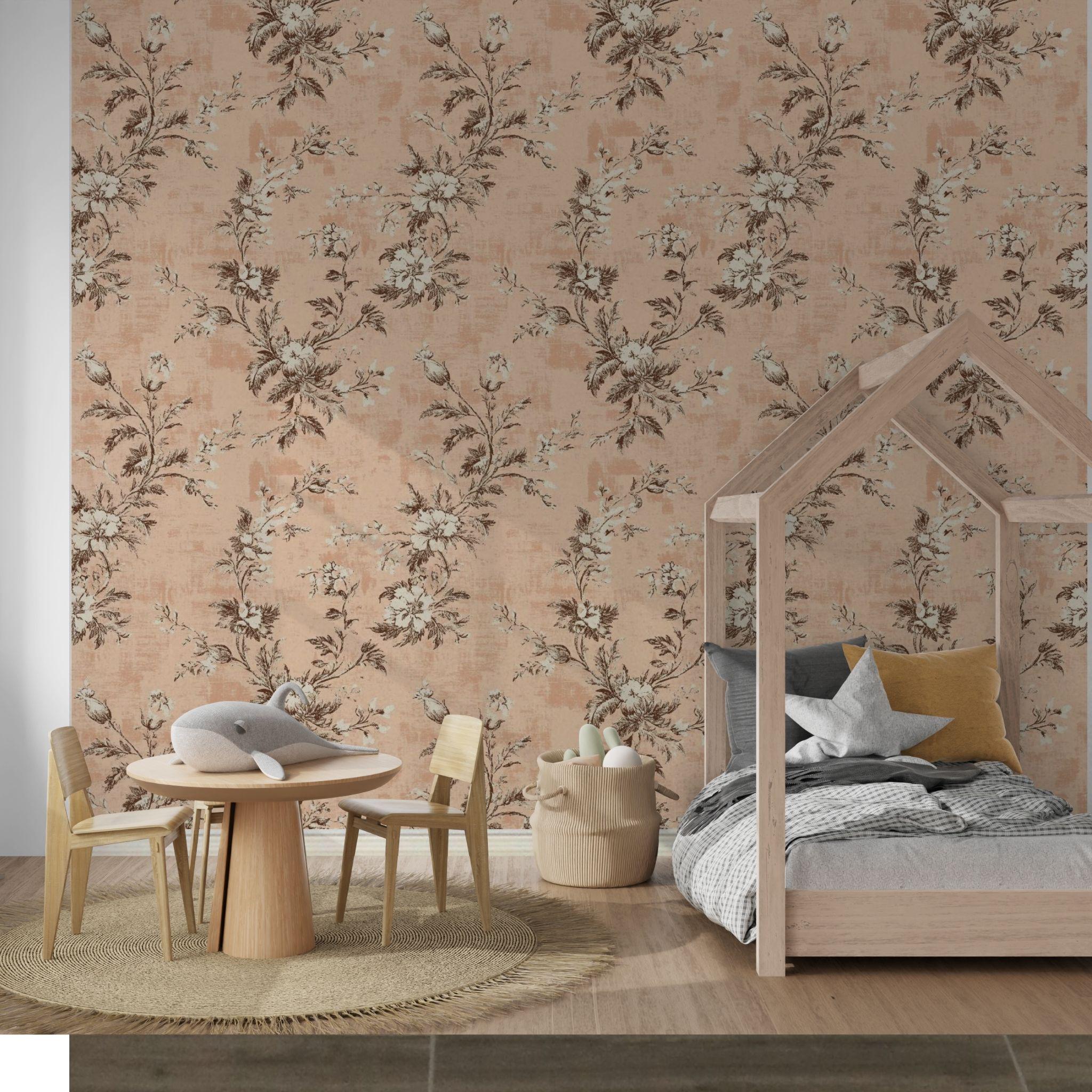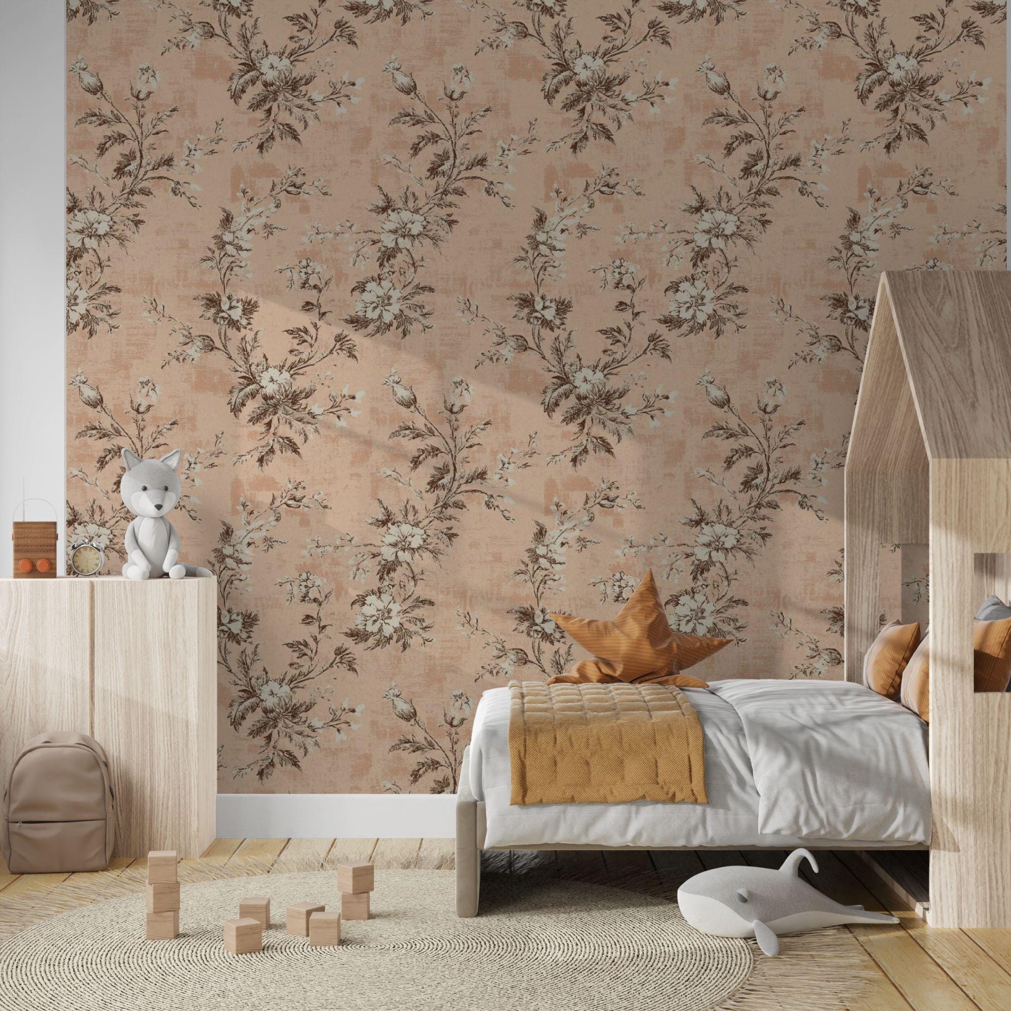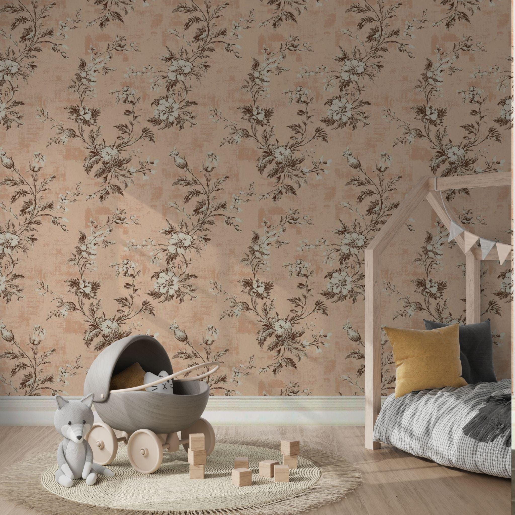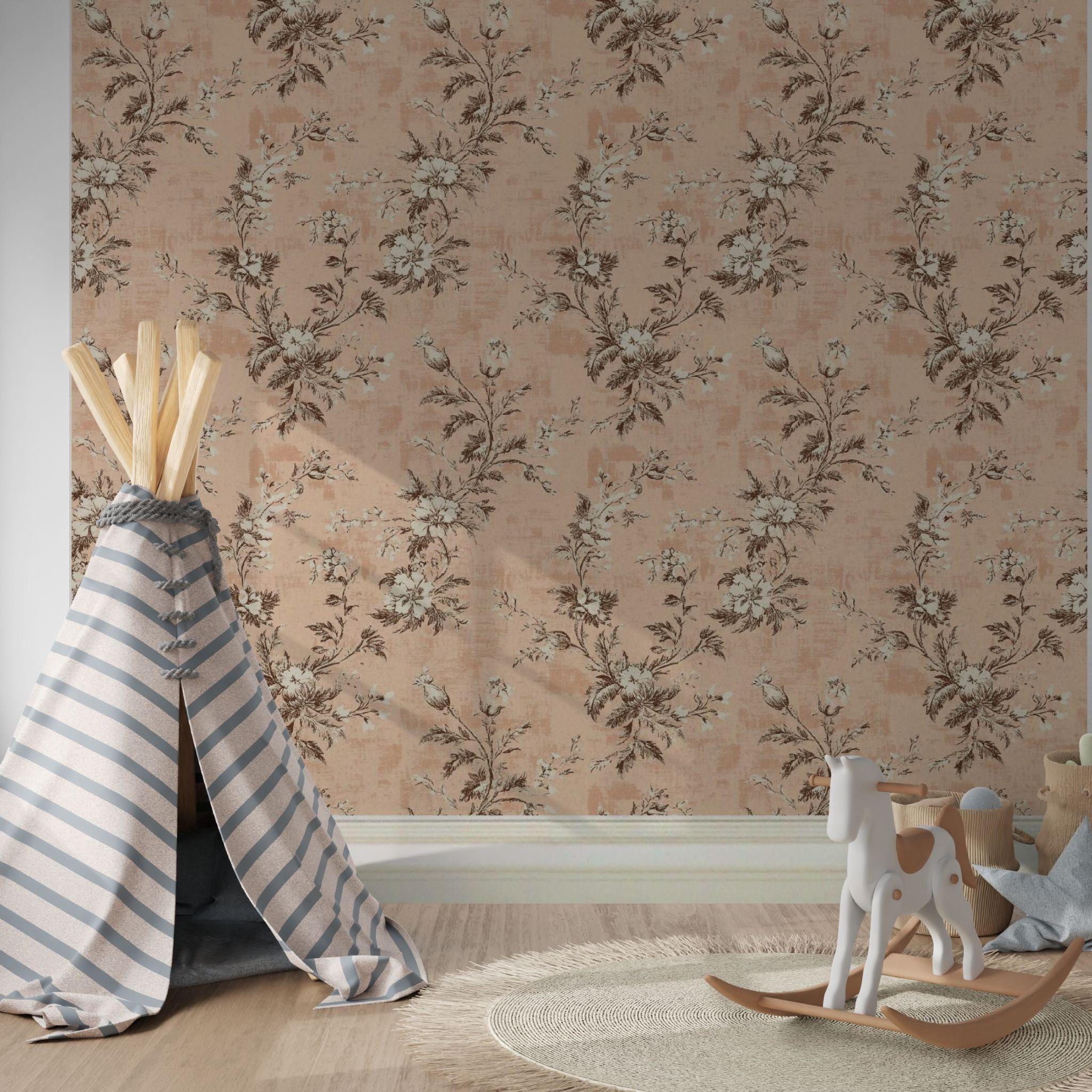 A romantic vintage-inspired wallpaper featuring delicate blooms in warm terracotta and cream tones. The softly distressed texture gives it a time-worn, linen-washed feel — perfect for creating a cozy, heirloom look in nurseries, bedrooms, or reading nooks. Designed to bring quiet elegance and warmth to any space.