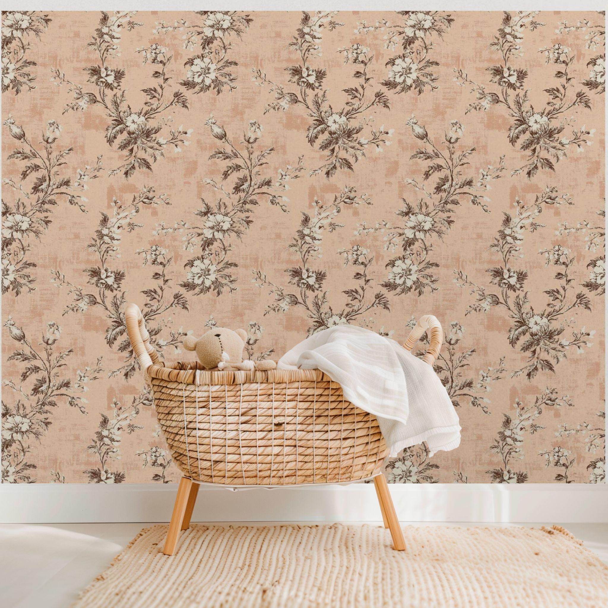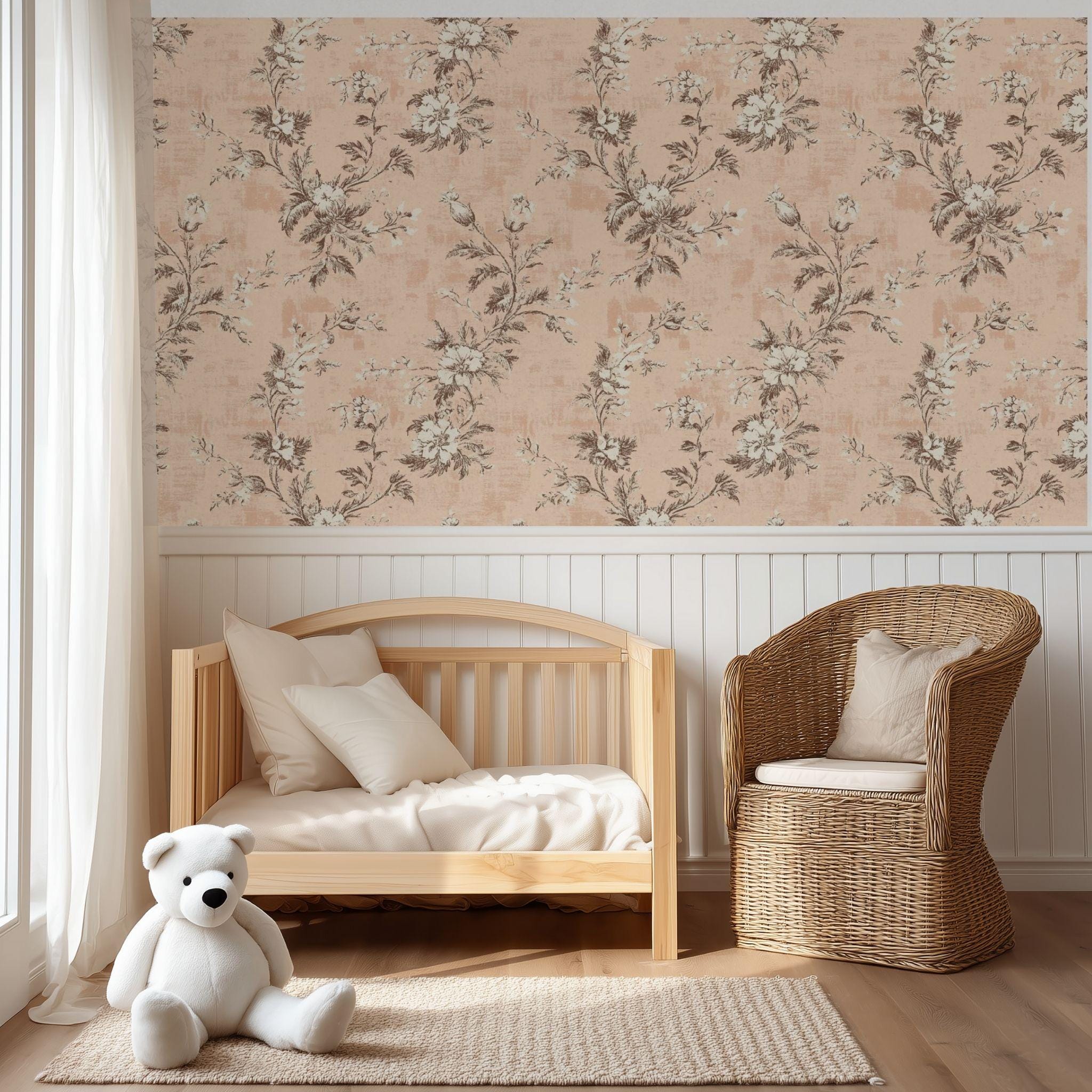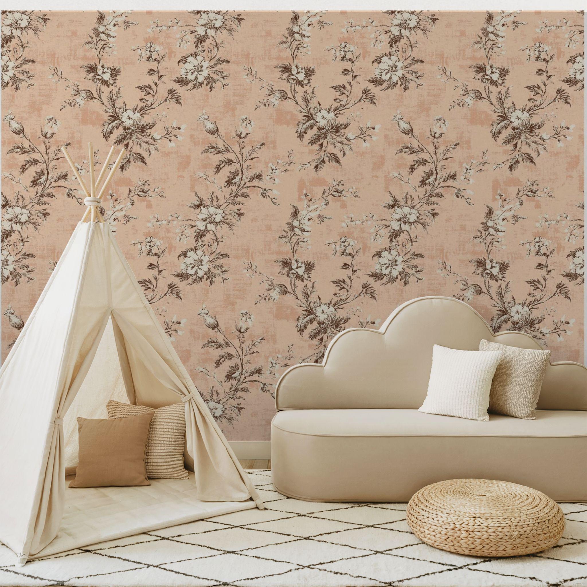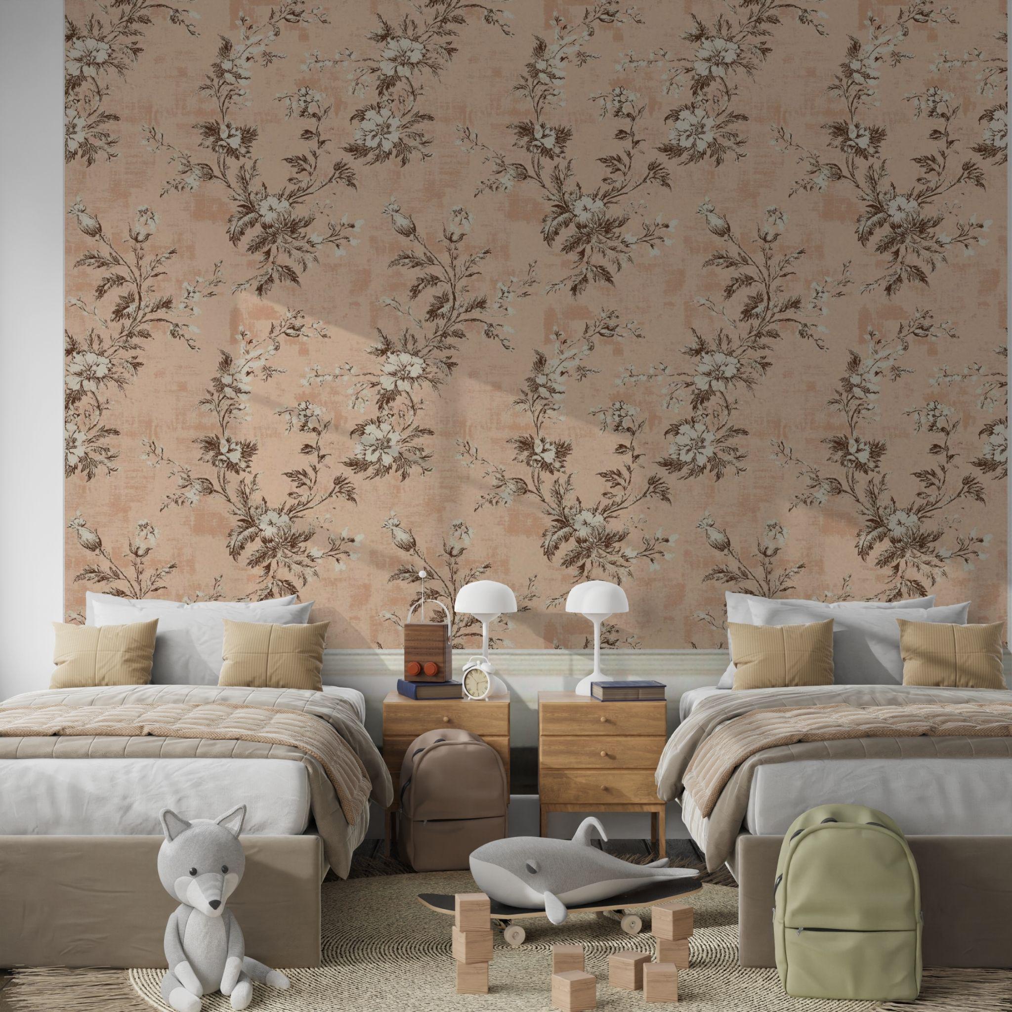 A romantic vintage-inspired wallpaper featuring delicate blooms in warm terracotta and cream tones. The softly distressed texture gives it a time-worn, linen-washed feel — perfect for creating a cozy, heirloom look in nurseries, bedrooms, or reading nooks. Designed to bring quiet elegance and warmth to any space.