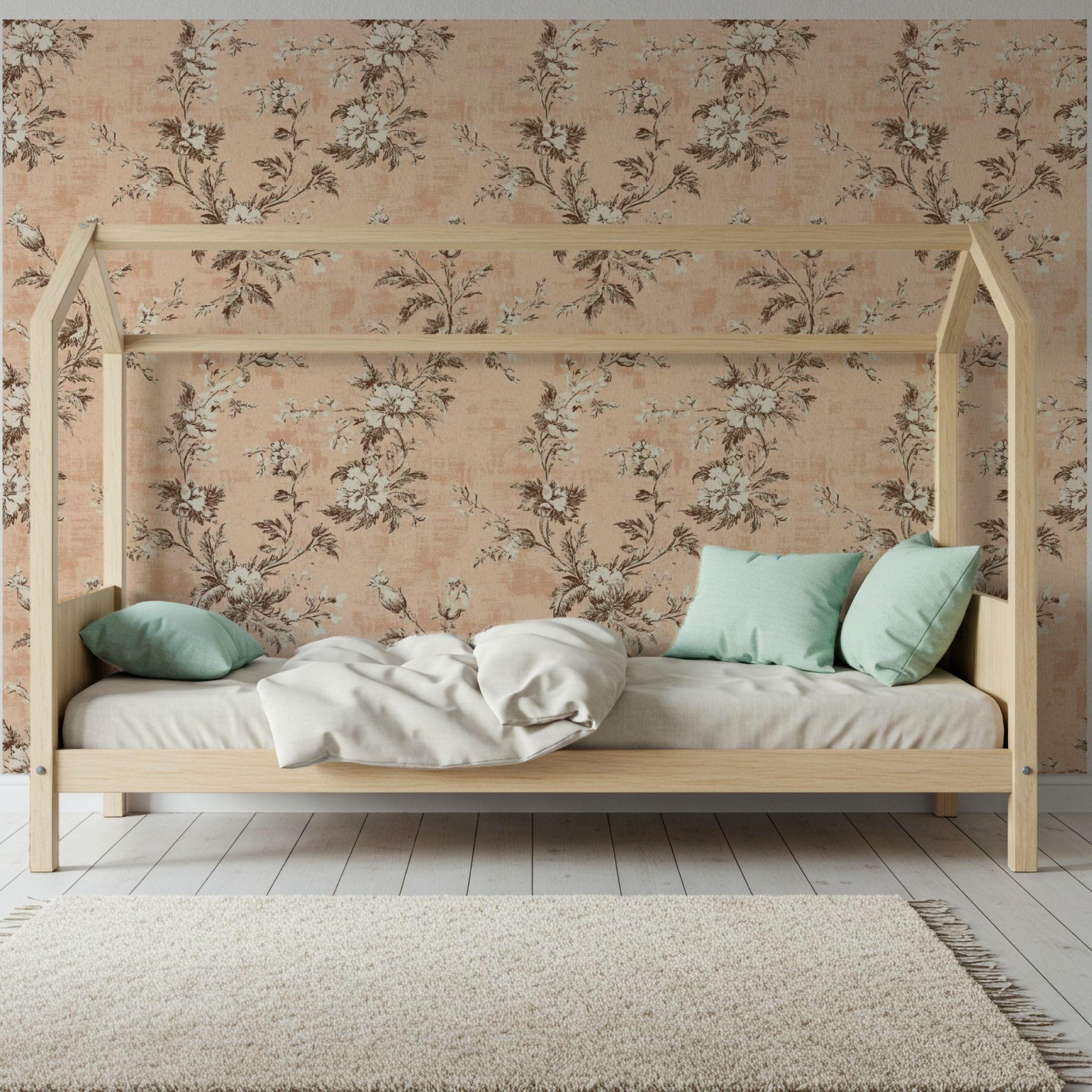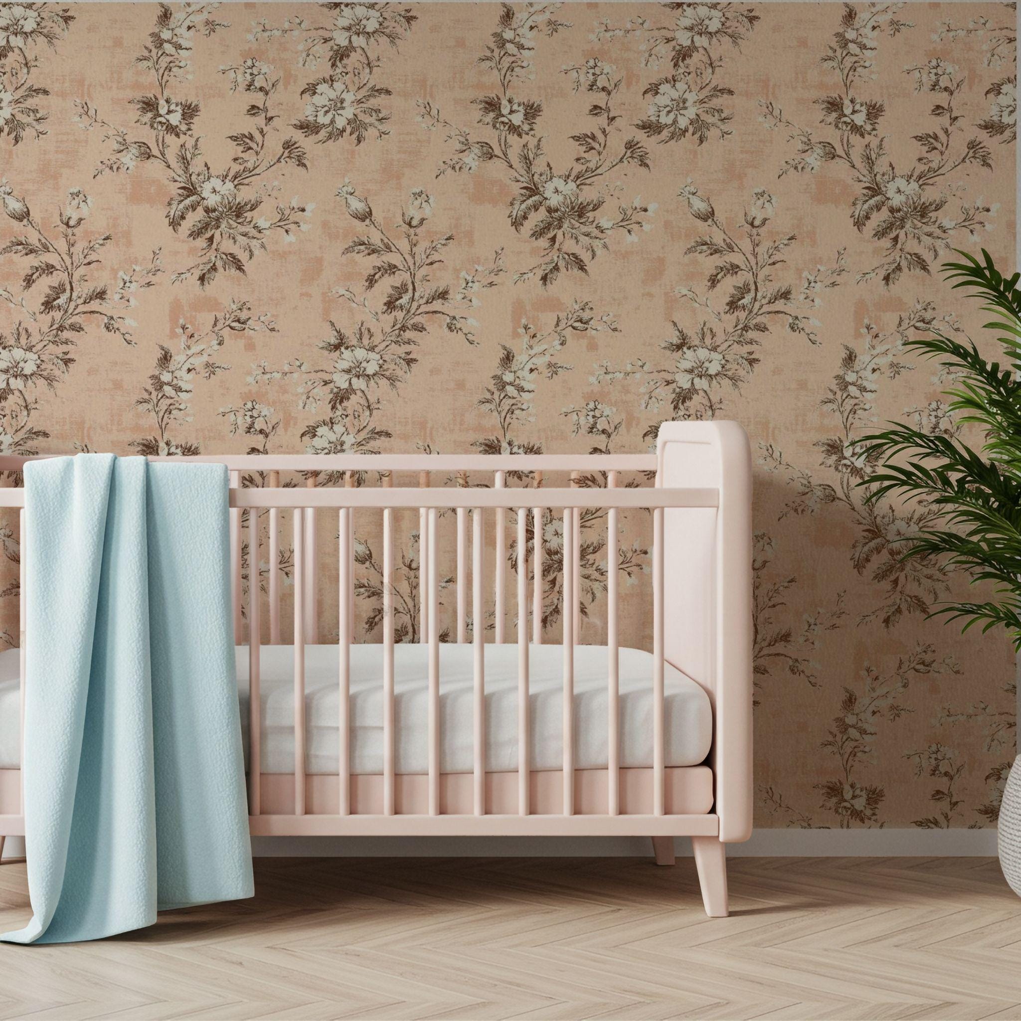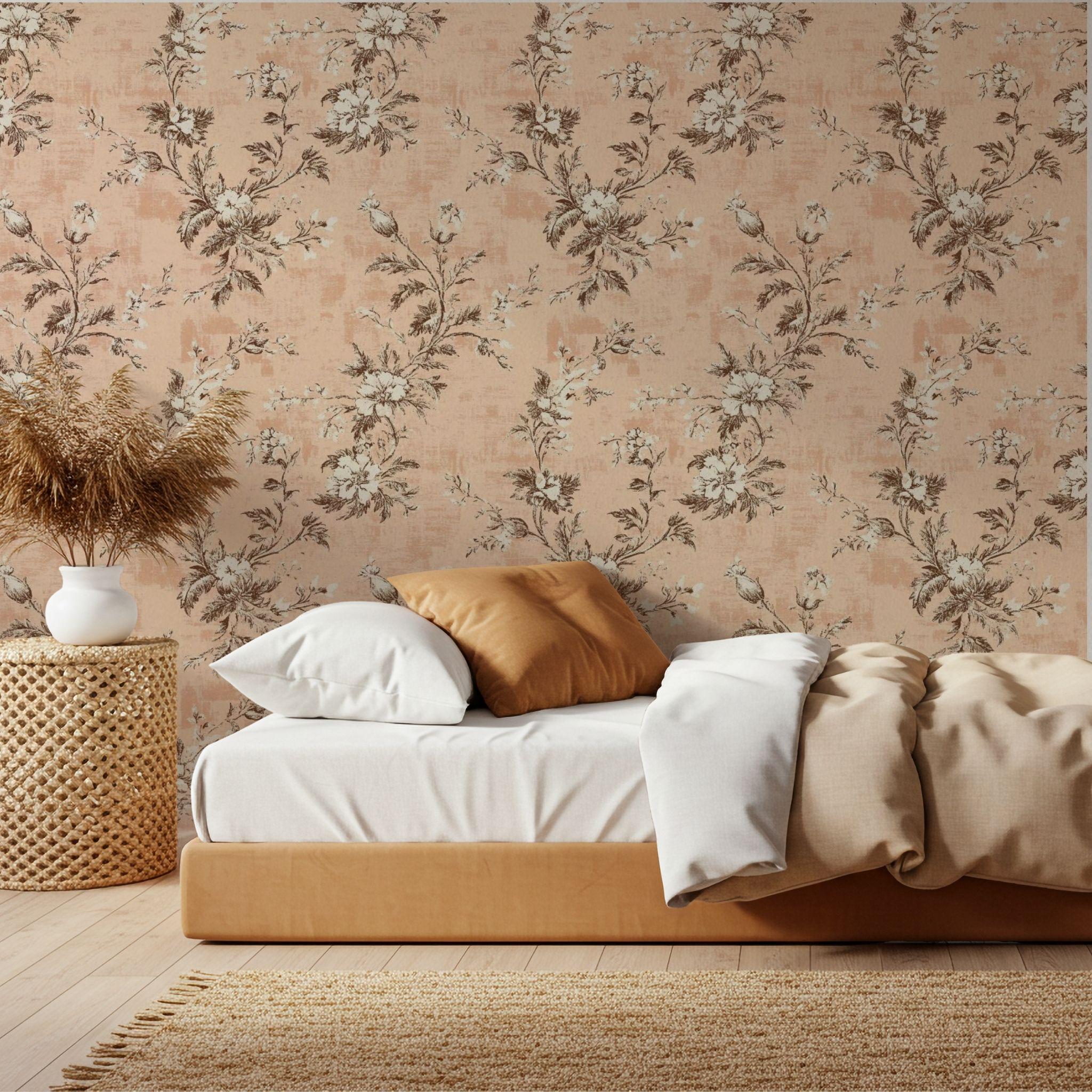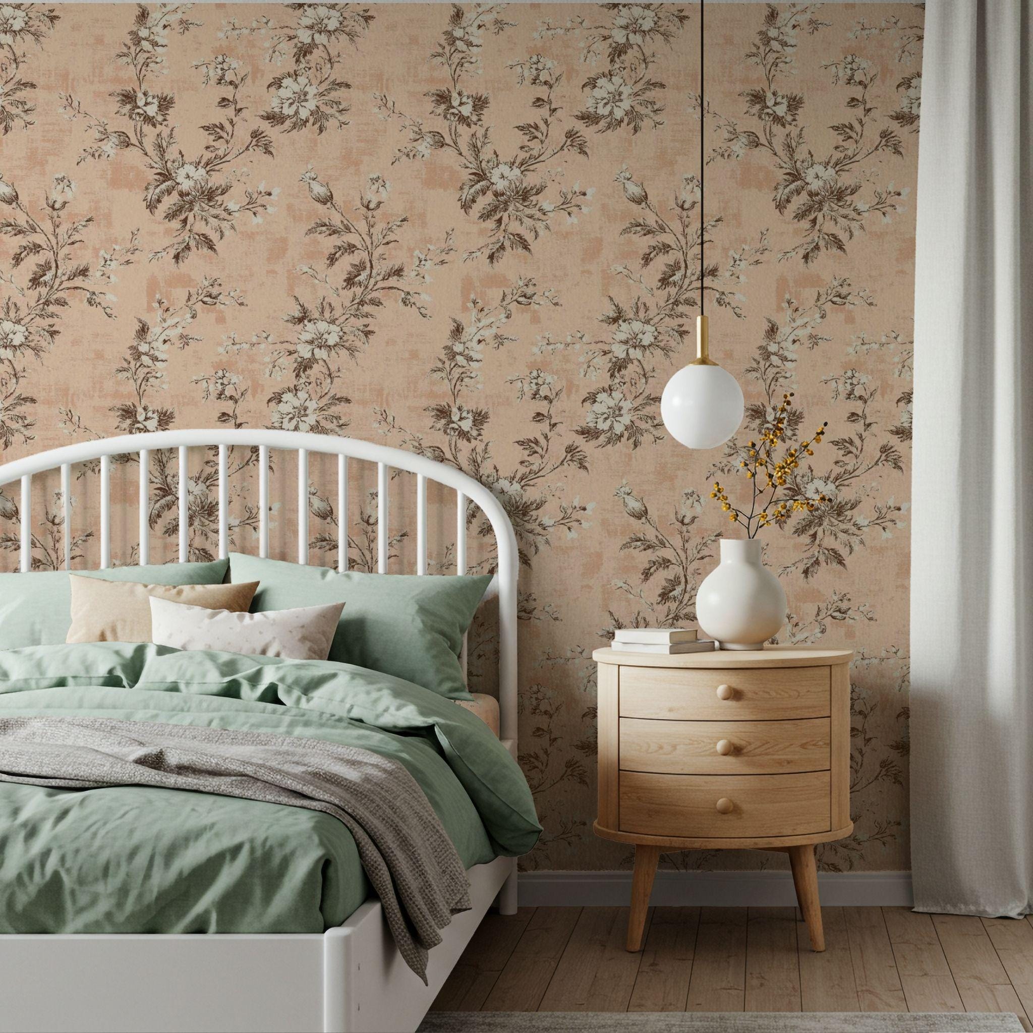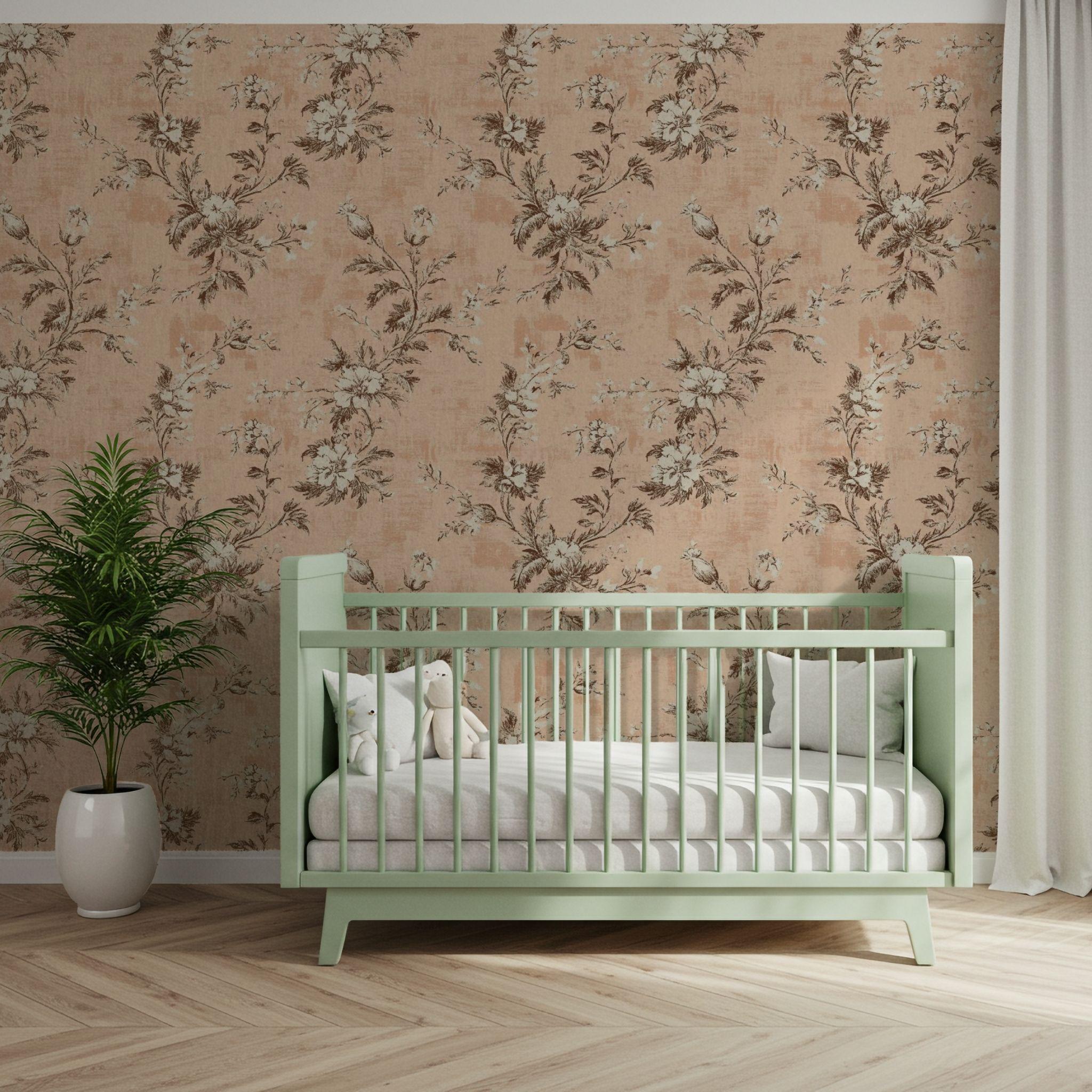 A romantic vintage-inspired wallpaper featuring delicate blooms in warm terracotta and cream tones. The softly distressed texture gives it a time-worn, linen-washed feel — perfect for creating a cozy, heirloom look in nurseries, bedrooms, or reading nooks. Designed to bring quiet elegance and warmth to any space.