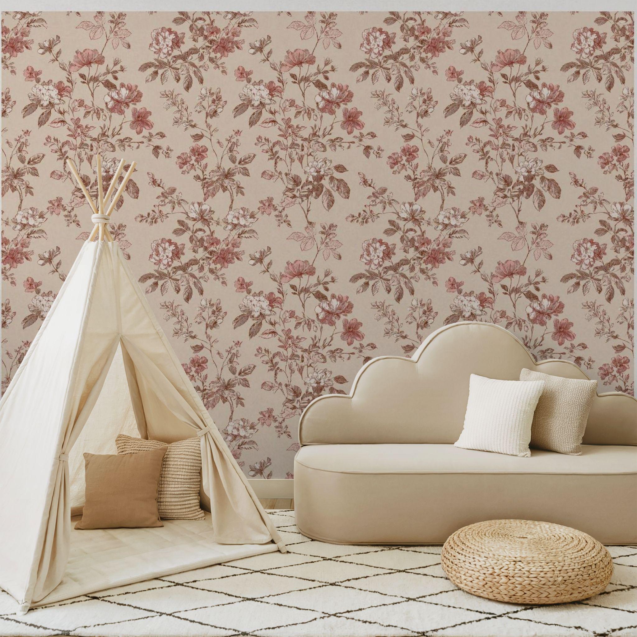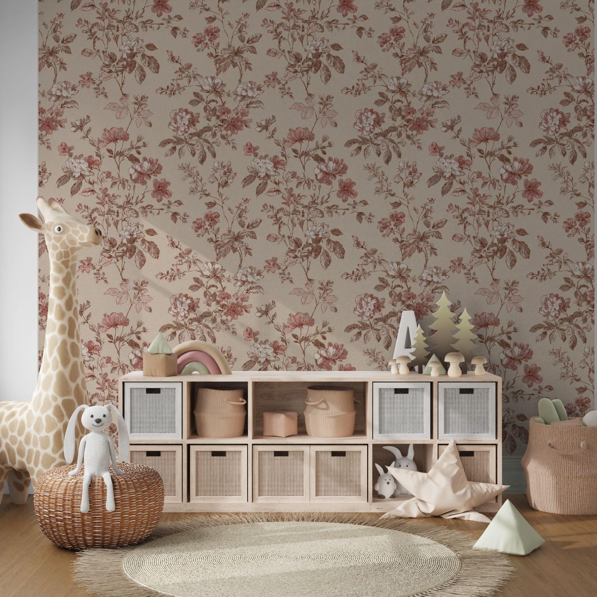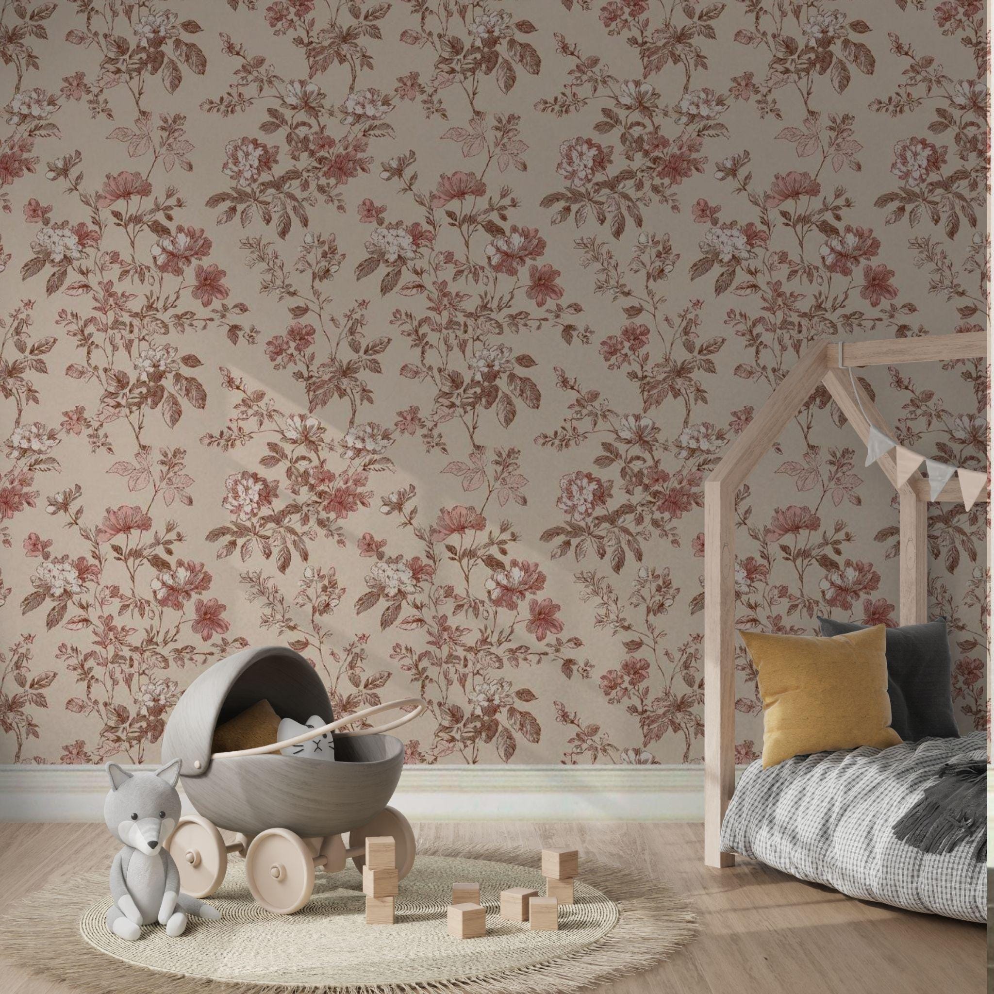 Bring timeless charm to your little one’s space with this vintage blush floral wallpaper. Featuring delicately sketched blooms in warm rose tones on a soft beige backdrop, this design captures the essence of quiet elegance and classic comfort. Perfect for nurseries, bedrooms, or play spaces, it blends a sense of heritage beauty with modern warmth—creating a peaceful, storybook atmosphere that feels both nostalgic and new.