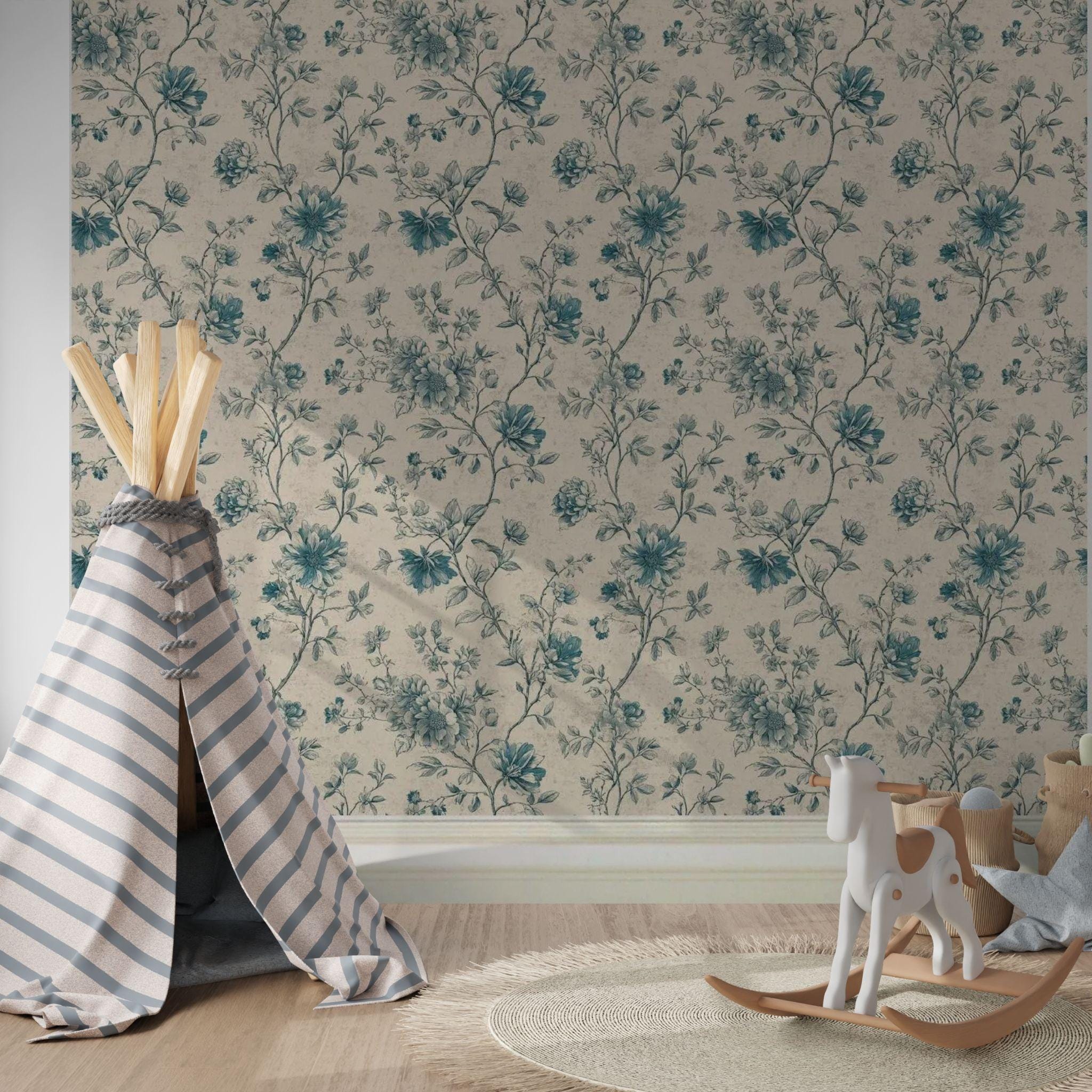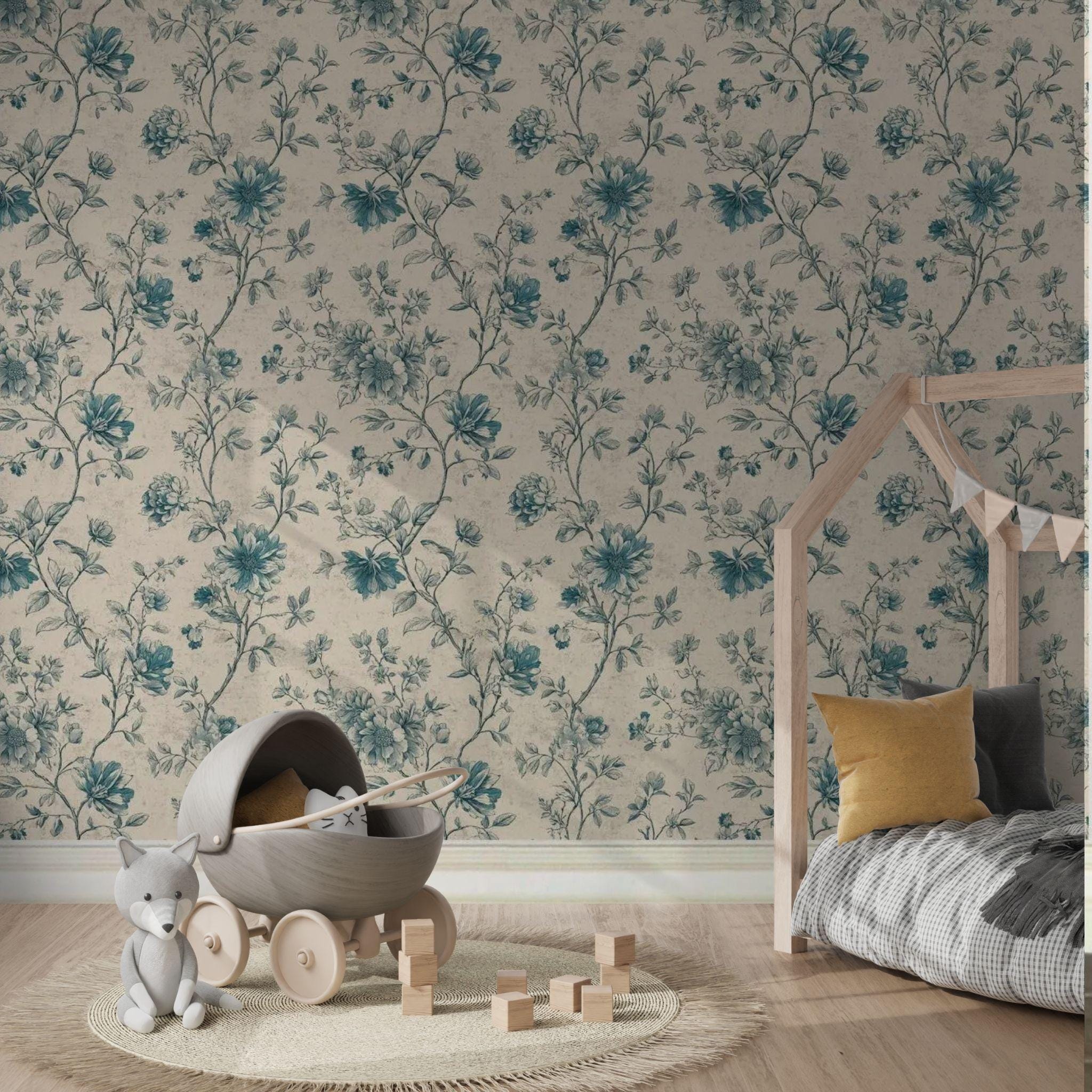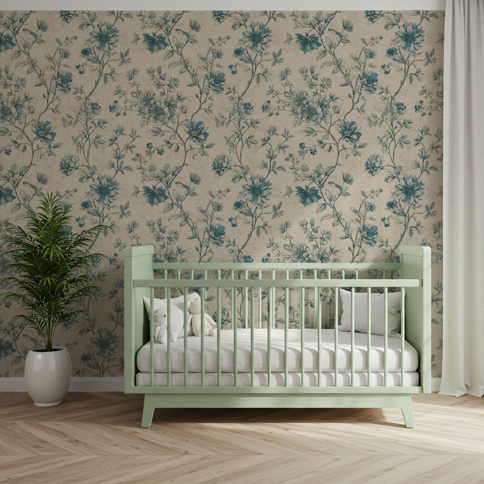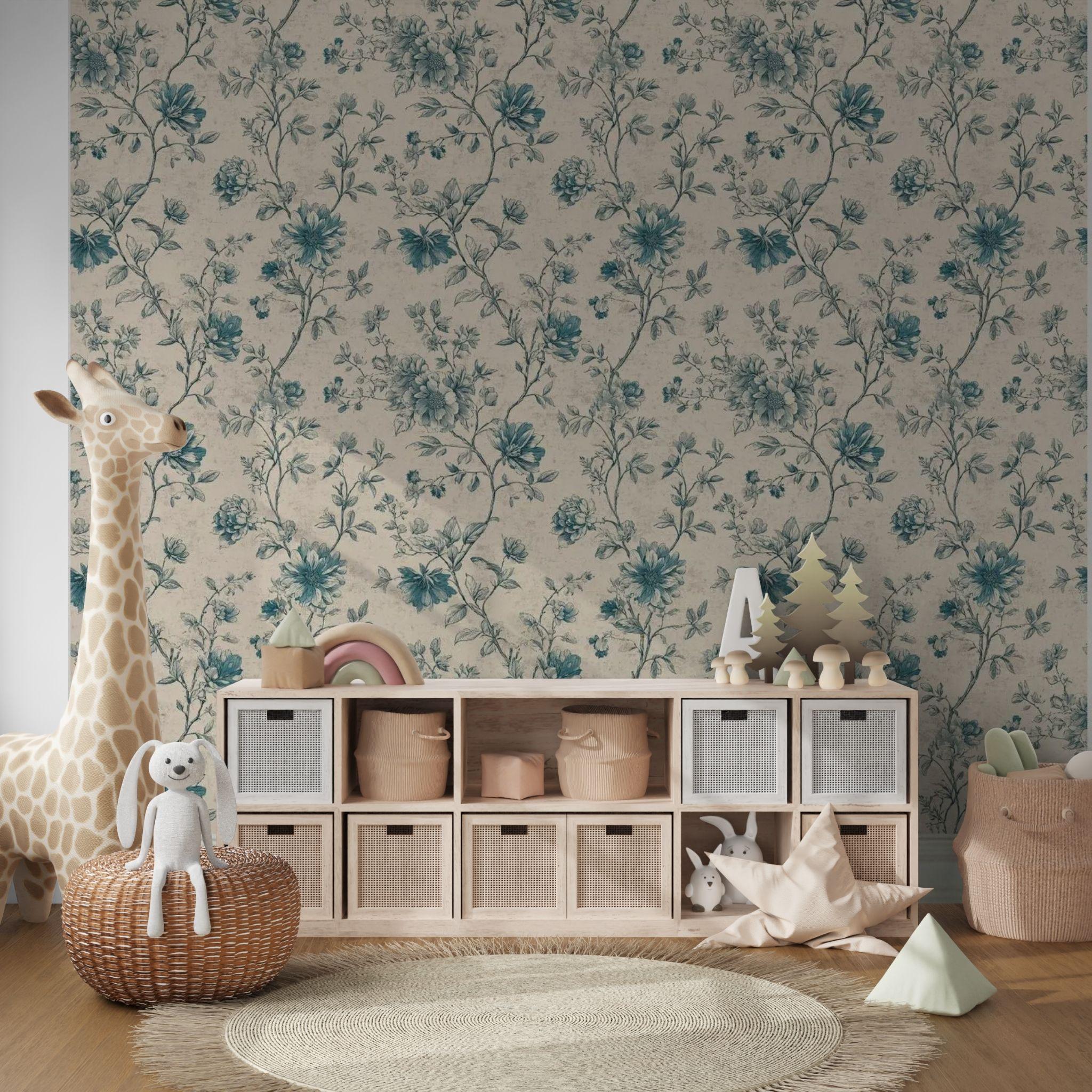 Transform your nursery into a peaceful vintage haven with this teal floral wallpaper. Featuring delicately illustrated blooms and climbing vines in soothing blue-green tones, this design blends antique charm with a soft modern palette. The gently weathered background adds depth and warmth, making it ideal for creating a cozy, timeless nursery or bedroom that feels effortlessly elegant and full of heart.
