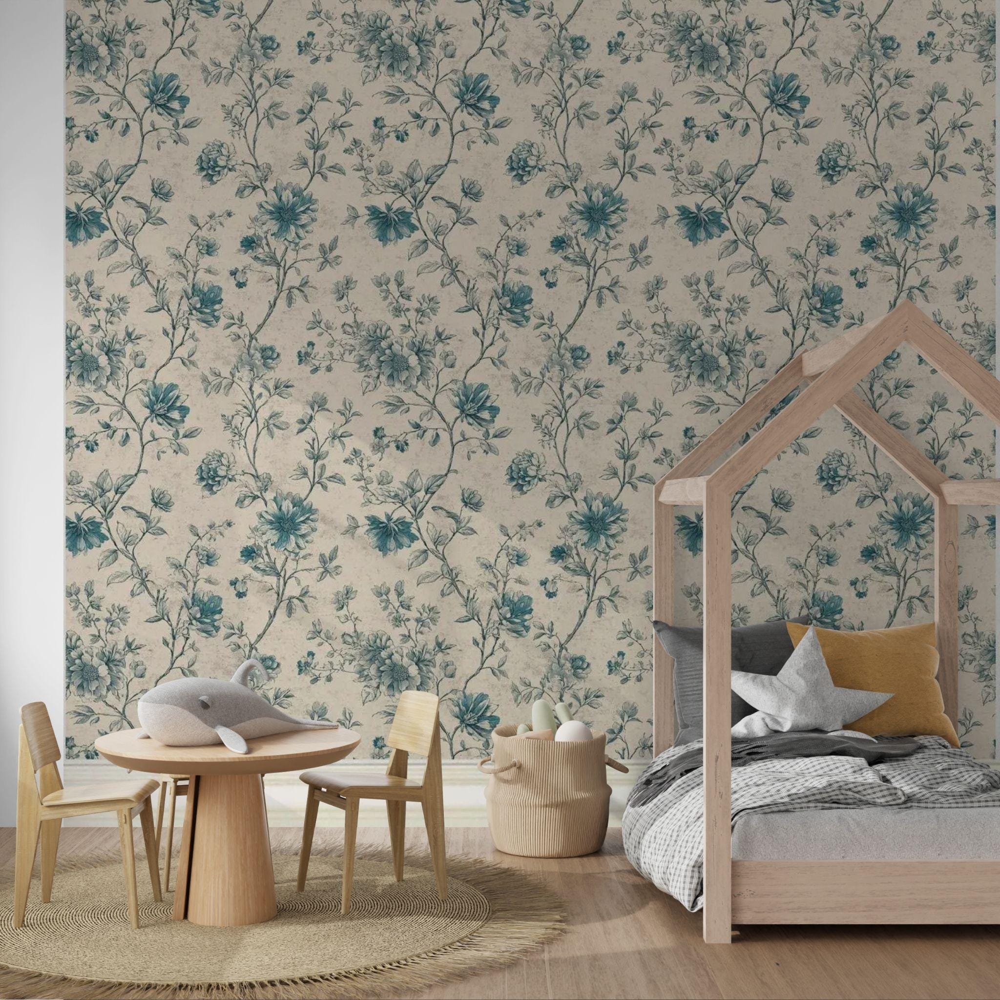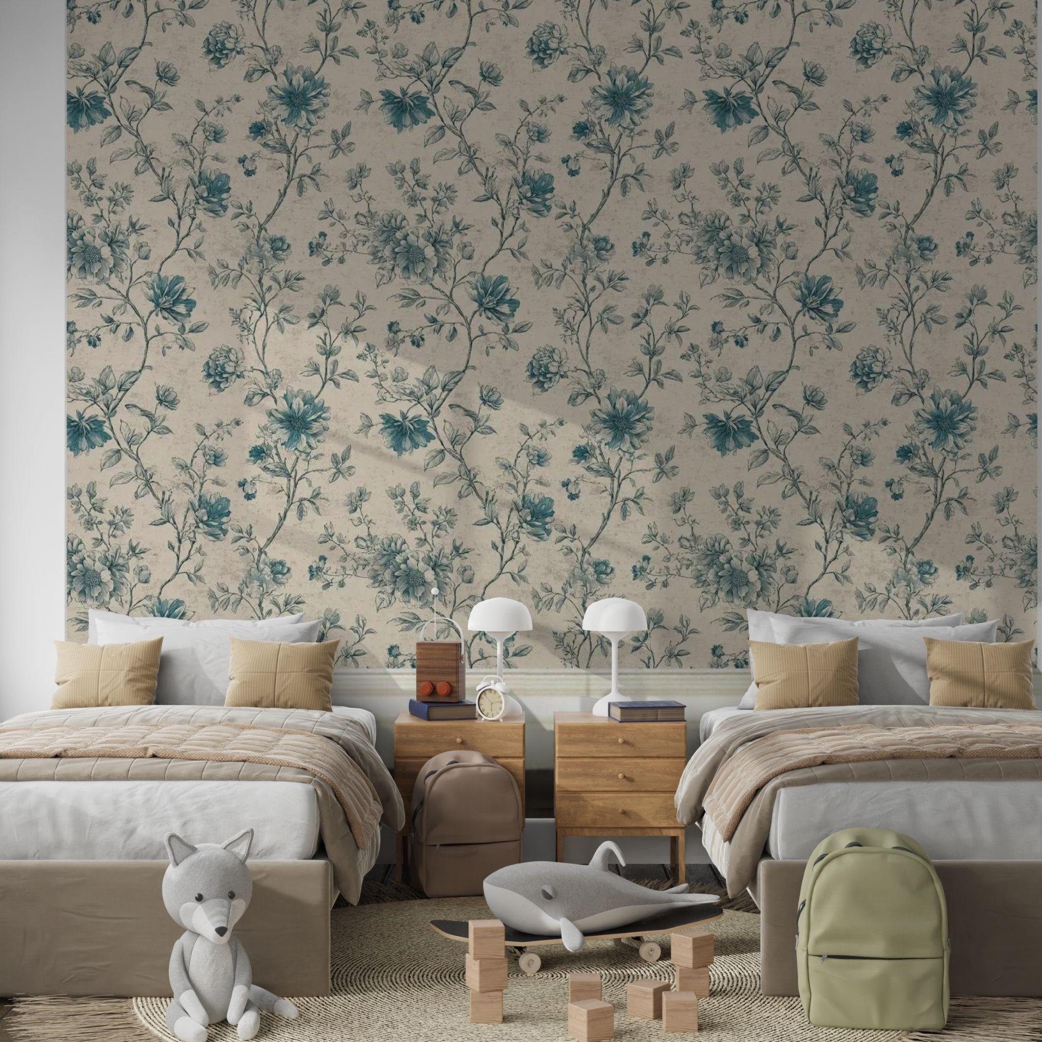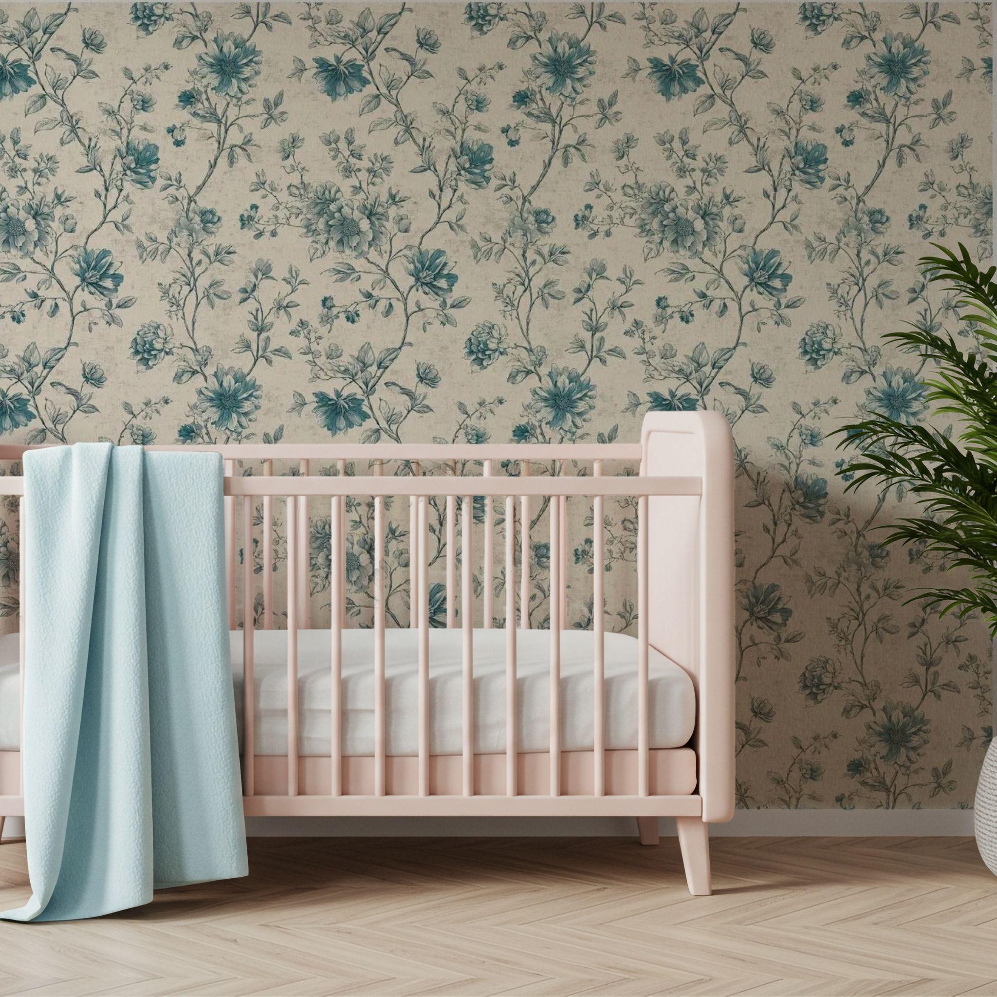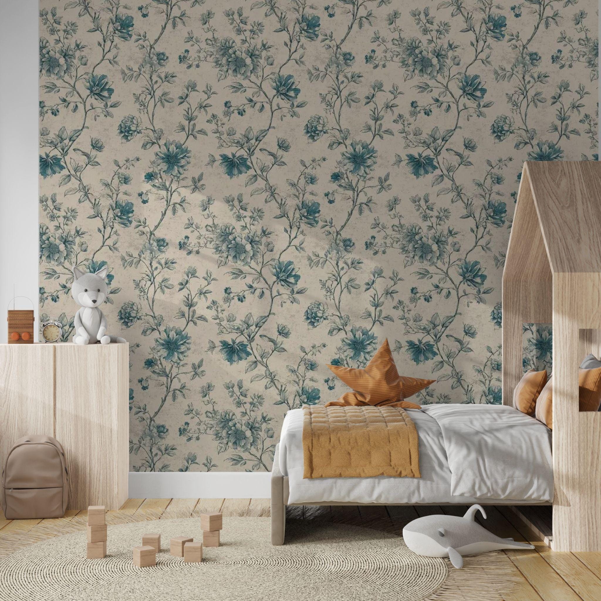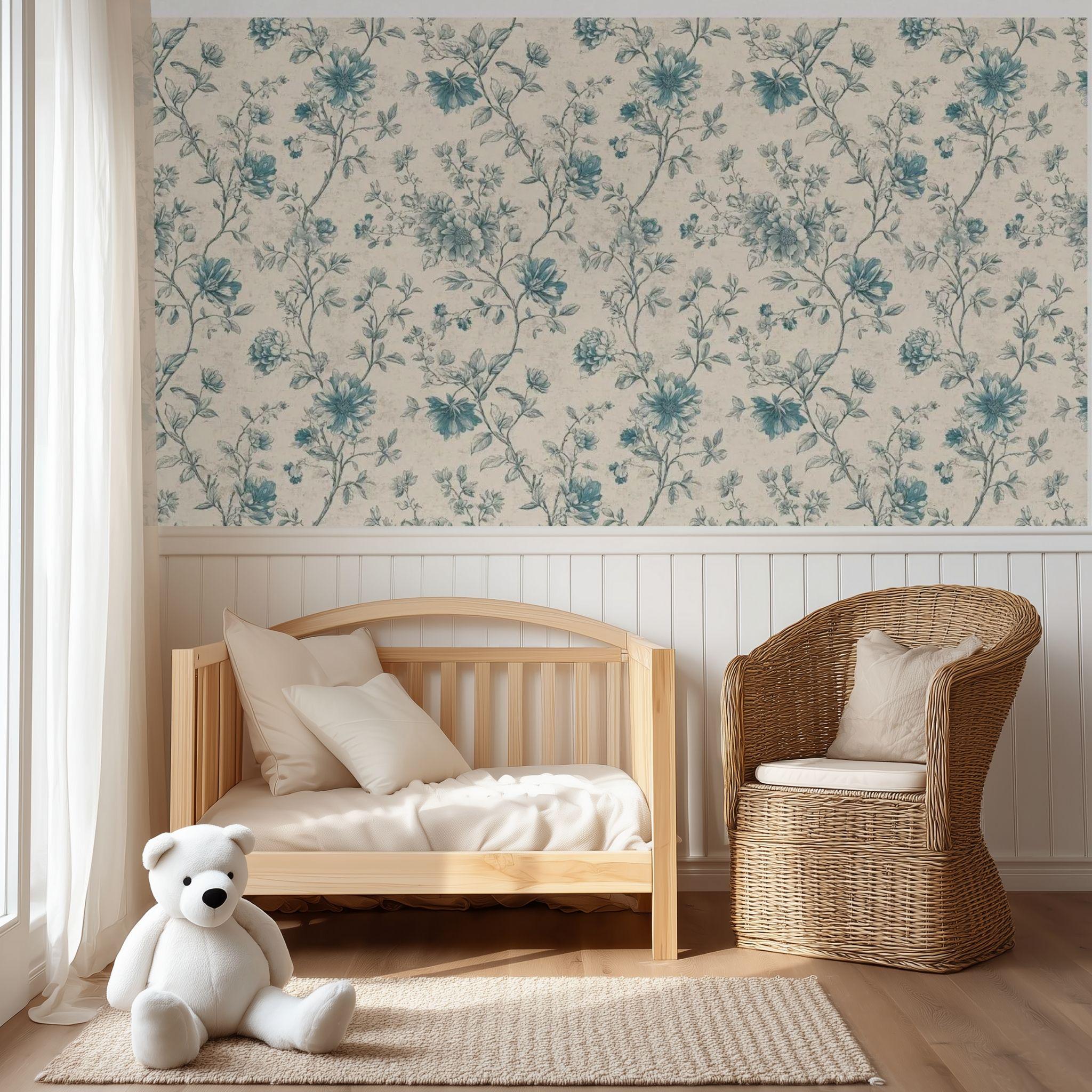 Transform your nursery into a peaceful vintage haven with this teal floral wallpaper. Featuring delicately illustrated blooms and climbing vines in soothing blue-green tones, this design blends antique charm with a soft modern palette. The gently weathered background adds depth and warmth, making it ideal for creating a cozy, timeless nursery or bedroom that feels effortlessly elegant and full of heart.