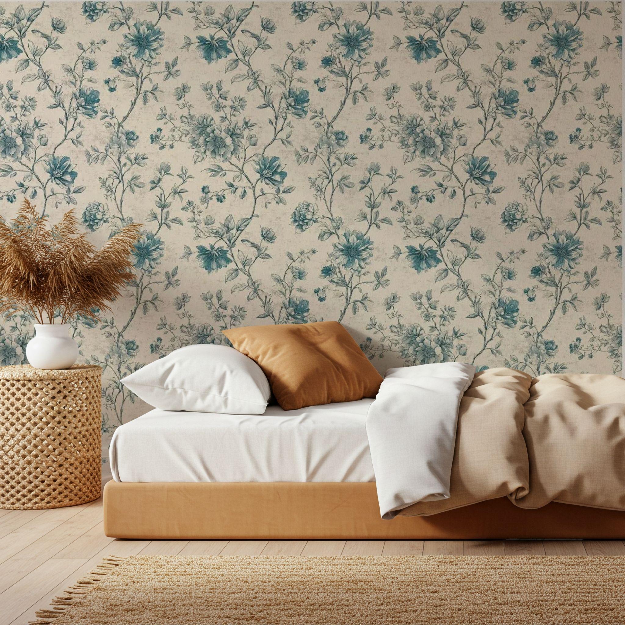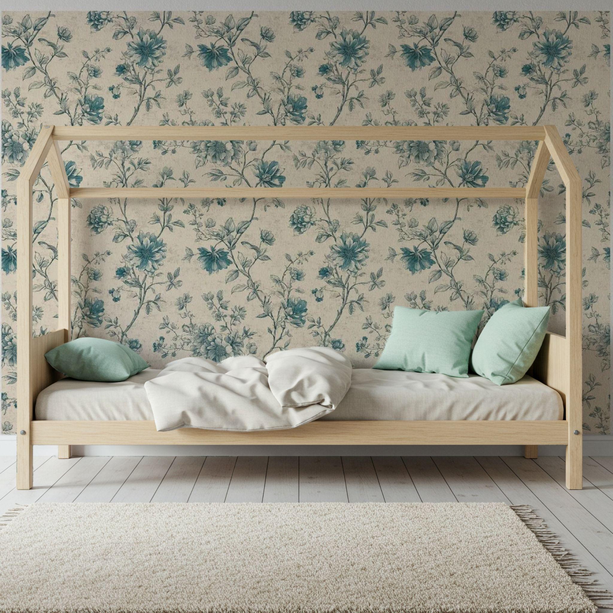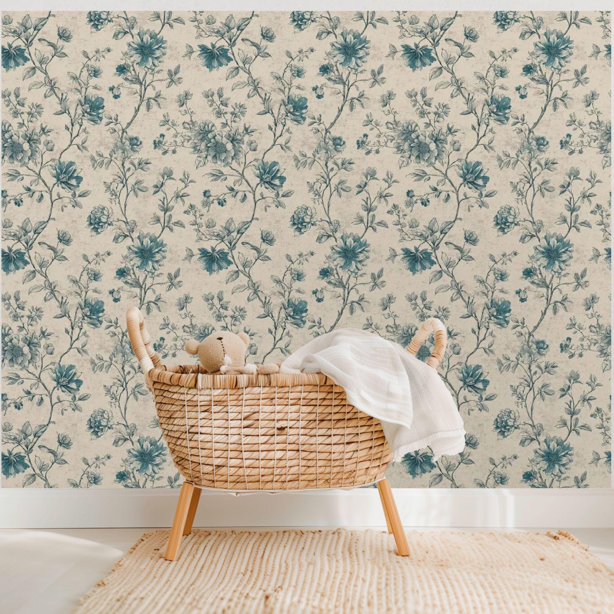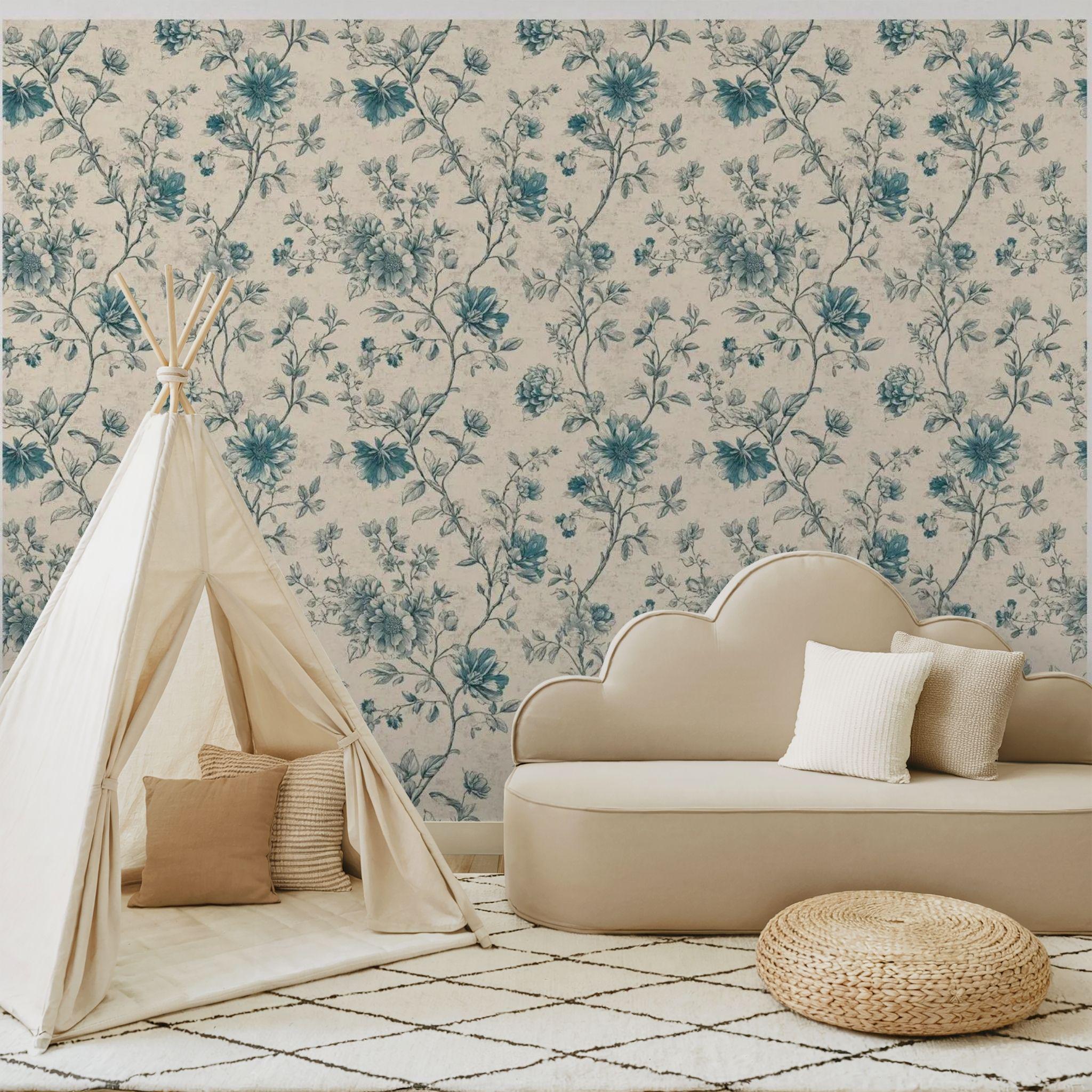 Transform your nursery into a peaceful vintage haven with this teal floral wallpaper. Featuring delicately illustrated blooms and climbing vines in soothing blue-green tones, this design blends antique charm with a soft modern palette. The gently weathered background adds depth and warmth, making it ideal for creating a cozy, timeless nursery or bedroom that feels effortlessly elegant and full of heart.