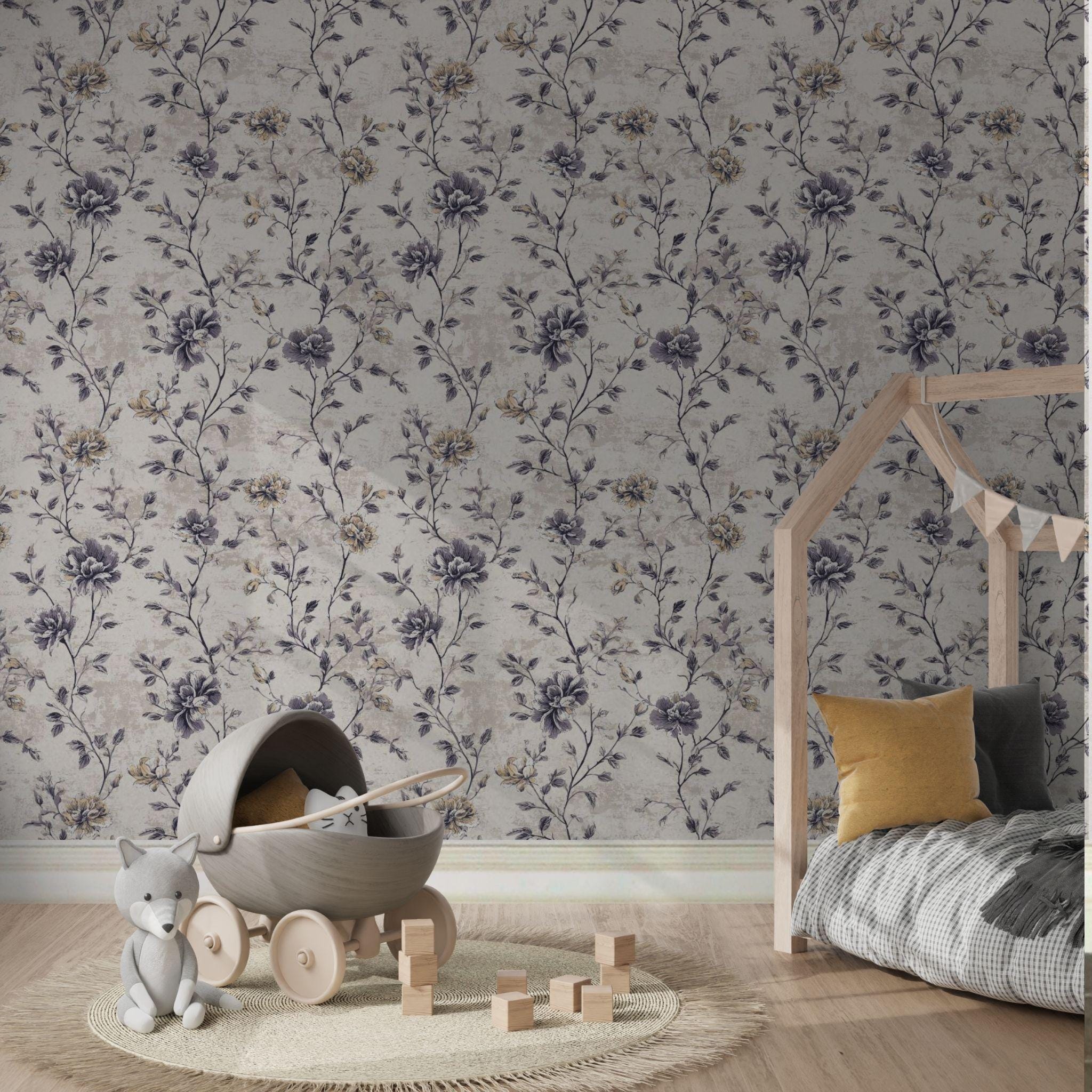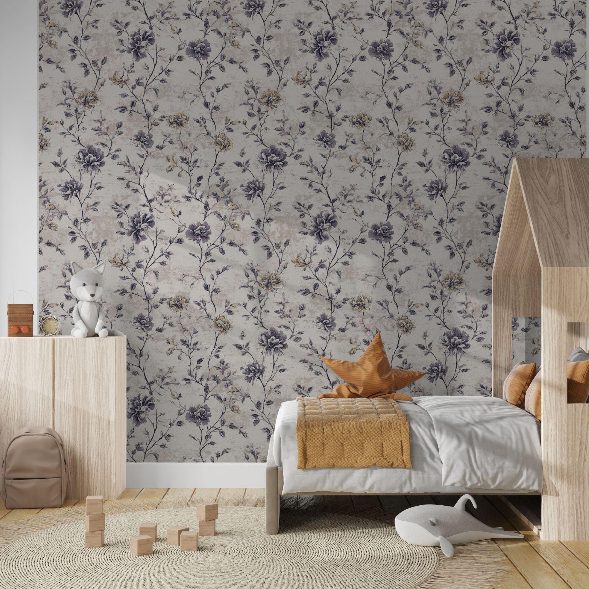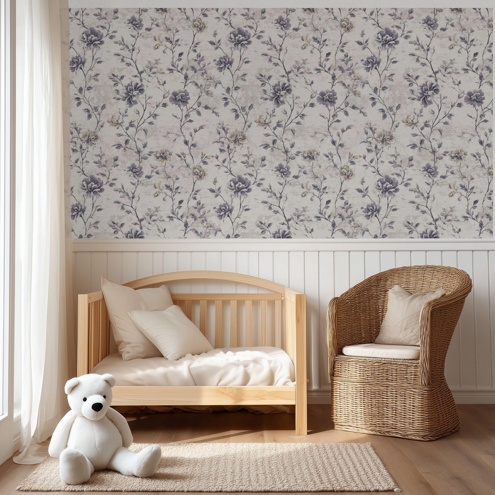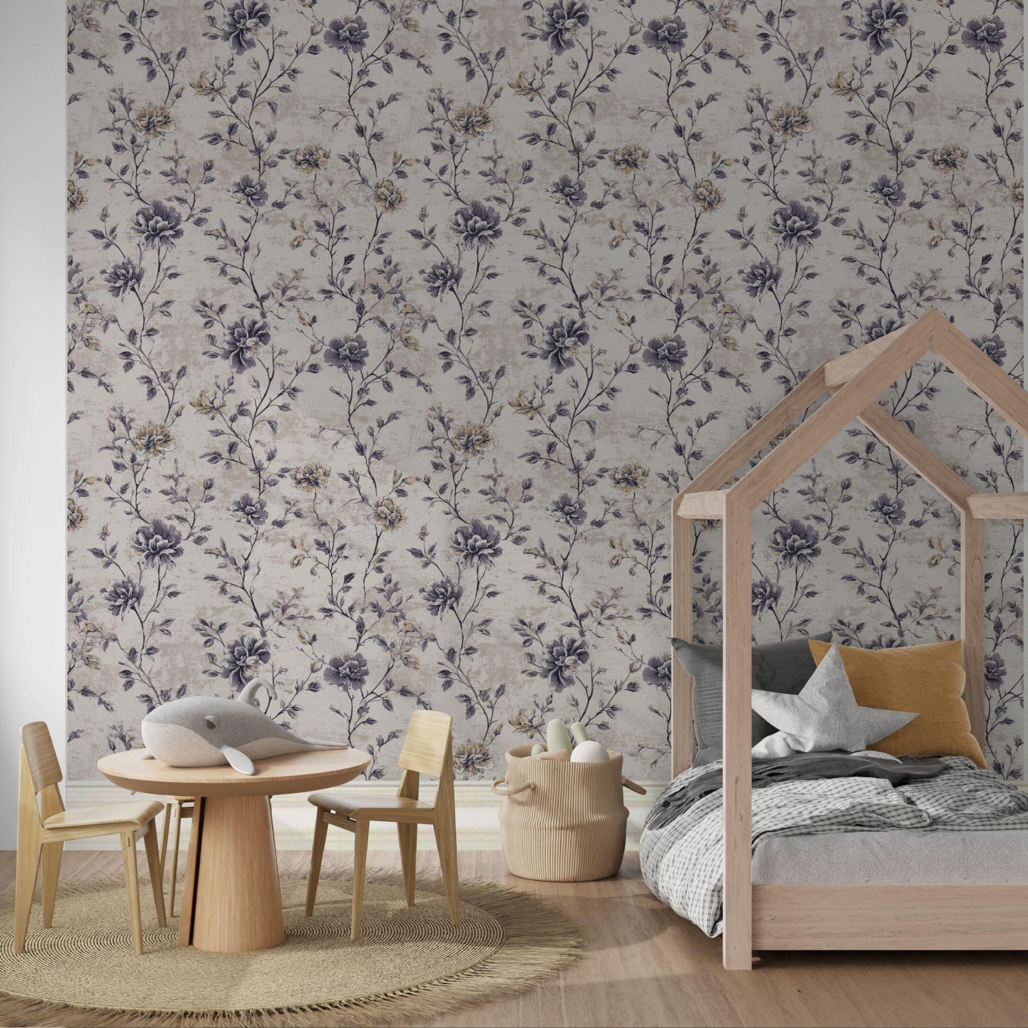 Bring timeless charm and subtle luxury to your nursery or bedroom with this vintage floral wallpaper. Featuring hand-drawn blossoms in muted lavender-gray tones with delicate gold accents, this design adds warmth and refinement to any space. The softly aged texture gives it a romantic, heirloom feel—perfect for creating a serene, storybook-inspired room that feels both classic and effortlessly modern.