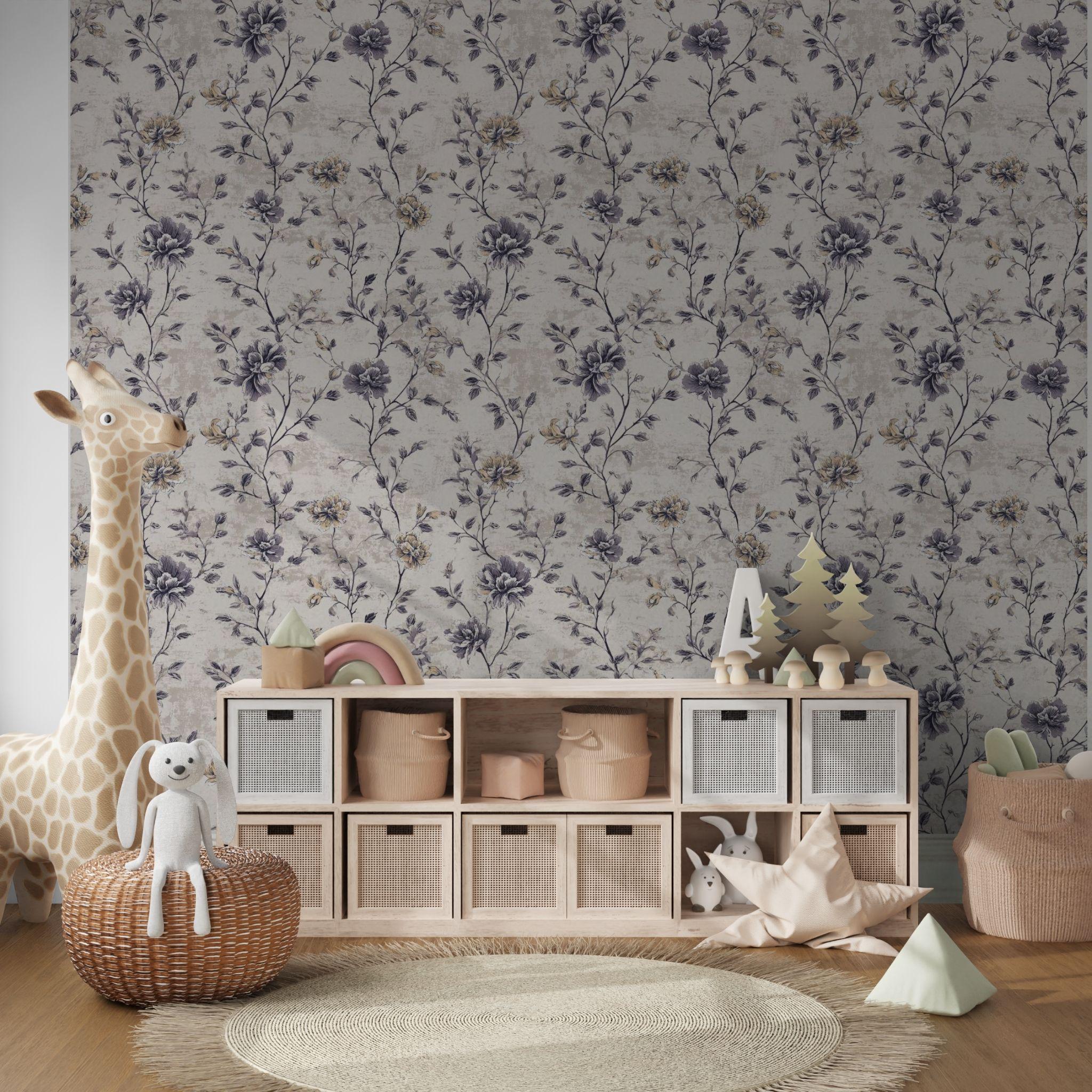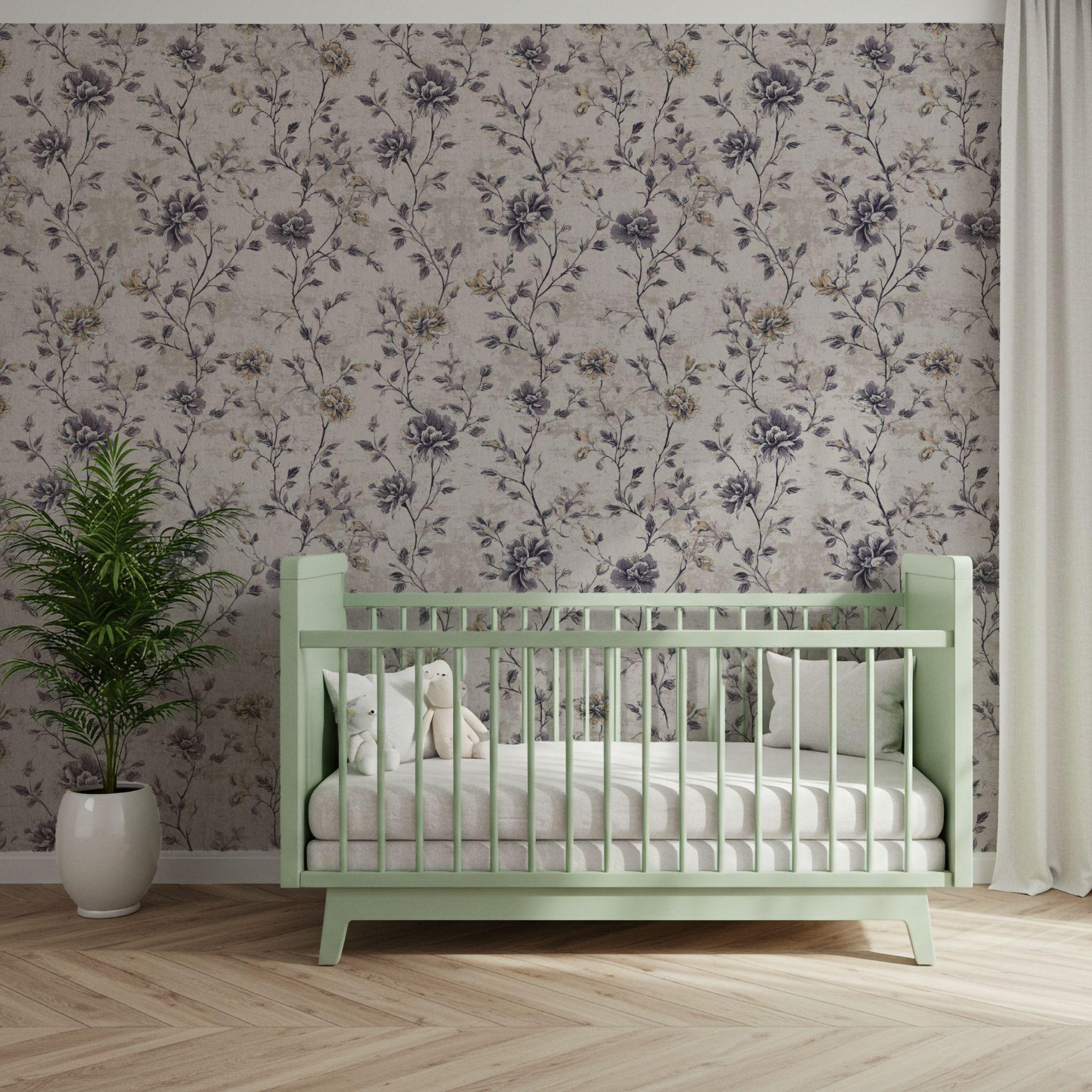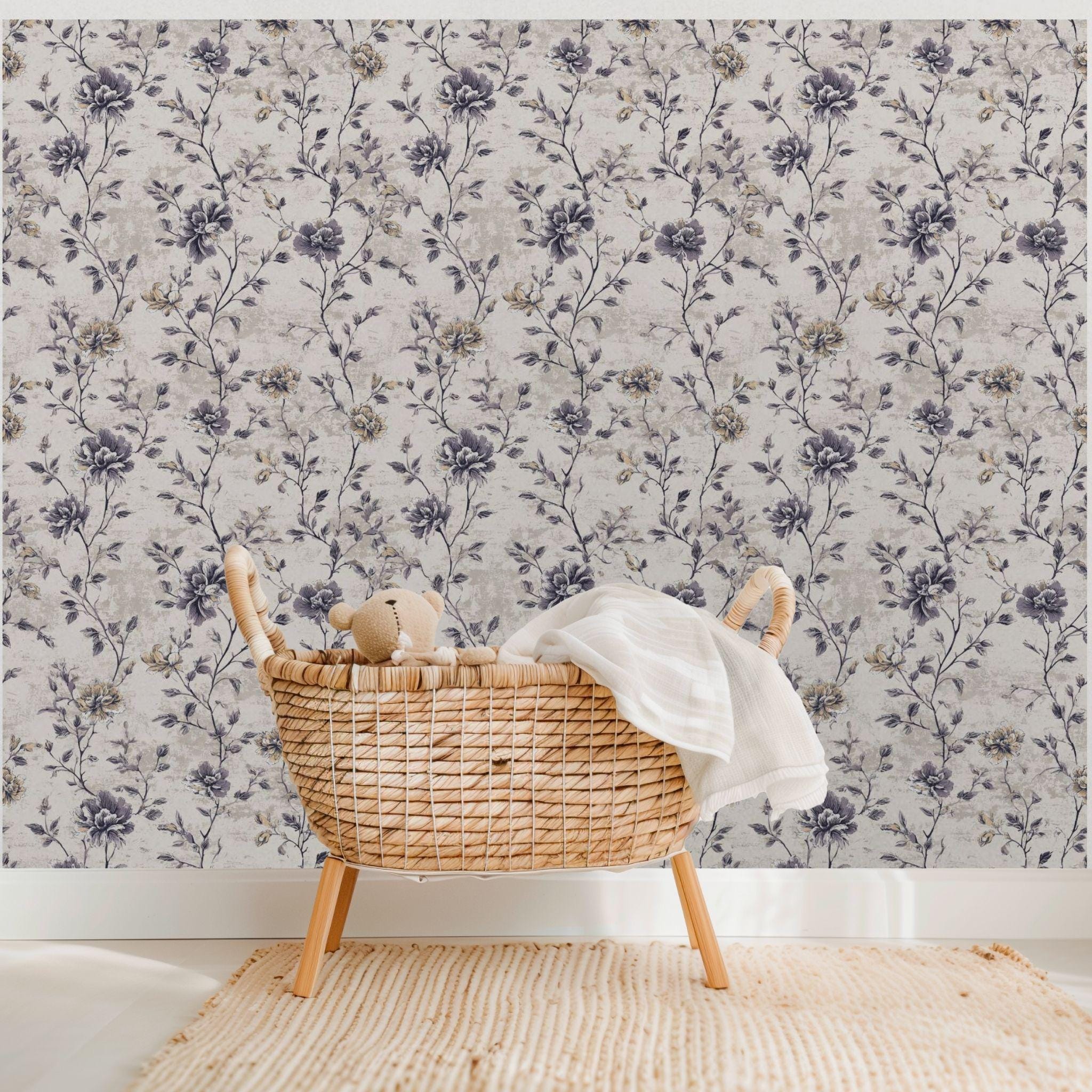Bring timeless charm and subtle luxury to your nursery or bedroom with this vintage floral wallpaper. Featuring hand-drawn blossoms in muted lavender-gray tones with delicate gold accents, this design adds warmth and refinement to any space. The softly aged texture gives it a romantic, heirloom feel—perfect for creating a serene, storybook-inspired room that feels both classic and effortlessly modern.