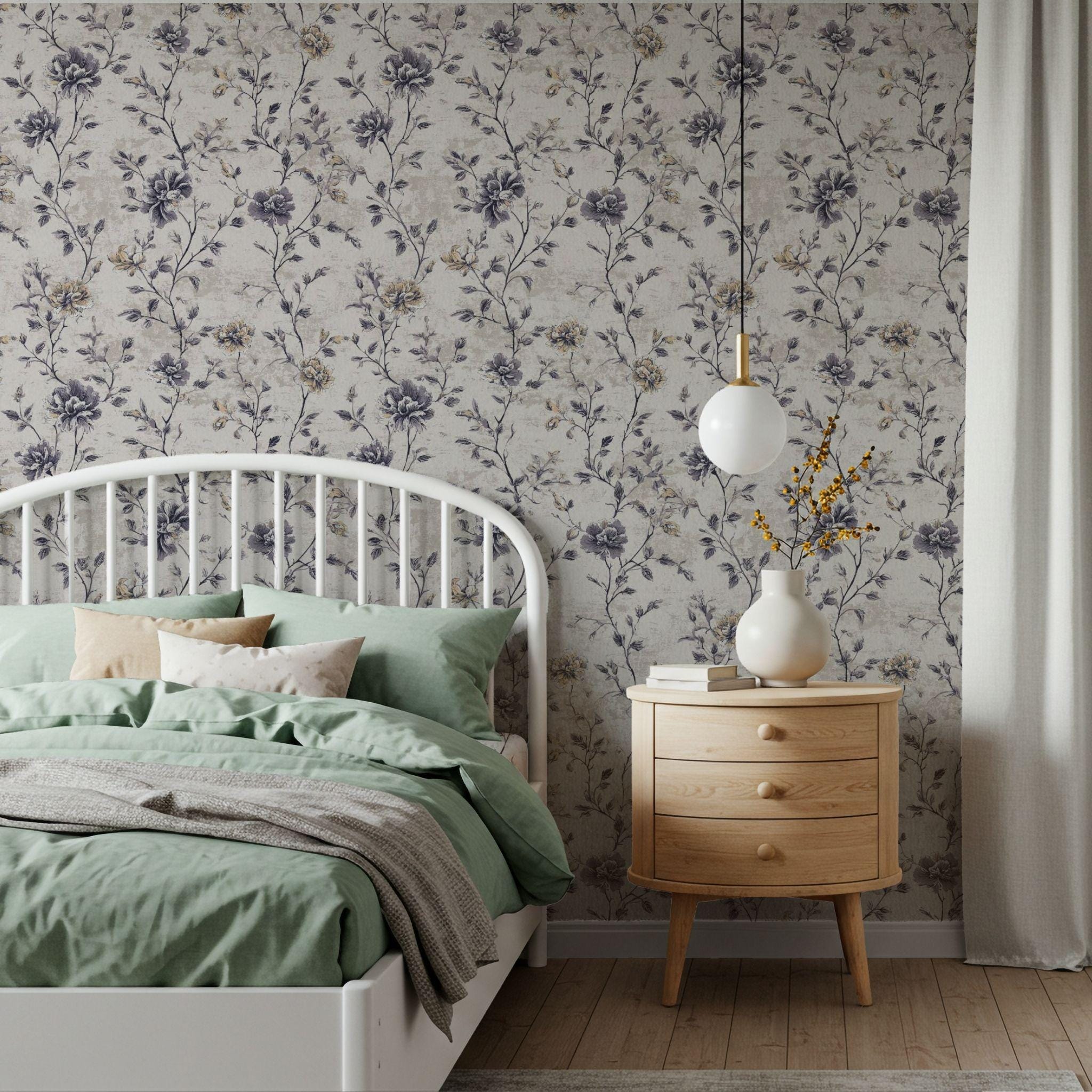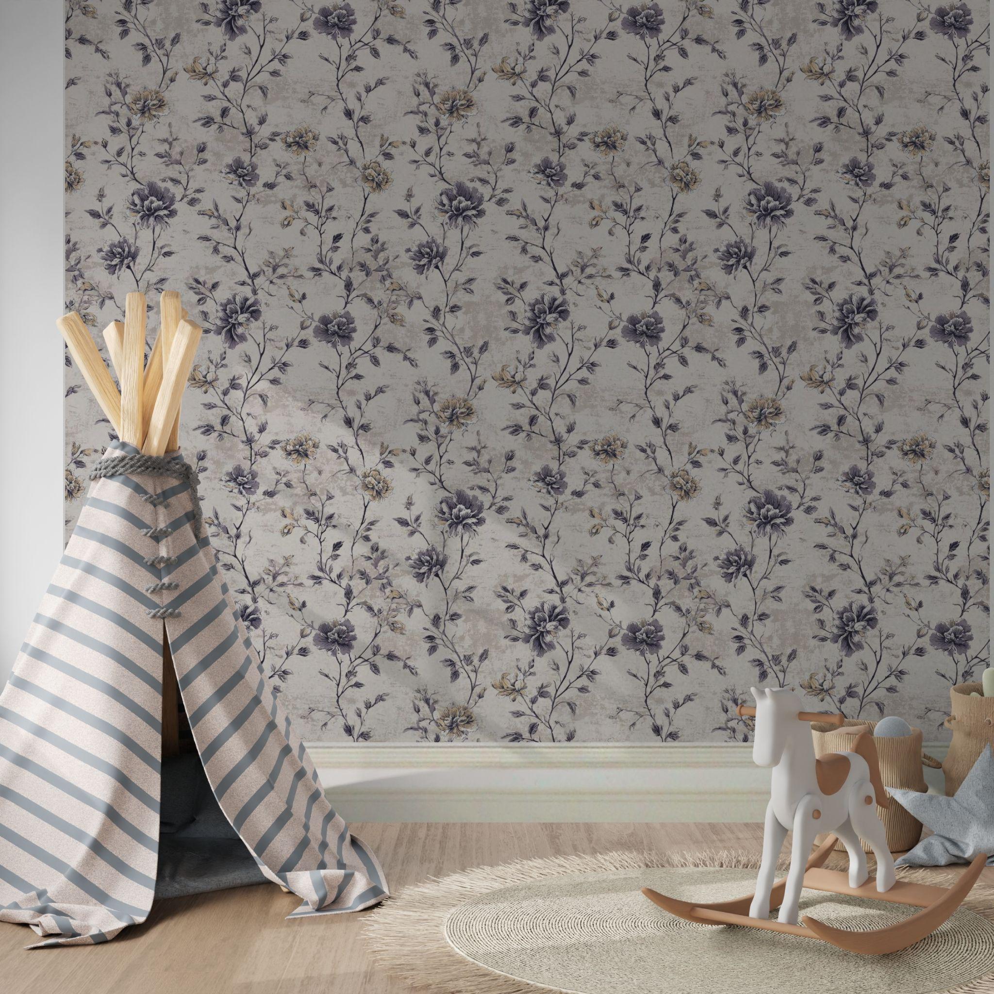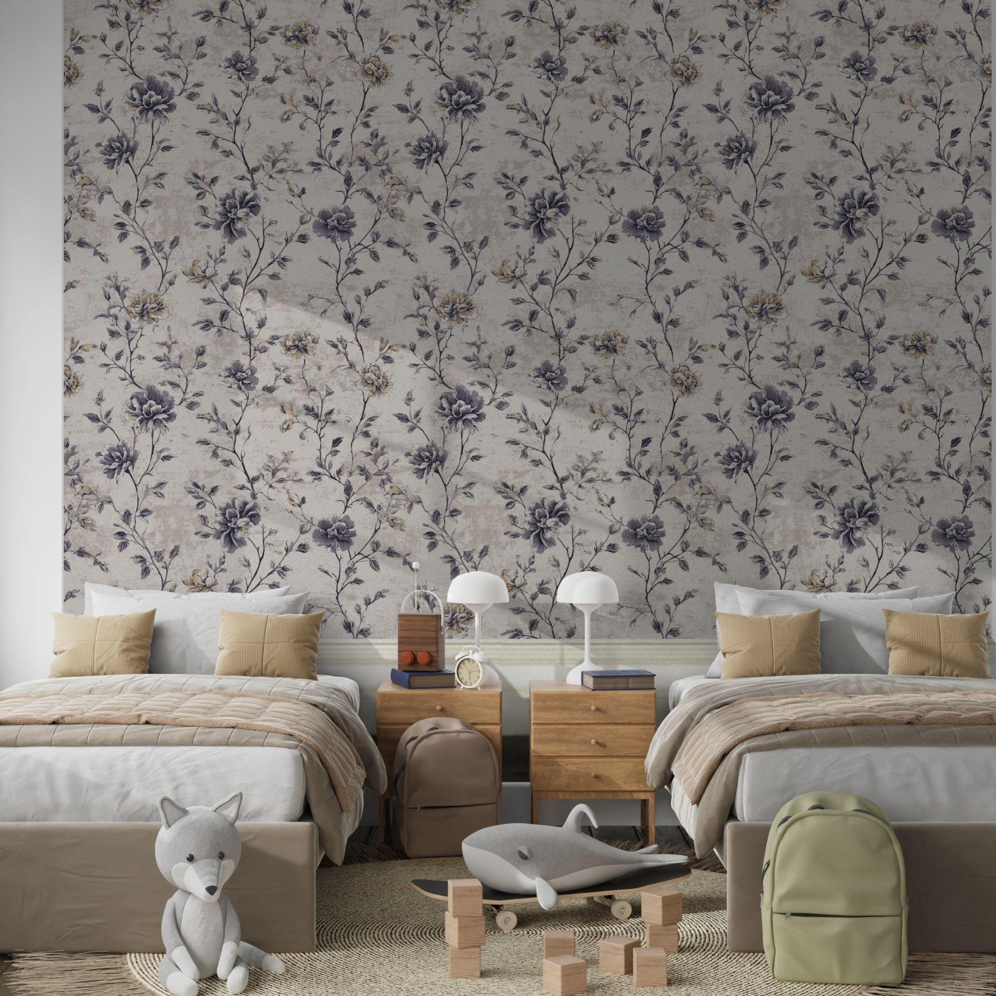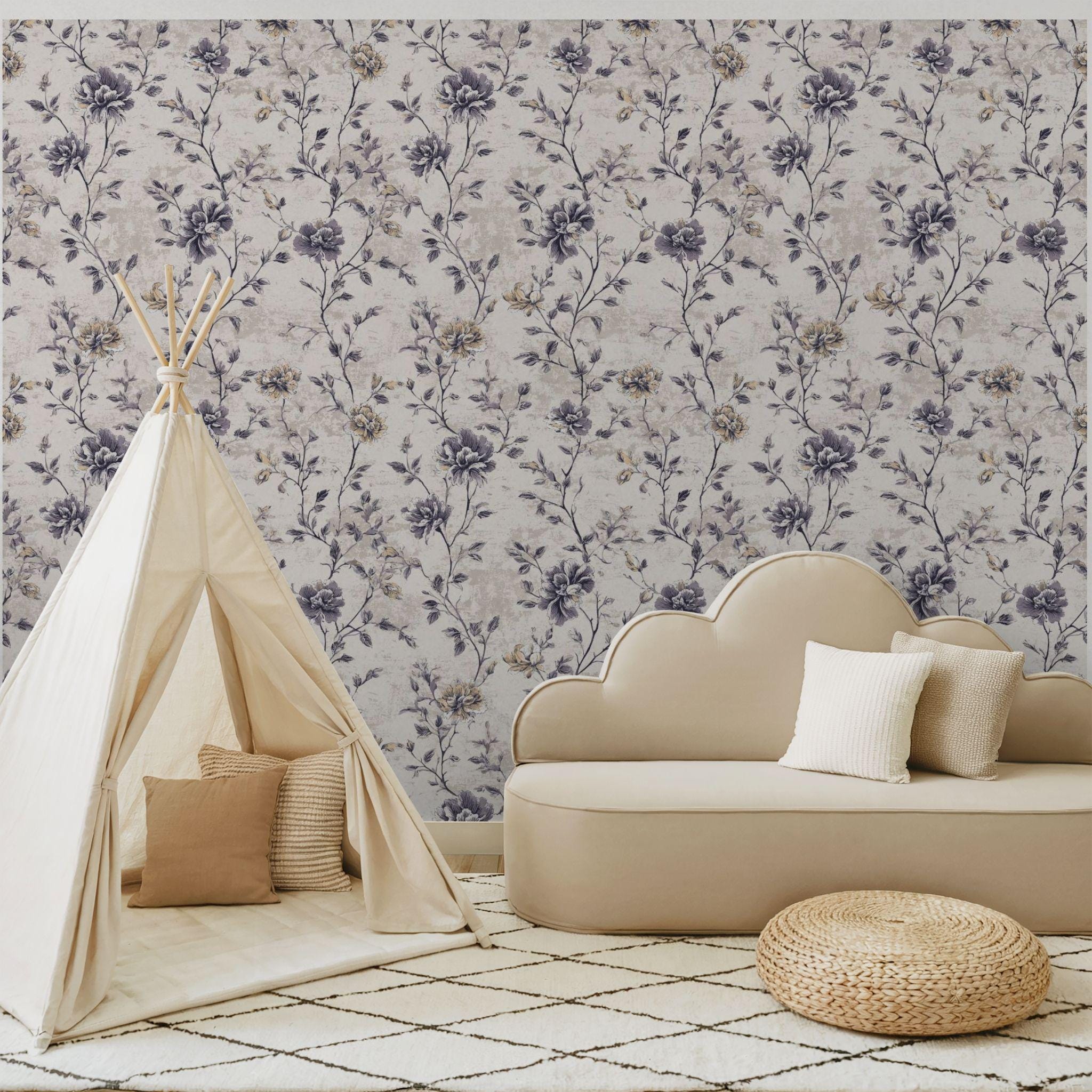 Bring timeless charm and subtle luxury to your nursery or bedroom with this vintage floral wallpaper. Featuring hand-drawn blossoms in muted lavender-gray tones with delicate gold accents, this design adds warmth and refinement to any space. The softly aged texture gives it a romantic, heirloom feel—perfect for creating a serene, storybook-inspired room that feels both classic and effortlessly modern.