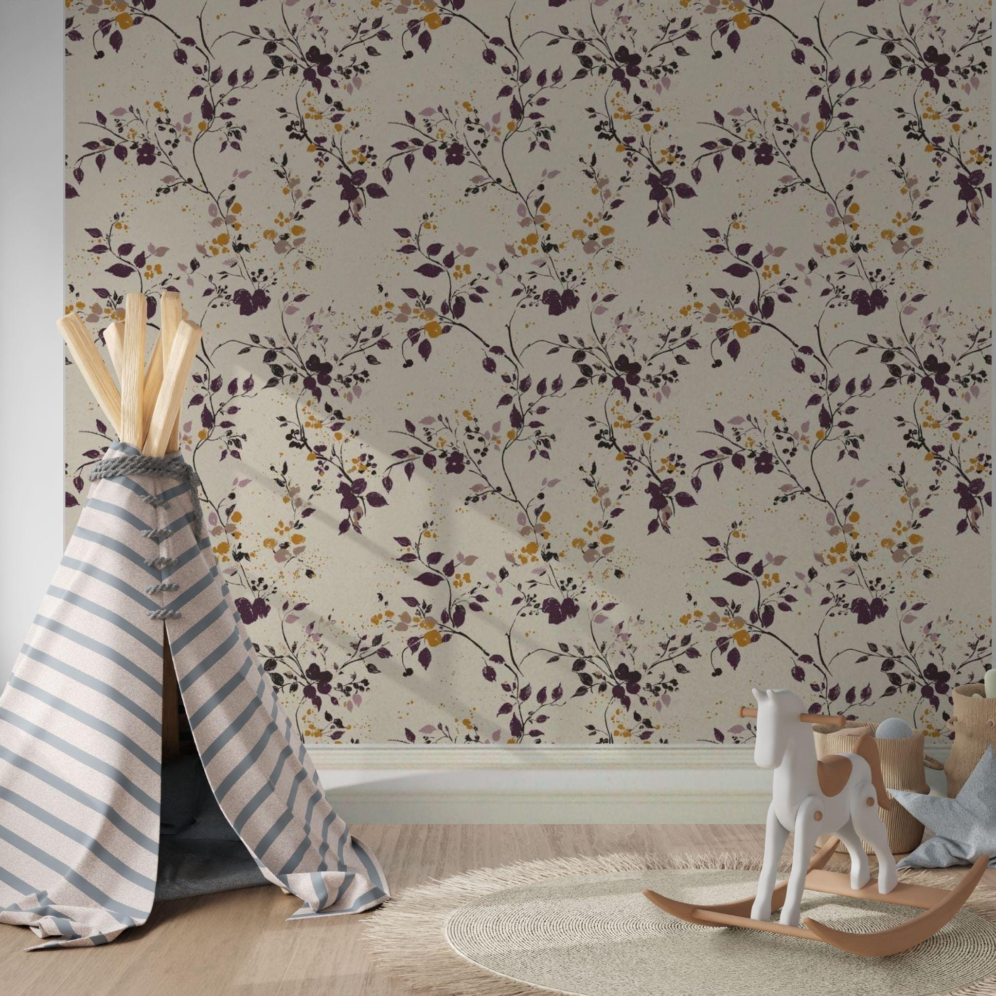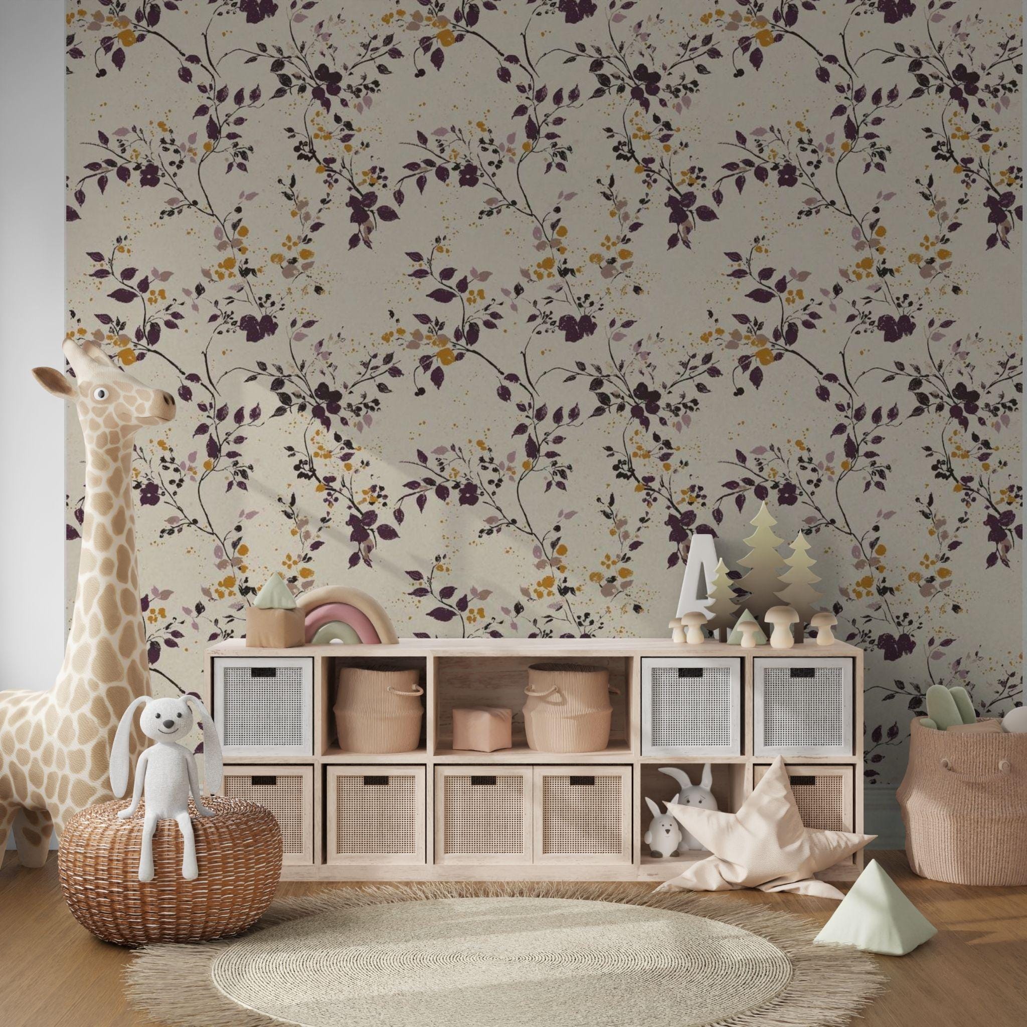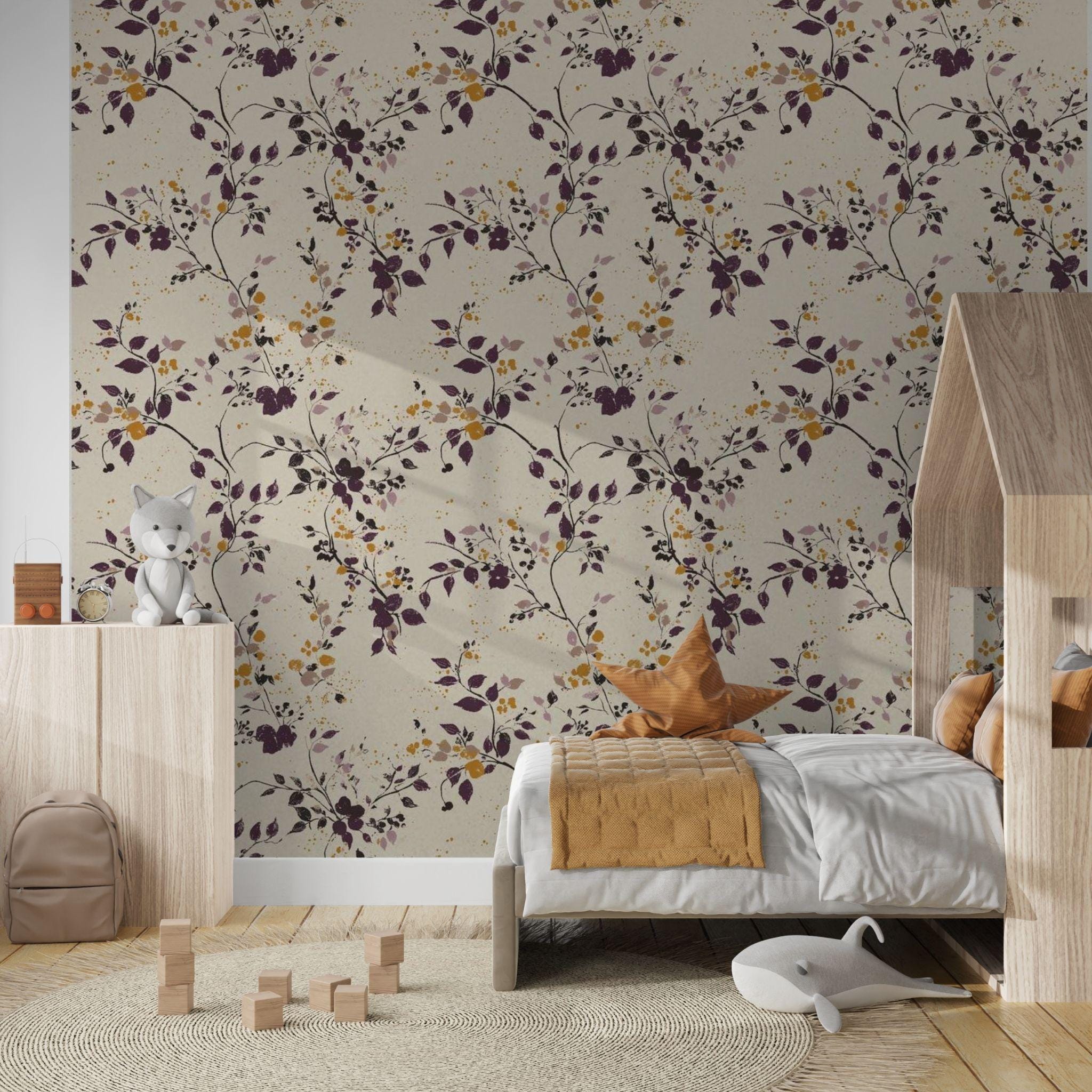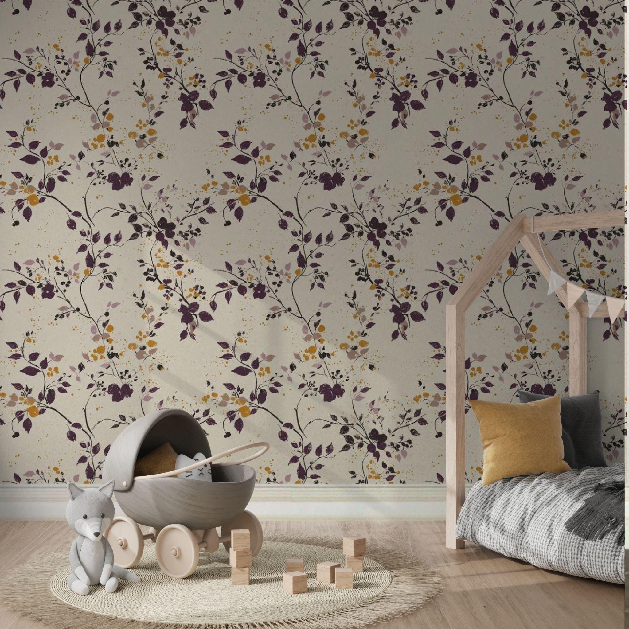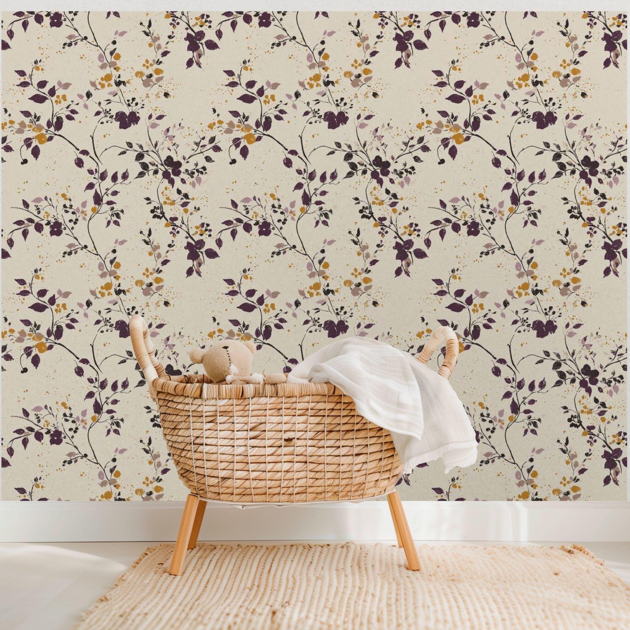 Infuse your nursery or living space with warm vintage elegance using this plum and ochre floral wallpaper. Featuring hand-illustrated vines and blossoms in soft gold, lilac, and deep berry hues, this design brings depth and sophistication without overpowering the room. The gently aged background adds texture and warmth, creating a cozy yet refined atmosphere perfect for timeless, design-forward interiors.