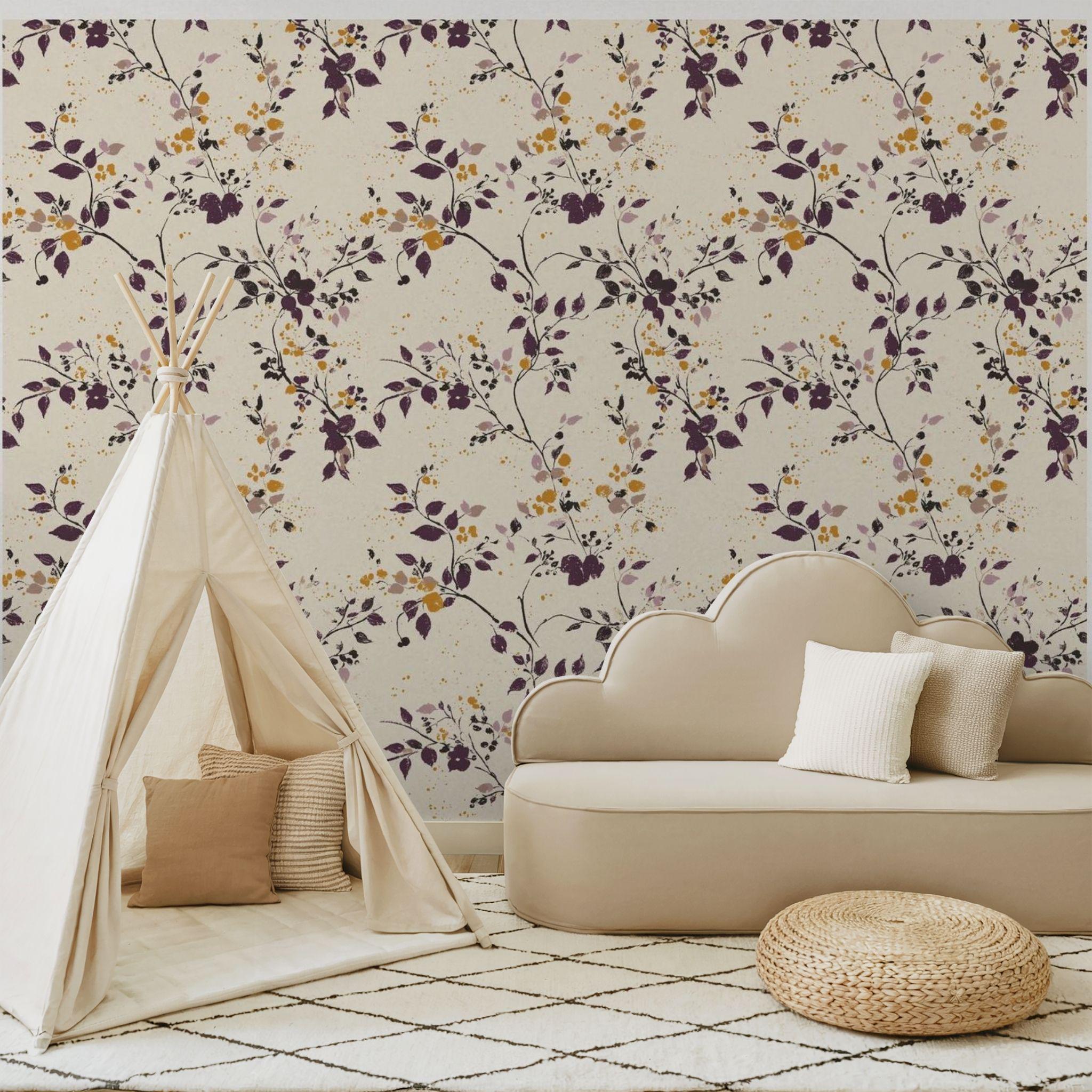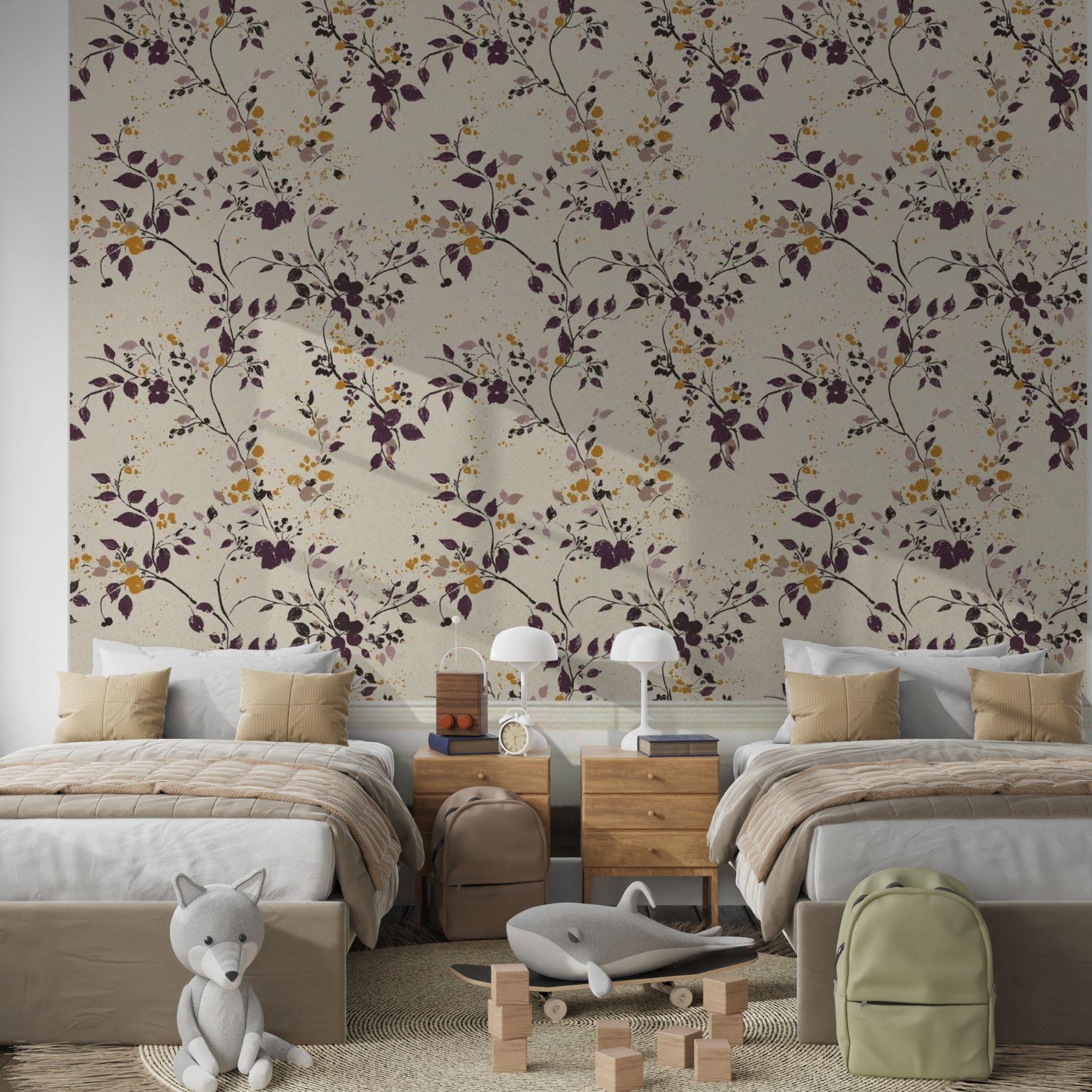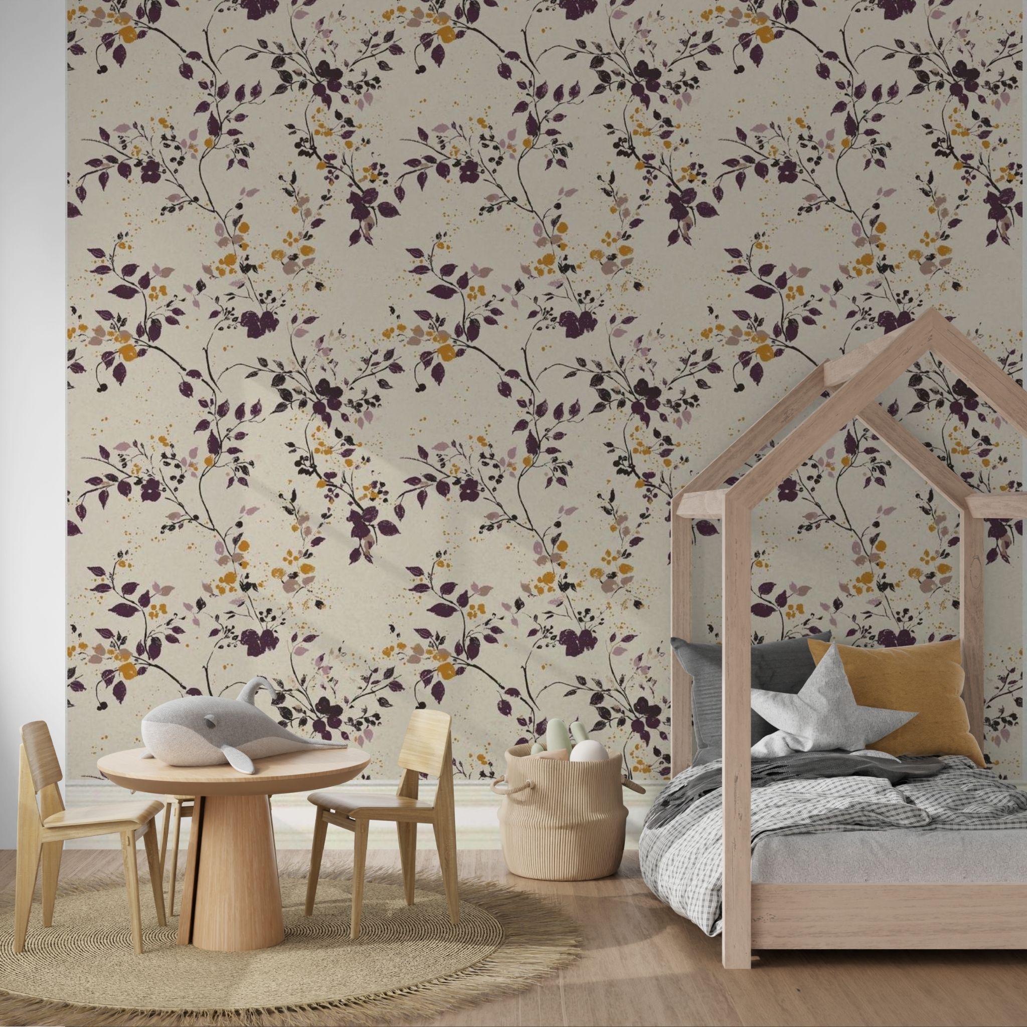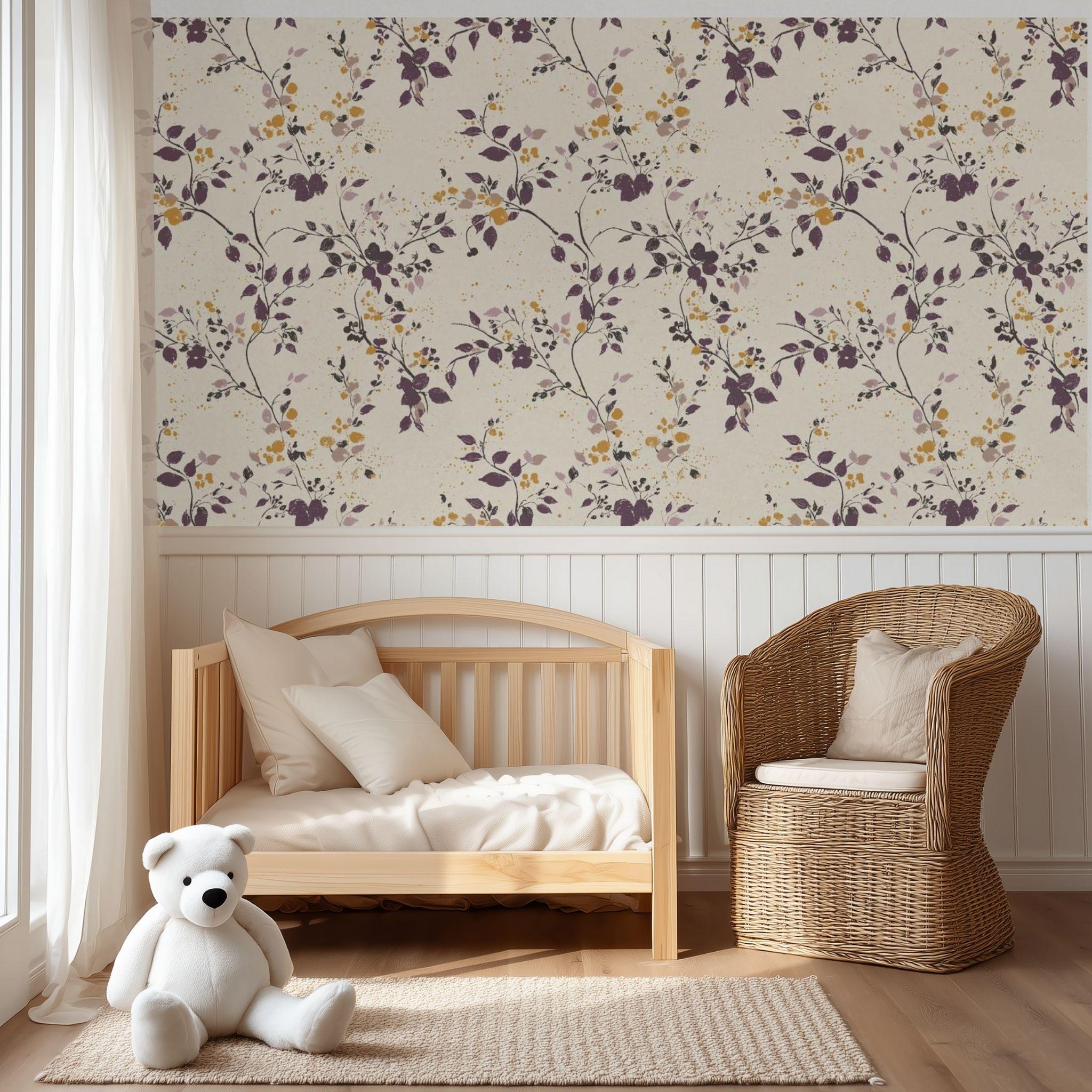 Infuse your nursery or living space with warm vintage elegance using this plum and ochre floral wallpaper. Featuring hand-illustrated vines and blossoms in soft gold, lilac, and deep berry hues, this design brings depth and sophistication without overpowering the room. The gently aged background adds texture and warmth, creating a cozy yet refined atmosphere perfect for timeless, design-forward interiors.