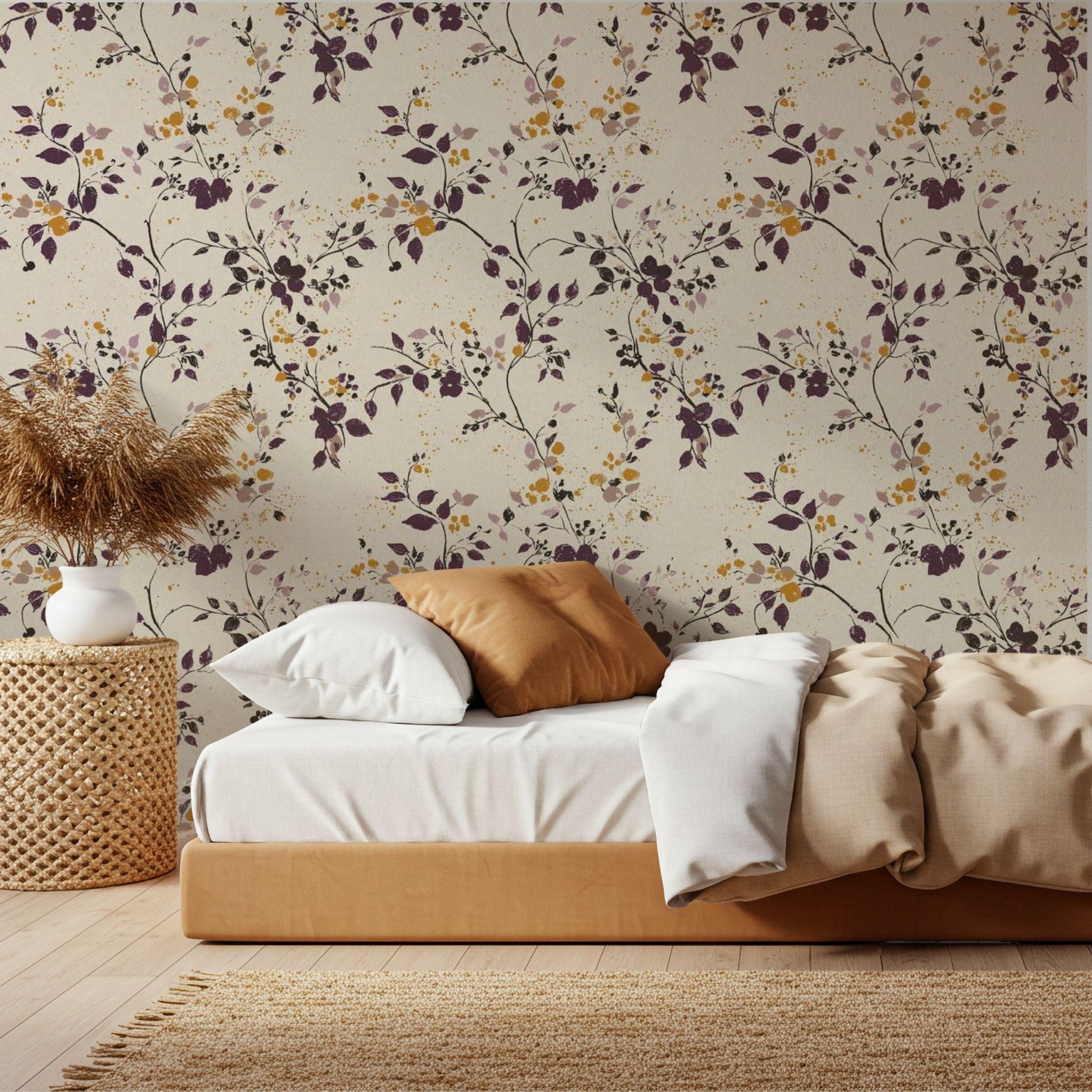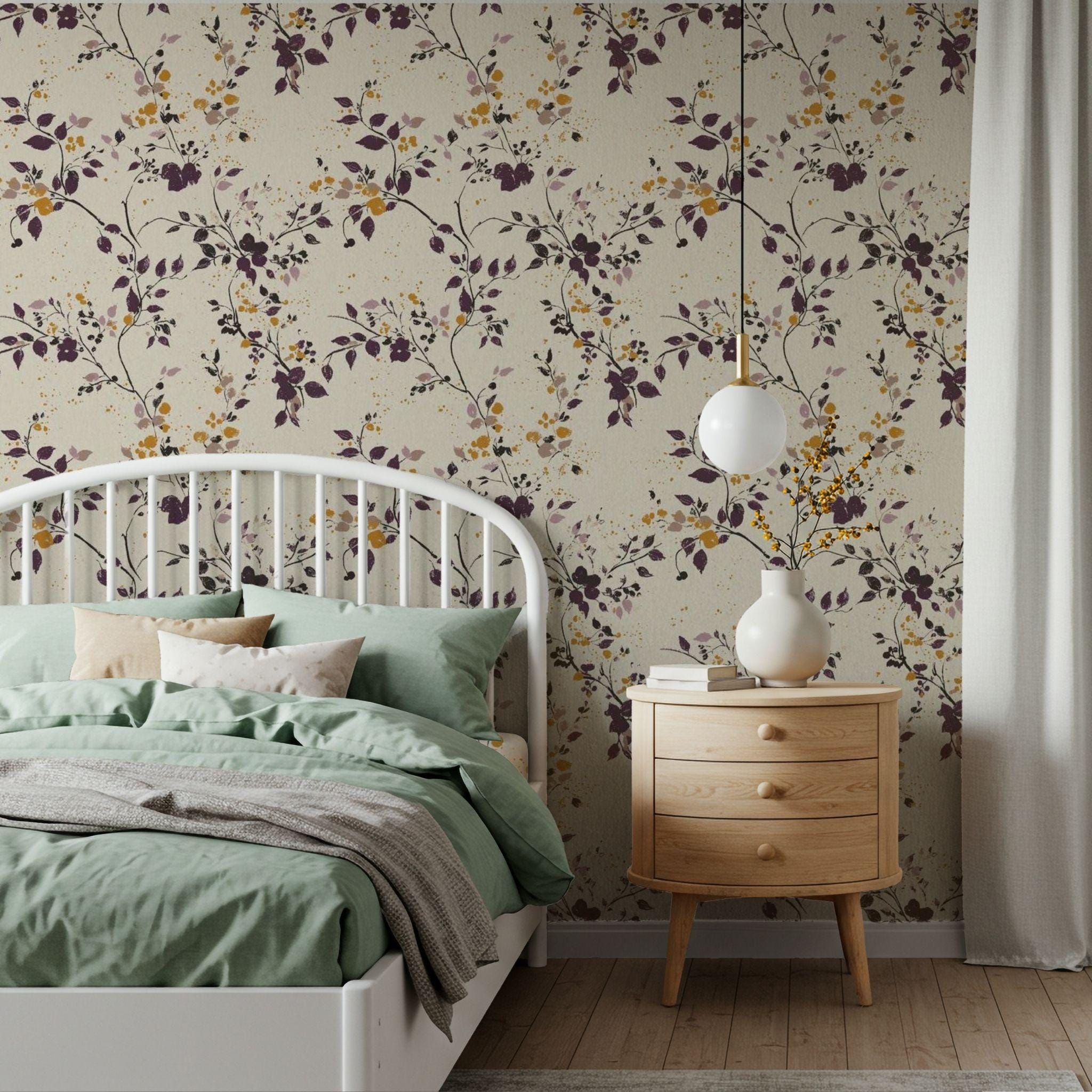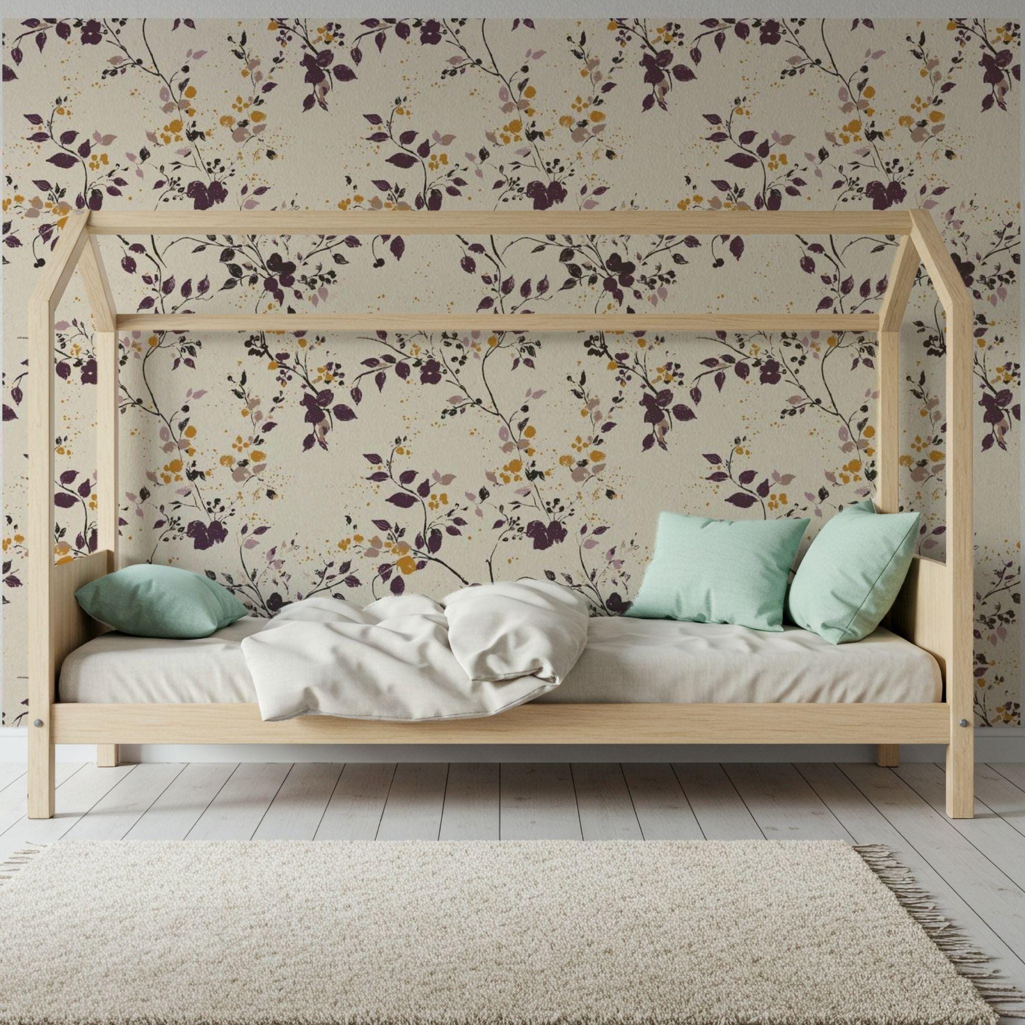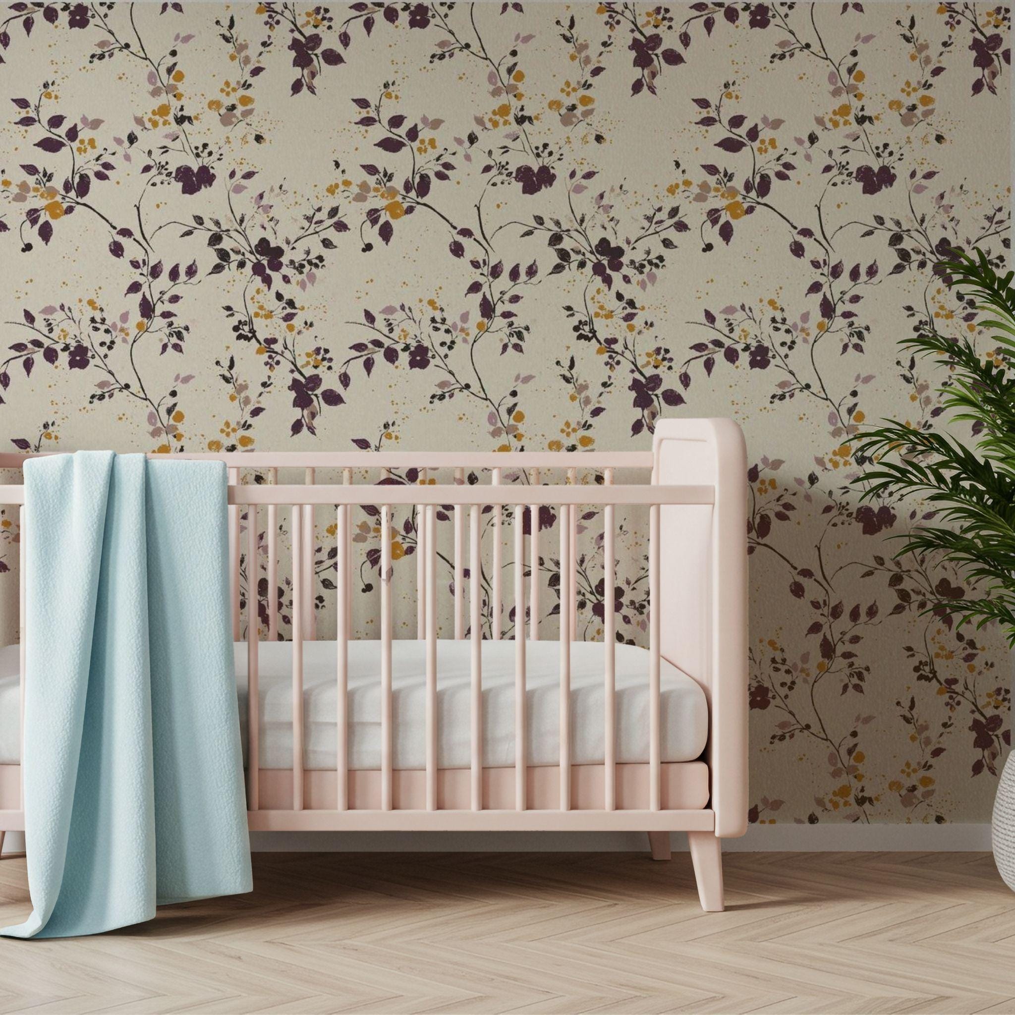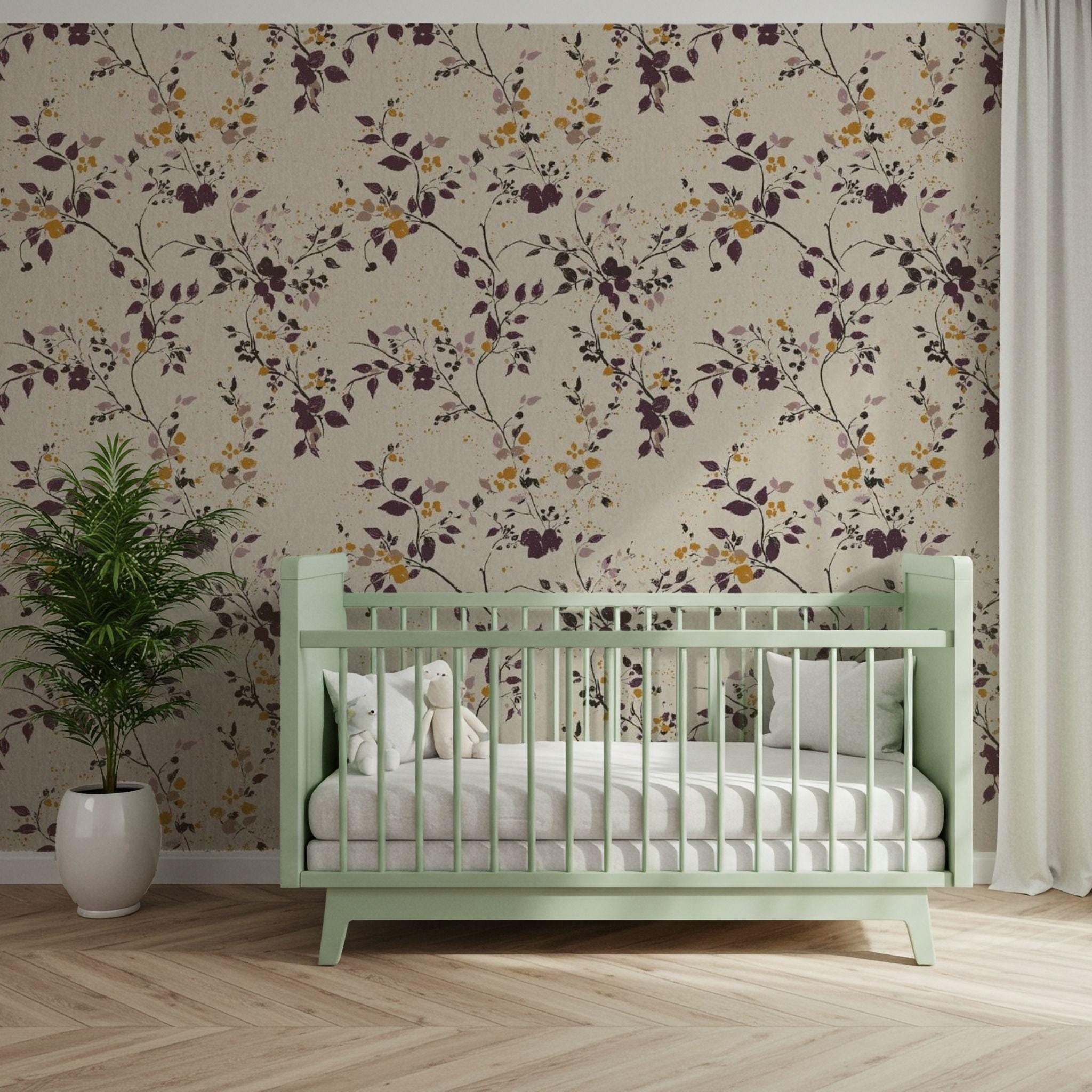 Infuse your nursery or living space with warm vintage elegance using this plum and ochre floral wallpaper. Featuring hand-illustrated vines and blossoms in soft gold, lilac, and deep berry hues, this design brings depth and sophistication without overpowering the room. The gently aged background adds texture and warmth, creating a cozy yet refined atmosphere perfect for timeless, design-forward interiors.