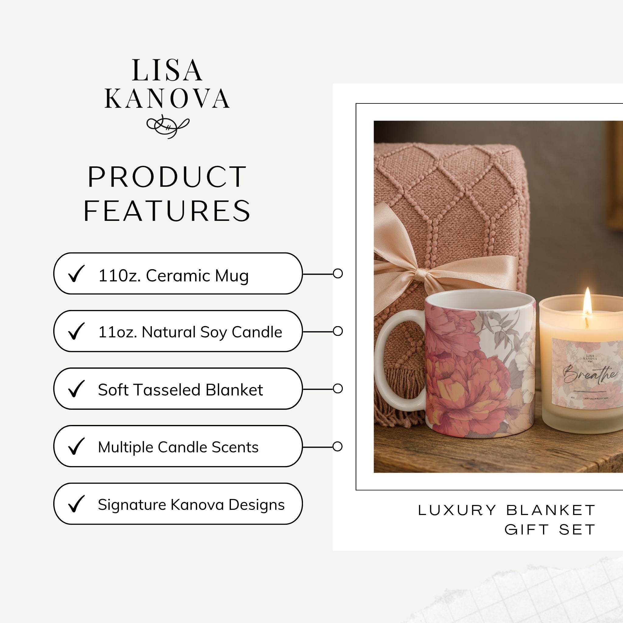The Cozy Embrace Gift Set is a warm, comforting trio designed to create a moment of stillness and soft retreat. Featuring a beautifully textured tassel blanket, a classic ceramic mug, and a clean-burning frosted candle, this set wraps any space in calming light, subtle fragrance, and everyday comfort. Perfect for holidays, birthdays, client gifting, or thoughtful self-care moments — it’s relaxation, beautifully curated.
