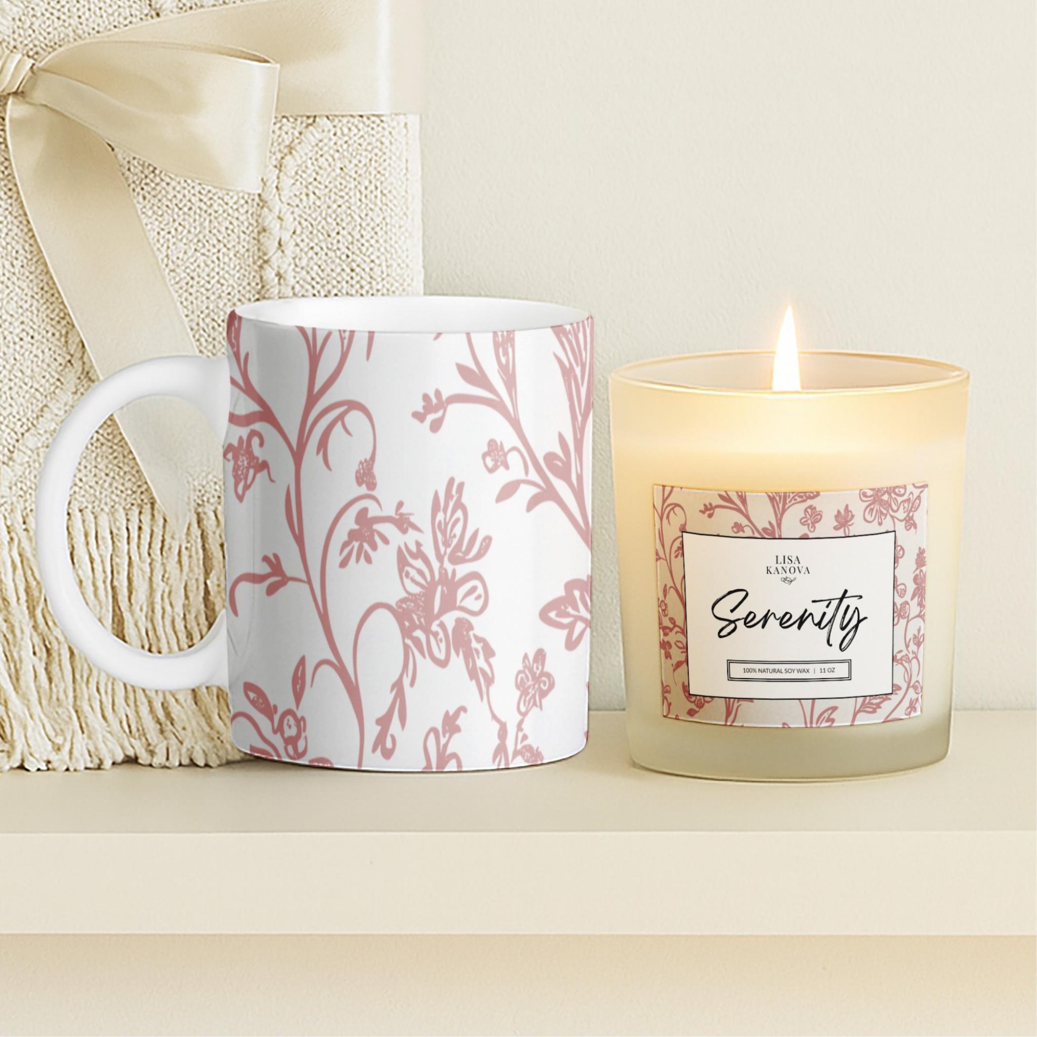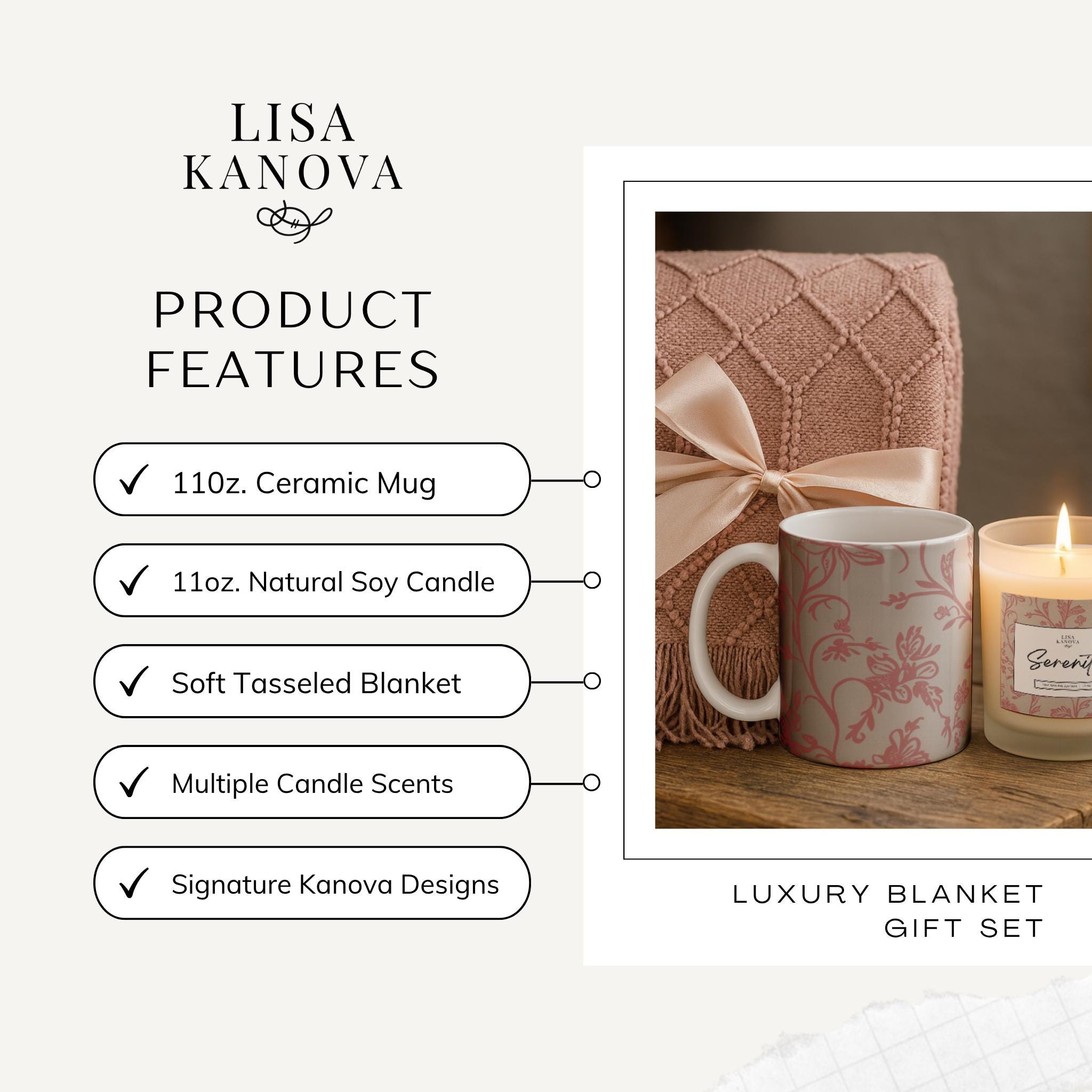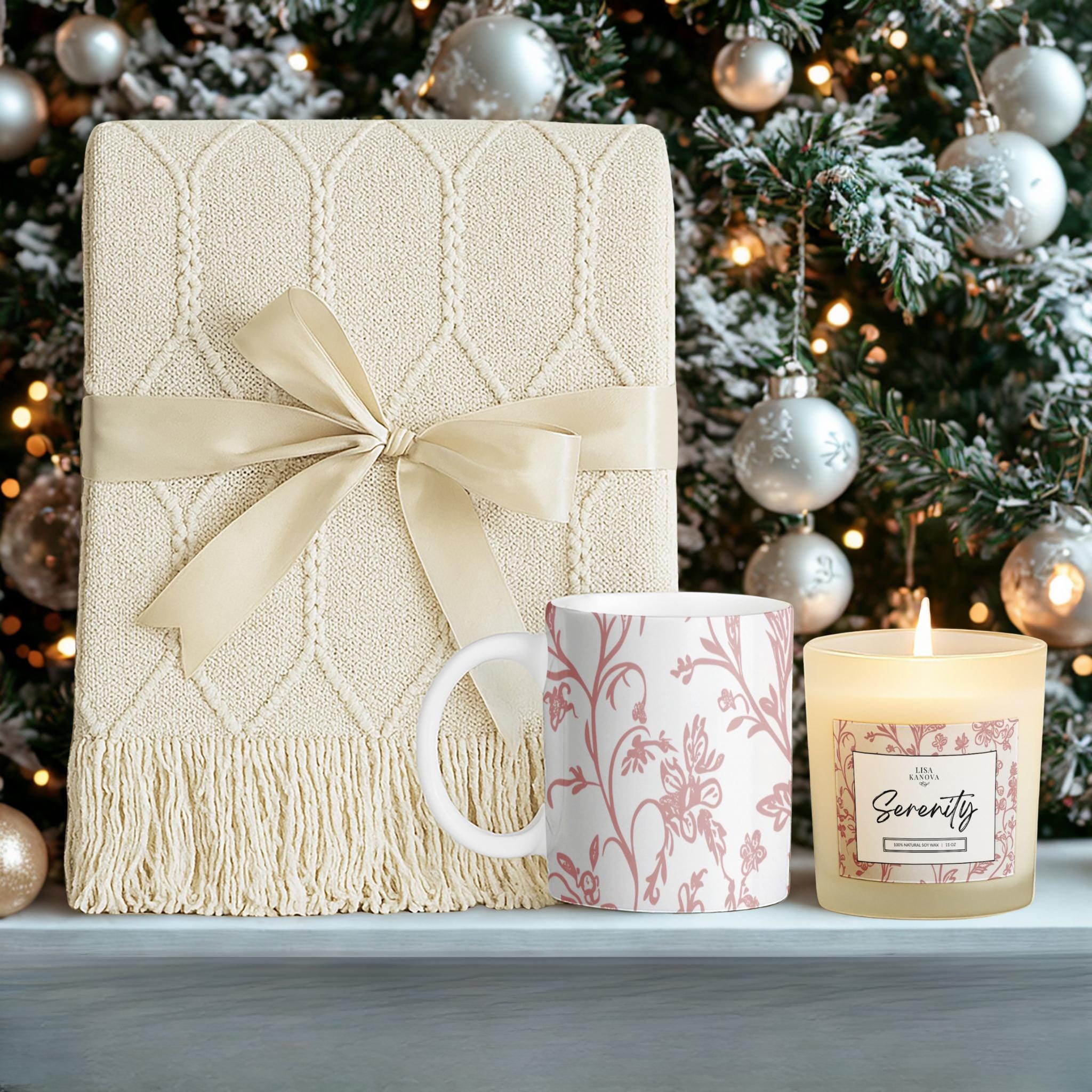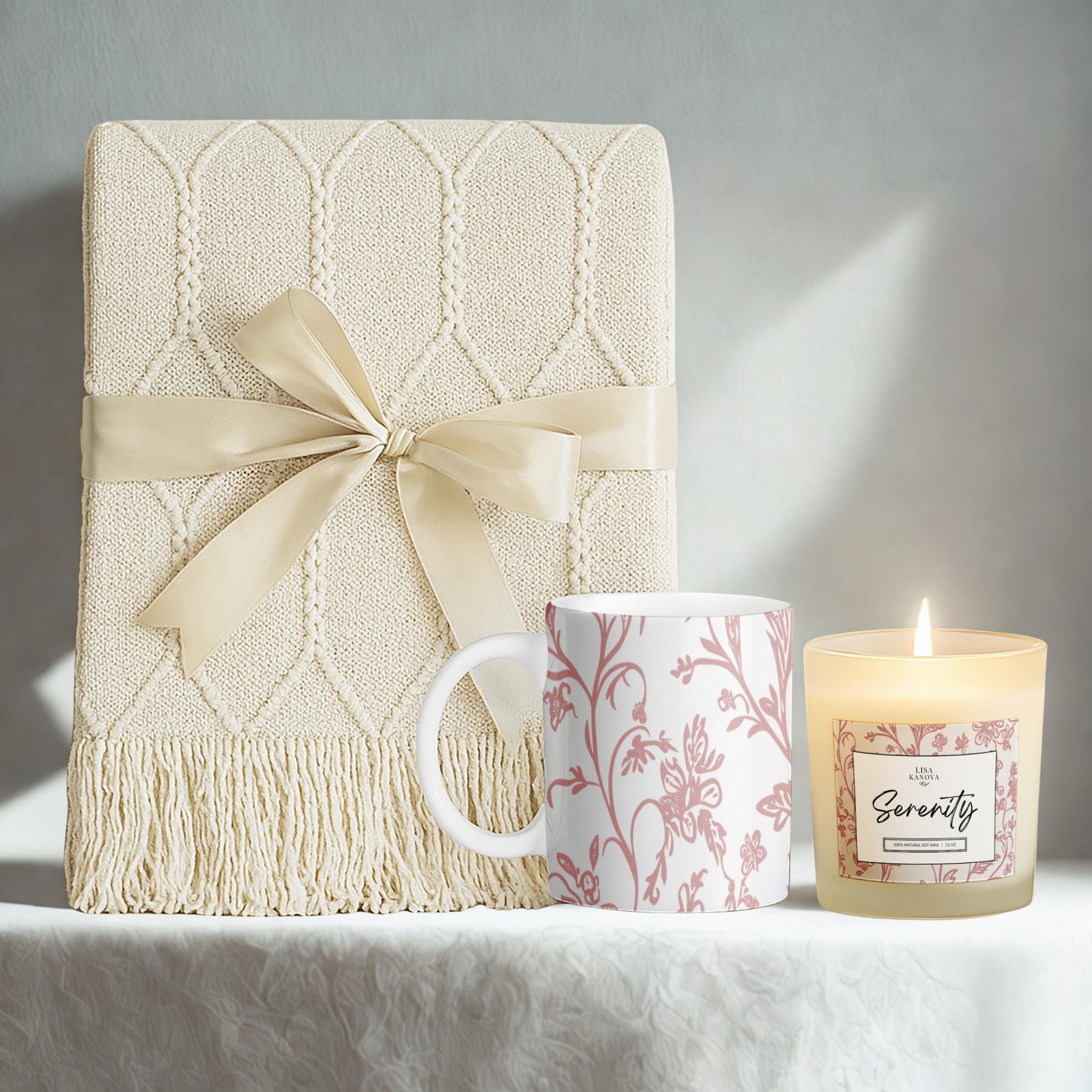 Bring a touch of curated beauty to any moment with this personalized toile gift set. Designed to feel timeless, elegant, and unmistakably special, this three-piece collection transforms everyday comfort into a refined ritual. Each set includes a soft tassel throw, a fine-art floral mug, and a personalized soy candle wrapped in coordinating toile — a blend of classic charm and modern style.