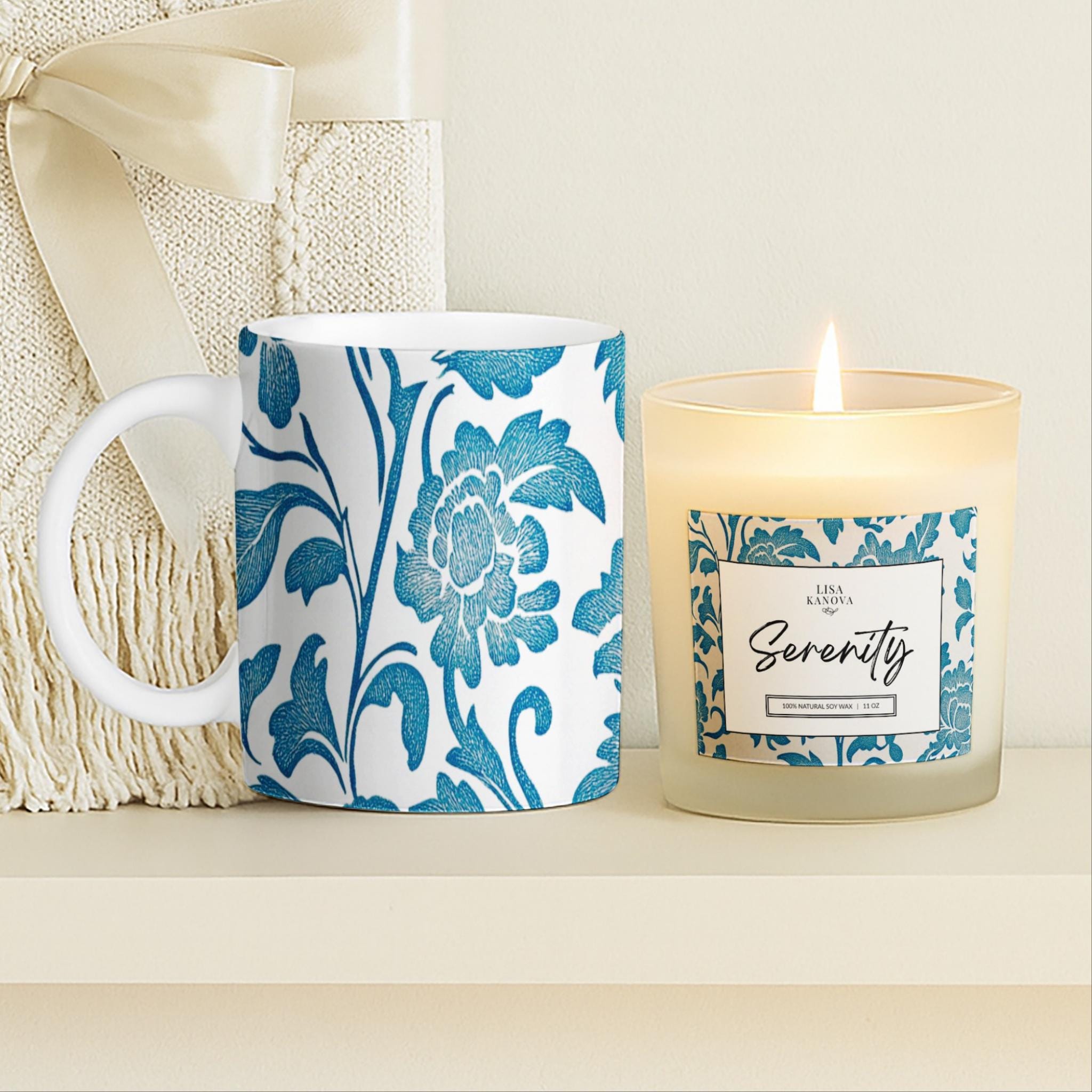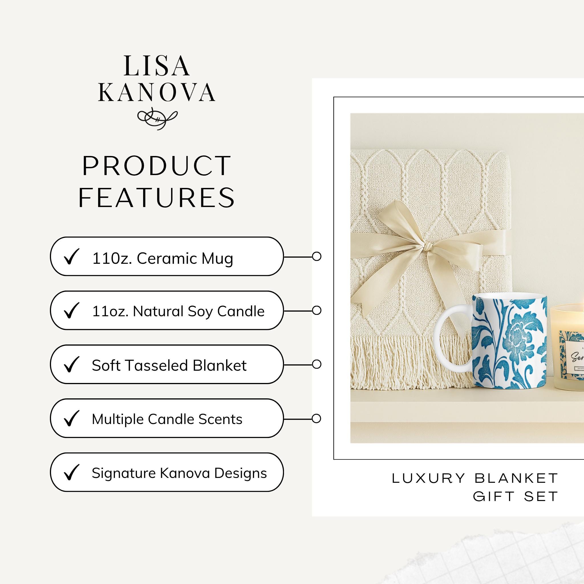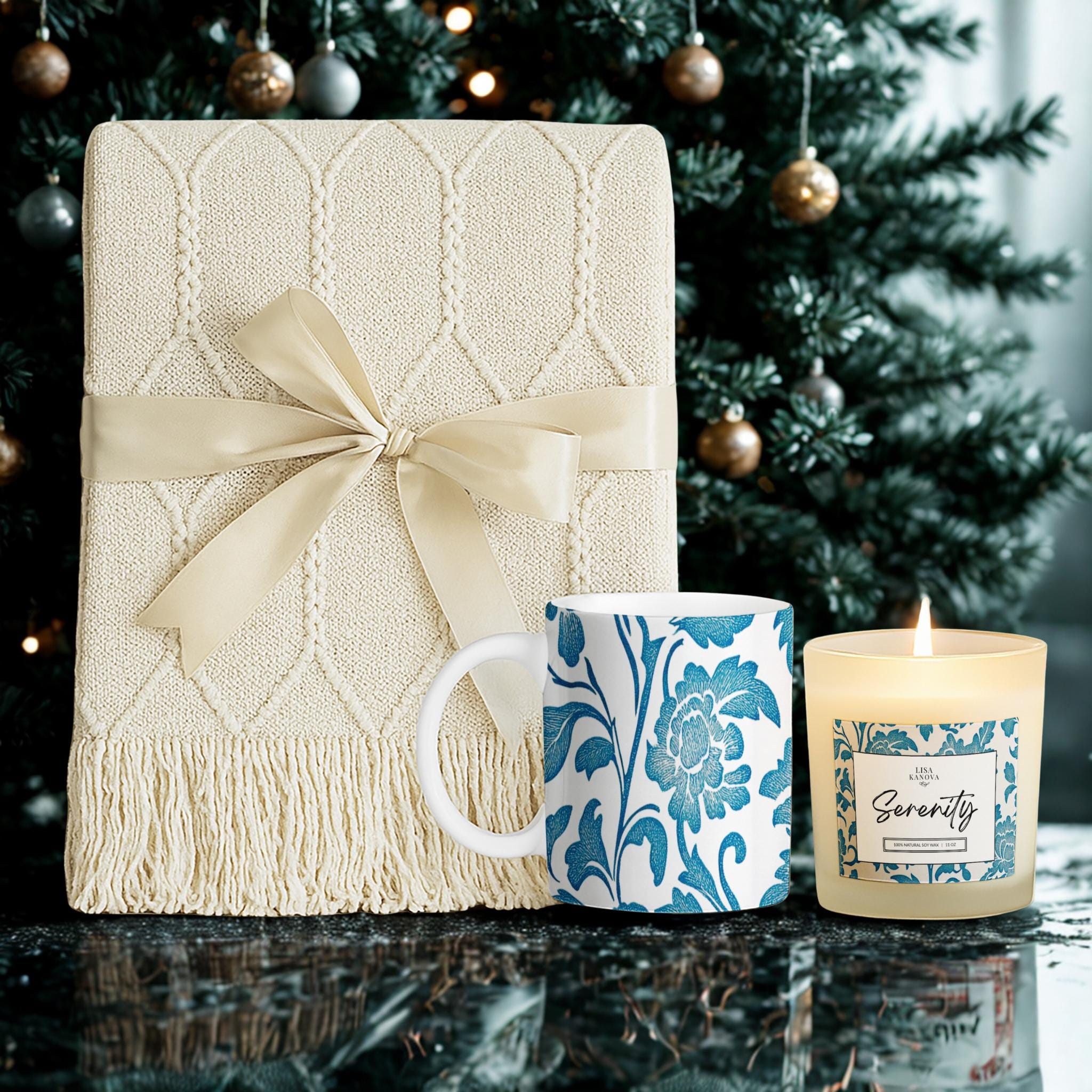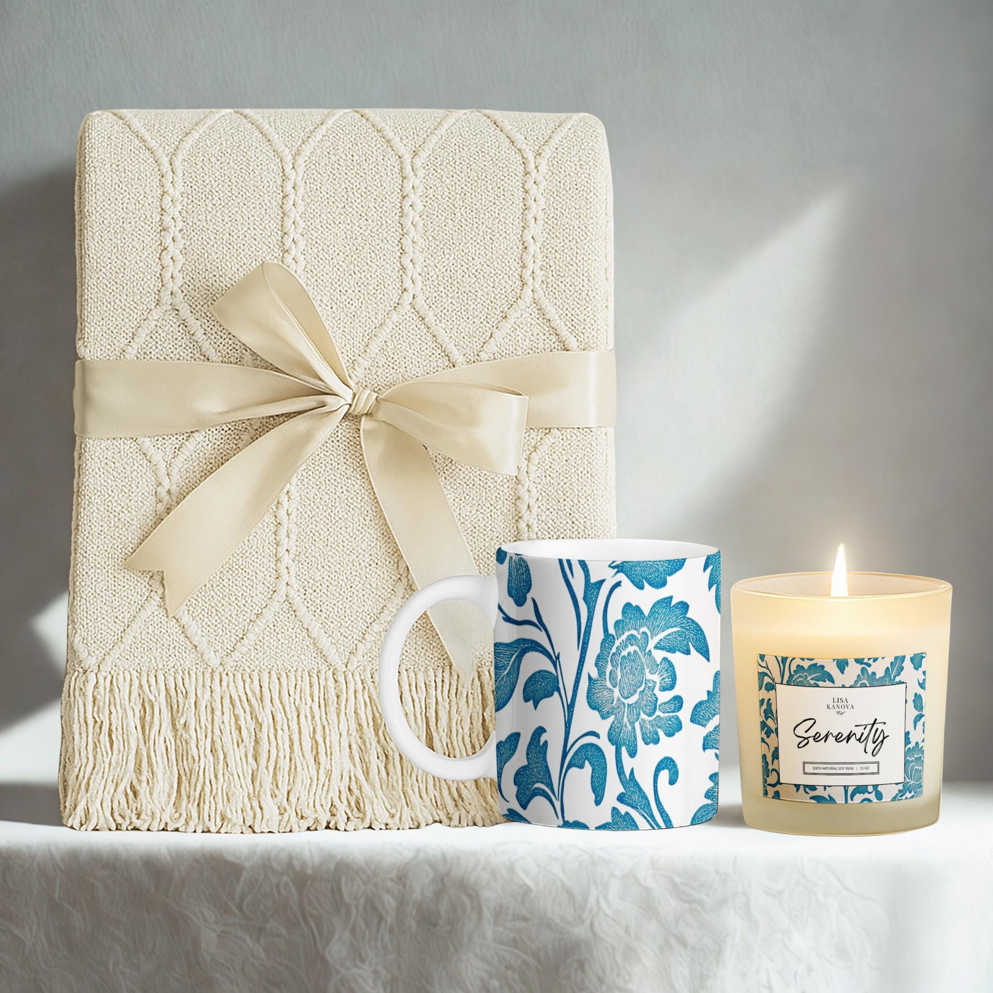 Bring a touch of curated beauty to any moment with this personalized toile gift set. Designed to feel timeless, elegant, and unmistakably special, this three-piece collection transforms everyday comfort into a refined ritual. Each set includes a soft tassel throw, a fine-art floral mug, and a personalized soy candle wrapped in coordinating toile — a blend of classic charm and modern style.