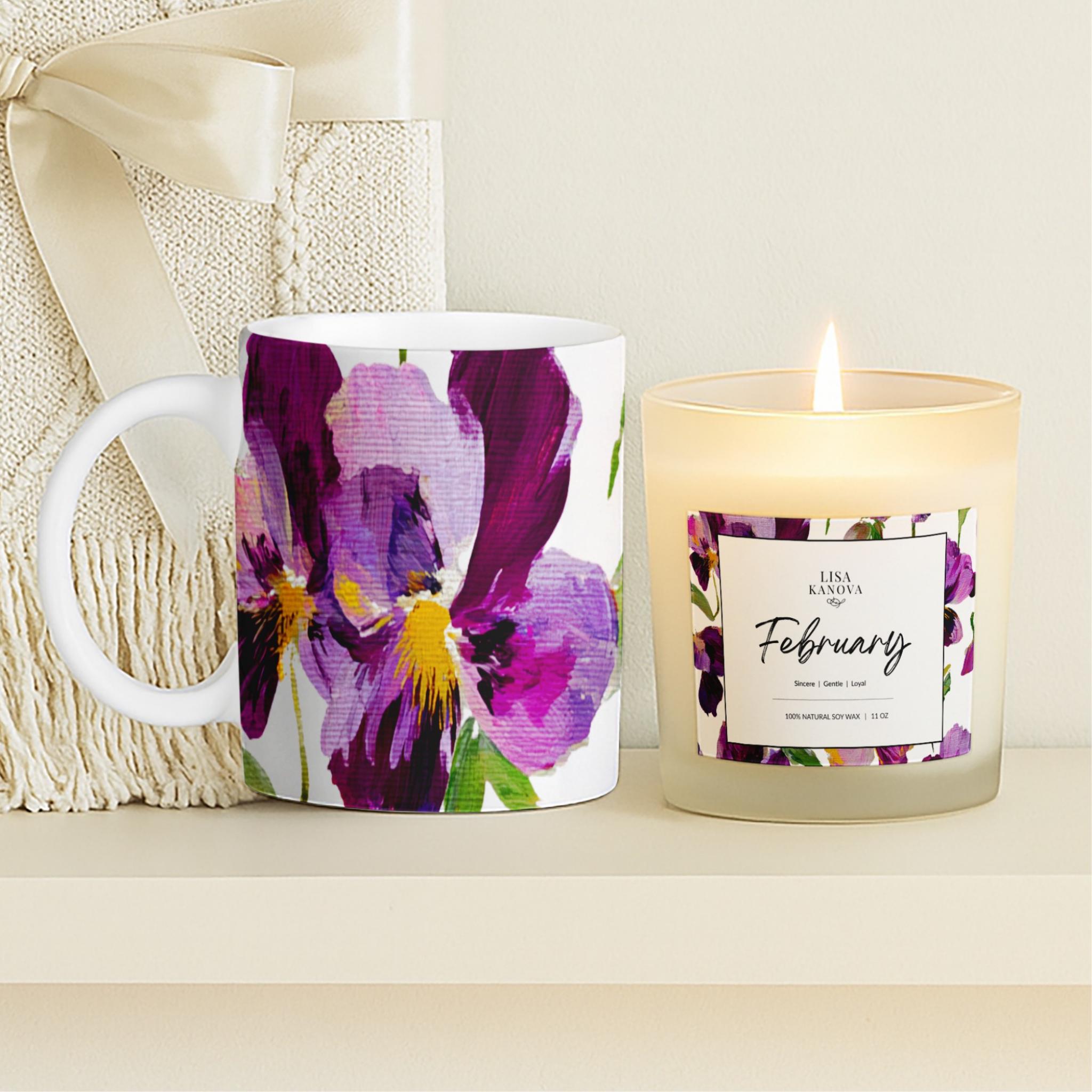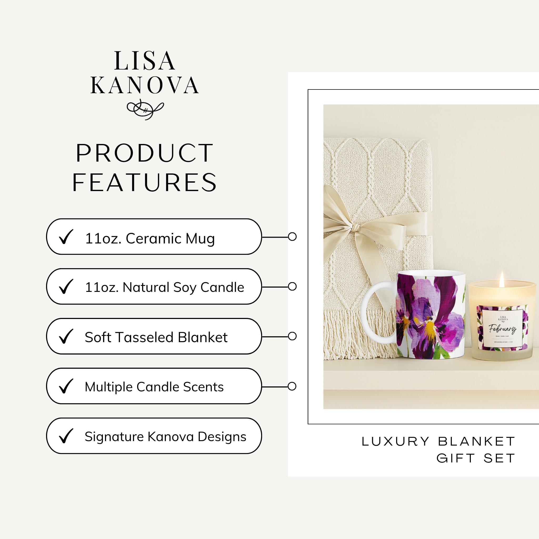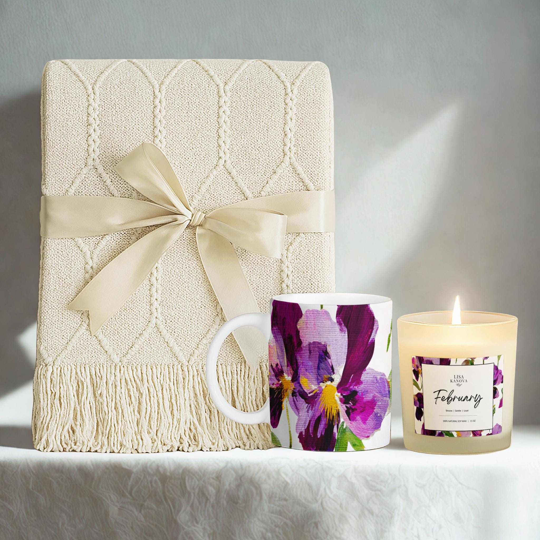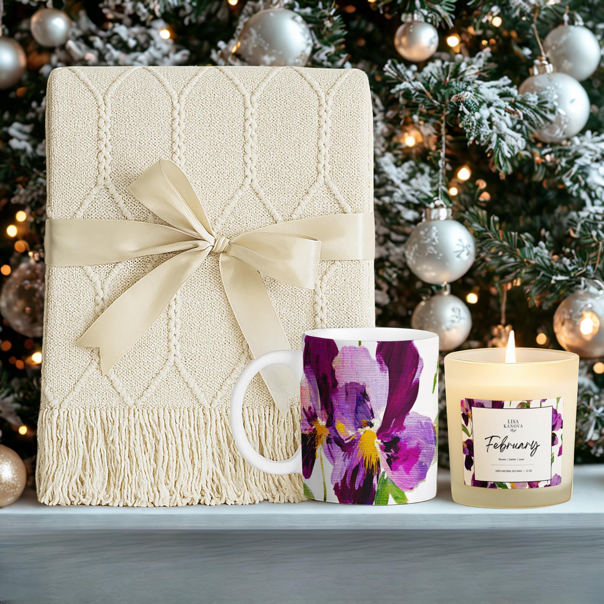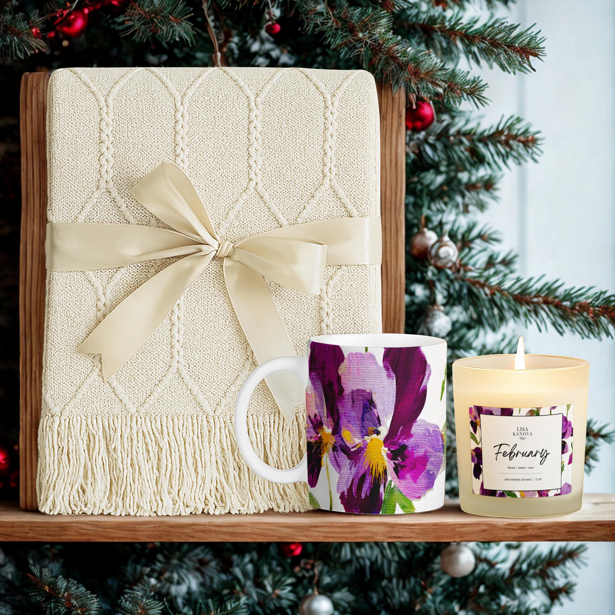 Luxury Birth Flower Cozy Gift Set • Tassel Blanket, Soy Candle & Ceramic Mug - February Violet