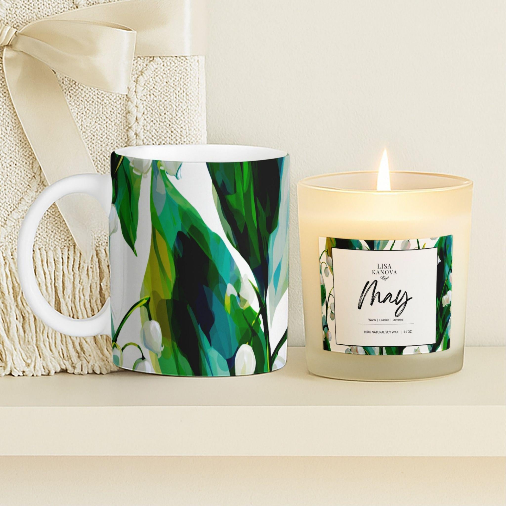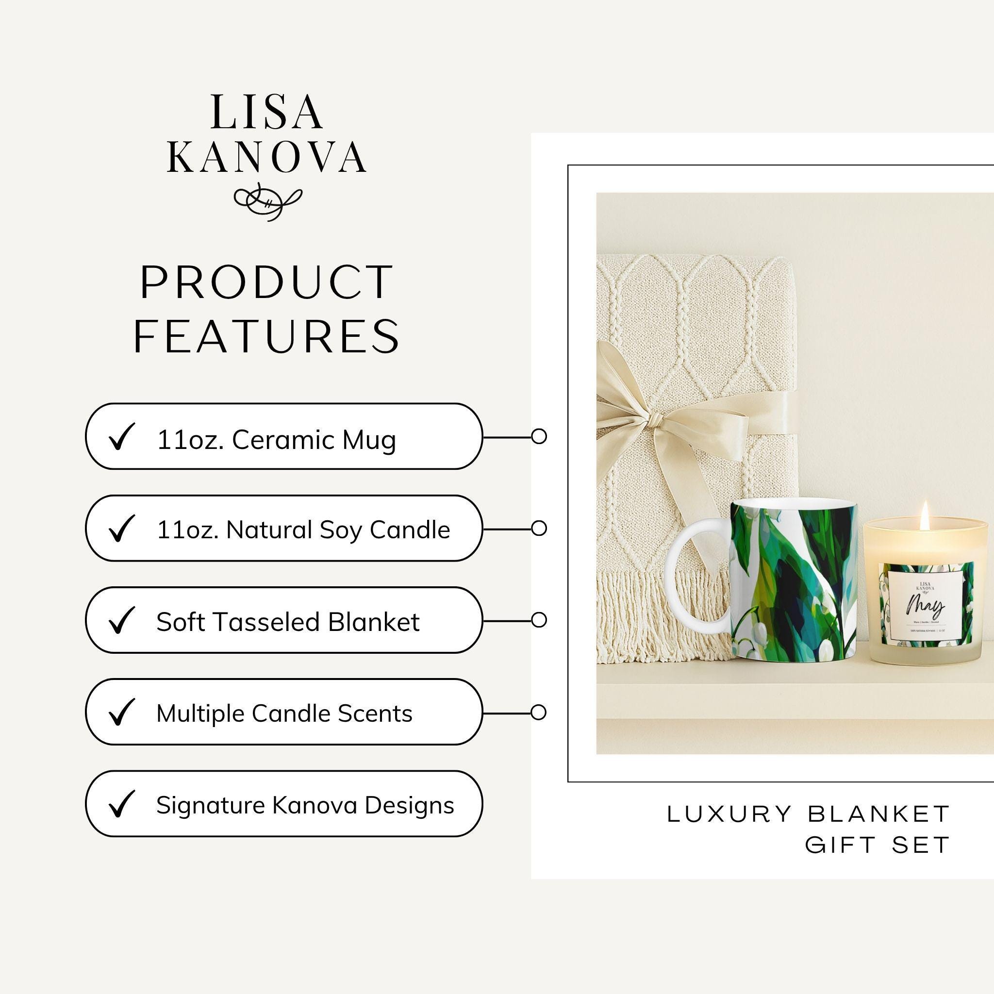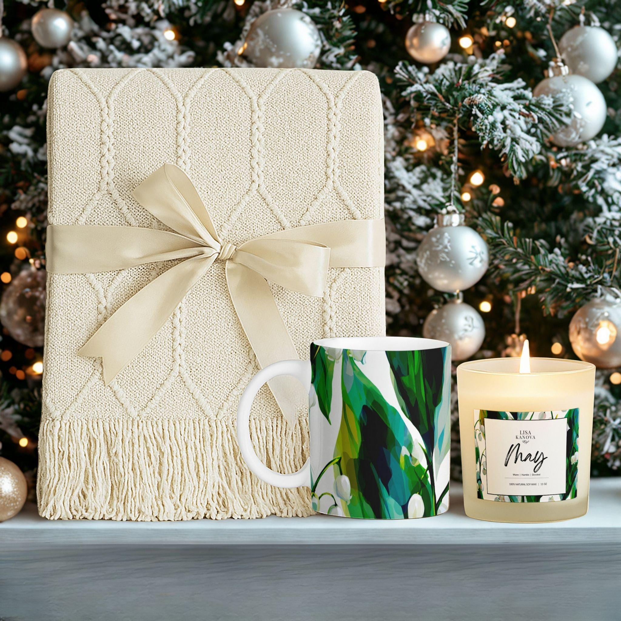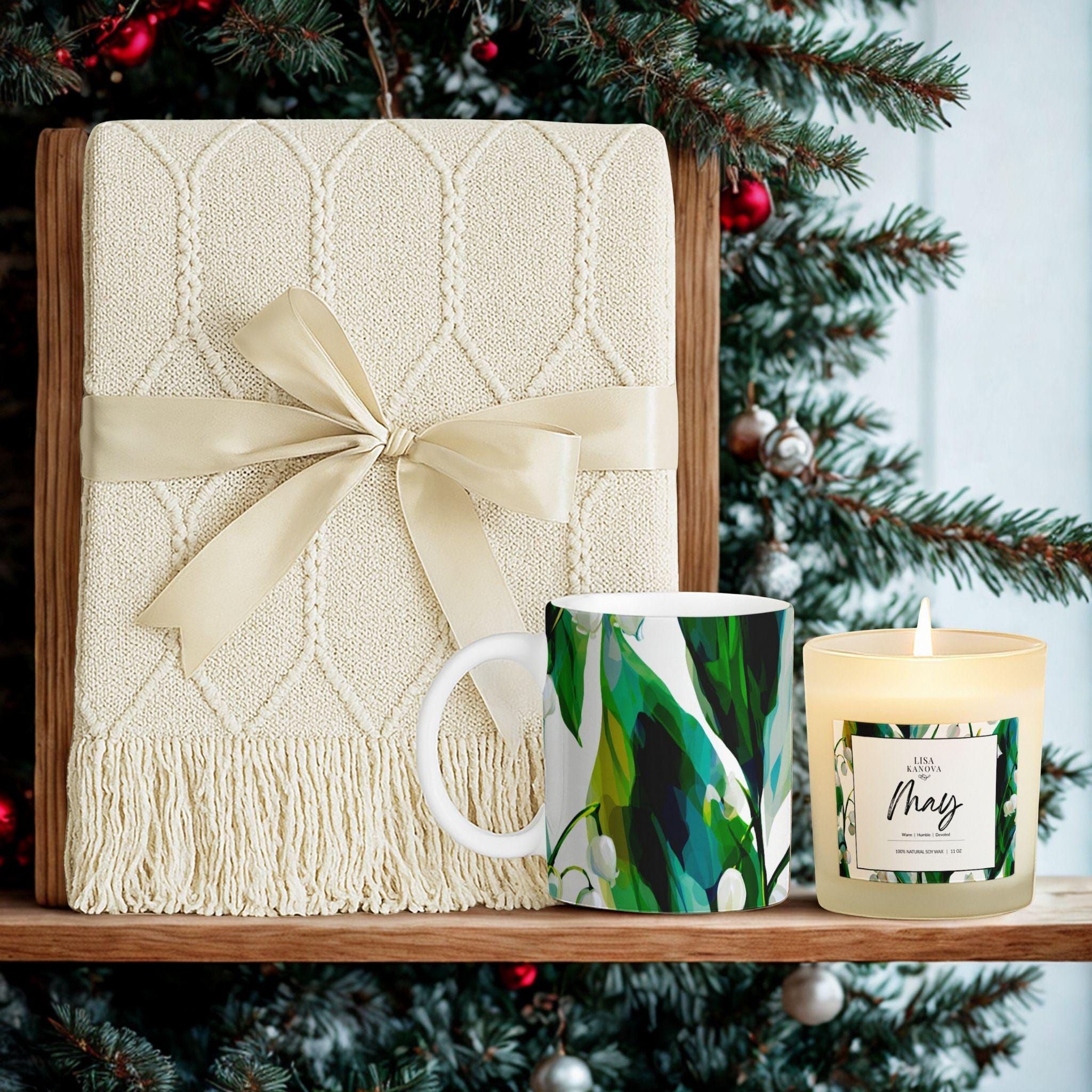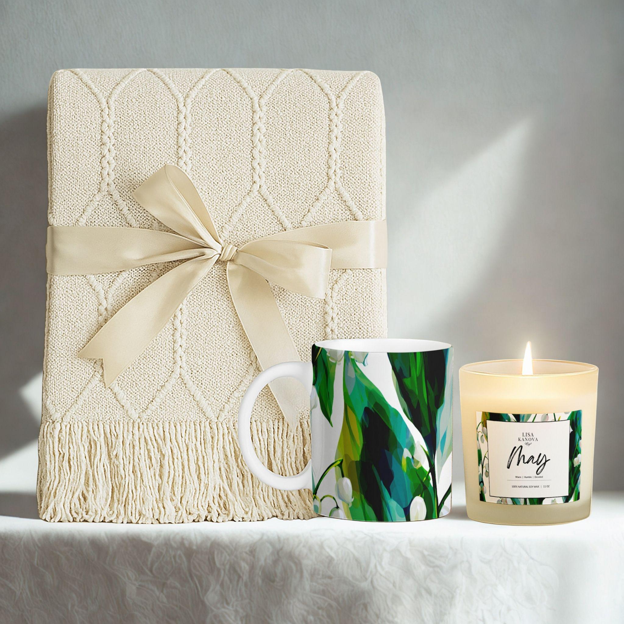 Birth Flower Gift Set • Lily of the Valley Blanket, Soy Candle & Mug